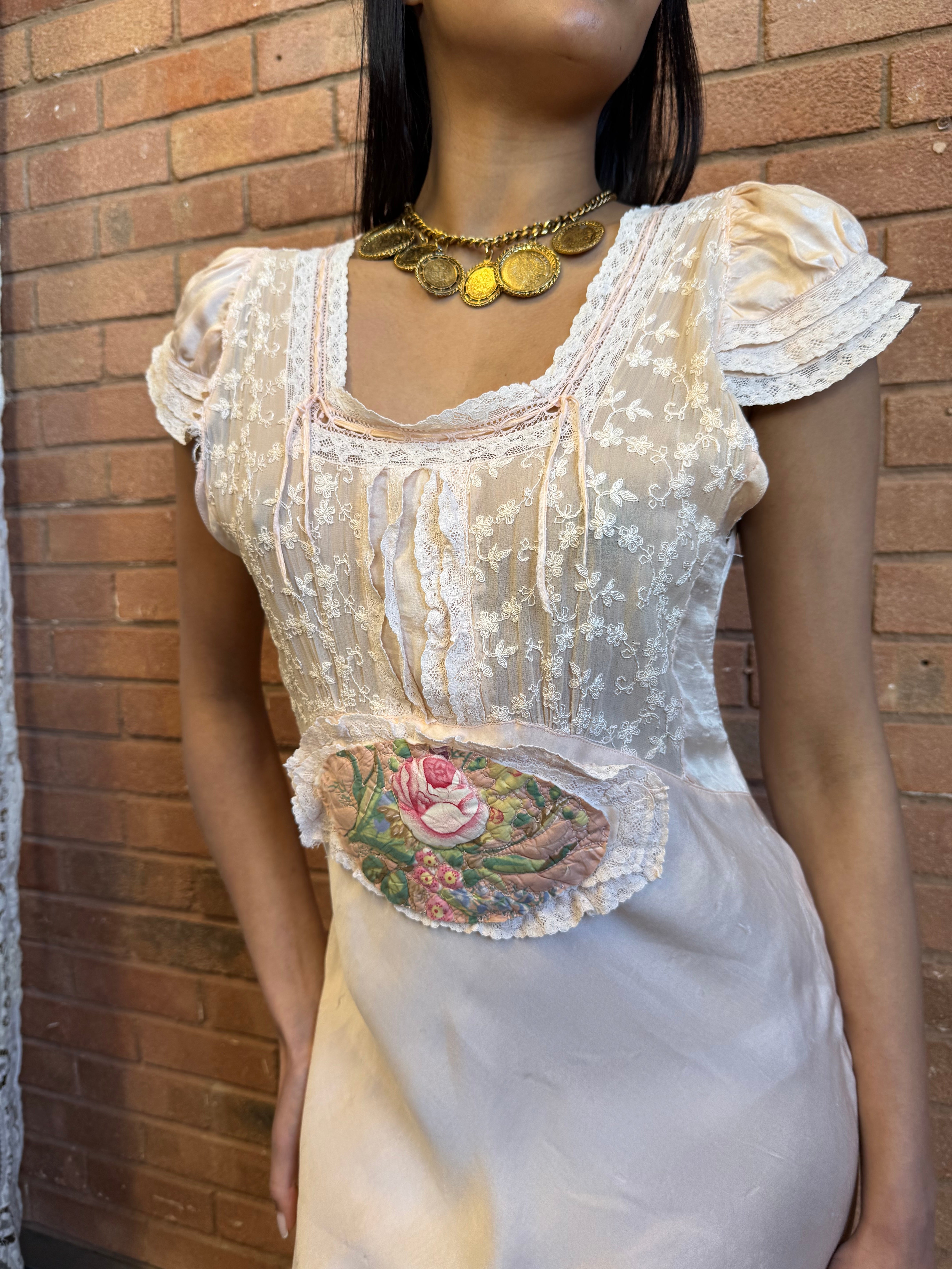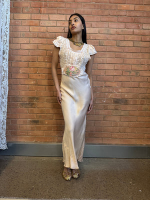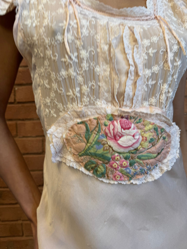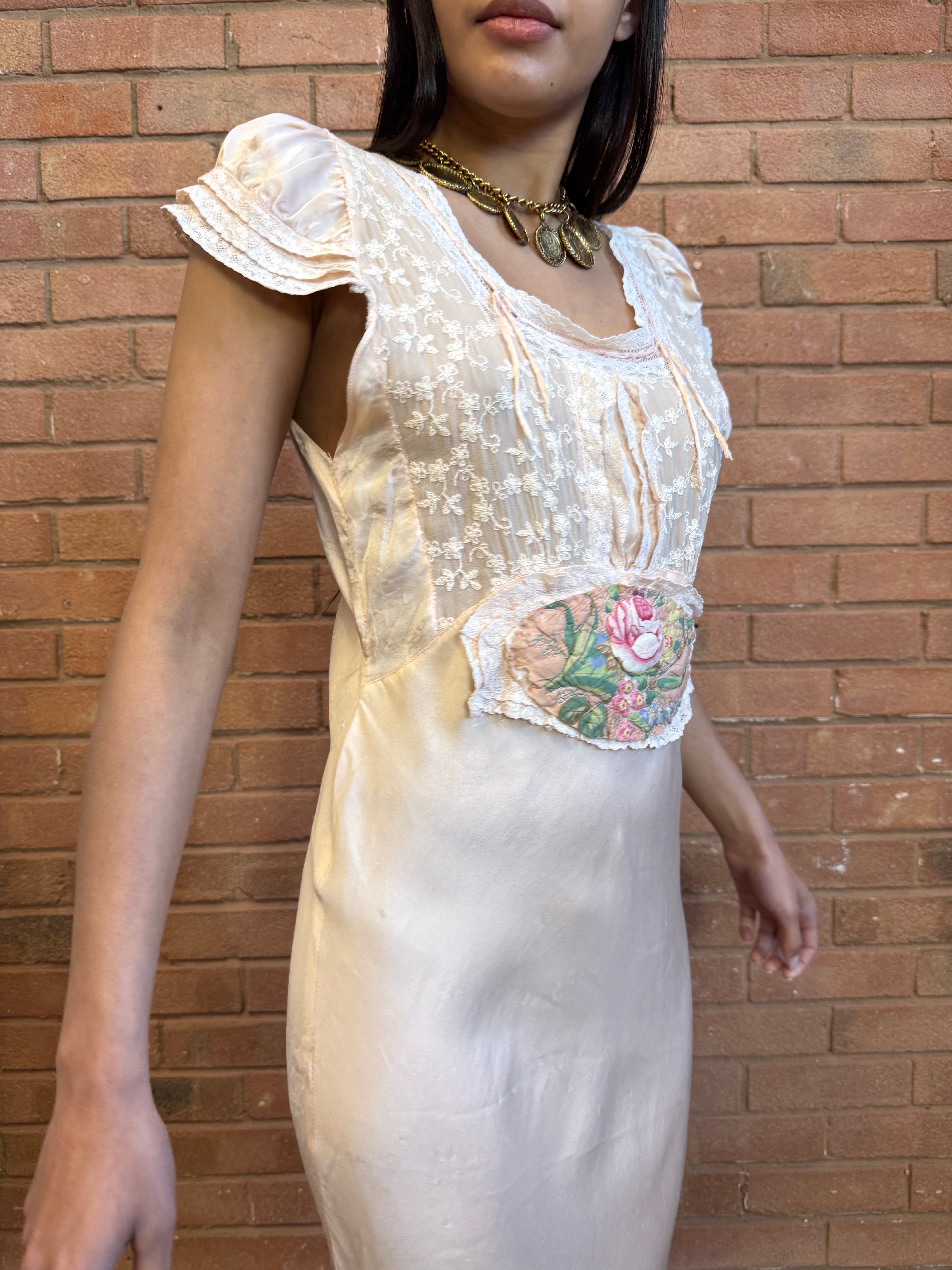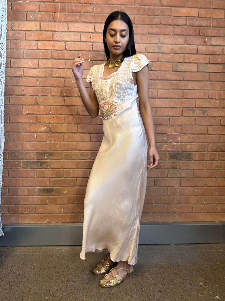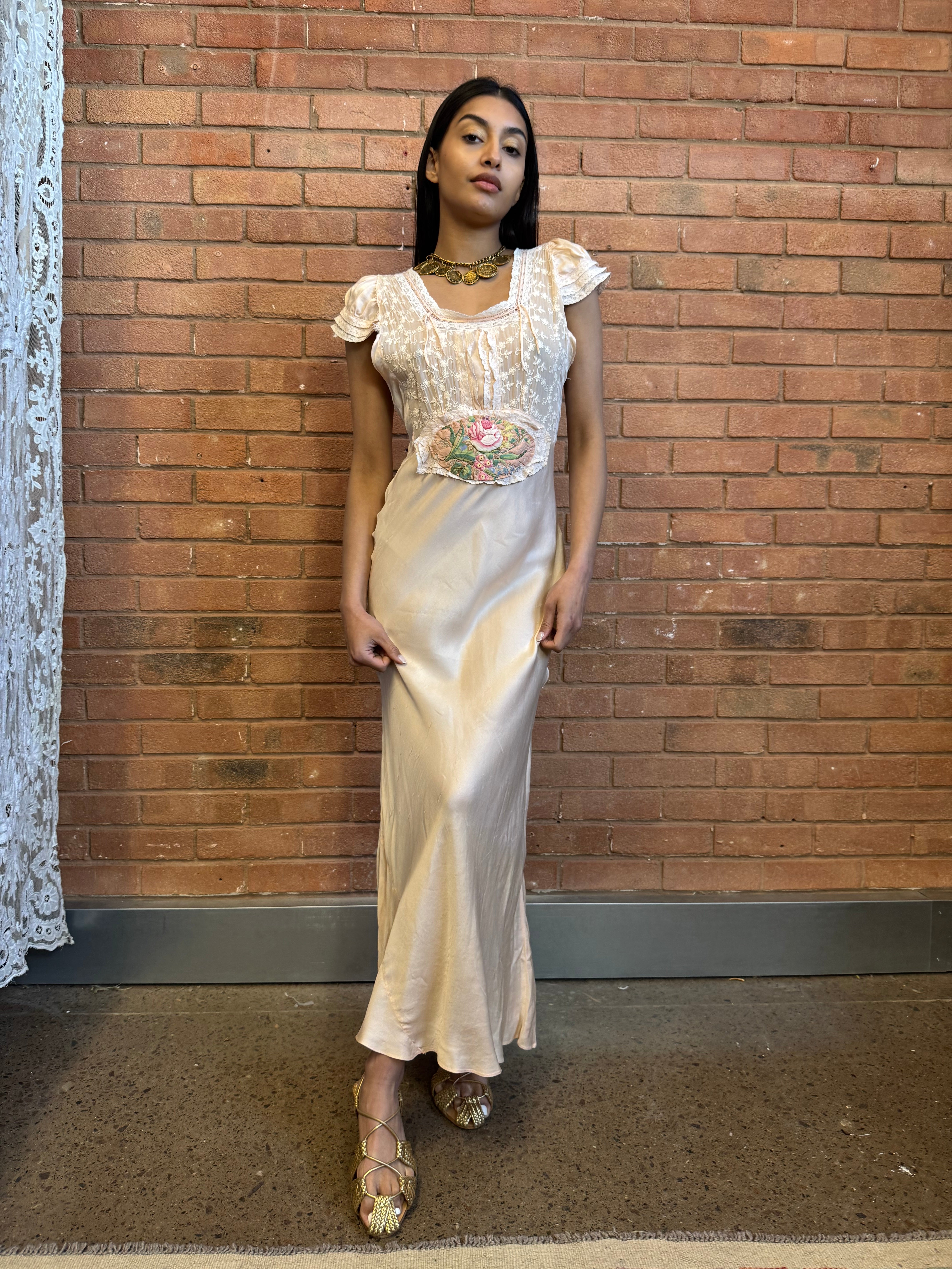 Indulge in timeless elegance with this 20s silk lace and floral bias cut dress. The V-neck and lace detail on the bust exude timeless charm, as short cap sleeves while the floral print appliqué on the waist adds a touch of femininity. Perfect for any special occasion, this dress is simply delectable.