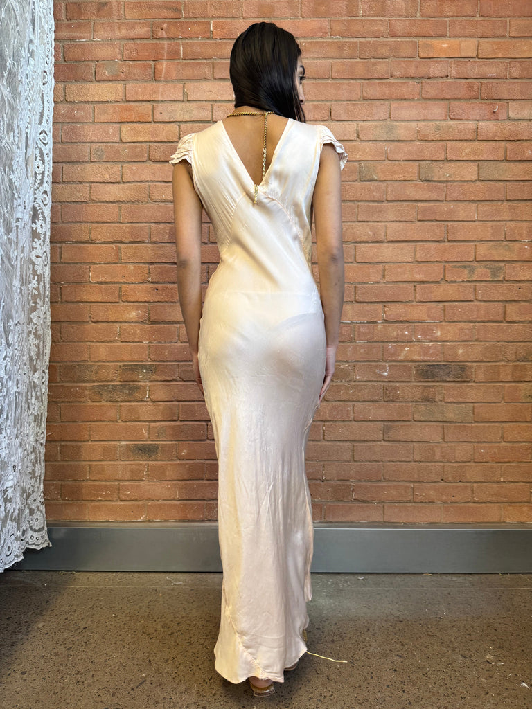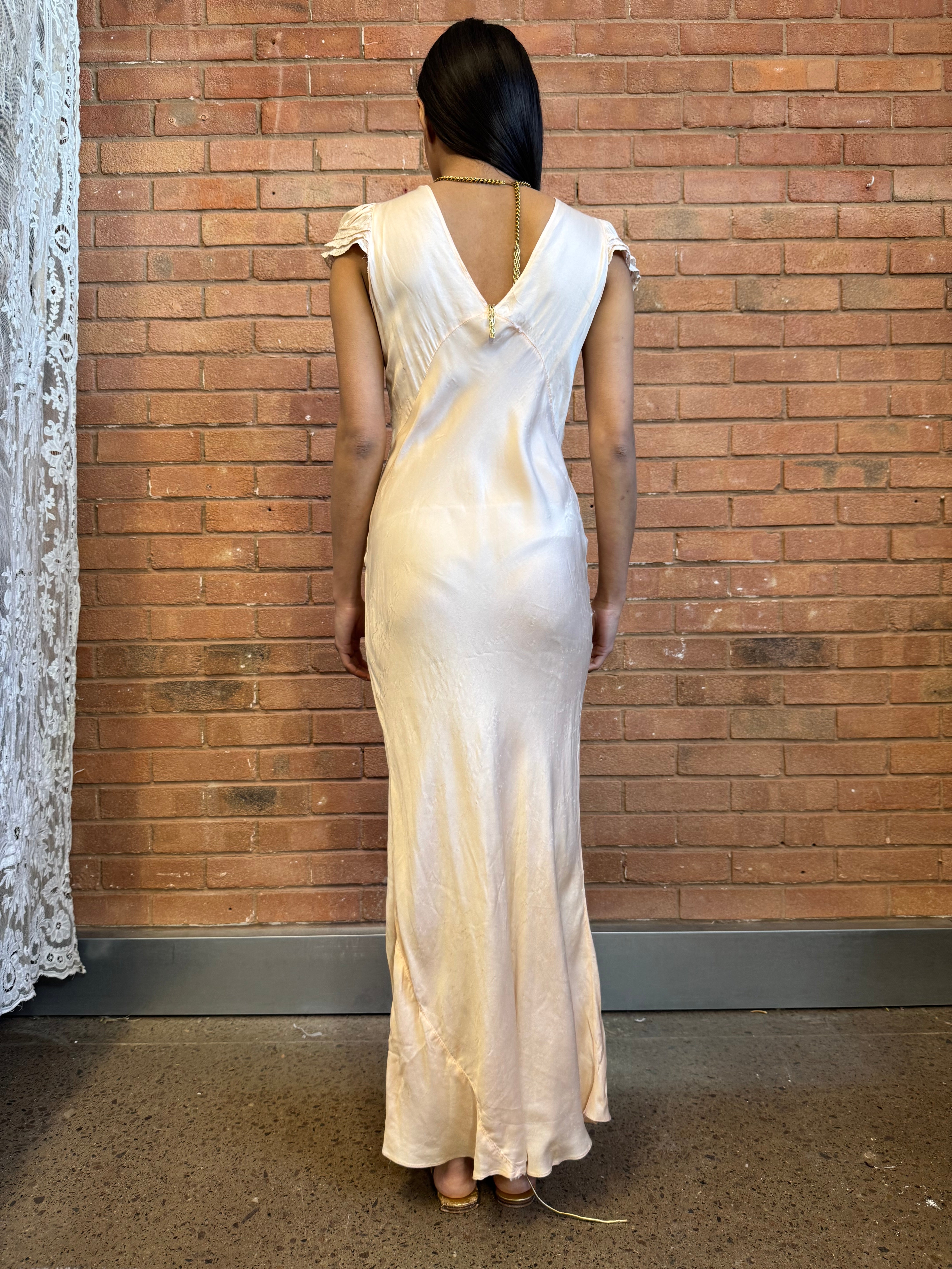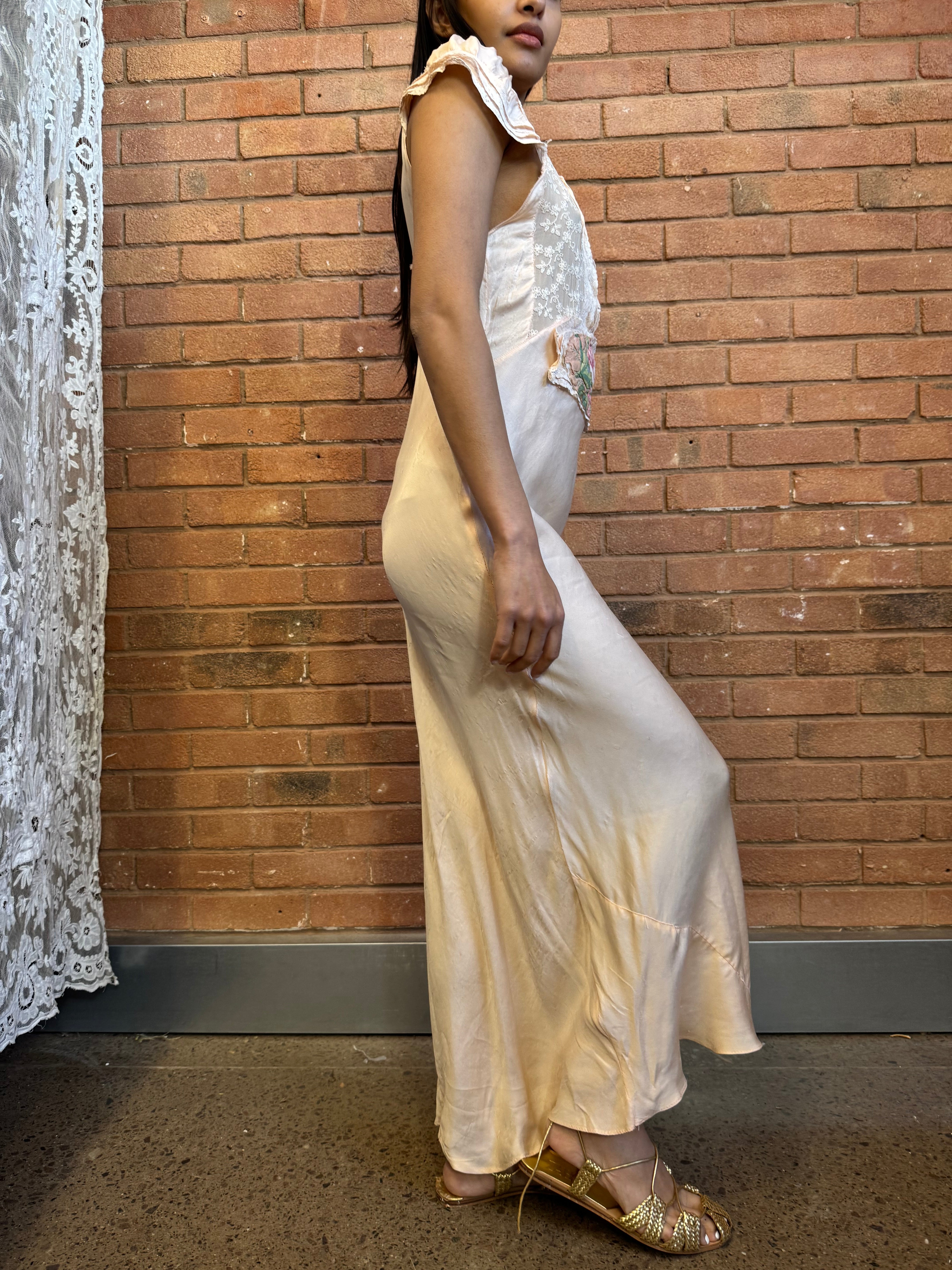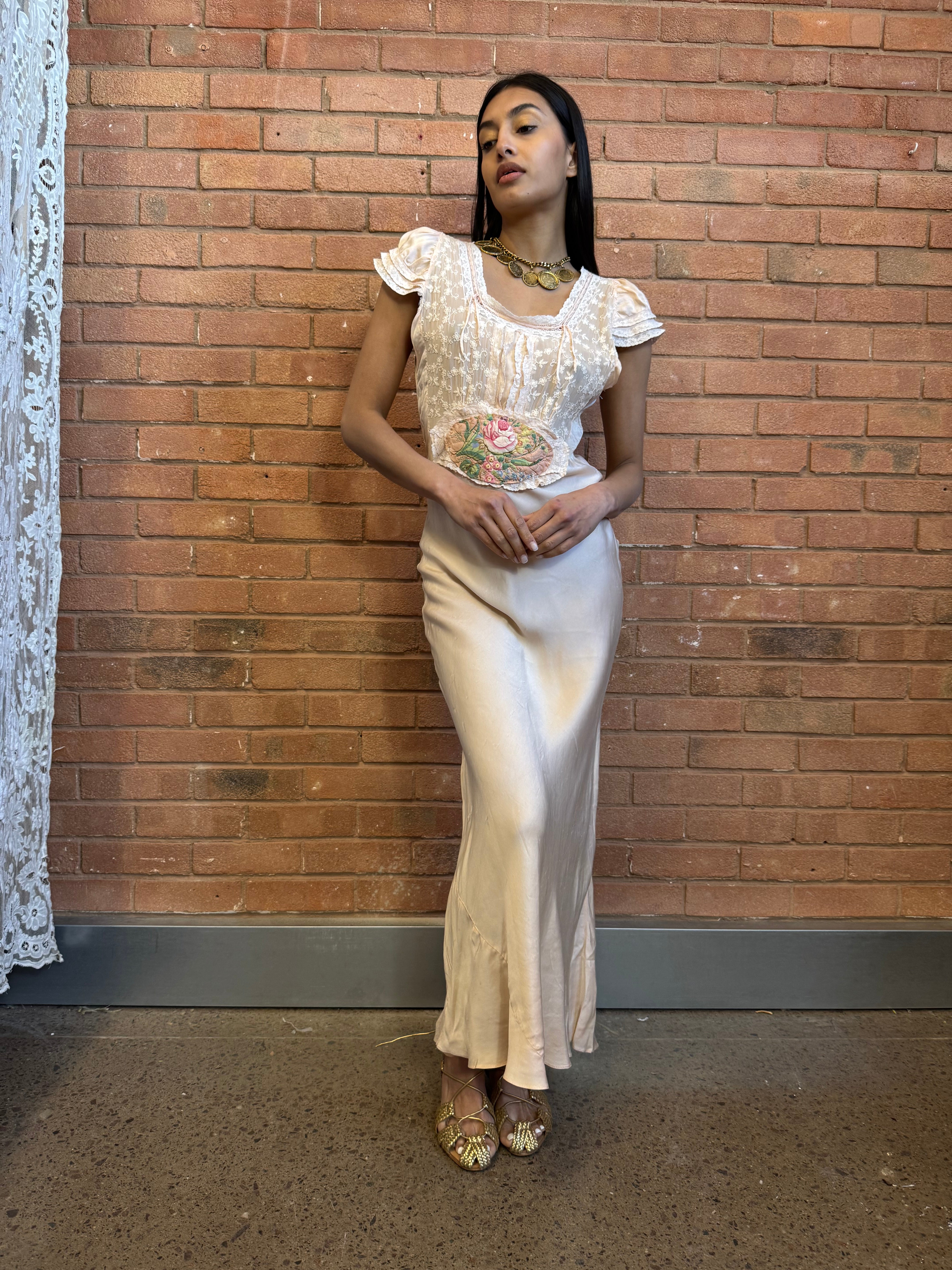 Indulge in timeless elegance with this 20s silk lace and floral bias cut dress. The V-neck and lace detail on the bust exude timeless charm, as short cap sleeves while the floral print appliqué on the waist adds a touch of femininity. Perfect for any special occasion, this dress is simply delectable.