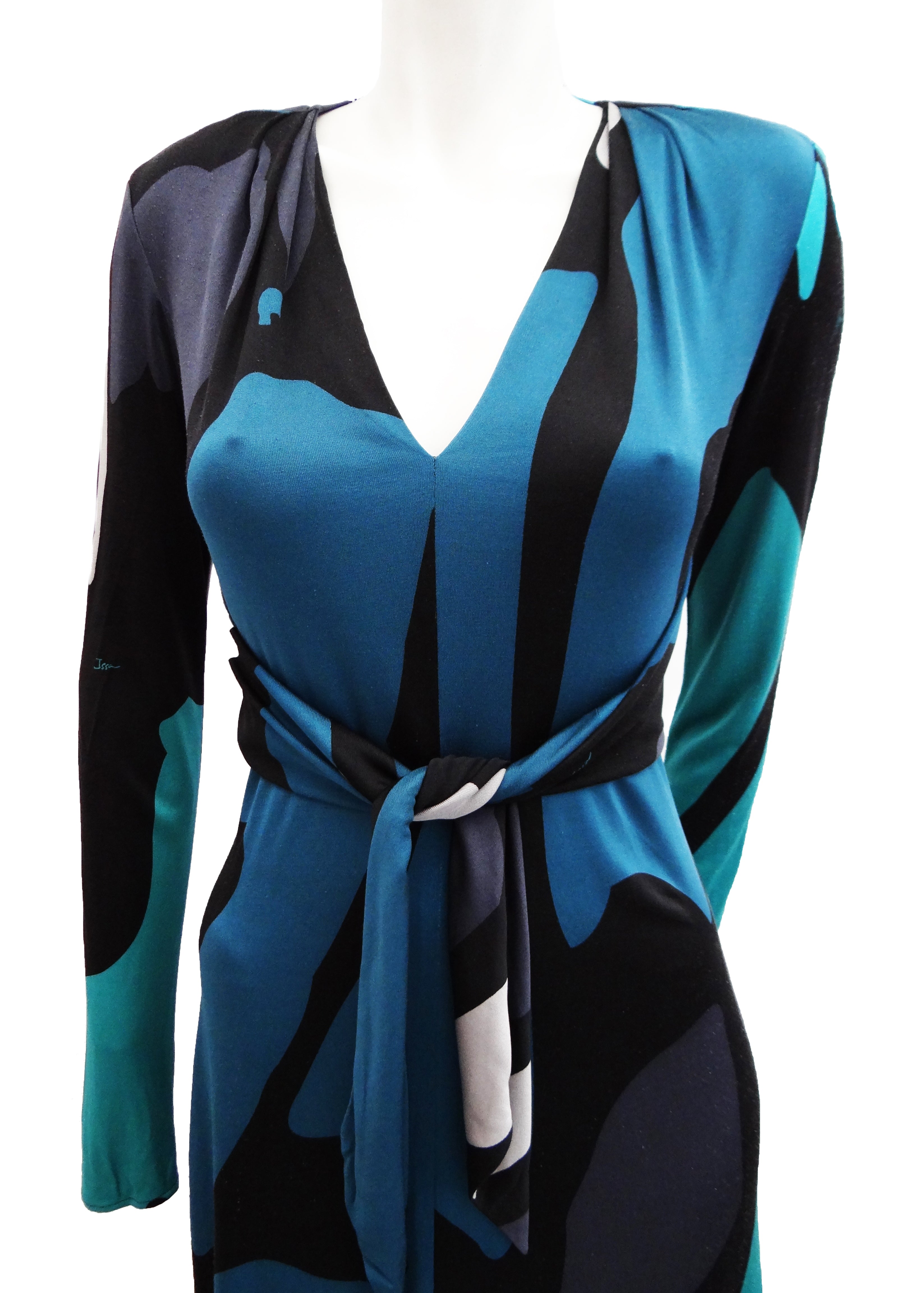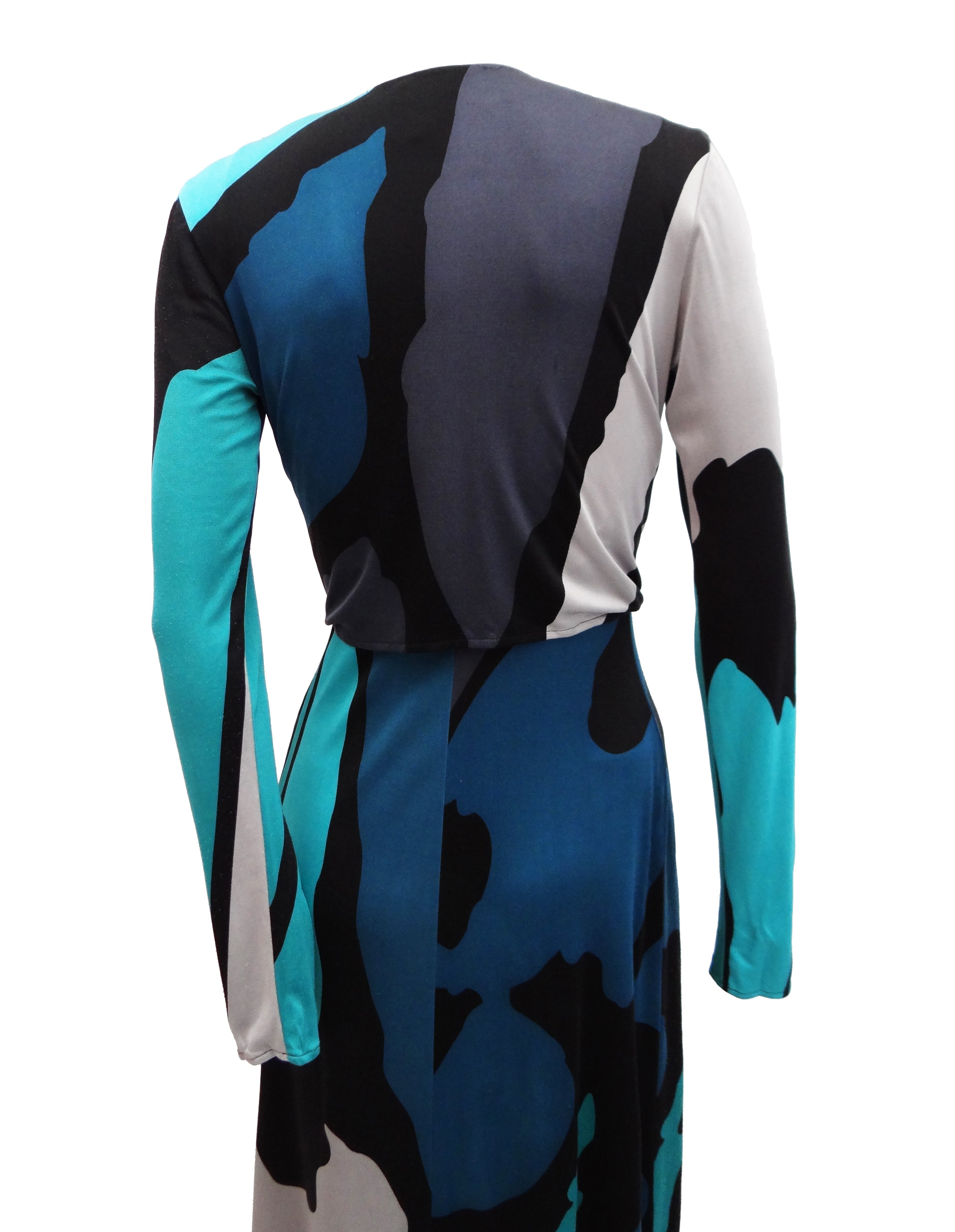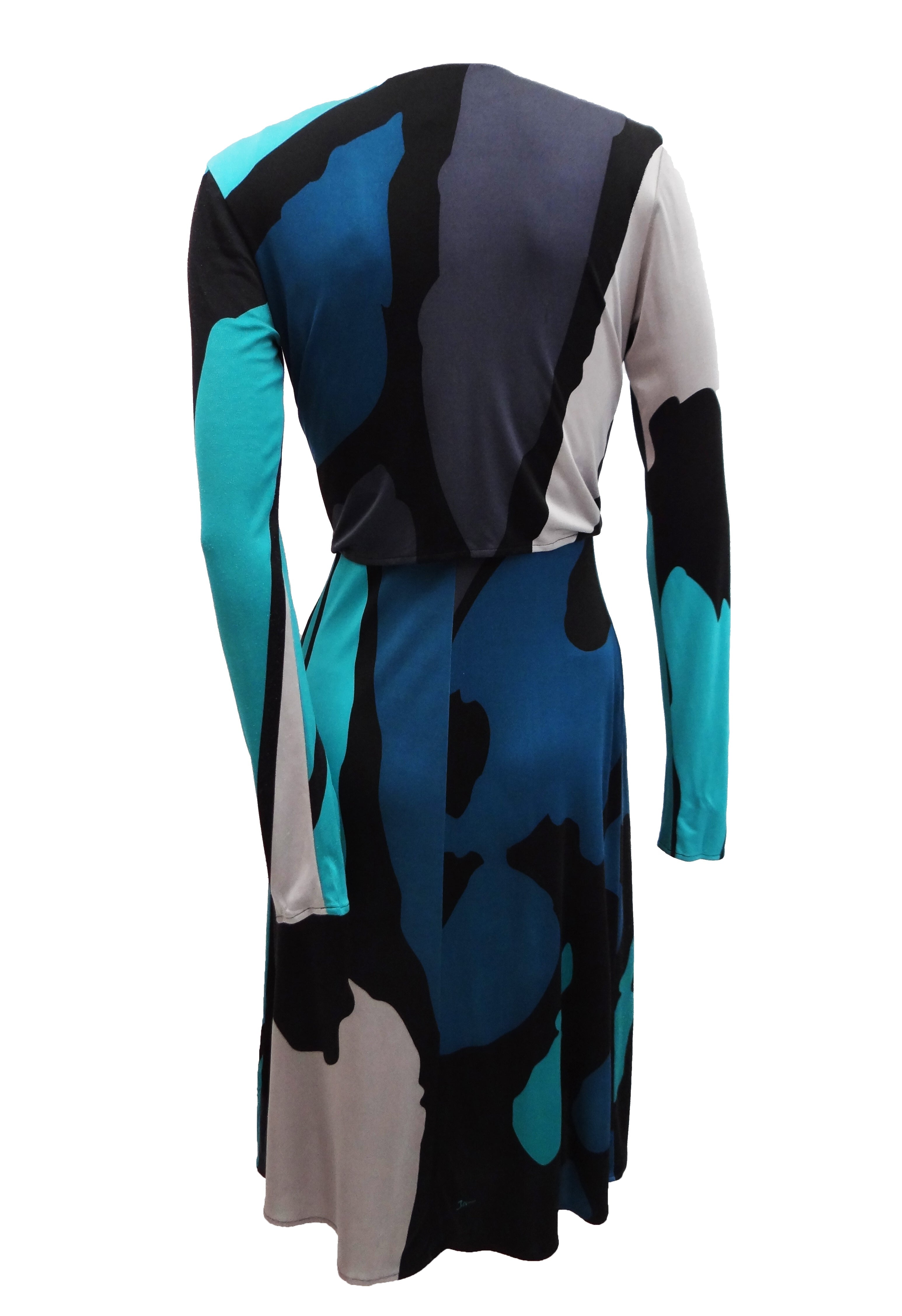 A superb dress by Issa in slinky silk jersey , printed with large abstract splodges of turquoise, silver and teal on a black ground.