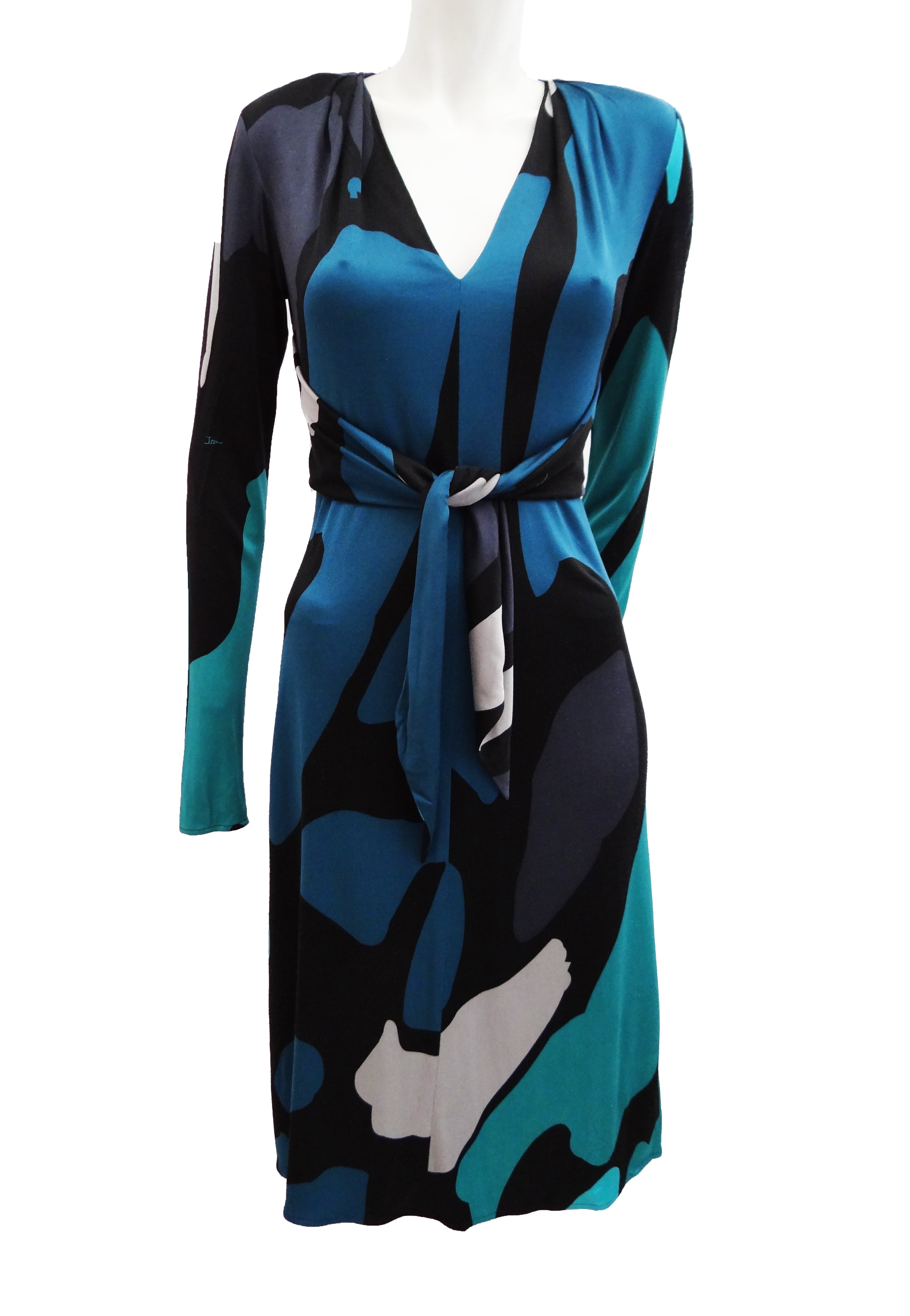 The dress has a deep V neck, and long sleeves, and is marvellously cut to embrace the figure. It has a free hanging panel at the back which ties at the front. Knee length, unlined. Ideal for day or evening.