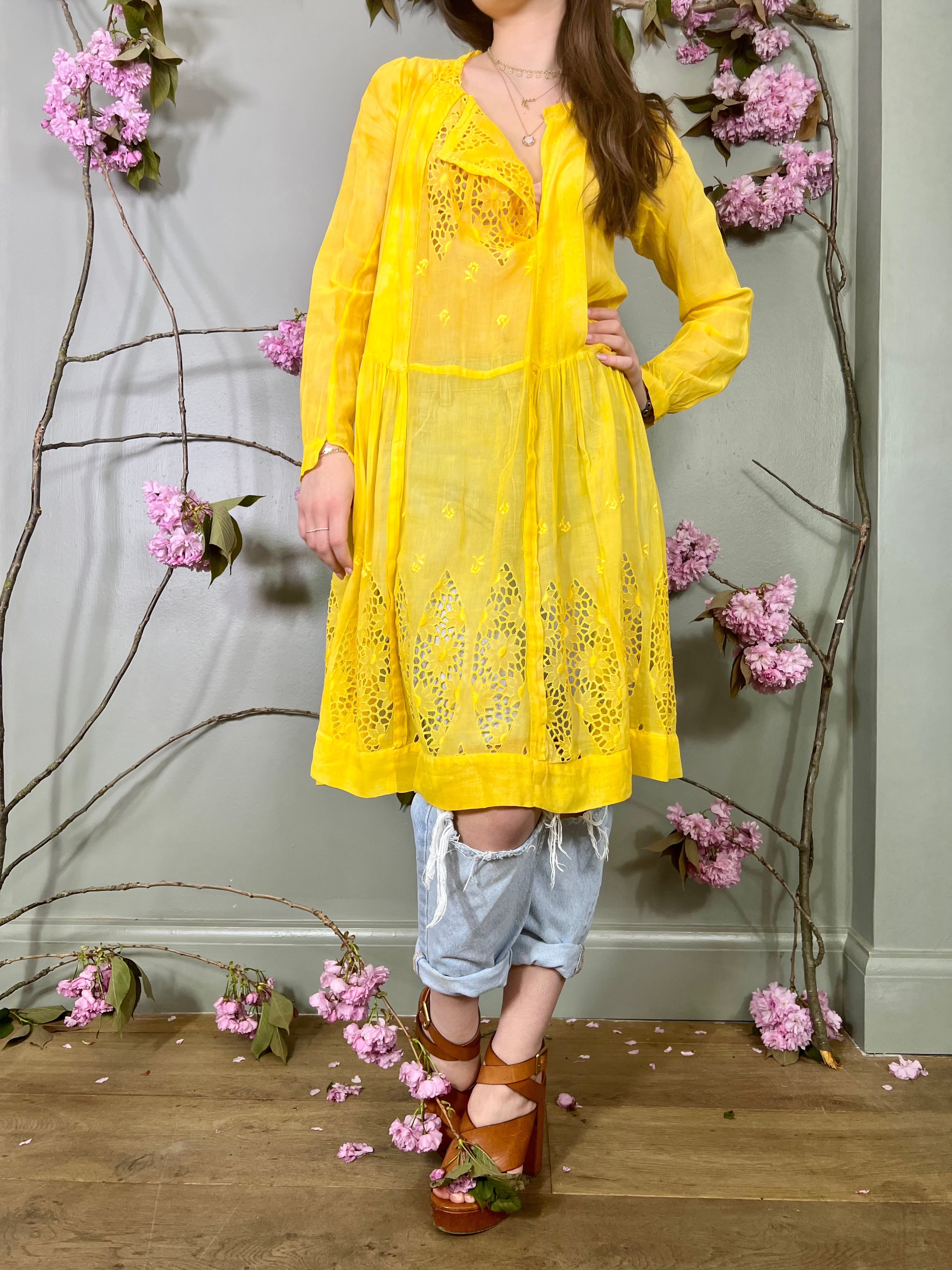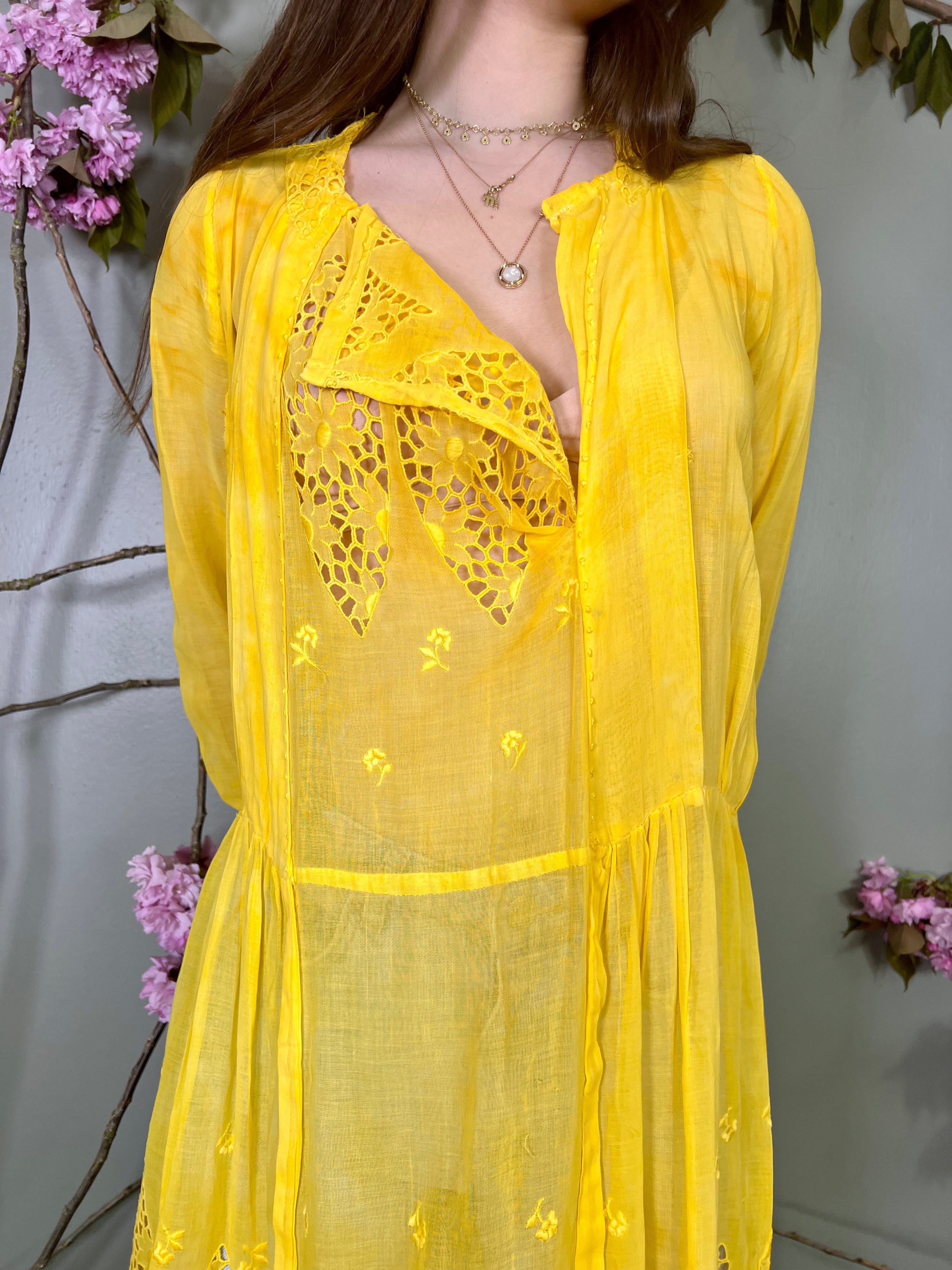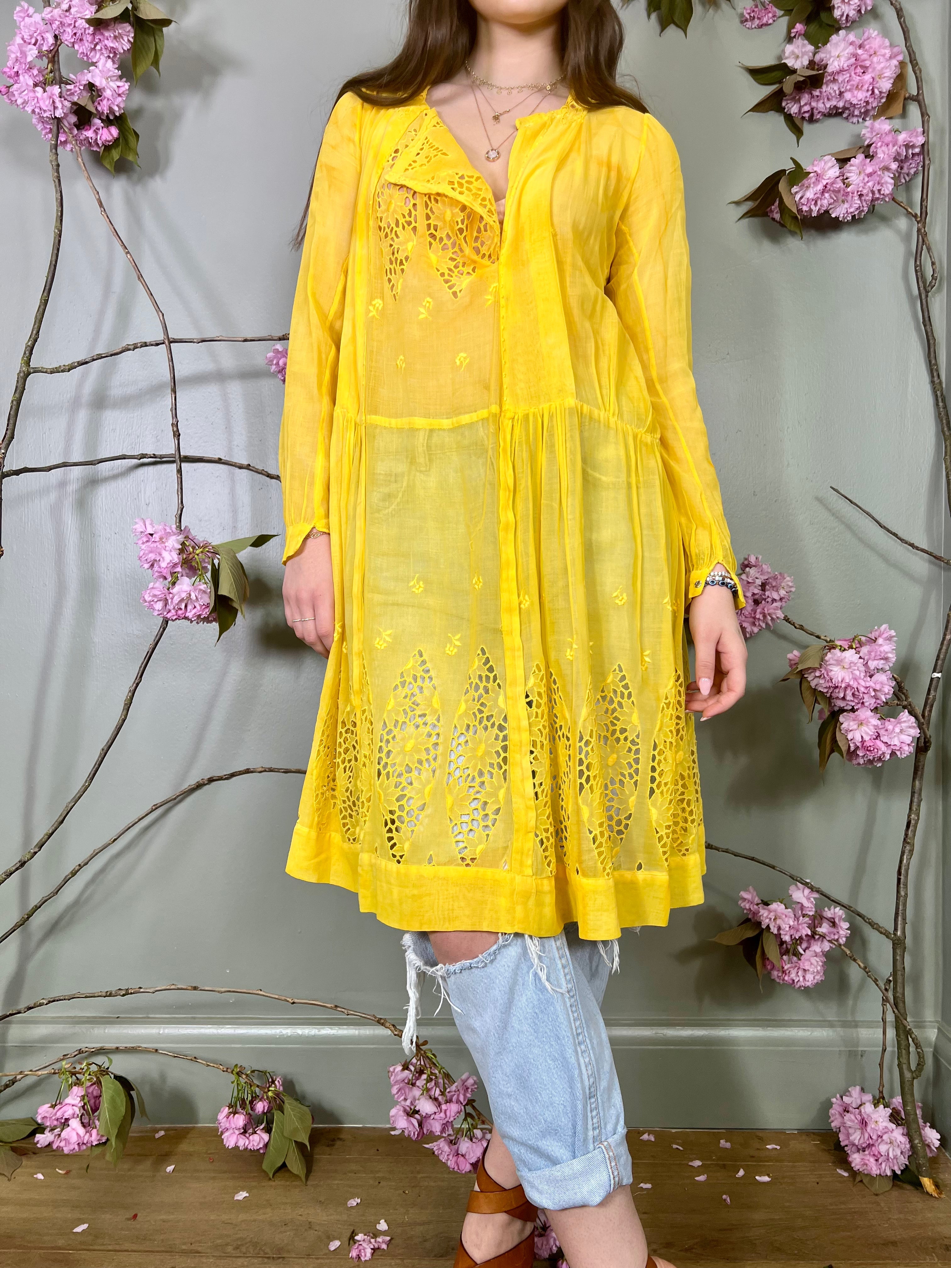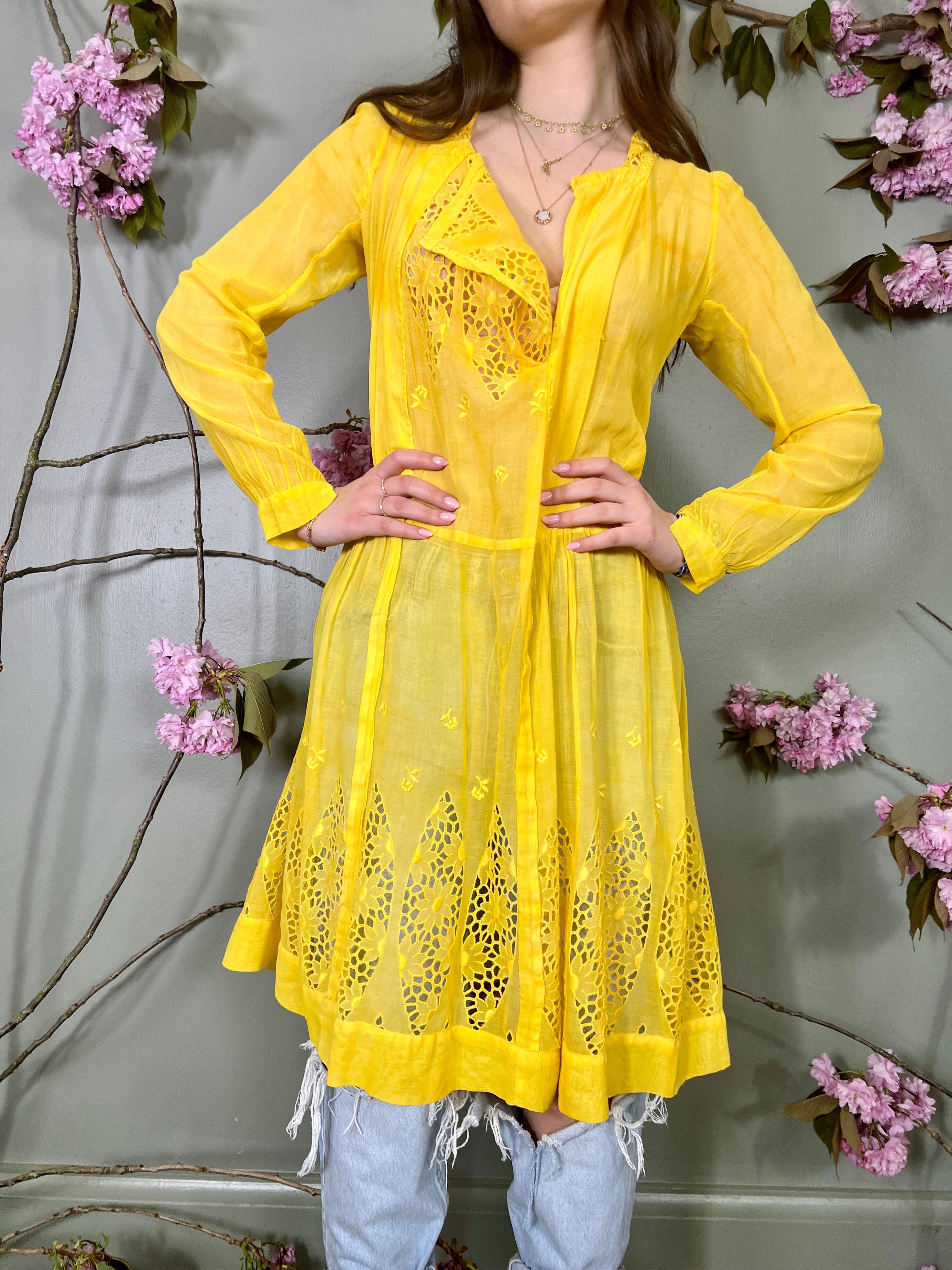 Gorgeous sunshine in a dress! Sun flower yellow hand dyes Victorian day dress with pretty detailing. Has long sleeves with buttons. An open chest detail that fastens with a button. Looks fab just layered over a bikini too.