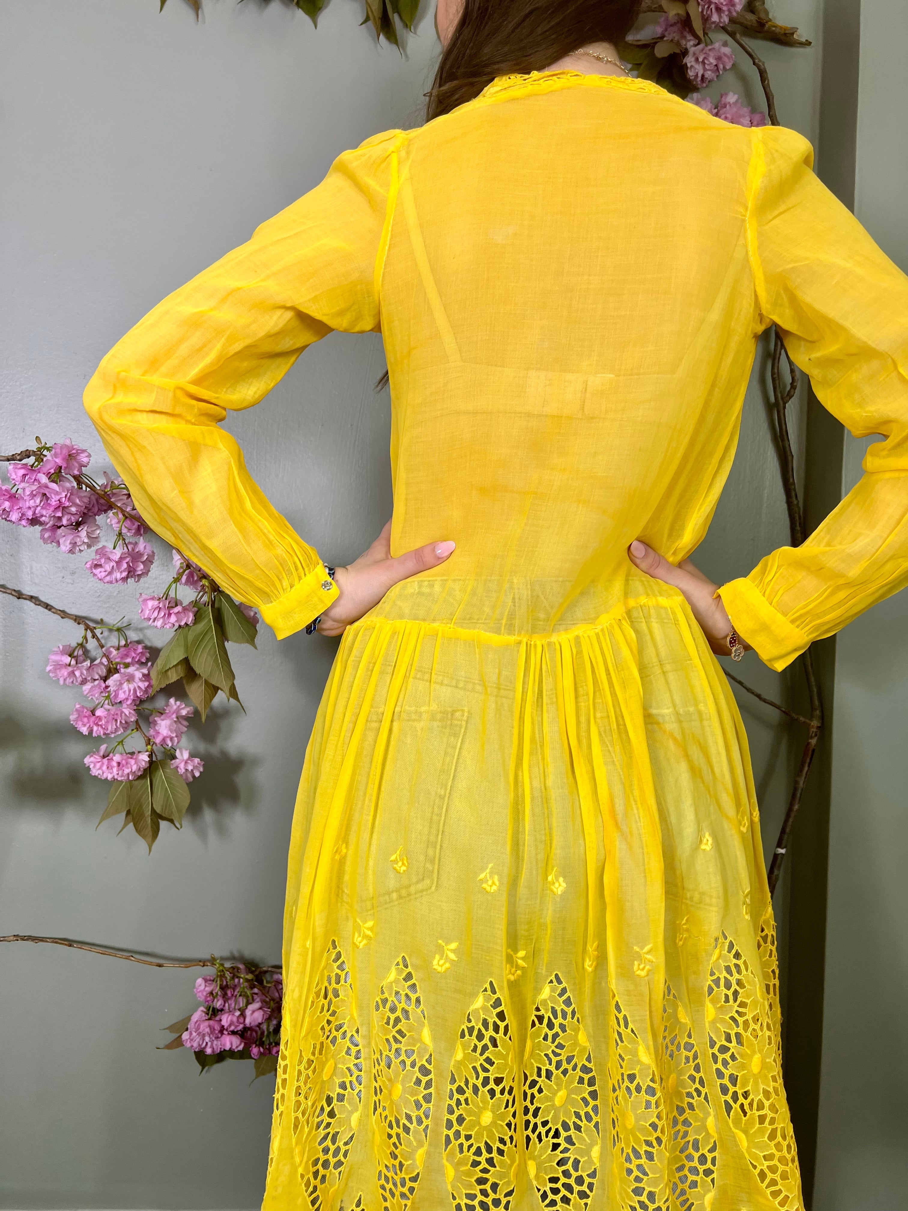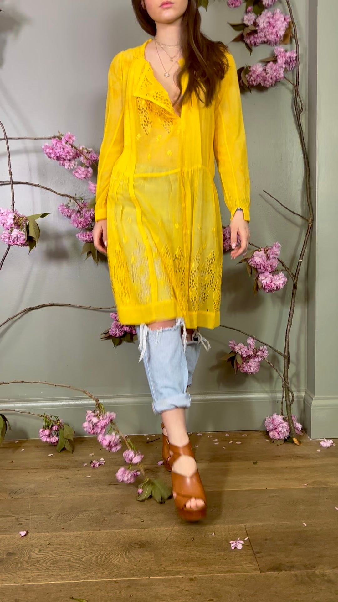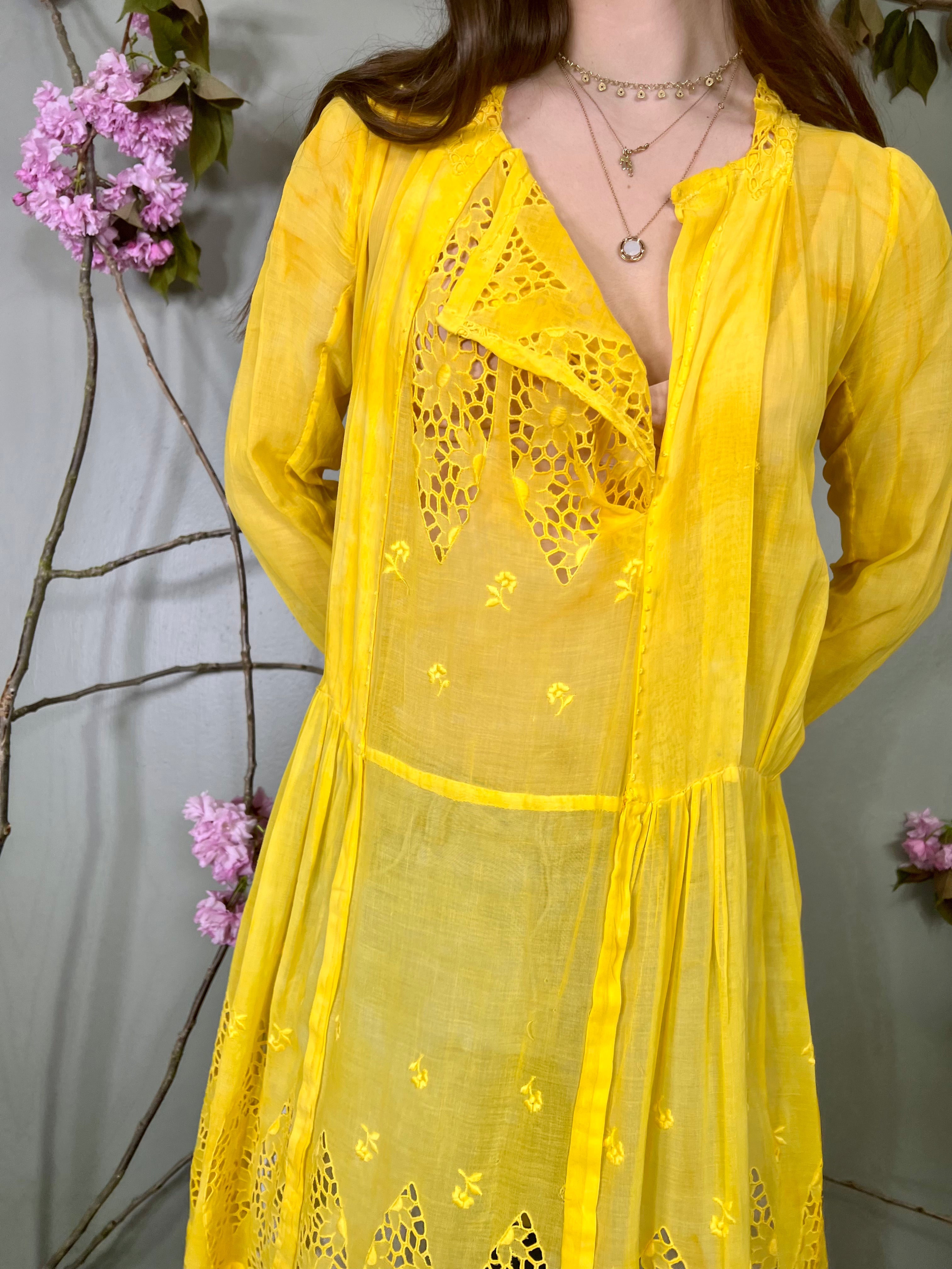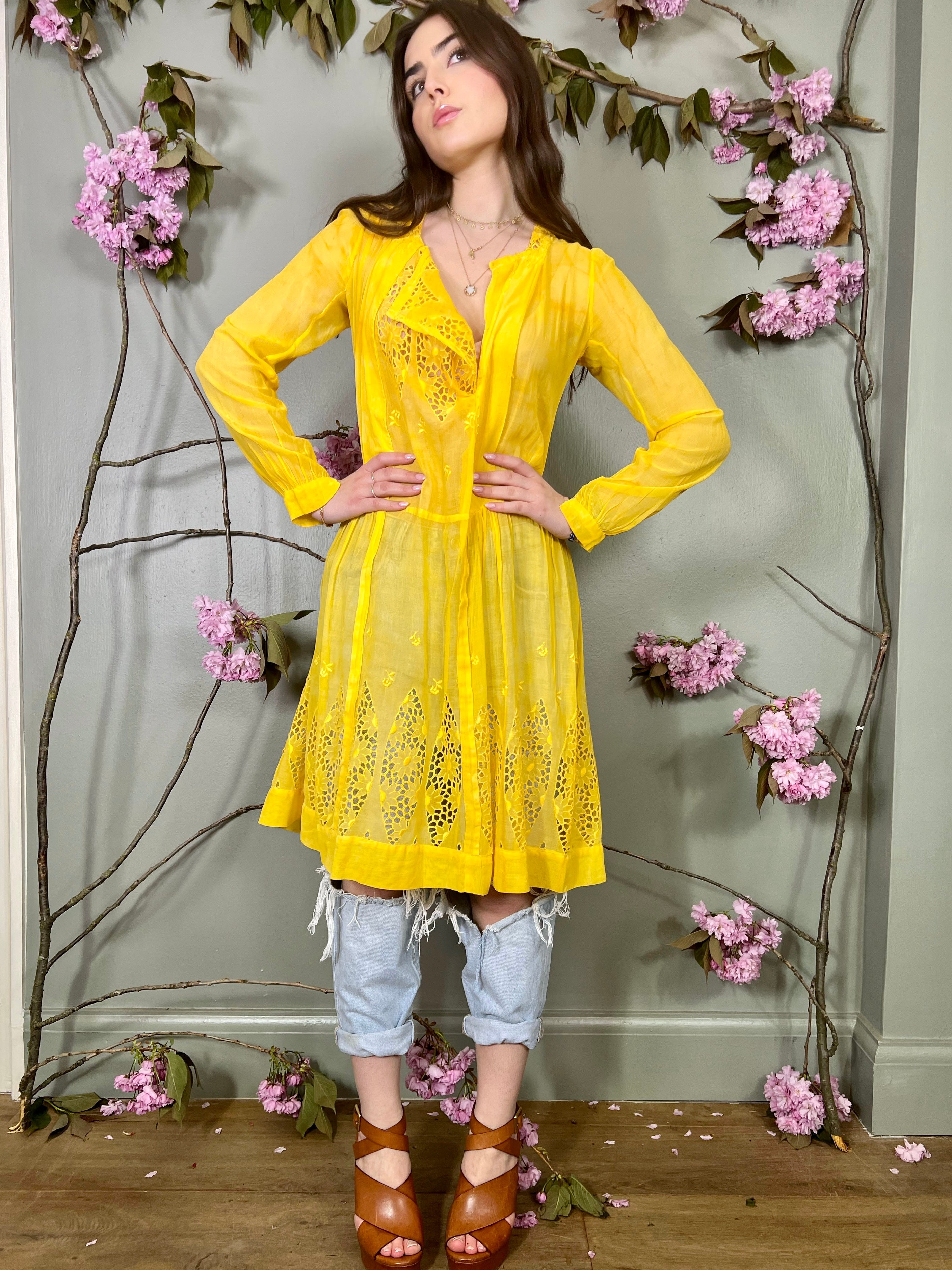 Gorgeous sunshine in a dress! Sun flower yellow hand dyes Victorian day dress with pretty detailing. Has long sleeves with buttons. An open chest detail that fastens with a button. Looks fab just layered over a bikini too.