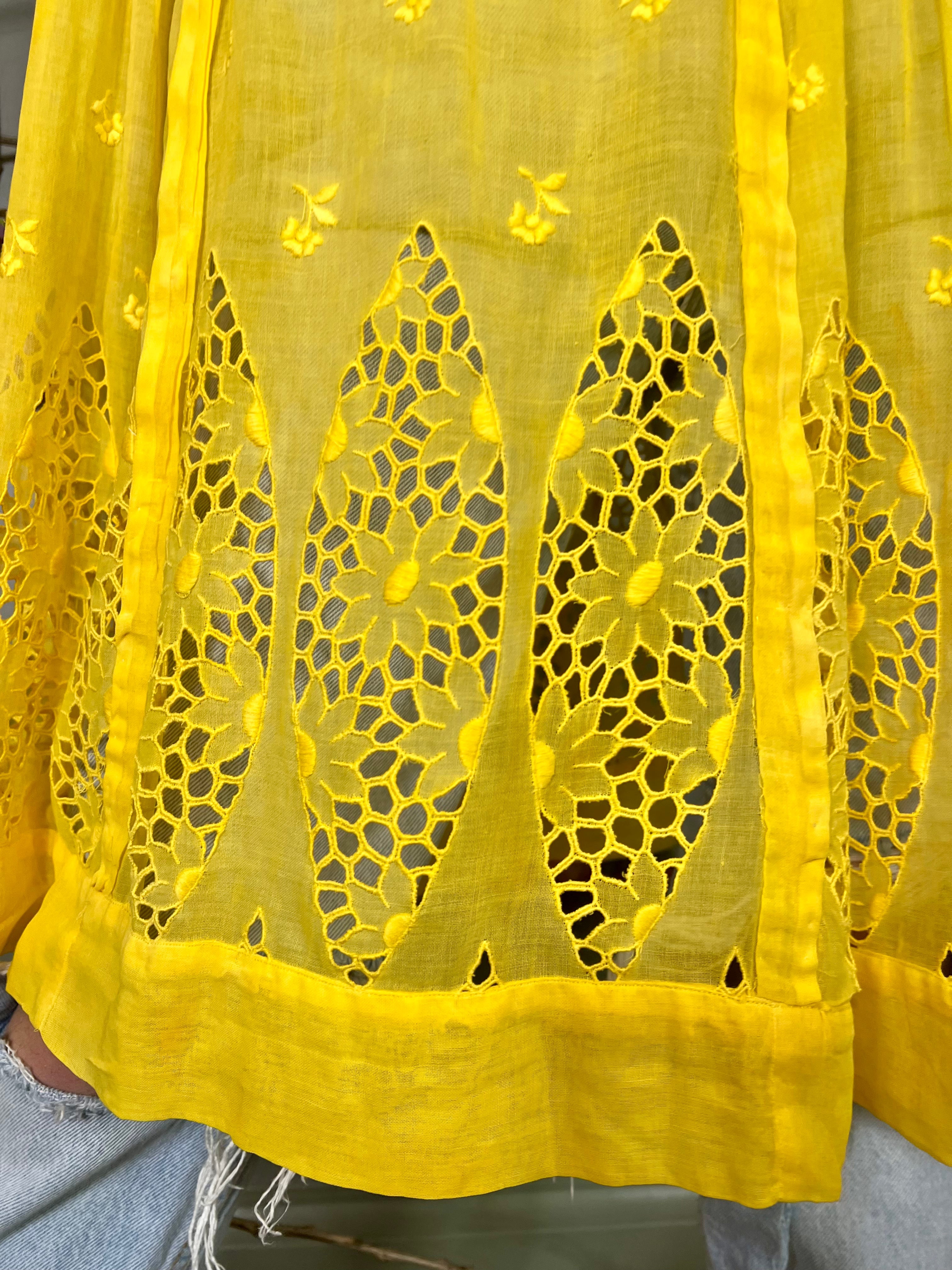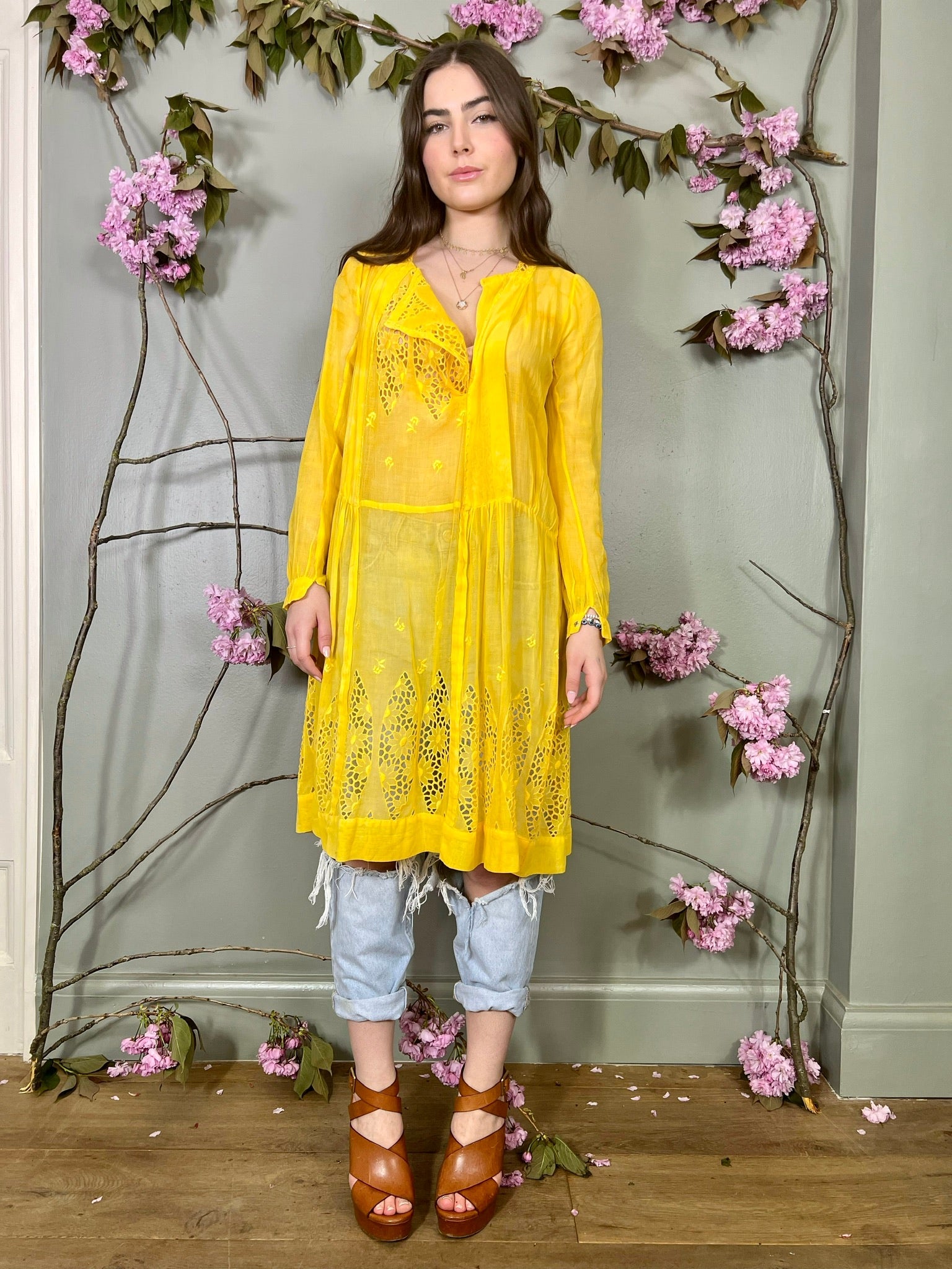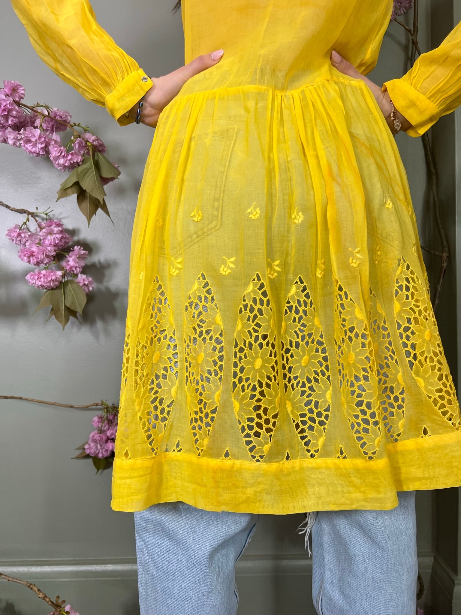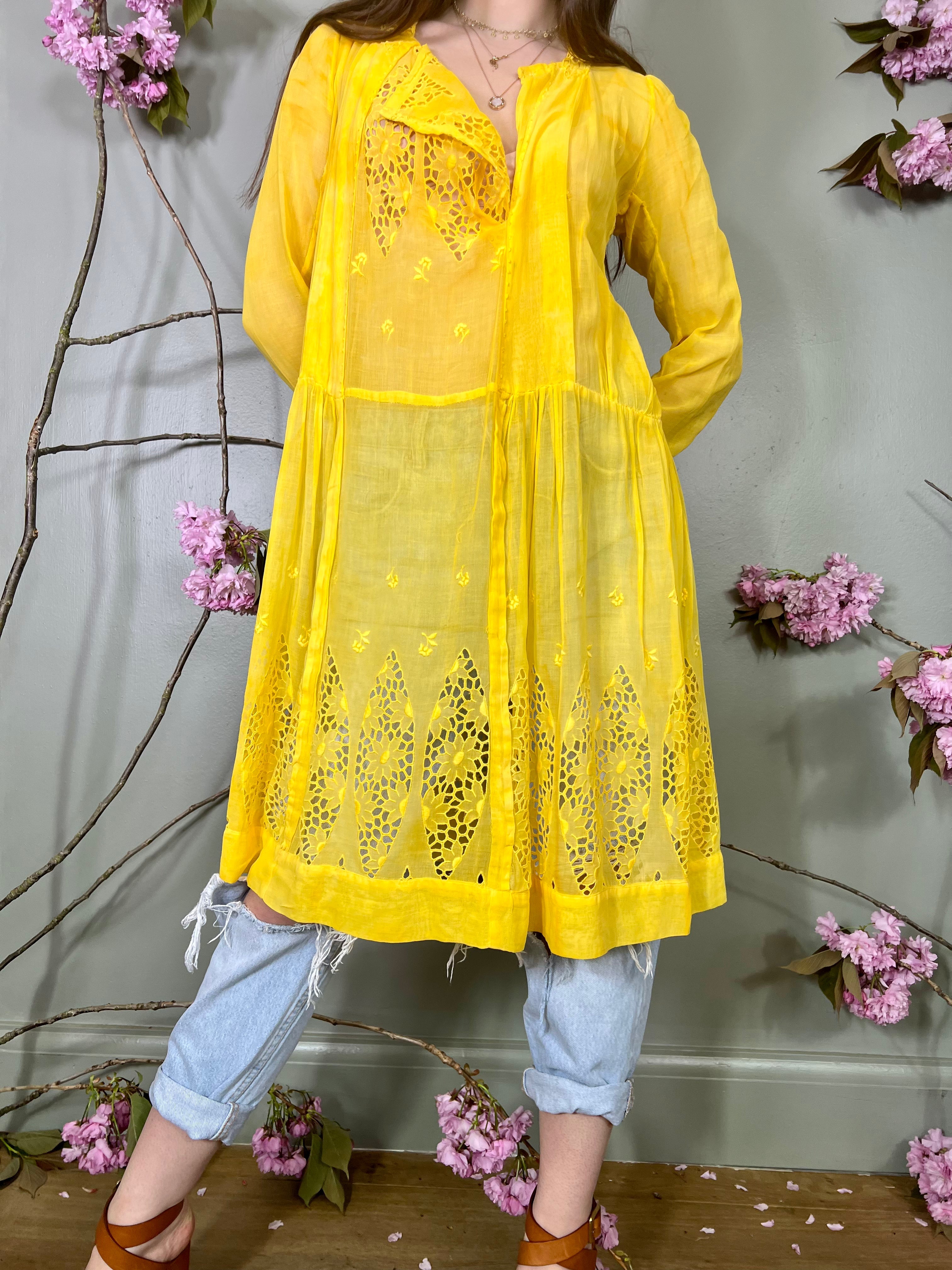 Gorgeous sunshine in a dress! Sun flower yellow hand dyes Victorian day dress with pretty detailing. Has long sleeves with buttons. An open chest detail that fastens with a button. Looks fab just layered over a bikini too.