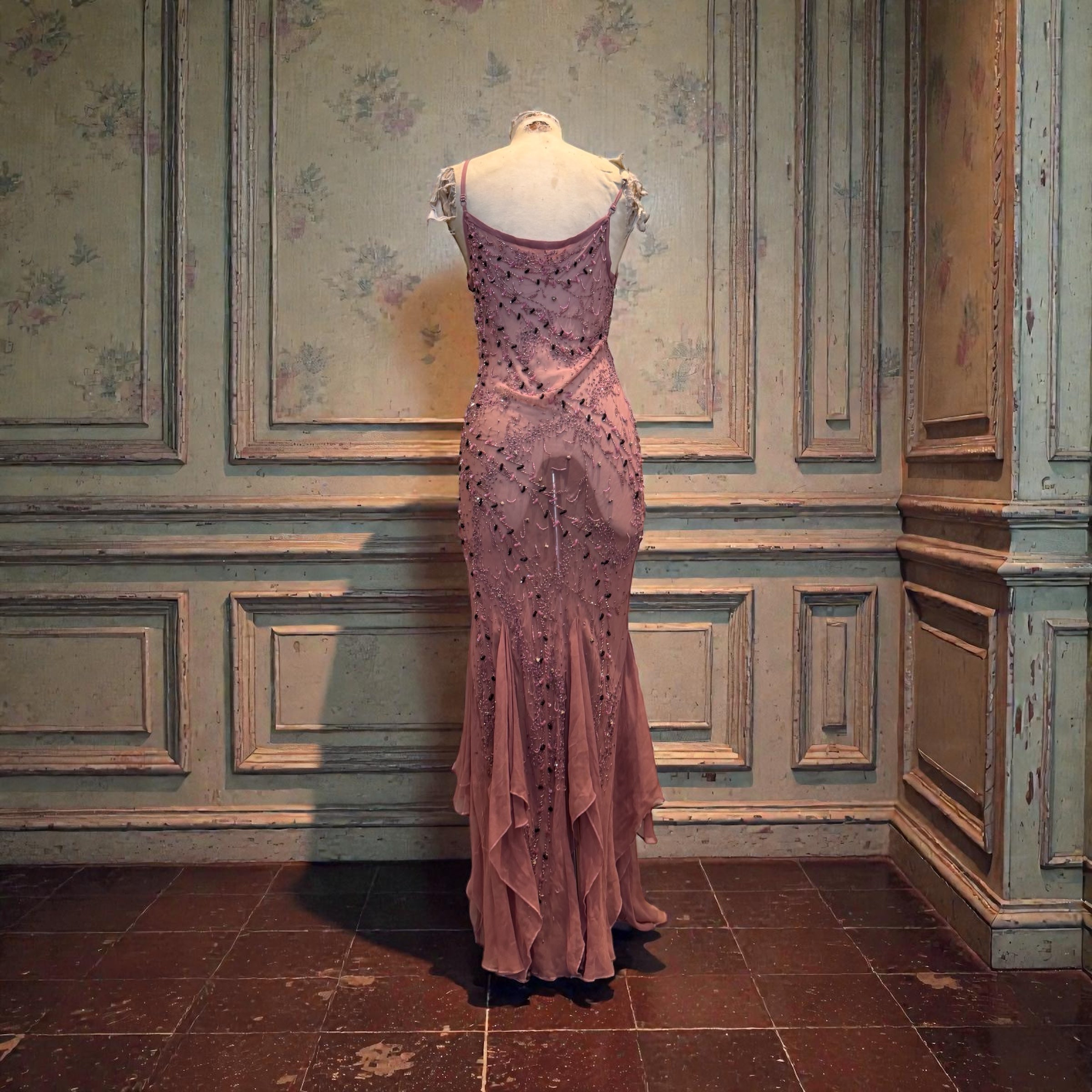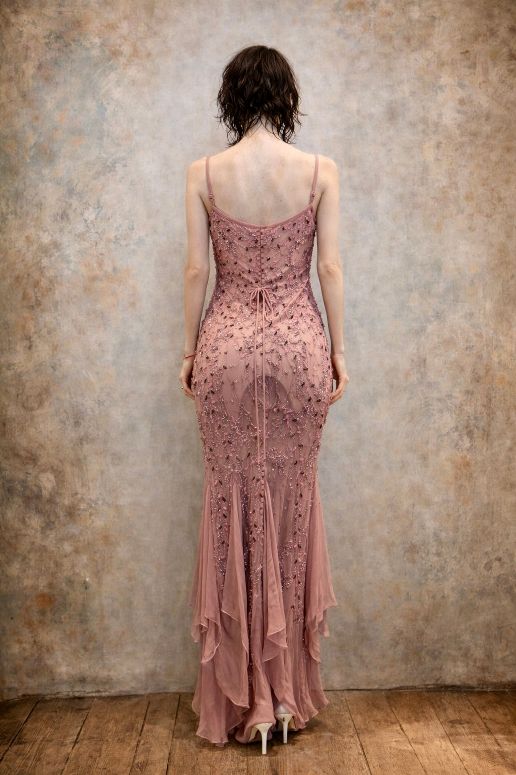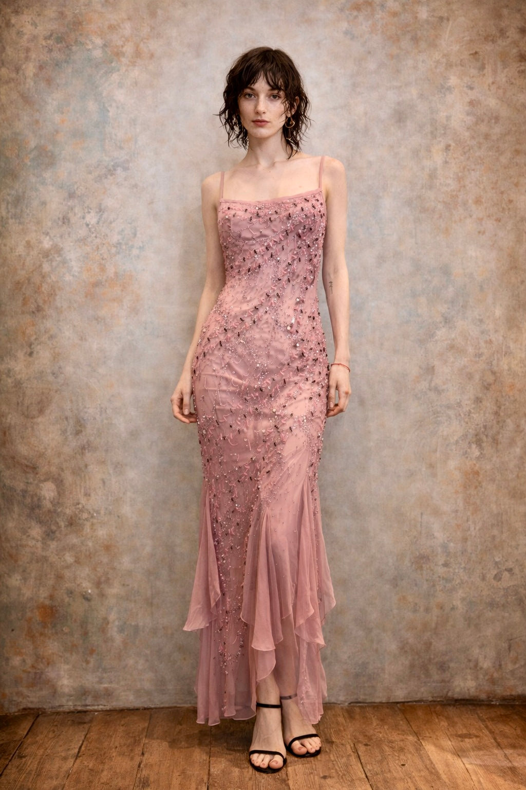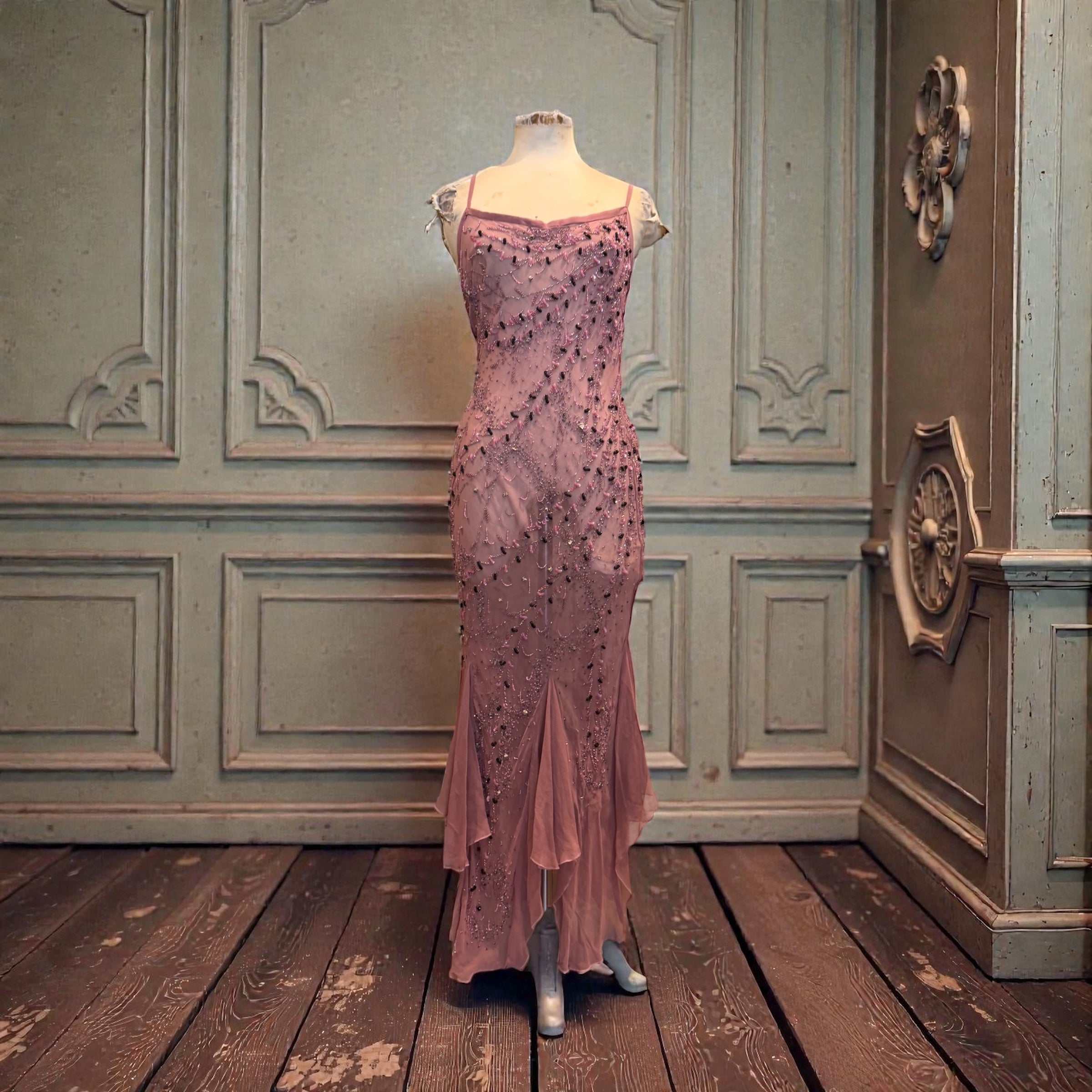 Marianne, 90s beaded antique pink silk bias cut frill dress