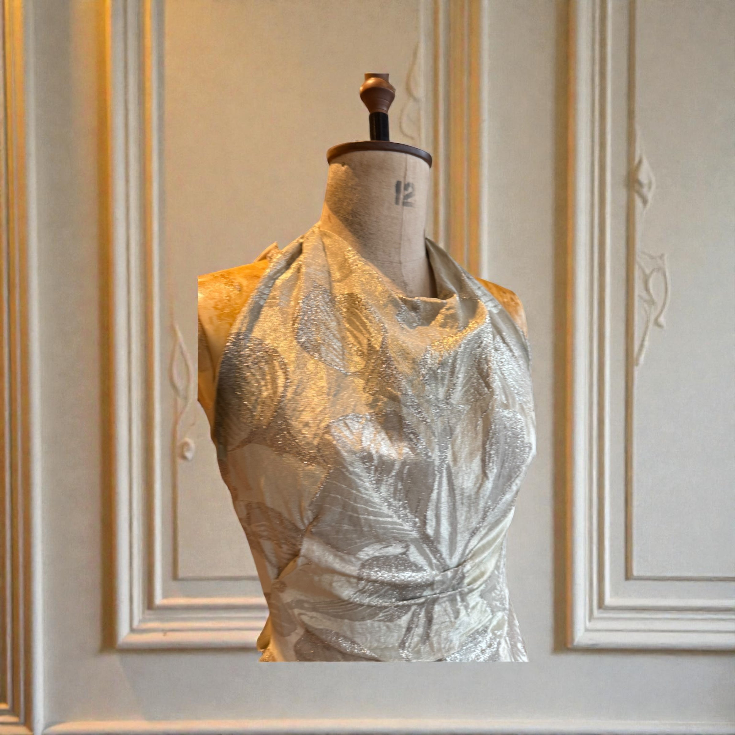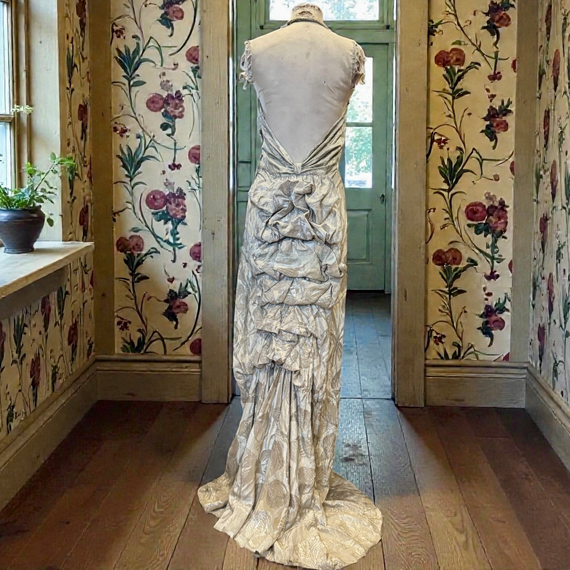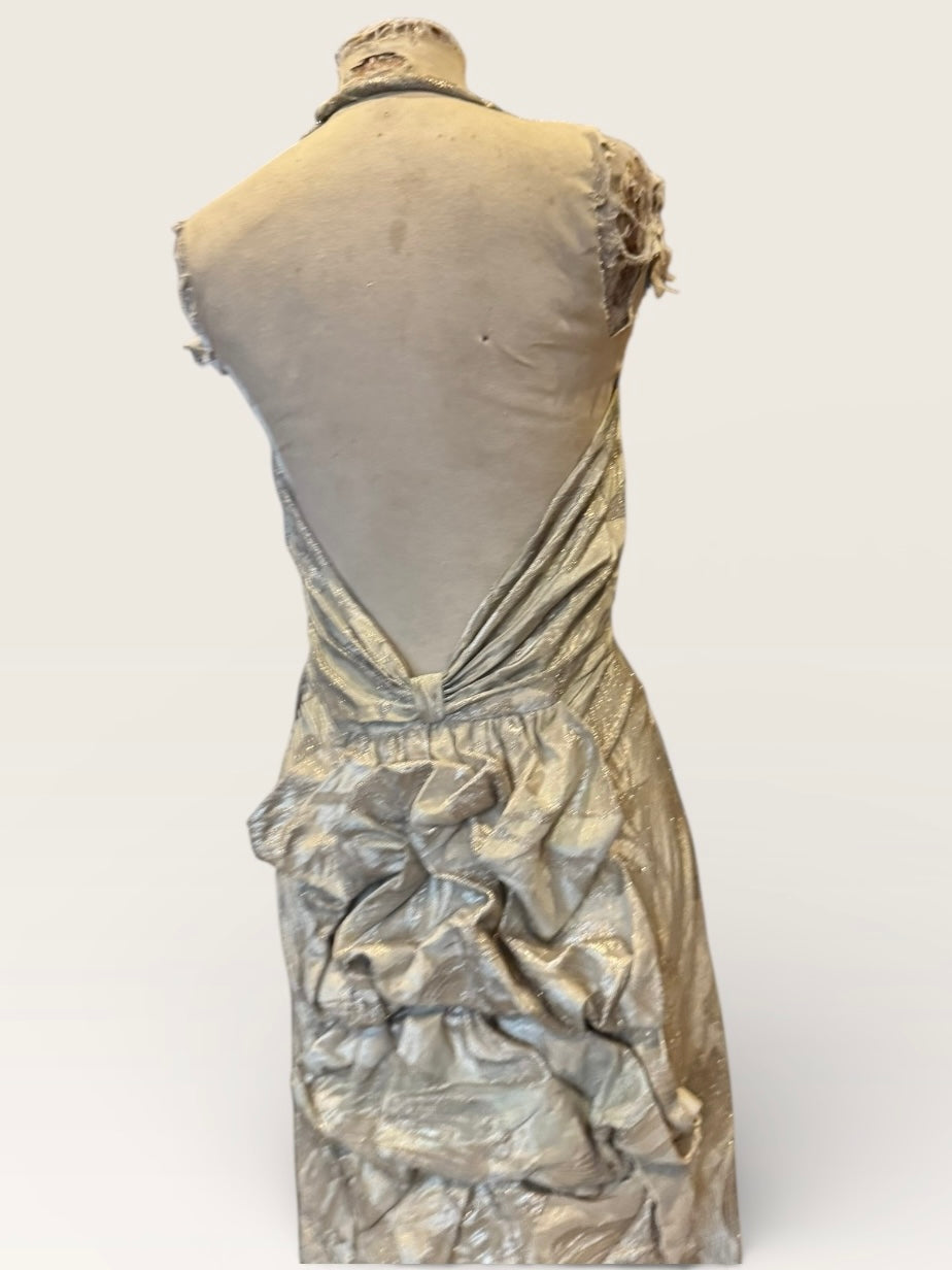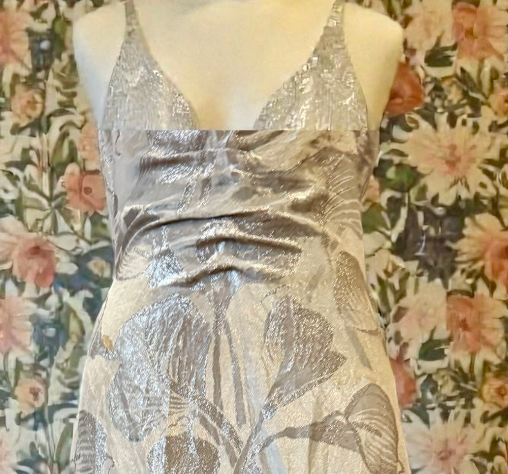 This museum-quality silver lamé gown epitomises 1920s elegance with its exquisite floral damask print and architectural construction. The halter neckline features a weighted coin insert for graceful draping, whilst the dramatically pleated bustle creates a cascading train that pools luxuriously at the back. A low back closure and concealed side zip ensure a refined, streamlined silhouette. A truly exceptional vintage piece that captures the sophistication and craftsmanship of the era. An heirloom to cherish forever.