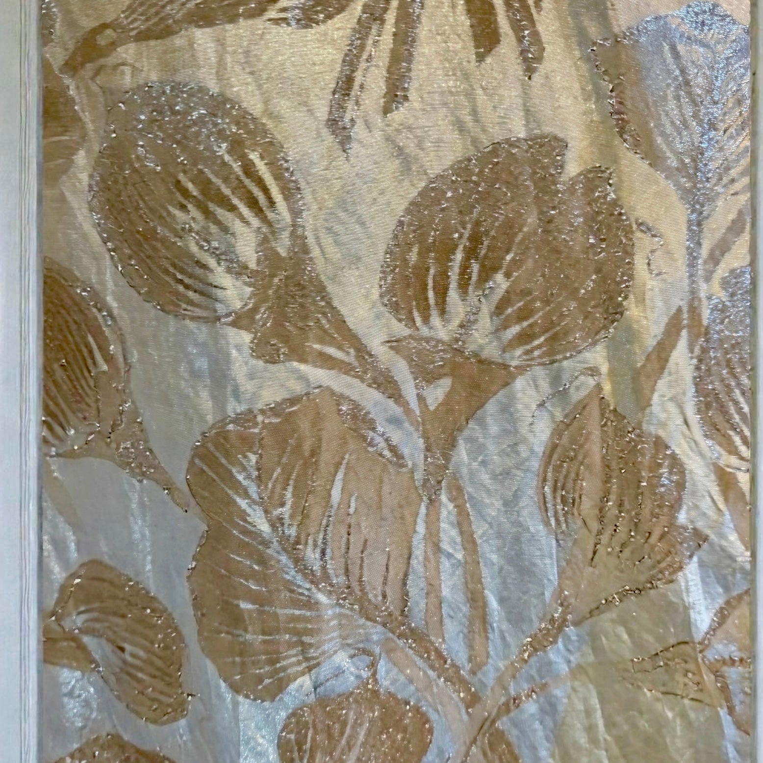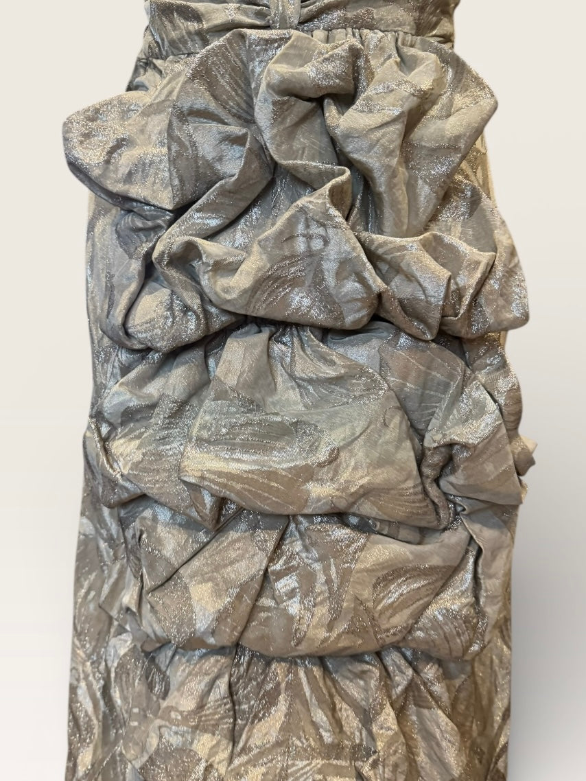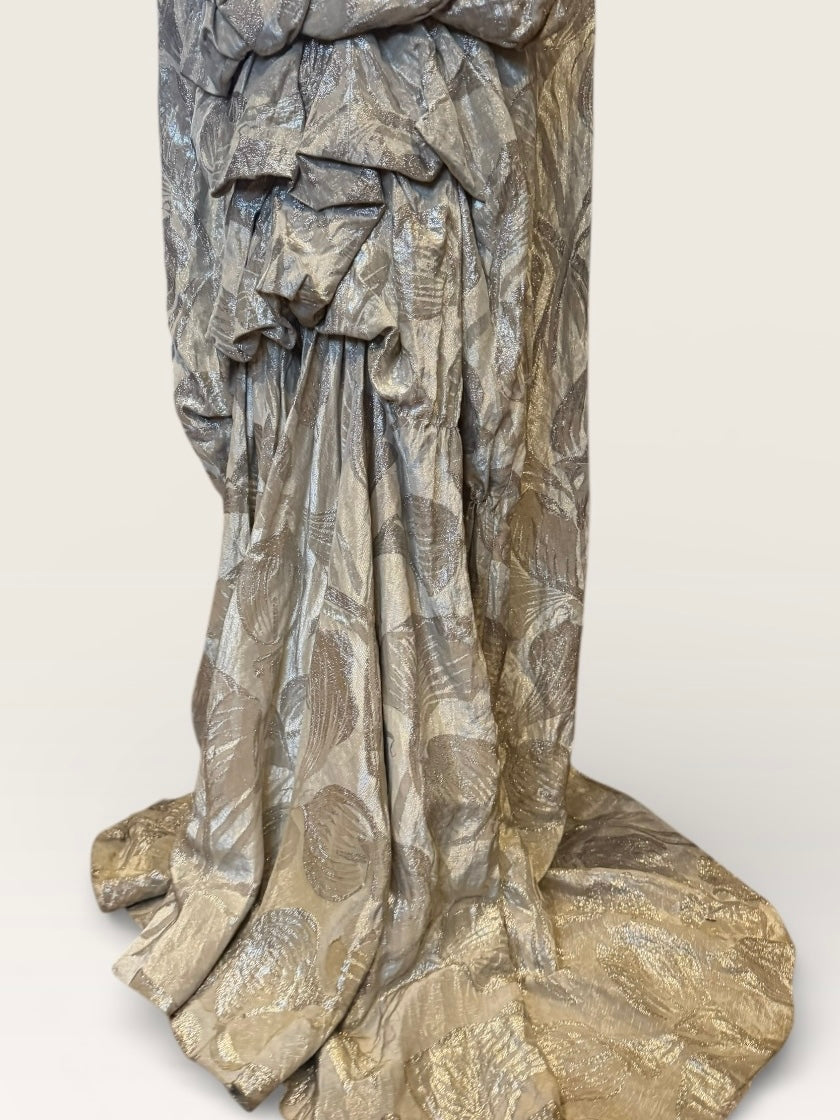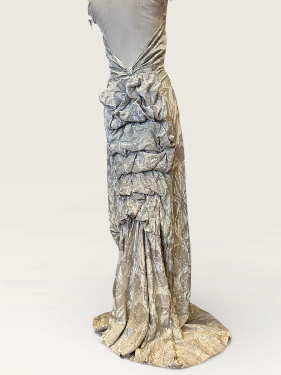 Monica, 20s silver floral lamé dress with bustle train