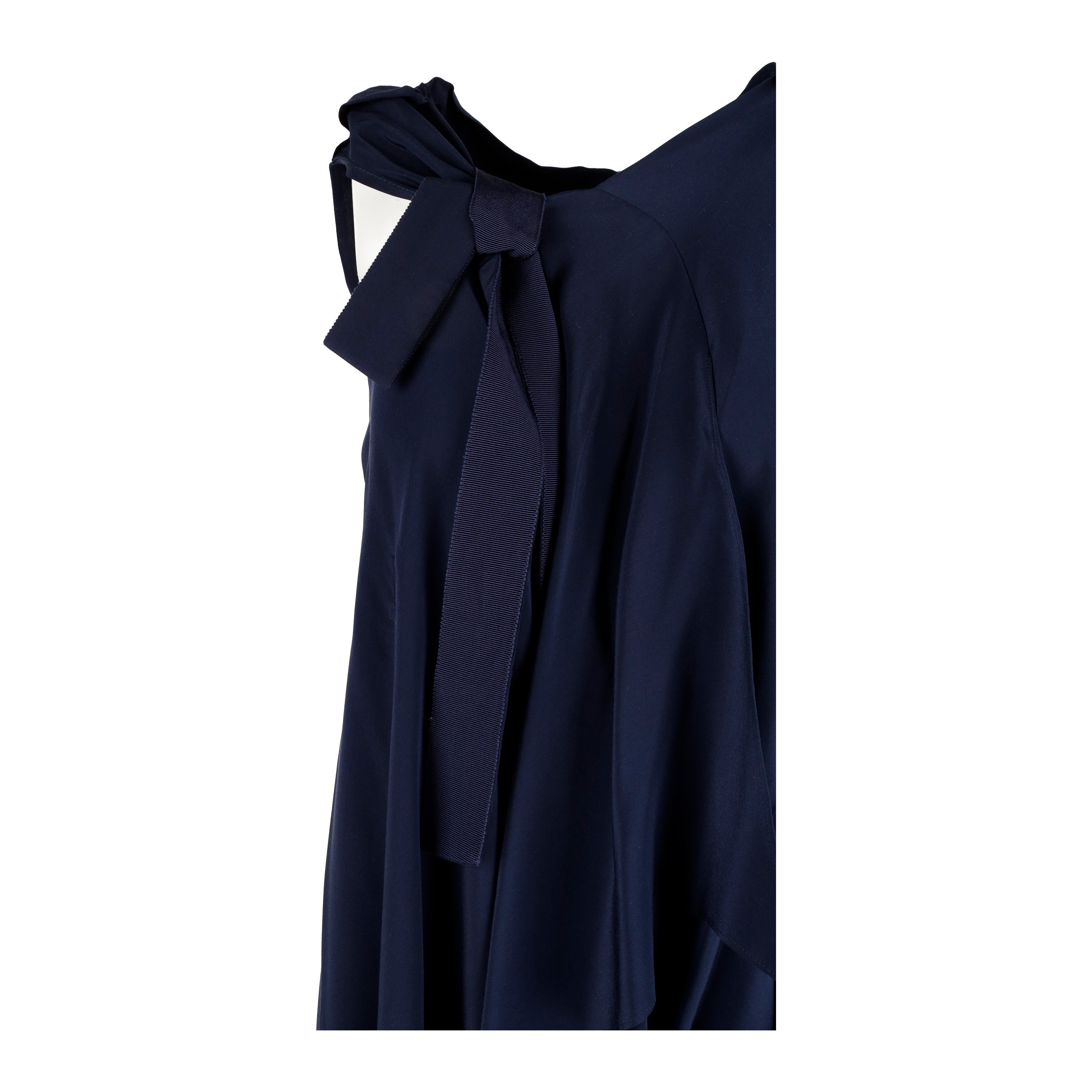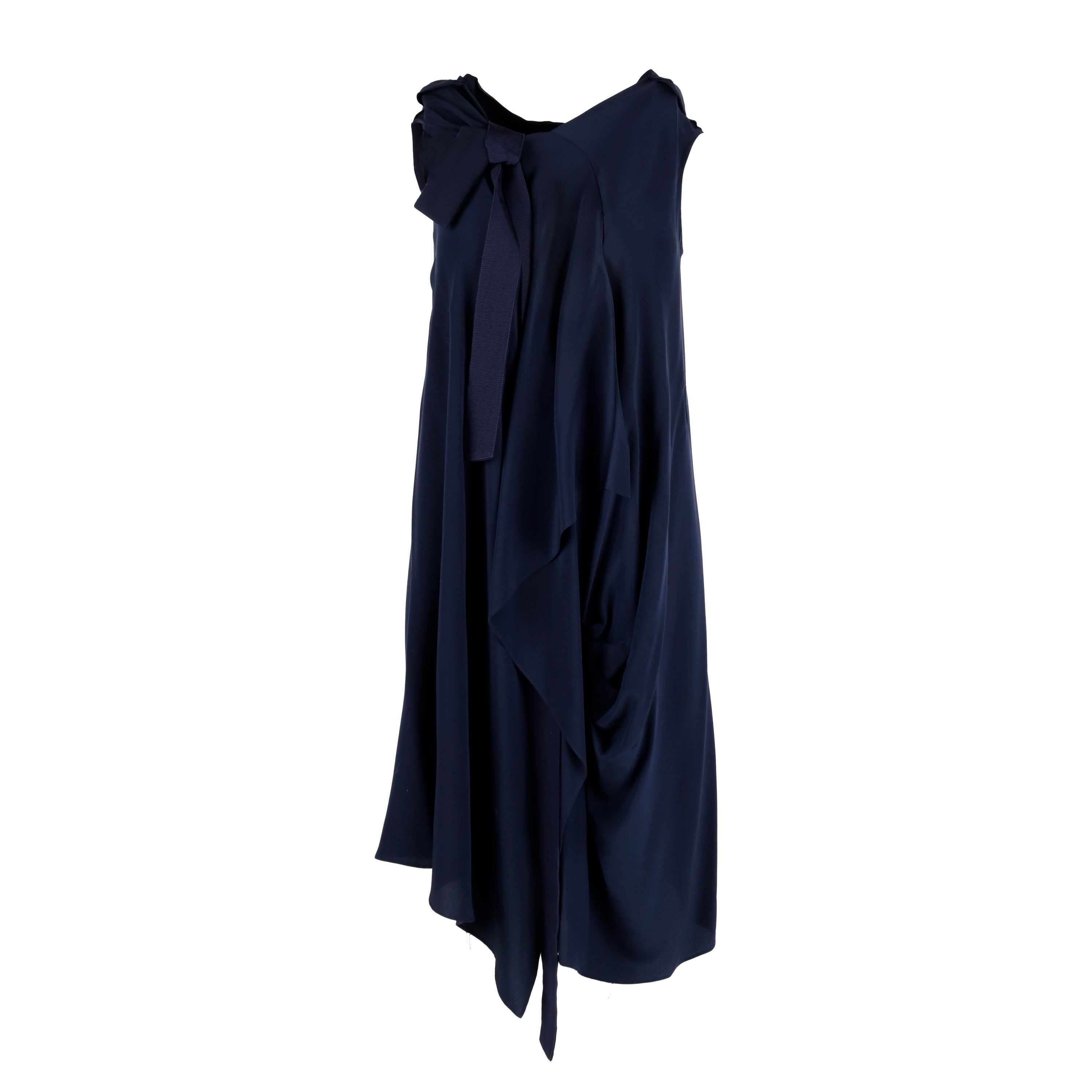 Crafted from 100% silk in a deep blue hue, this sleeveless dress features a front ruffled panel that creates a flowy, asymmetric hem. The tie ribbon allows for endless styling possibilities. Add a touch of elegance and versatility to your wardrobe with this Moschino dress.