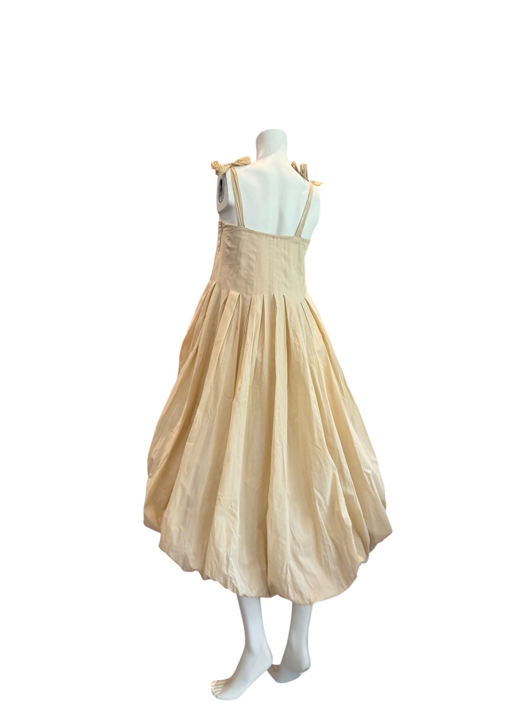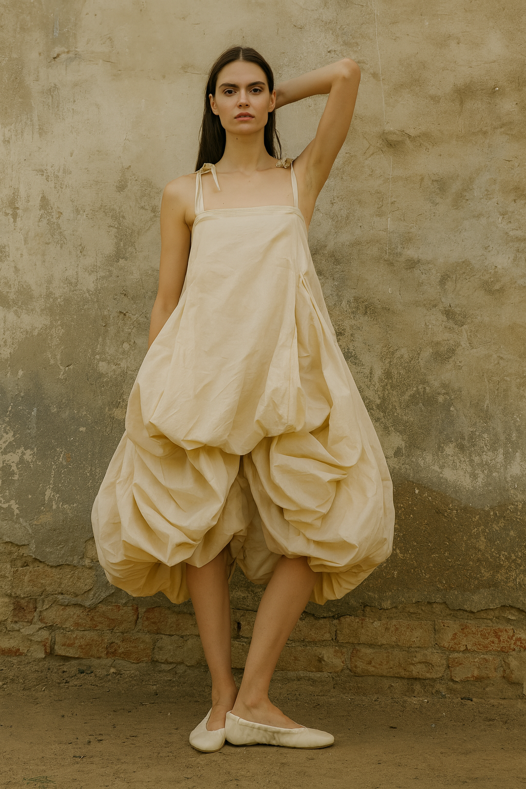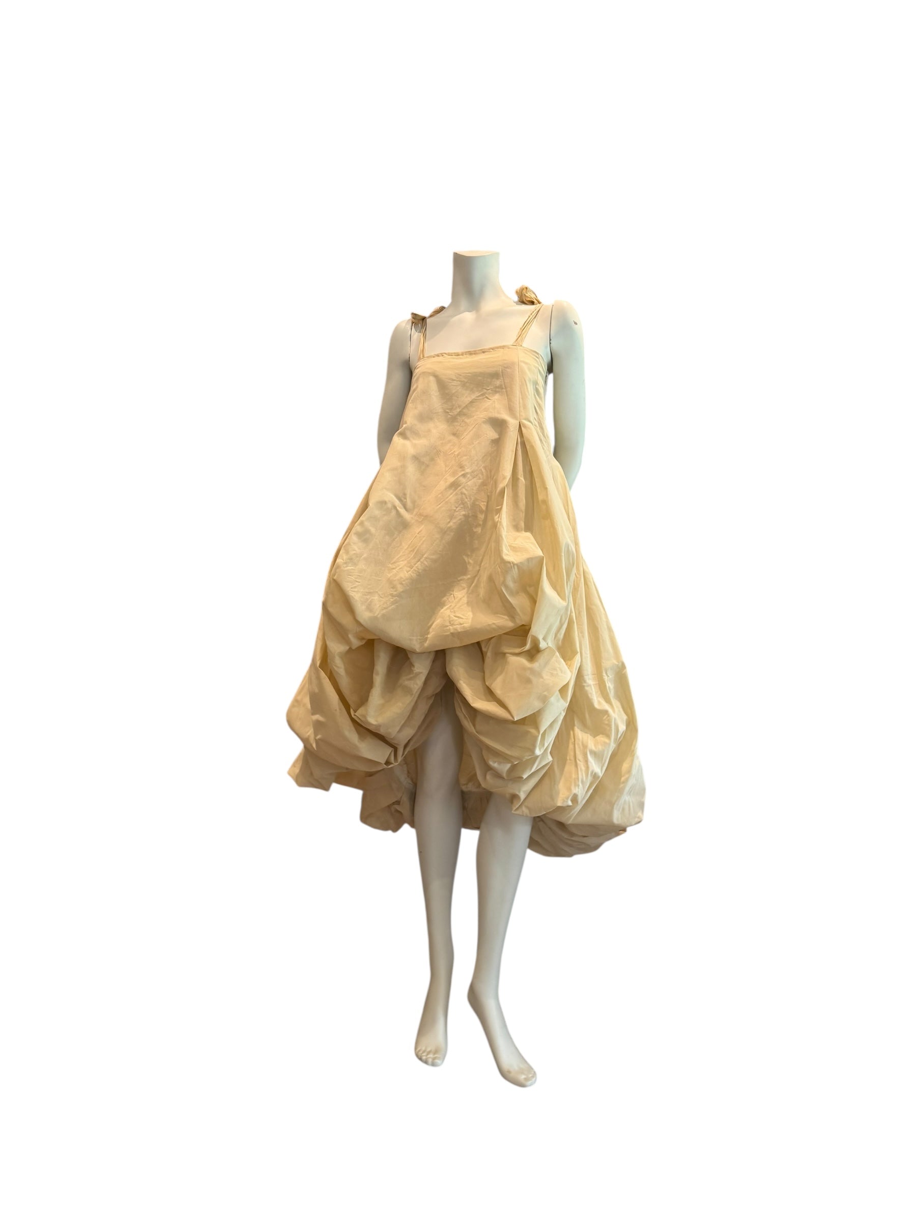 This one of a kind reworked and salvaged silk parachute dress features a Norma Kamali inspired iconic drapery and an articulated silhouette. The internal lining has ties that can be tied to create a draping effect.