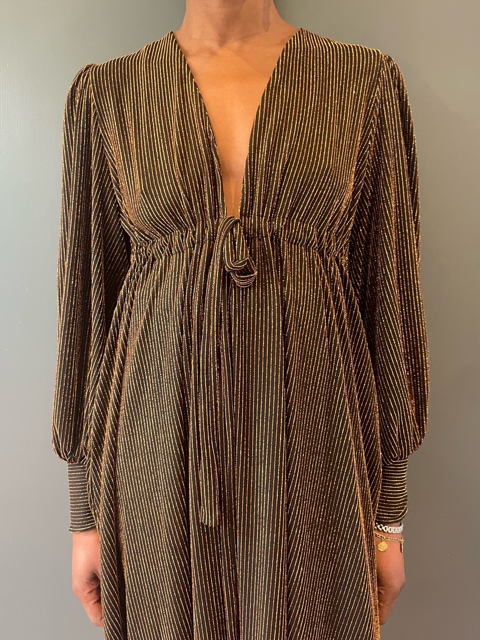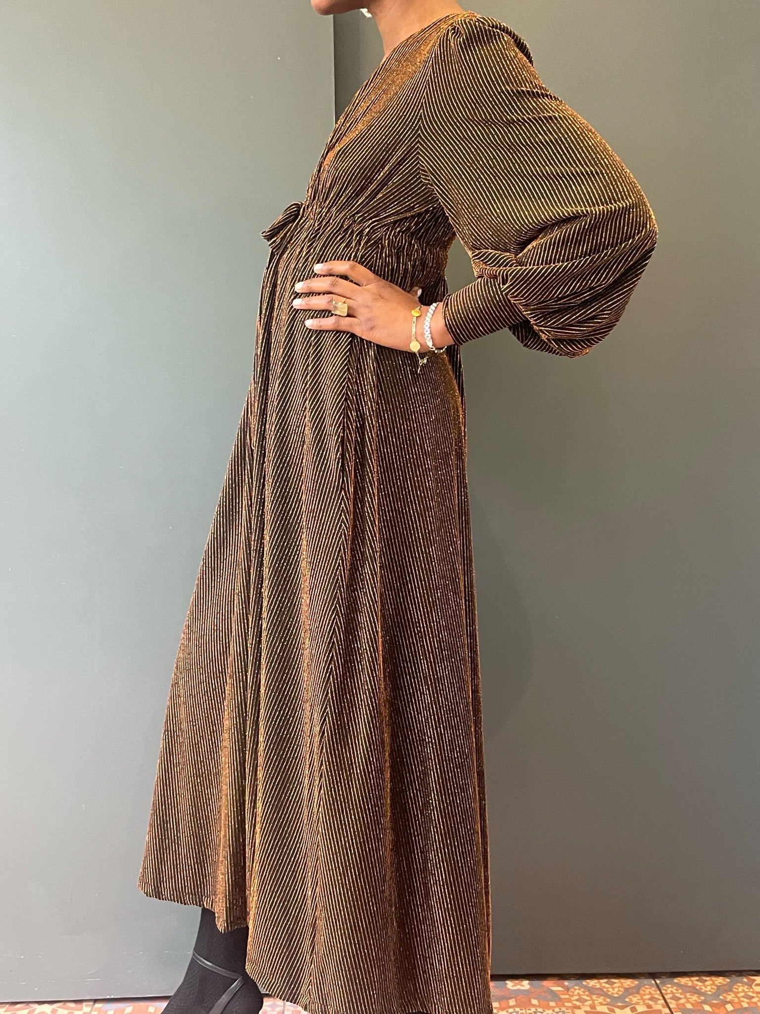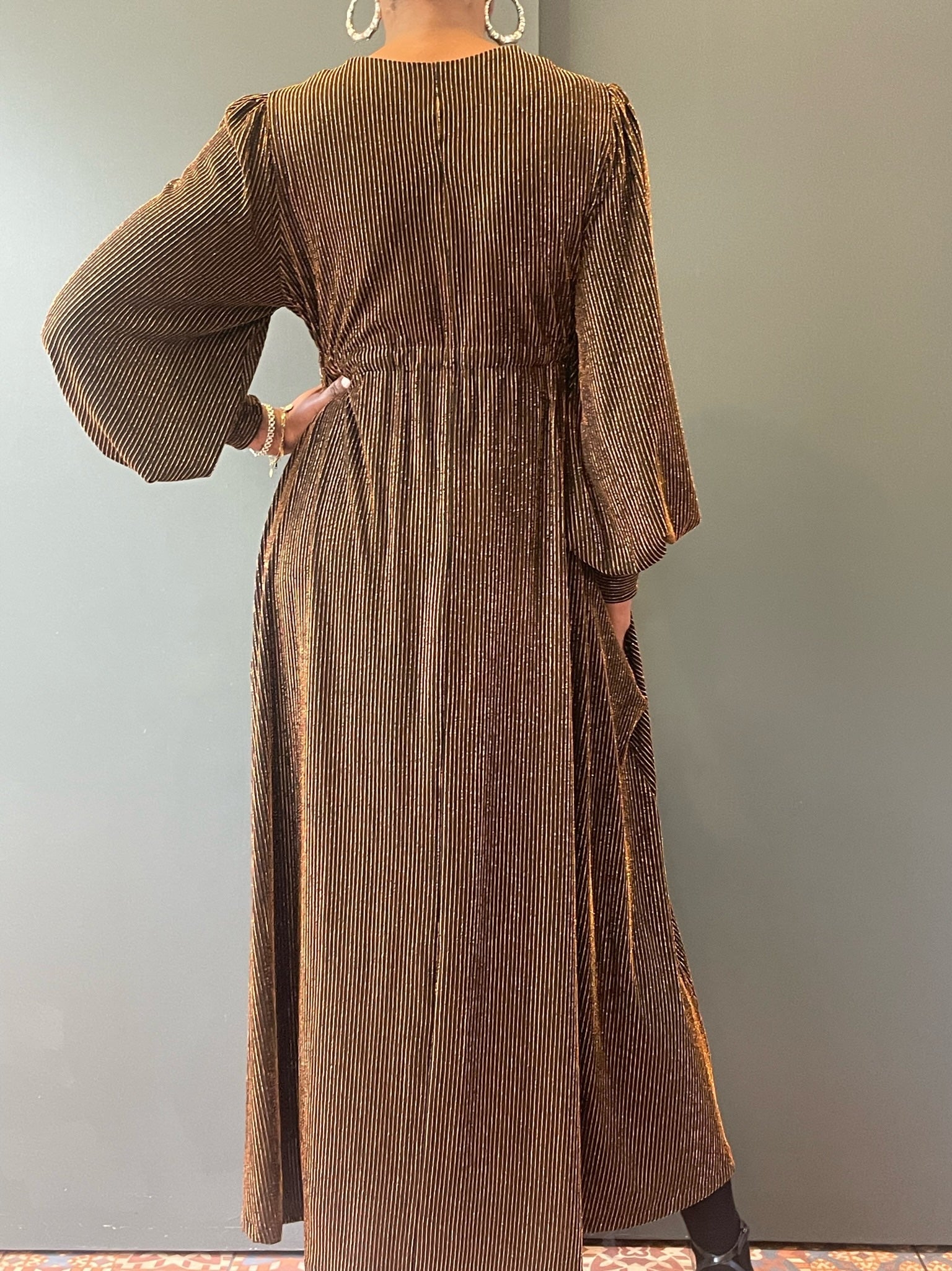 Each Percy Dress is made from vintage end-of-roll or dead-stock fabric sourced during my travels, making every piece unique, sustainable, and part of a limited batch. This edition is crafted from stunning gold glittery lurex stripe. Once it’s gone, it will not be restocked.
