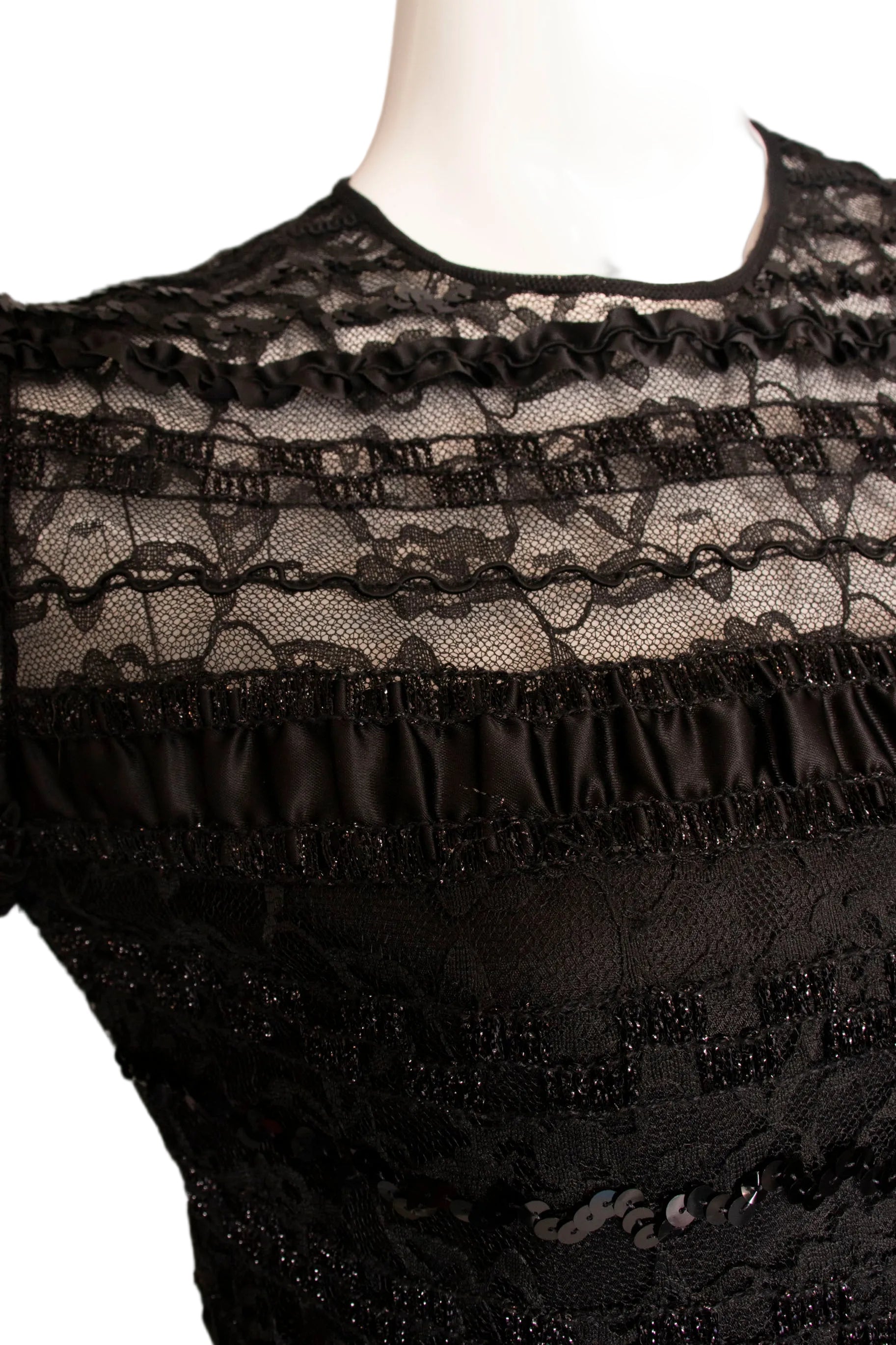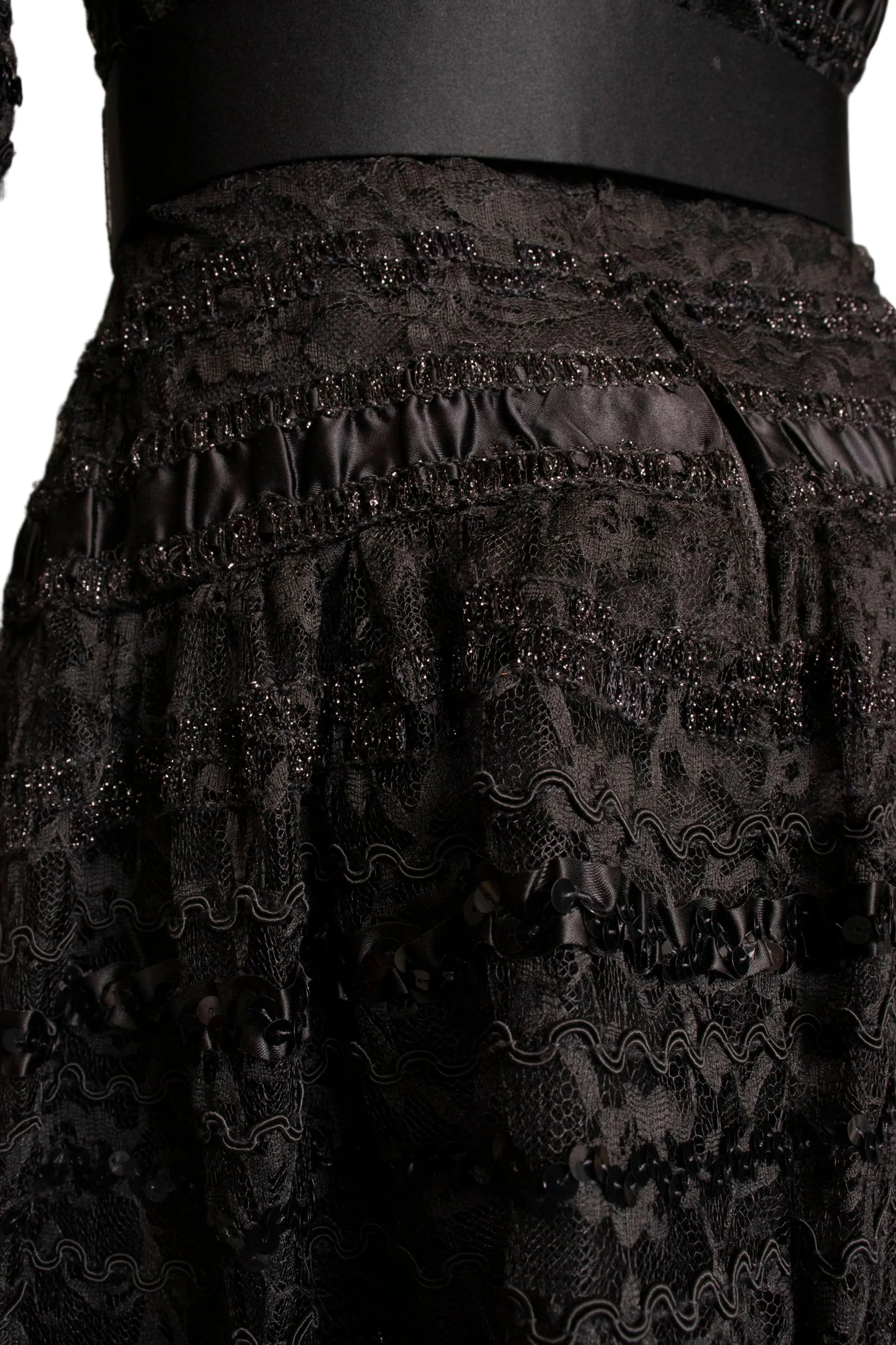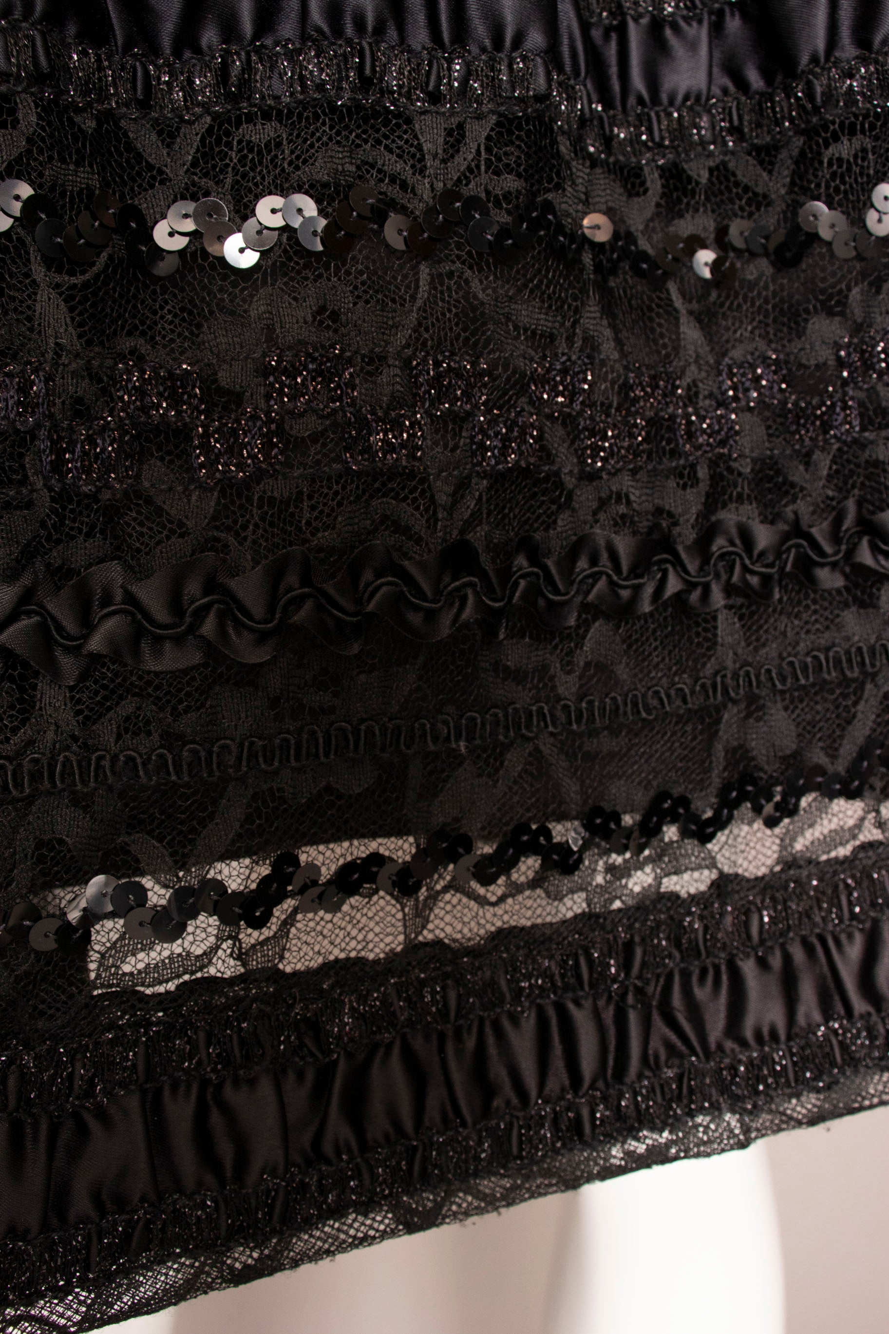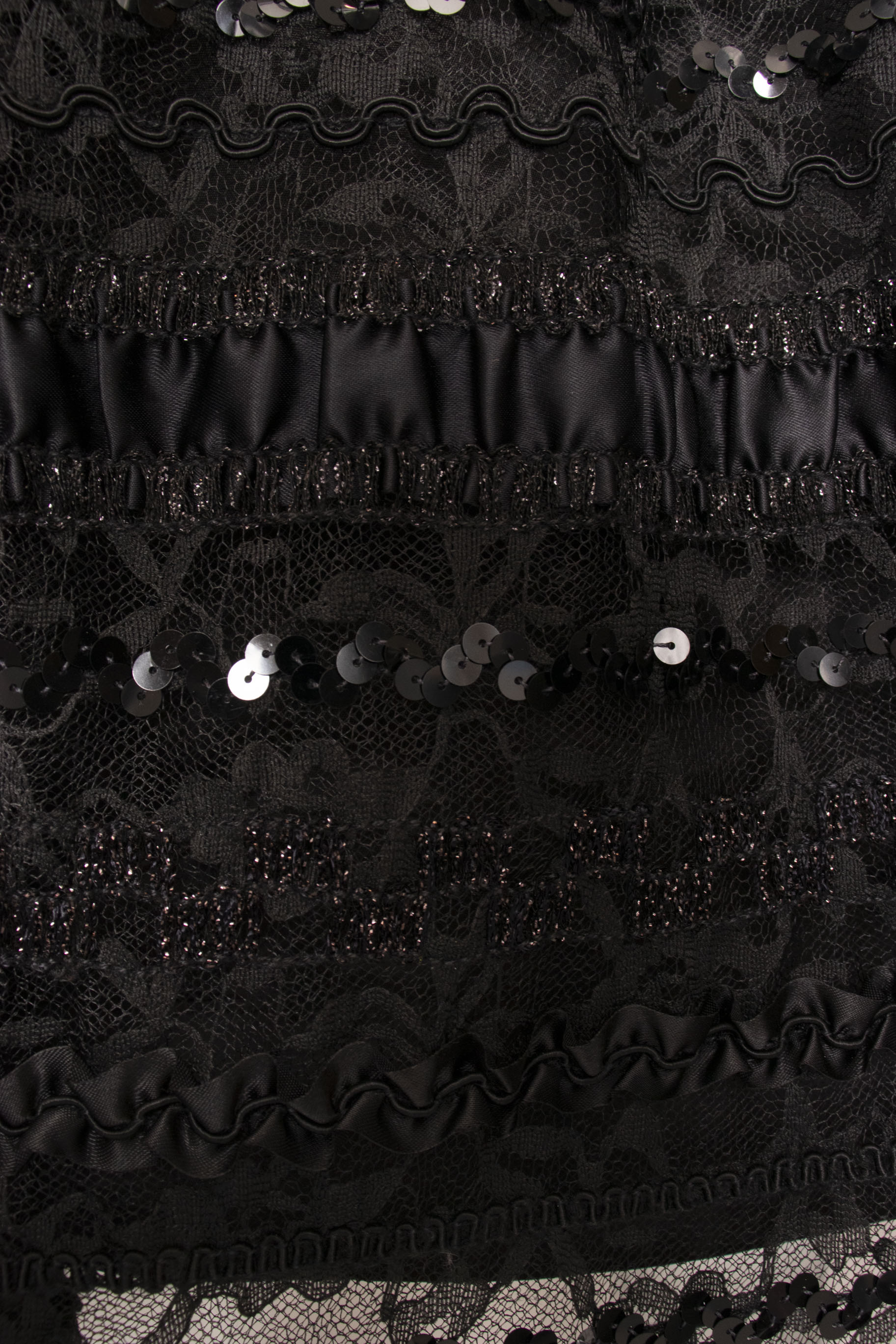 - Fabric: No content tag. Sequined lace and black silky fabric.