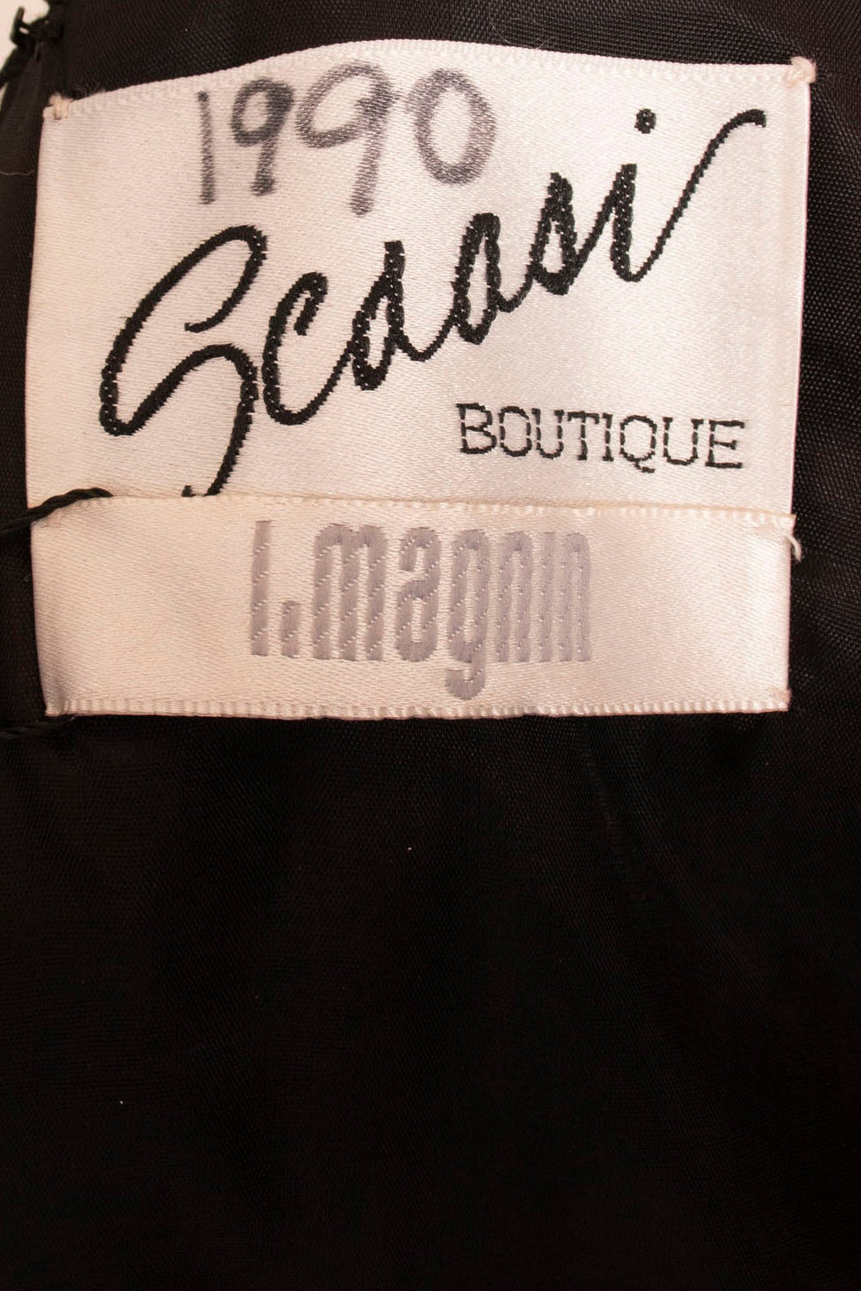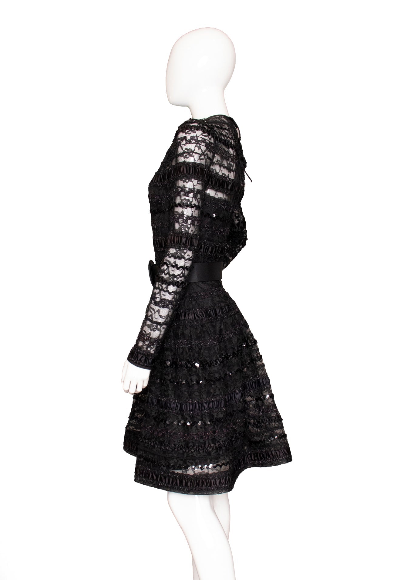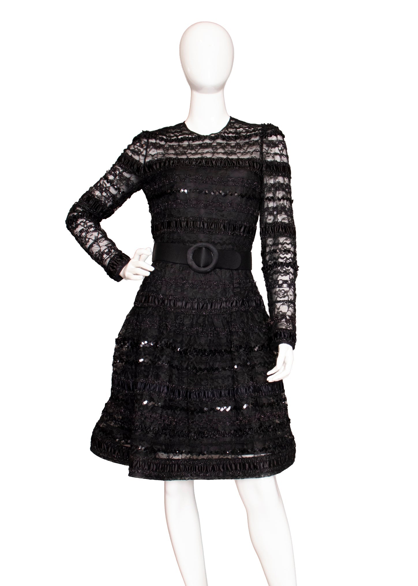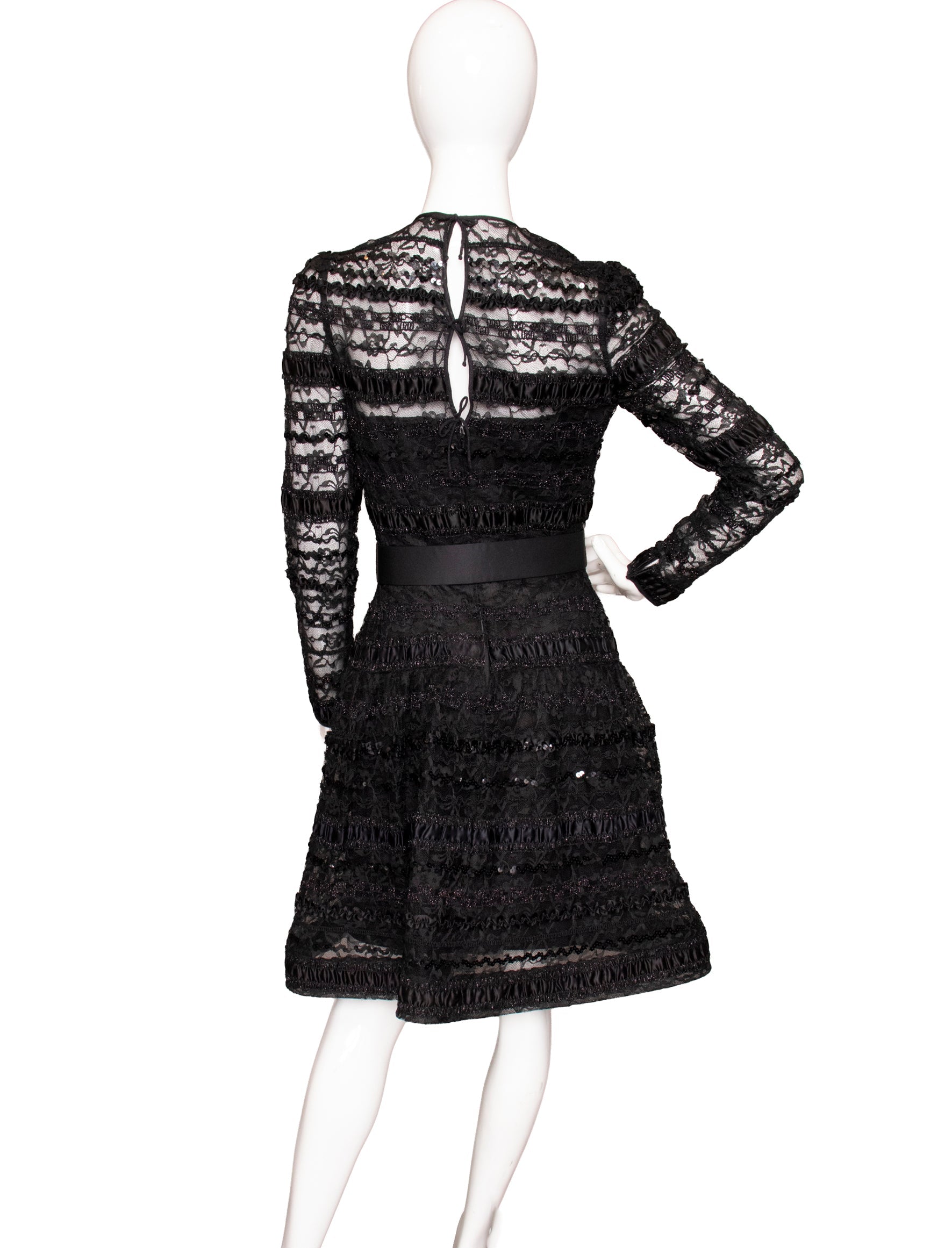 The classic little black dress redefined by master dressmaker to the stars, Arnold Scaasi. Gorgeous, inky black lace is intertwined with back satin ribbon, sheer at the collar, sleeves and hemline. The structured hem gives a fun and flirty look, while the back detail offers a peekaboo detail. We did the best we could to restore the belt without compromising the integrity of the design. Her new owner will have the opportunity to replace the belt or snip the belt loops and go without.