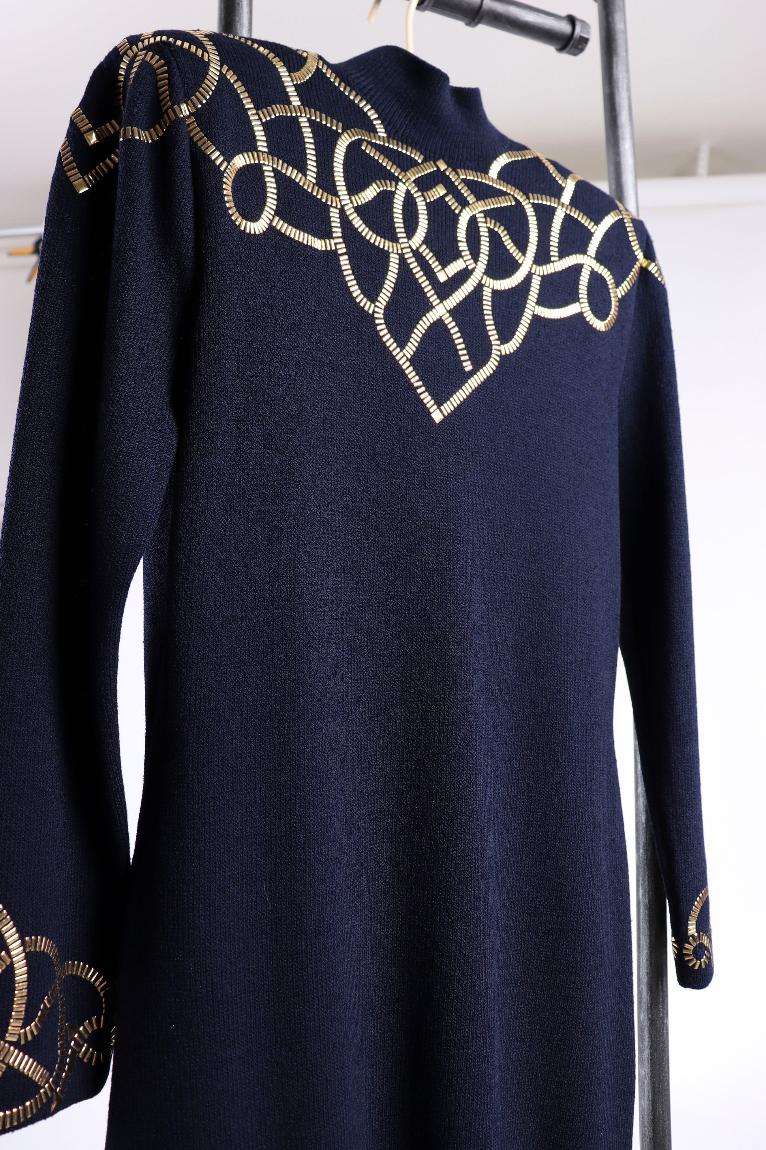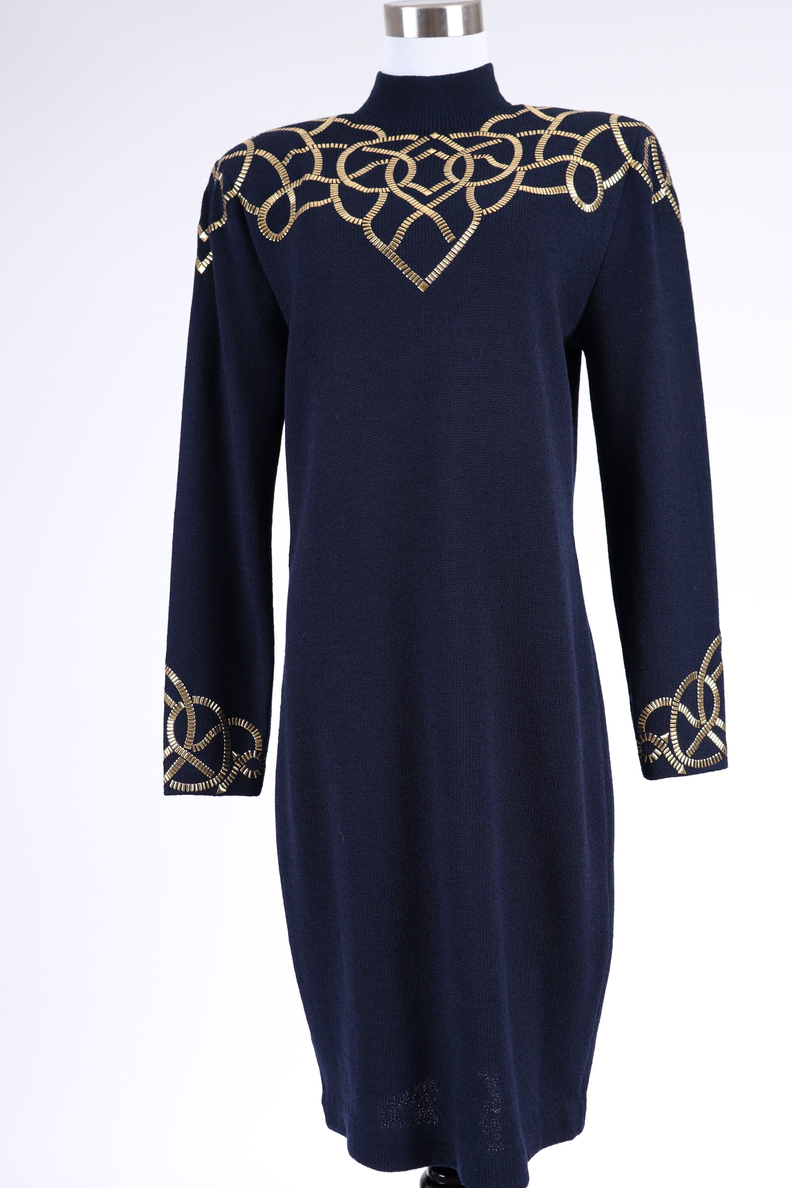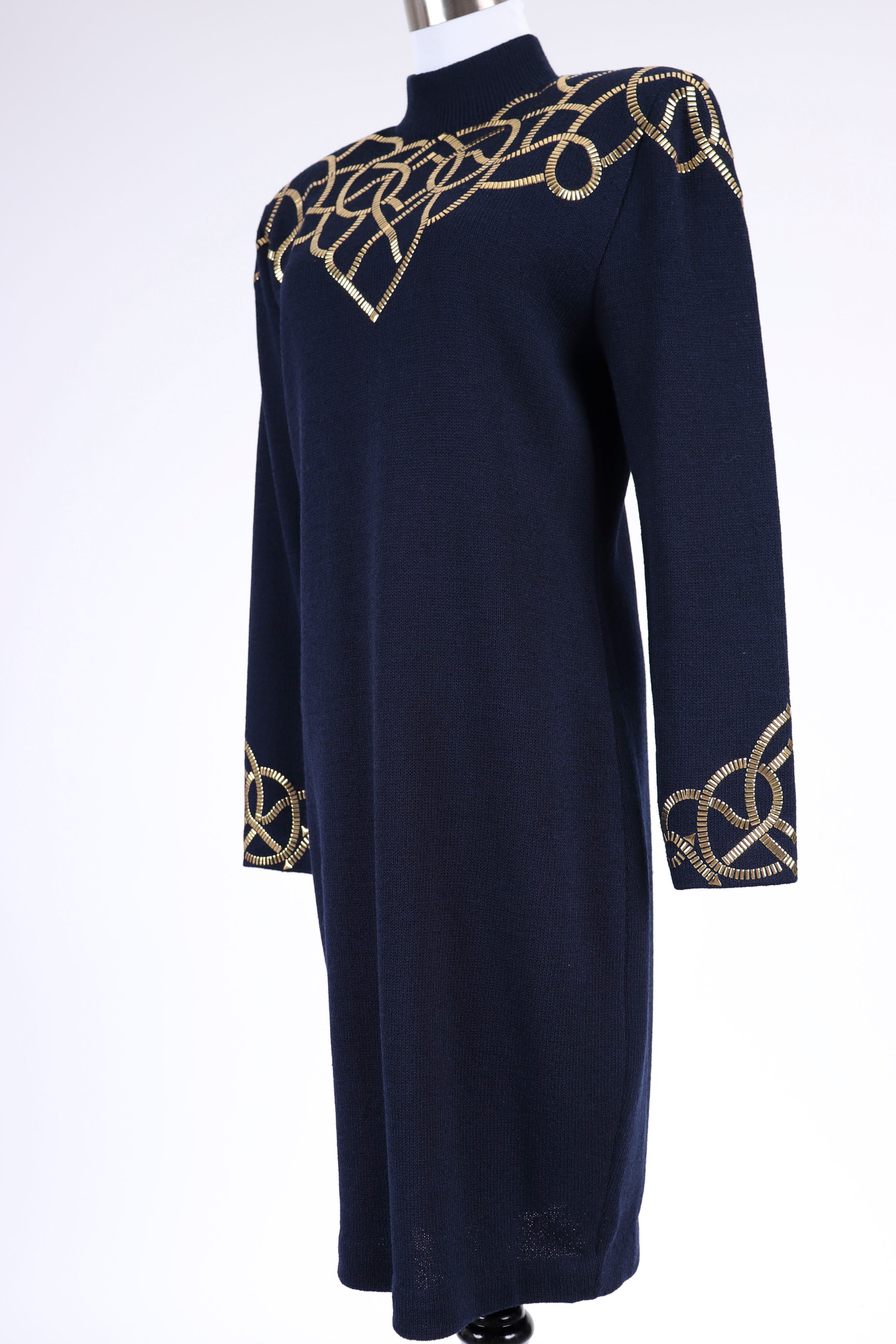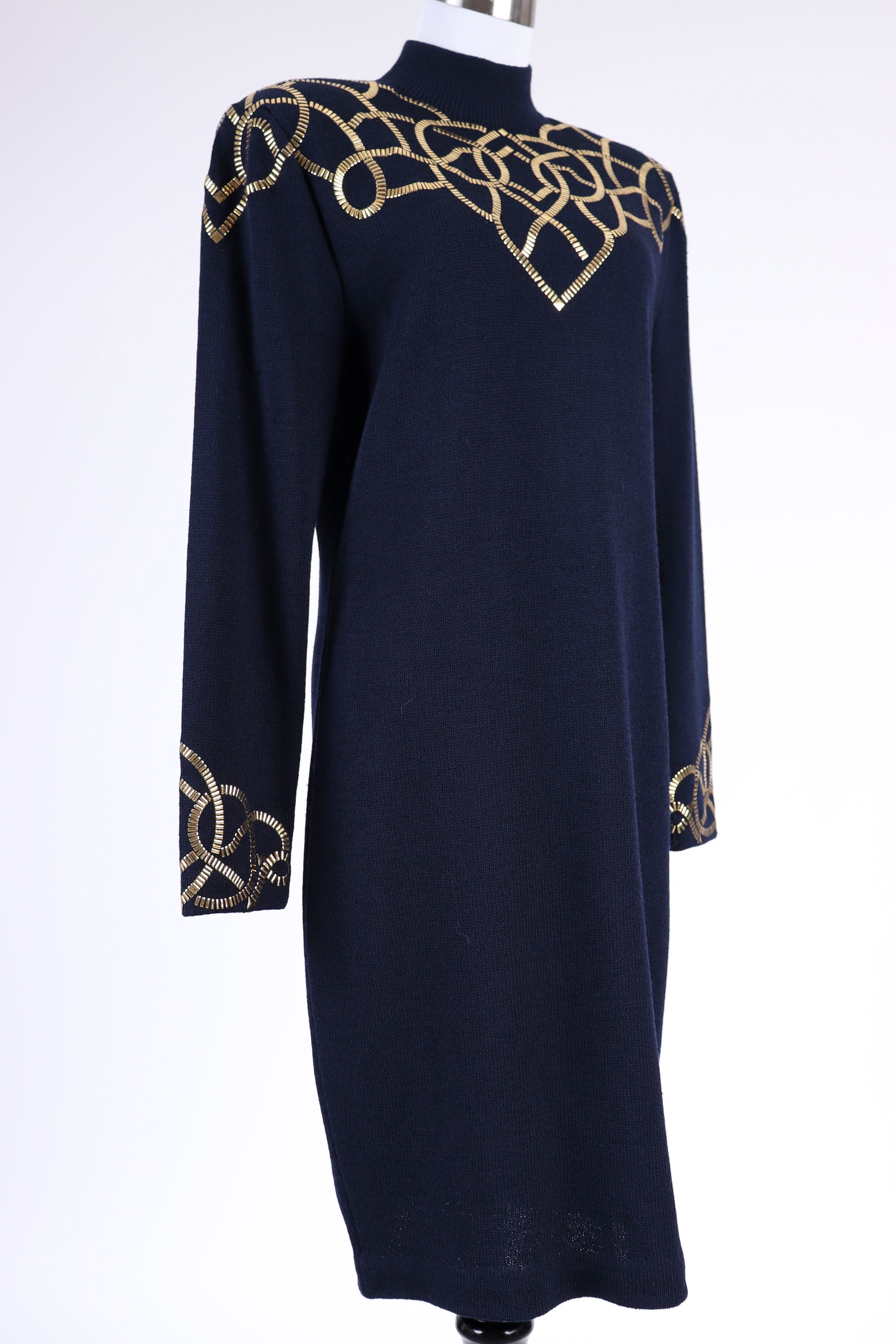 1980's St. John Knit Gold Embellished Navy knit dress.