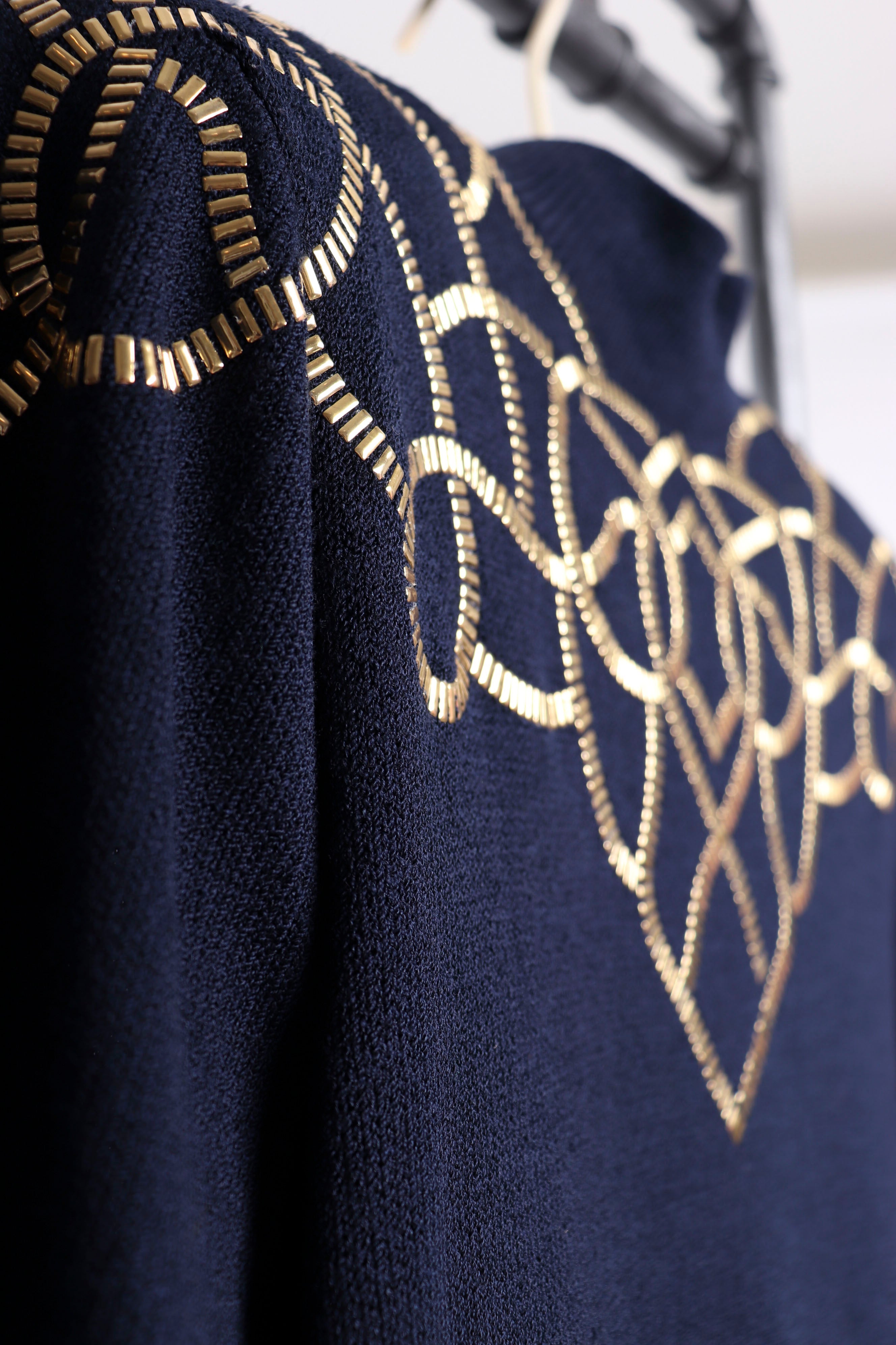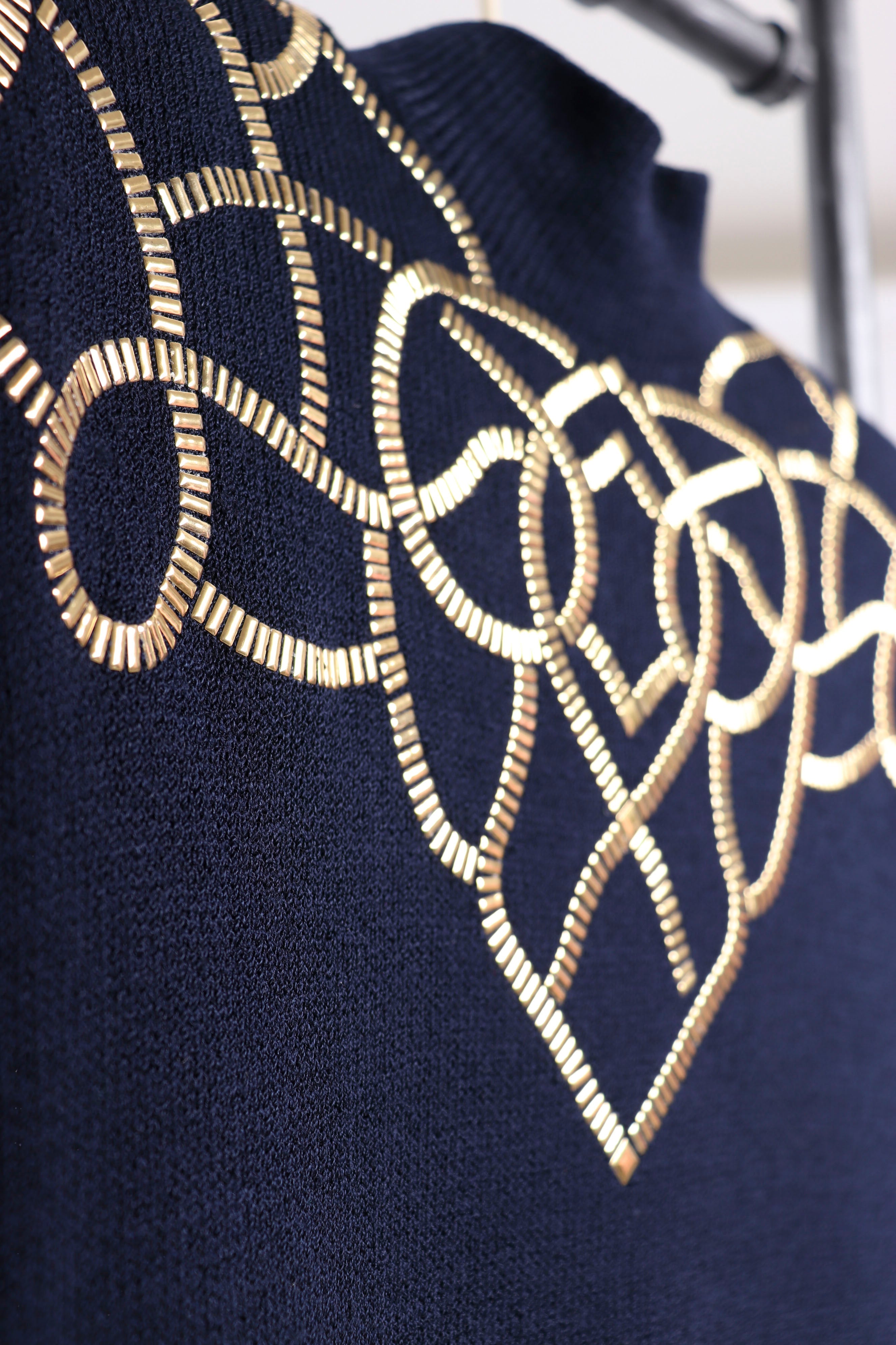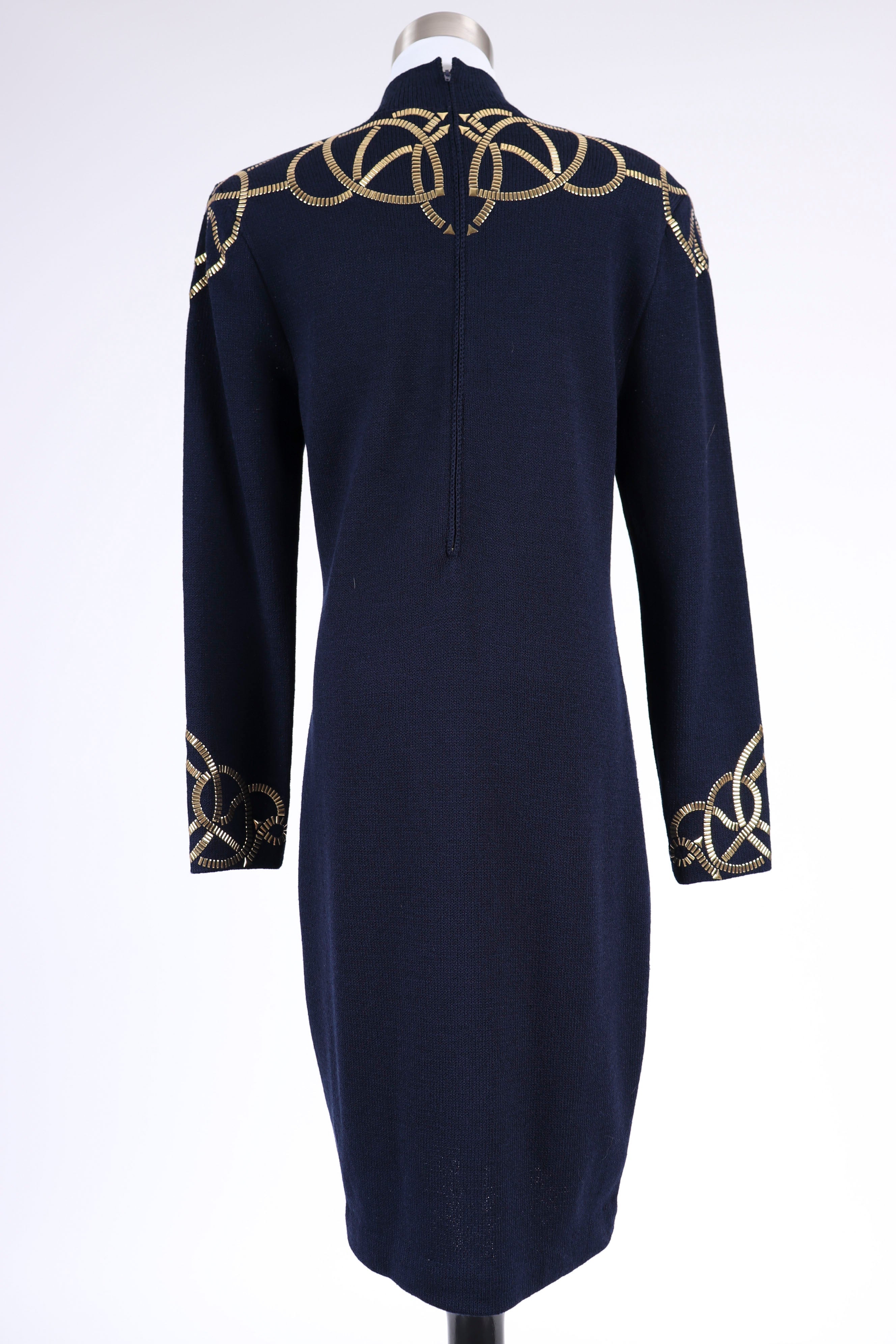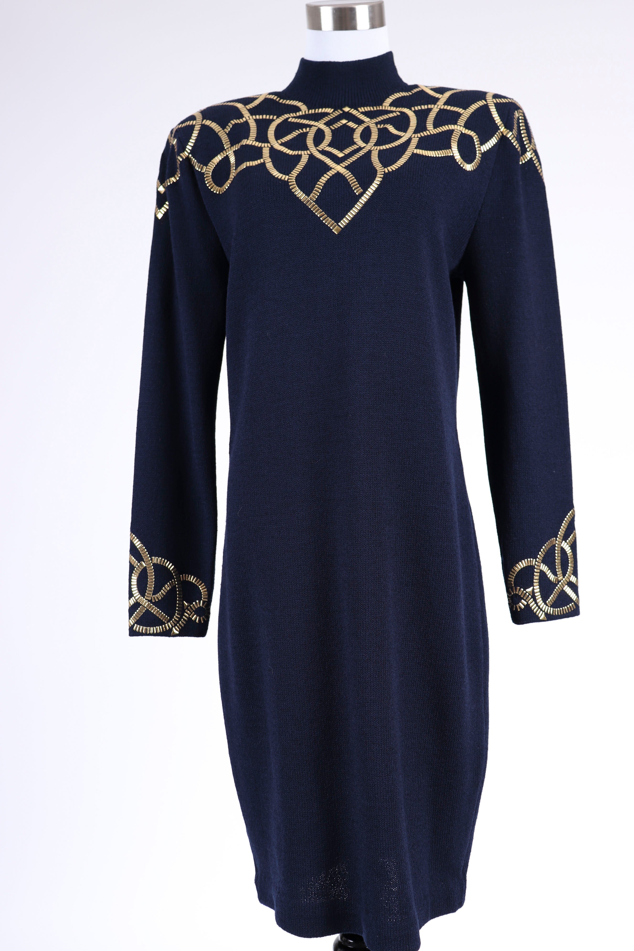 1980's St. John Knit Gold Embellished Navy knit dress.