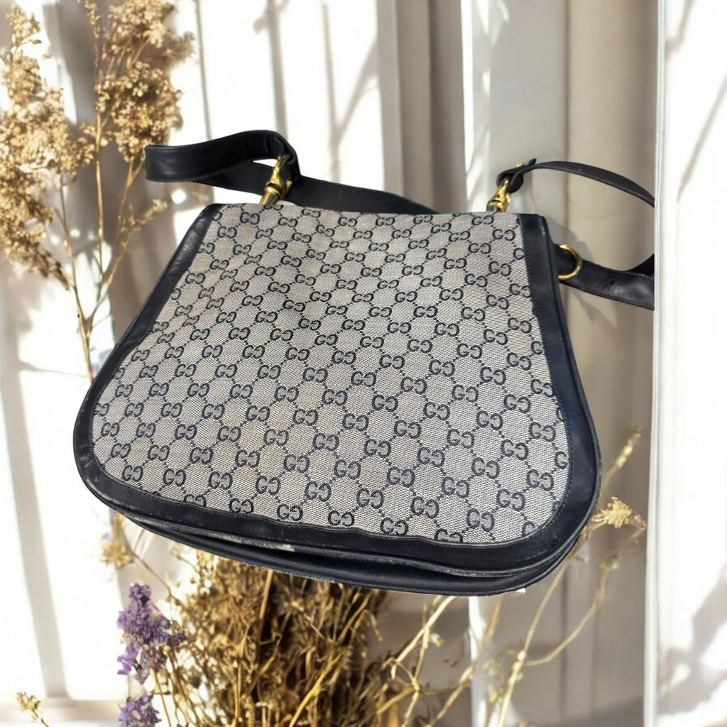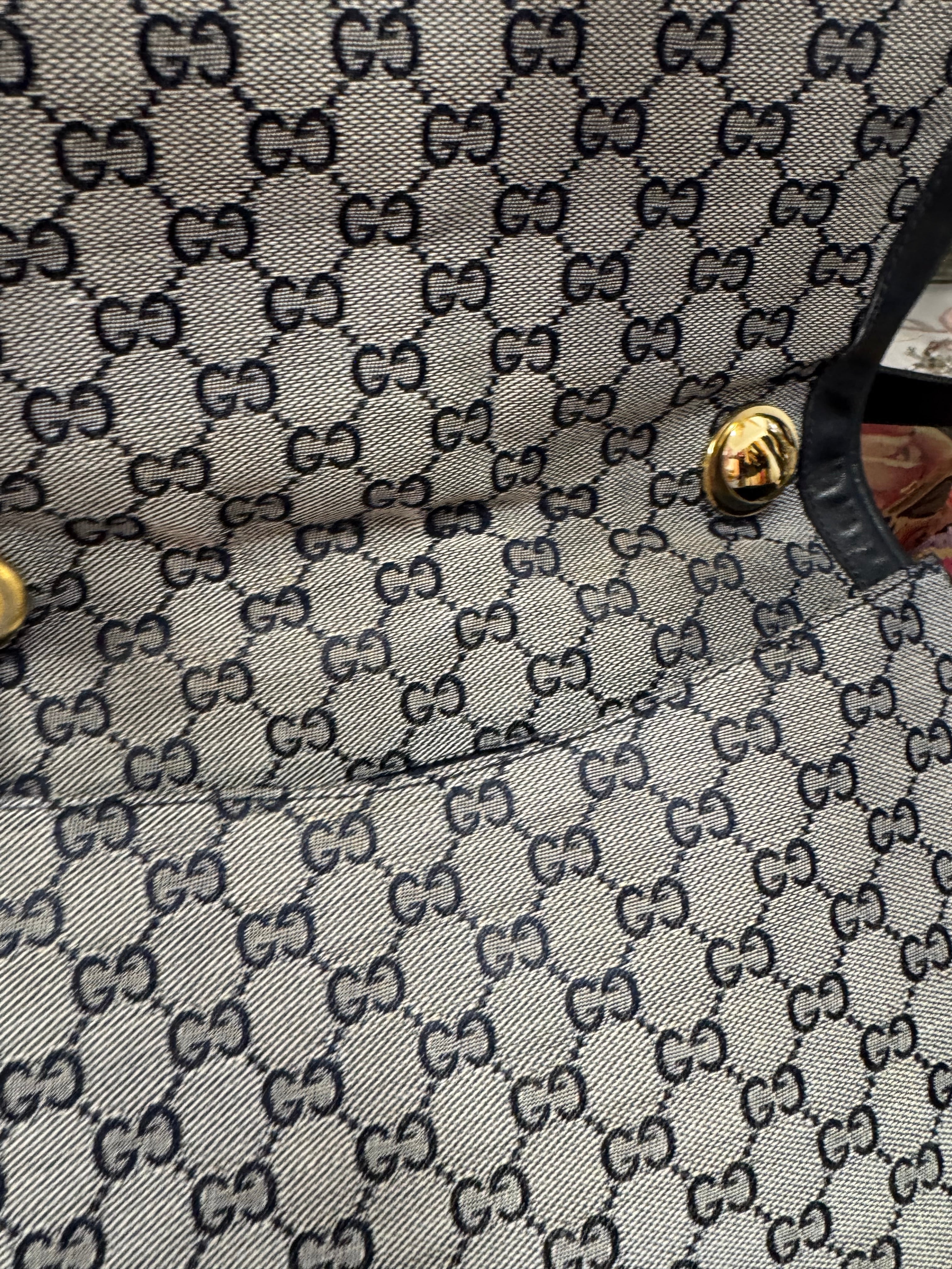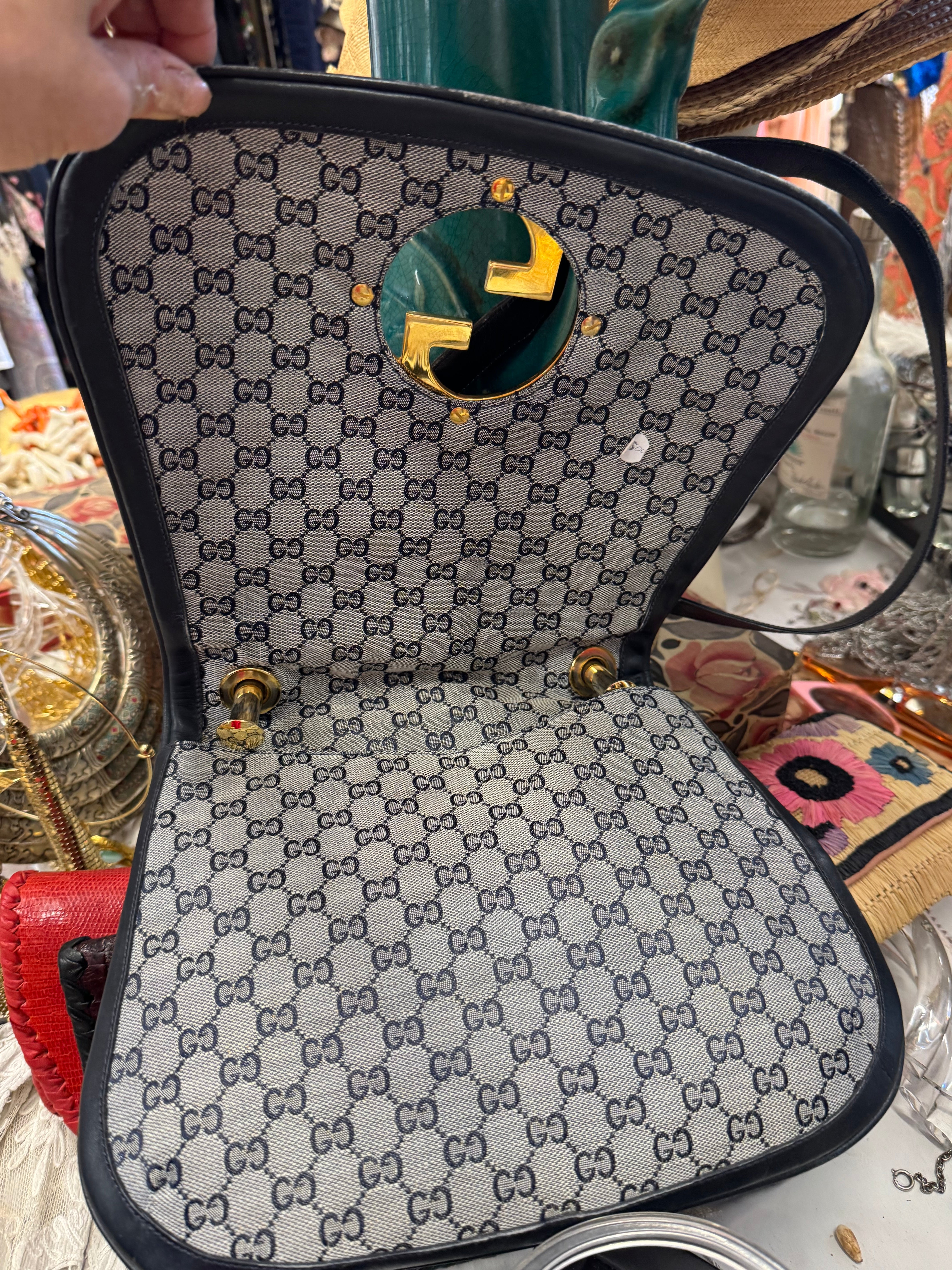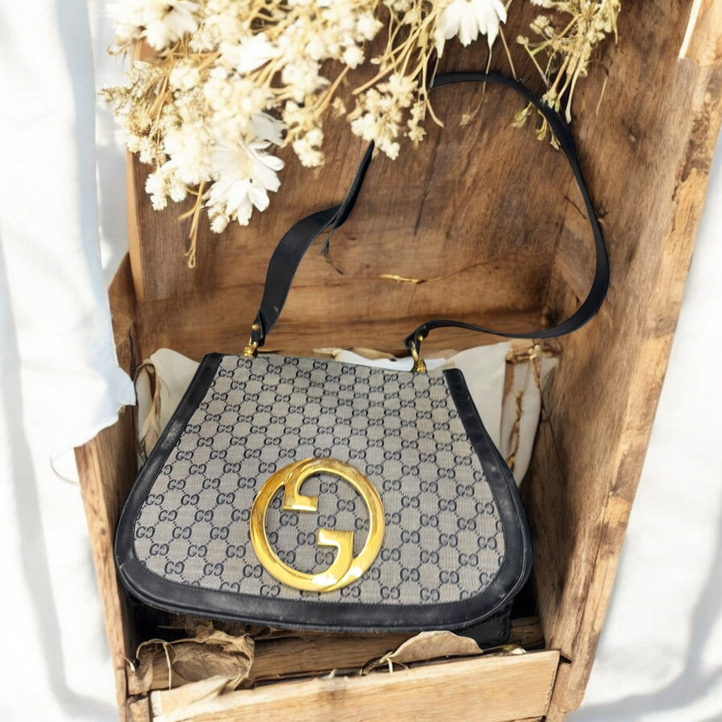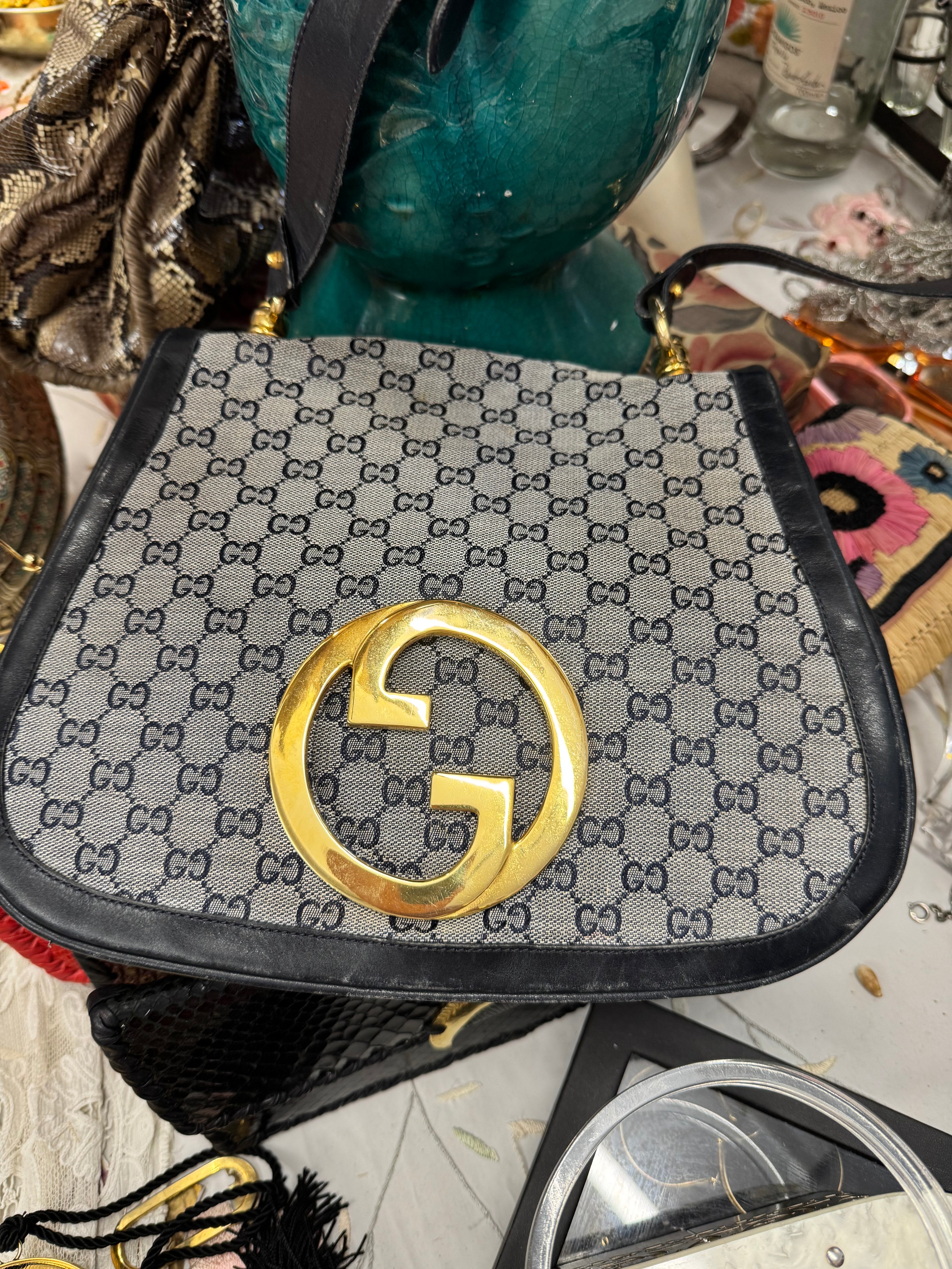 This collectible 1970s Gucci Blondie handbag features the iconic monogram canvas paired with navy leather accents, showcasing timeless elegance. Detailed with gold hardware and the signature Gucci logo, it offers a refined vintage appeal. Inside, a practical pocket provides convenient storage, making this piece both stylish and functional for discerning collectors.