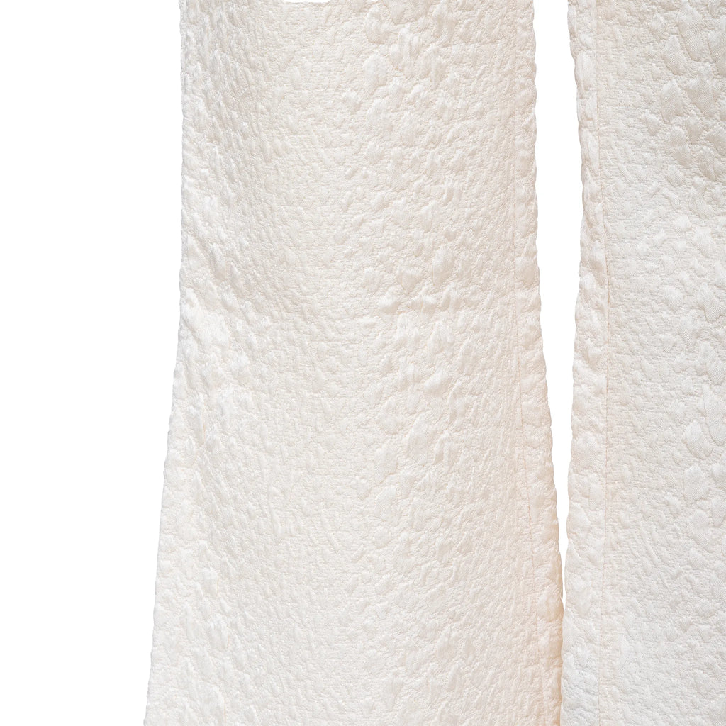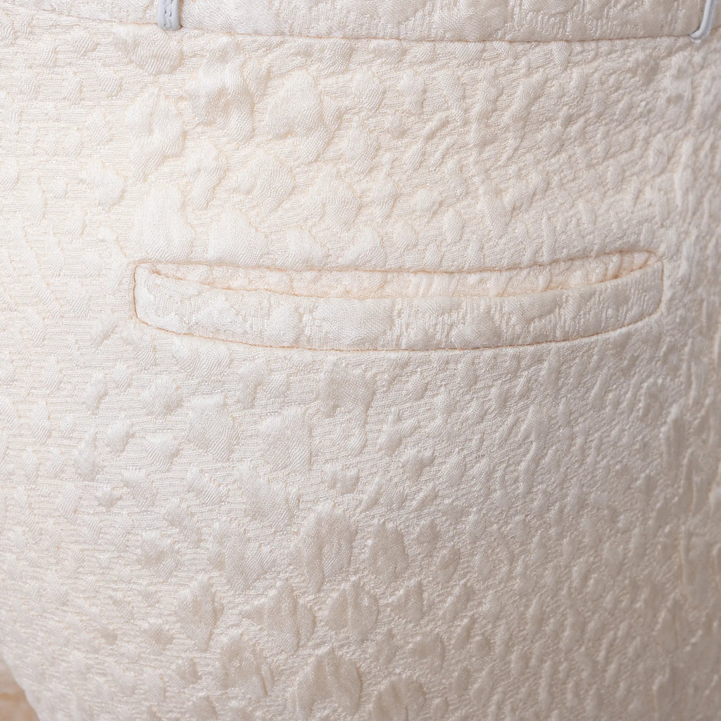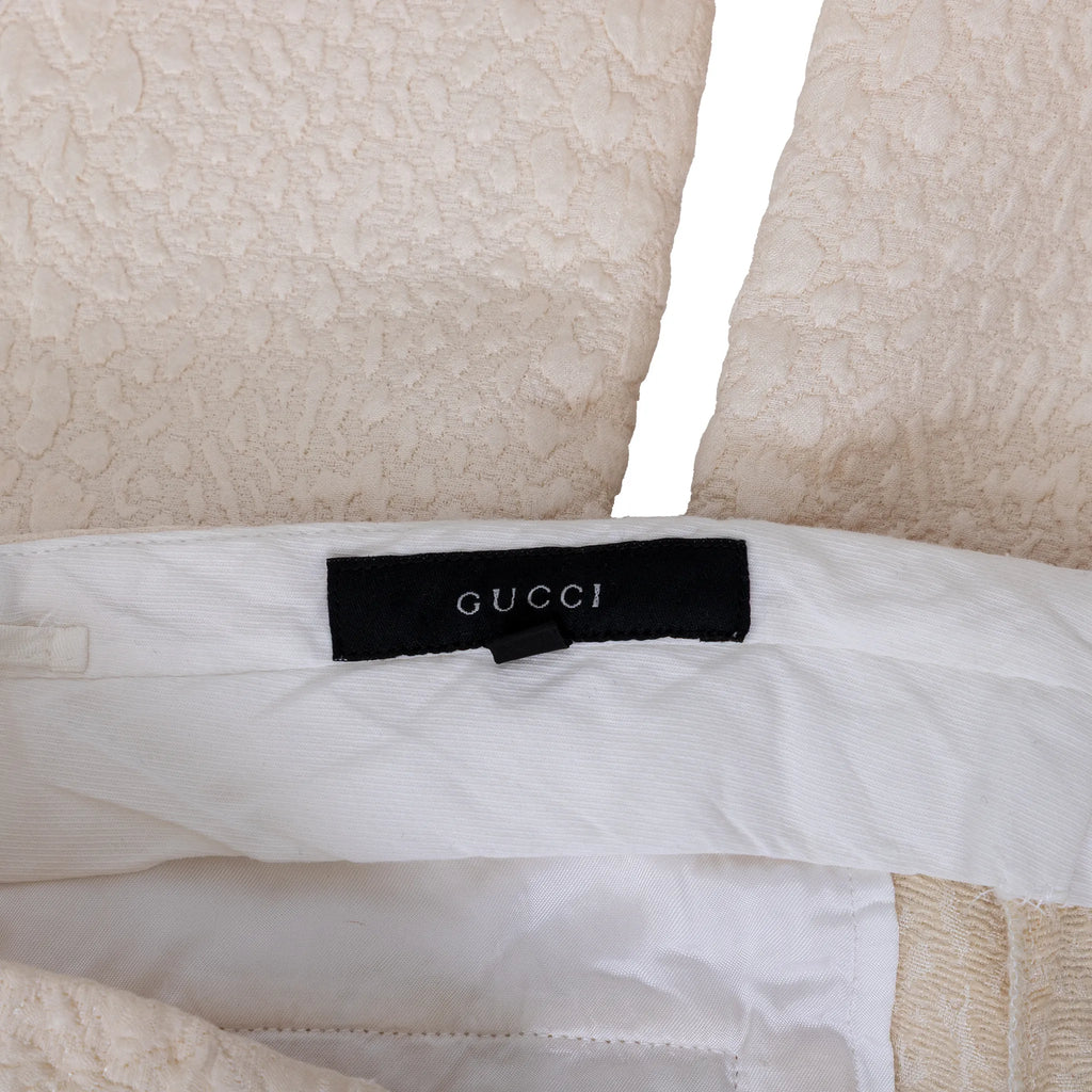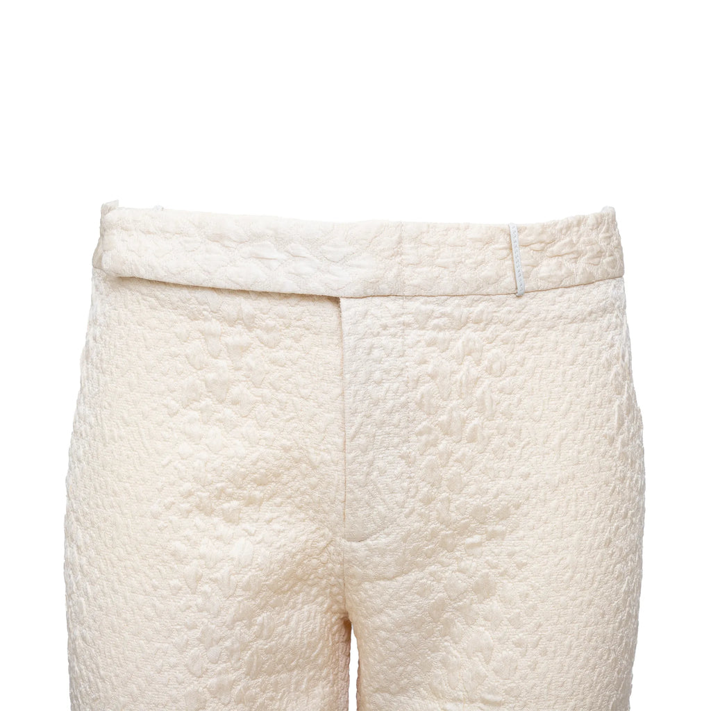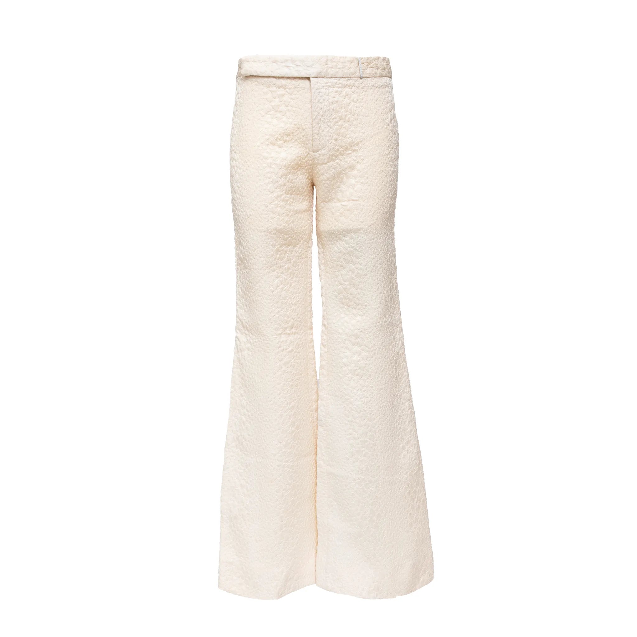 Gucci off-white pants in a silk-wool blend featuring embossed texture, leather belt loops, and a bell-bottom flare.