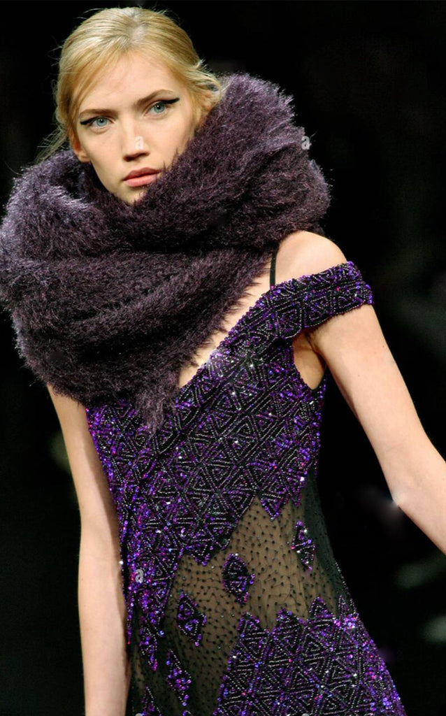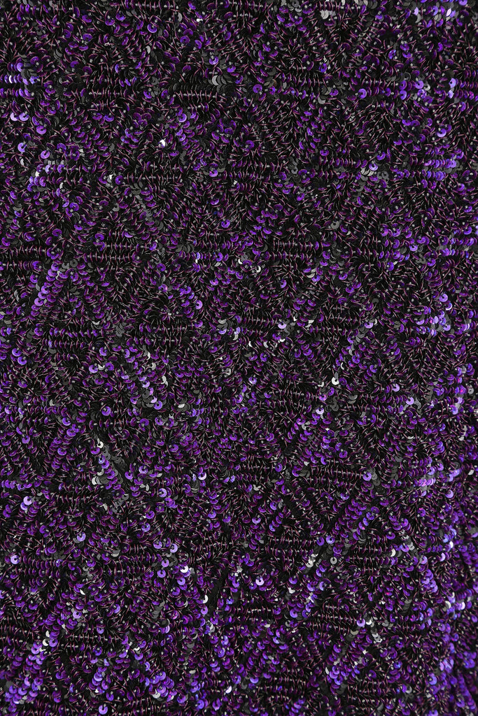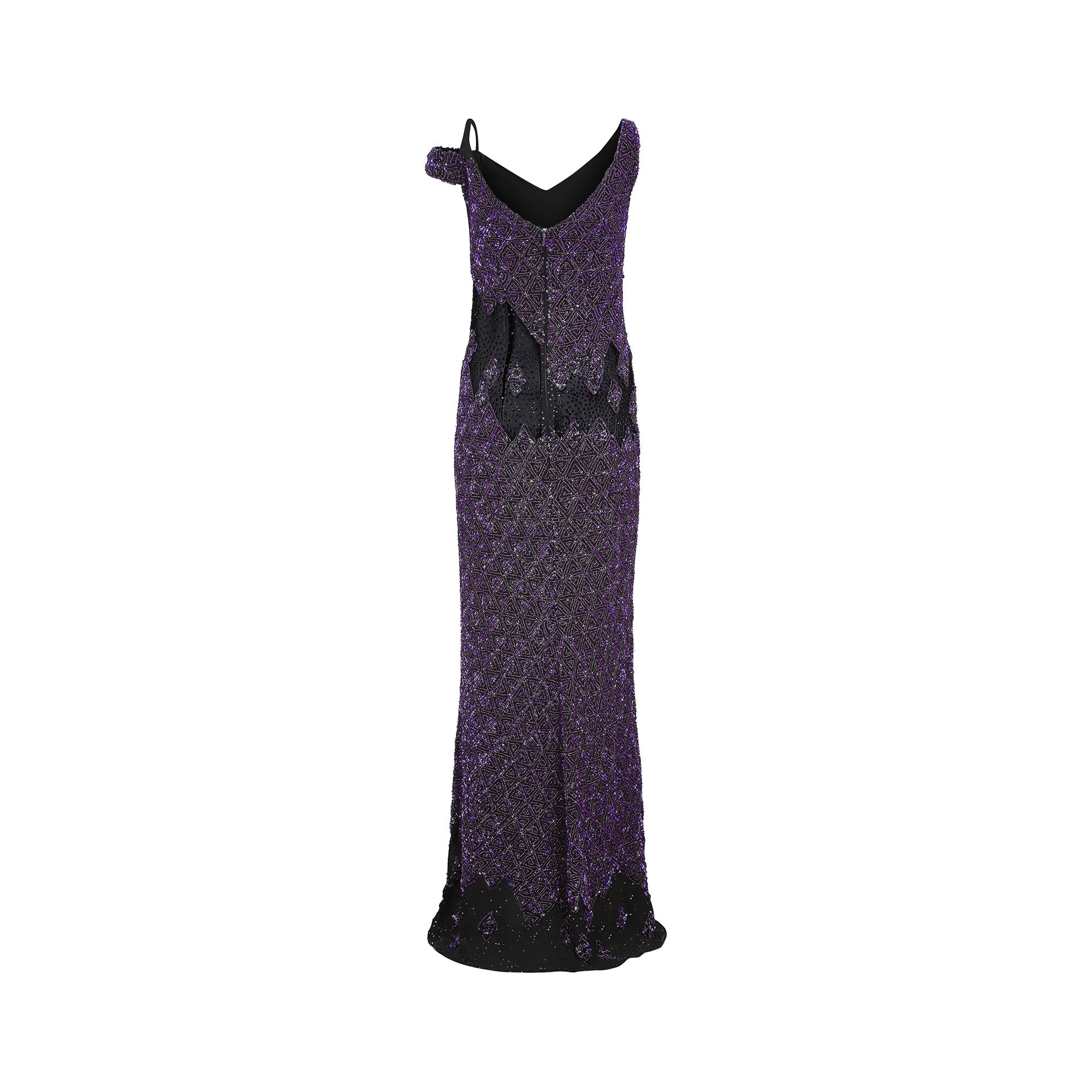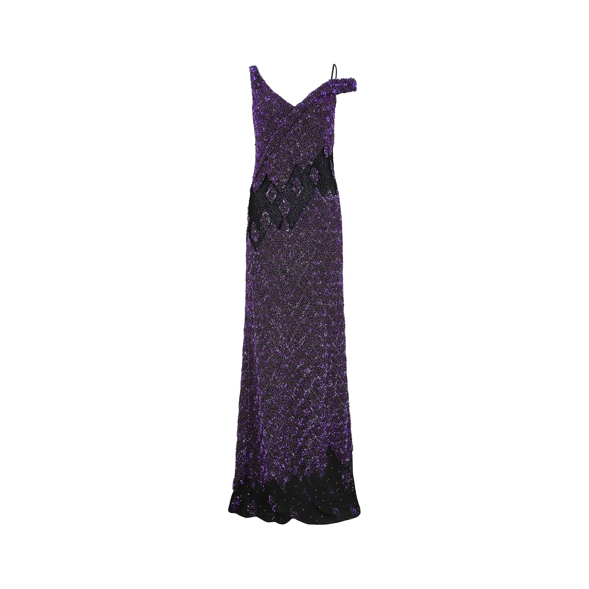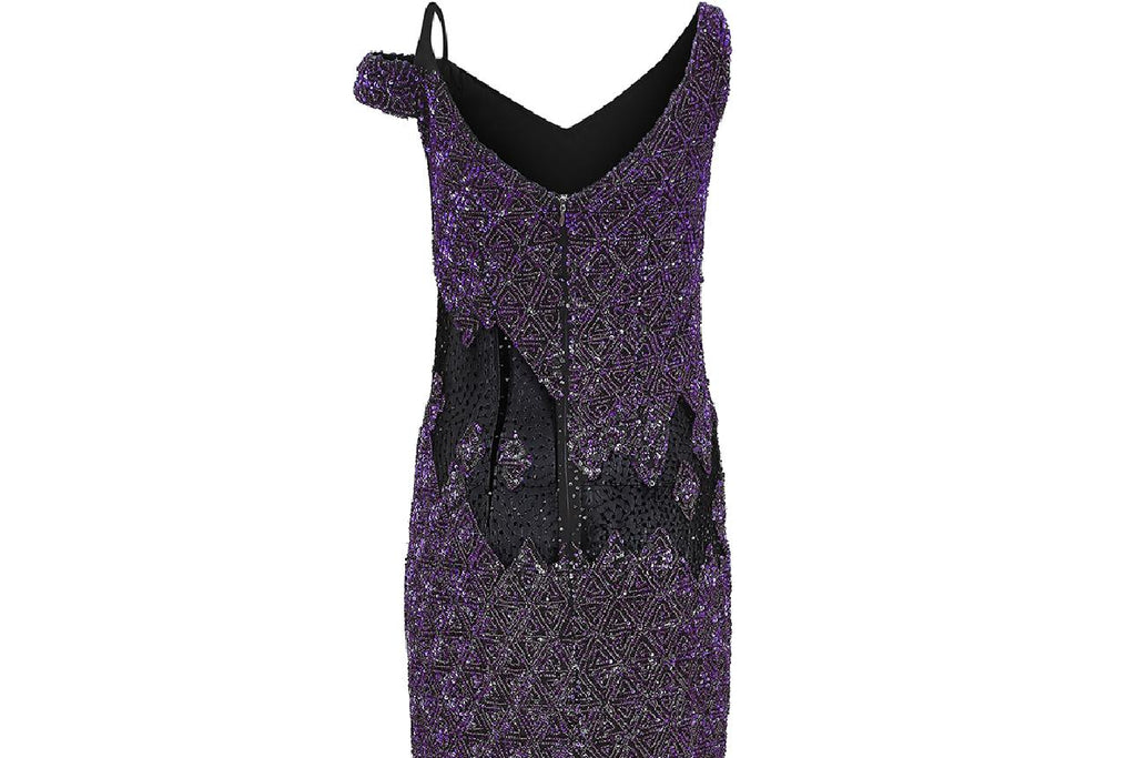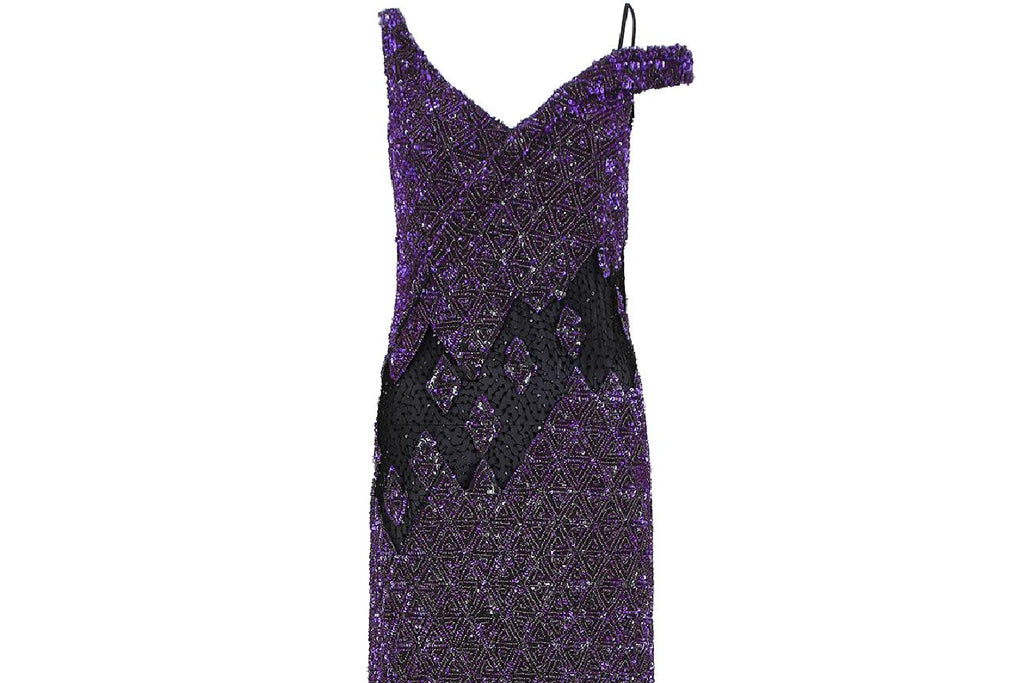 This is a magnificent purple sequin gown by Parisian Atelier Guy Laroche - the exact gown pictured from the Fall/Winter 2007 collection. It has a one shoulder finish, with a V neckline to both front and back, complete with original zip closure and hook and eye fastening. Lined in black silk chiffon, the main fabric of the dress is heavily embellished with a purple geometric sequin design, which catches the light beautifully as it moves. The waist and lower sections of the dress are broken up by black mesh detail, which is slightly transparent. The hem is also made up of the same black mesh fabric, reflecting the panels at the waist. The dress itself has an incredible weight to it and hangs beautifully on the body - it would be perfect for a black tie event, or sophisticated party.