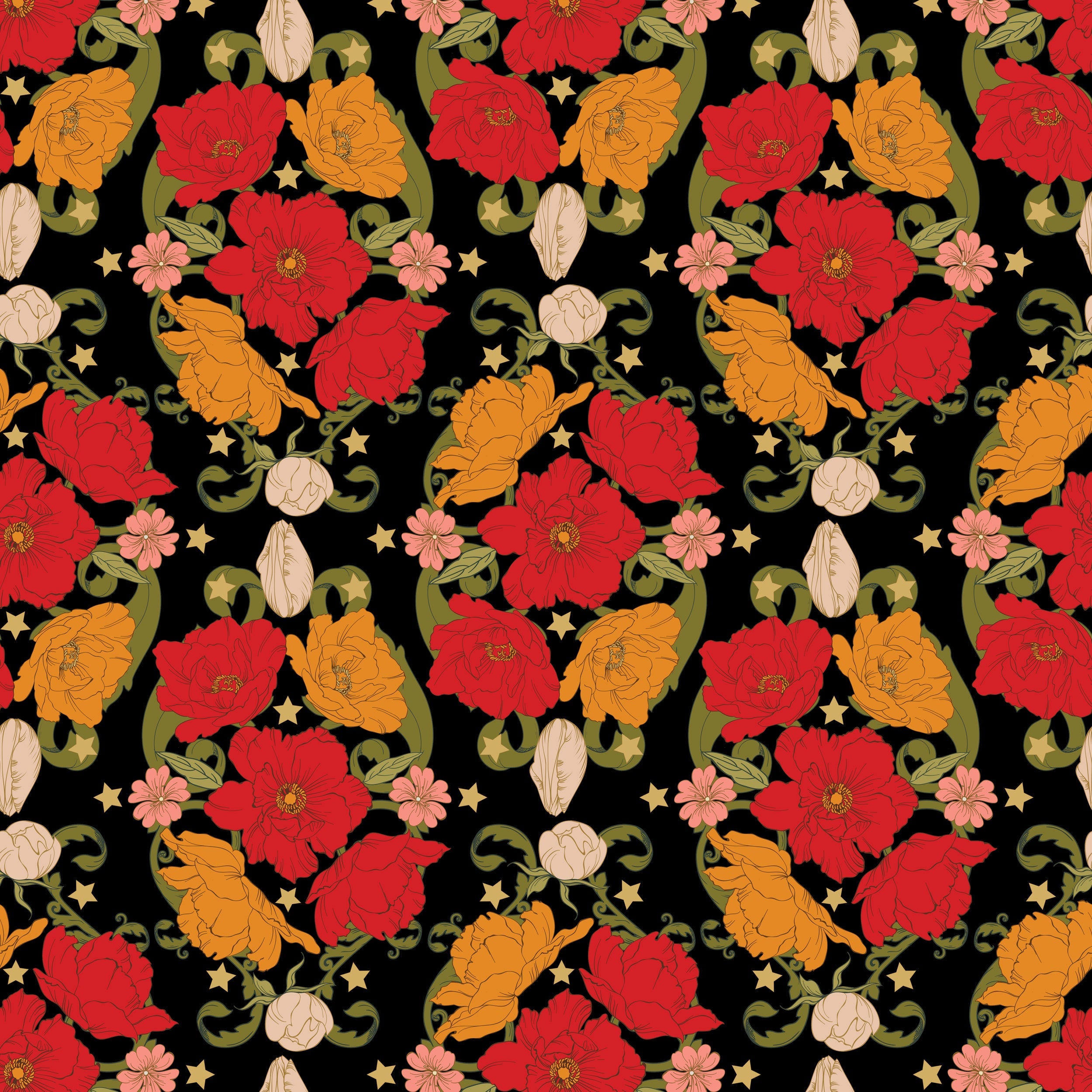 Floral print with vintage feel featuring poppies, daisies and stars. Inspired by the Californian state flower, the orange poppy. The back piece features a large queen bee design made up of hand drawn flowers and hearts. A versatile kimono-style robe with wear anywhere appeal,  a seamless transition from a poolside cover-up to a statement  evening layer .