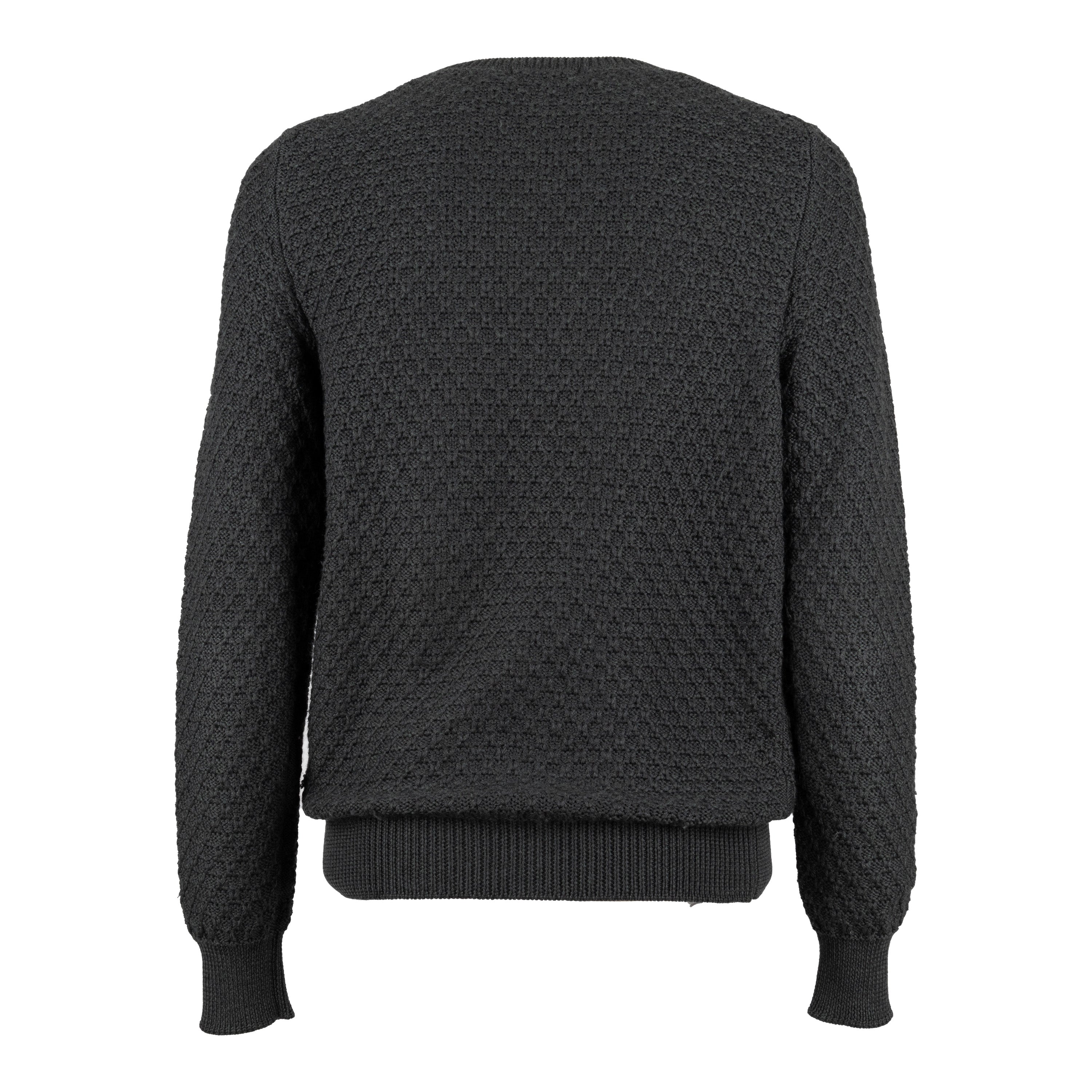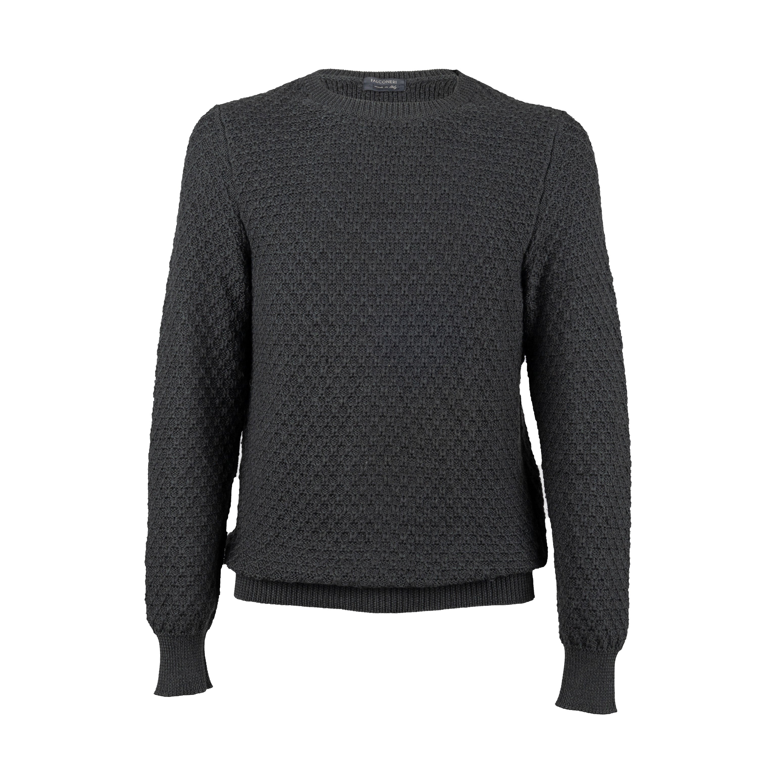 This Falconeri Textured Sweater is crafted from 100% Extra Fine Merino Wool, in dark grey with a green hue and a unique knit for a textured look. The crew neck and ribbed hem gives a classic finish to this sweater.