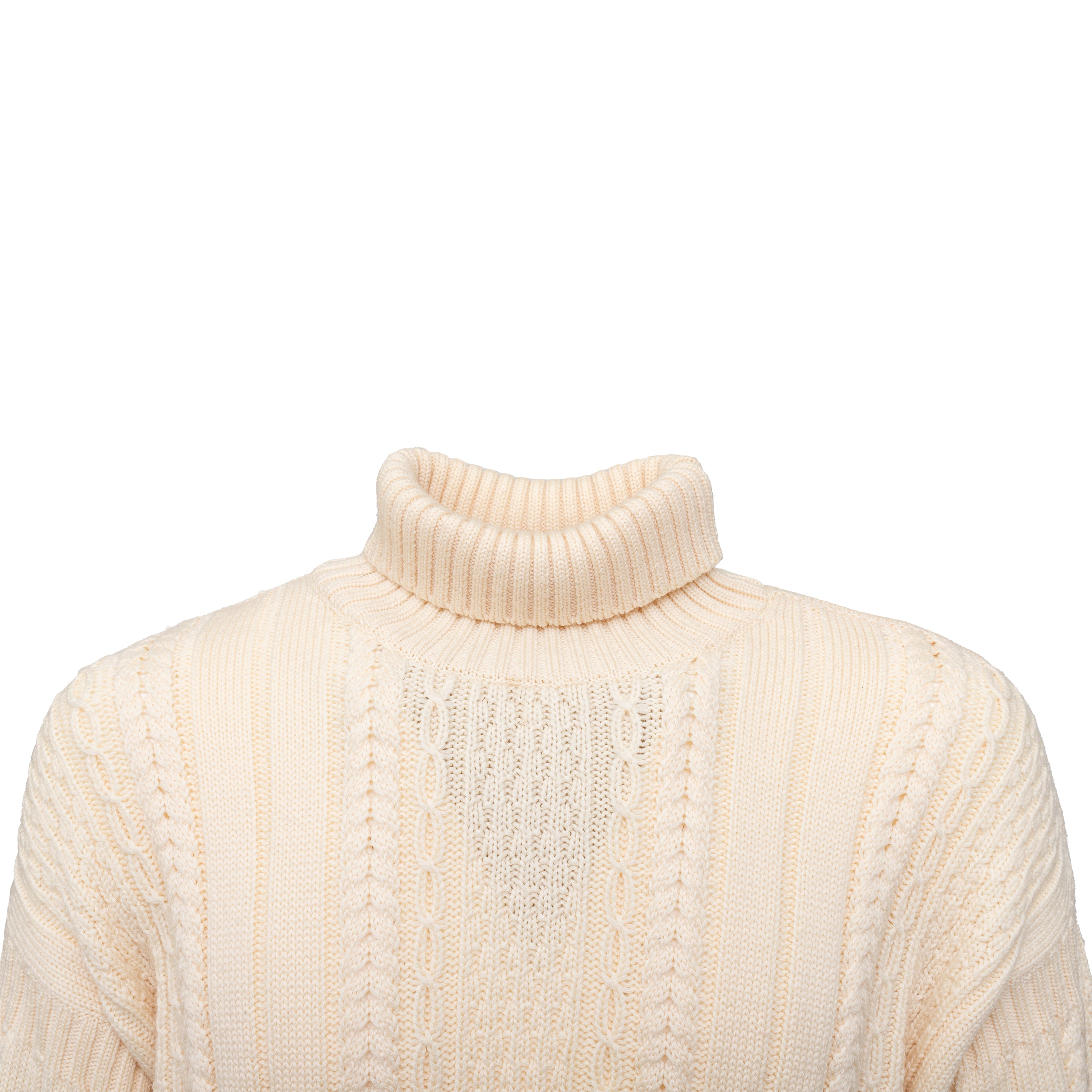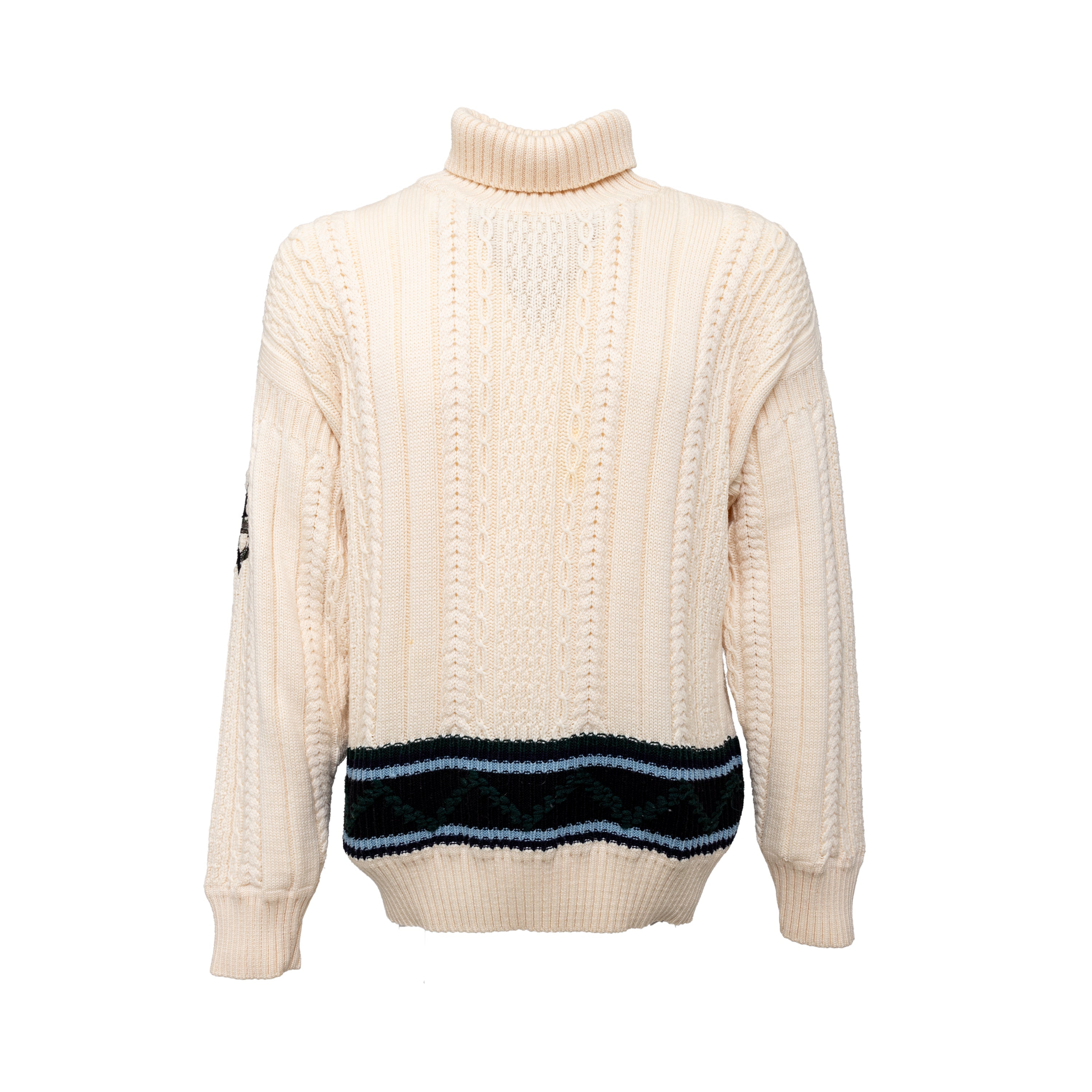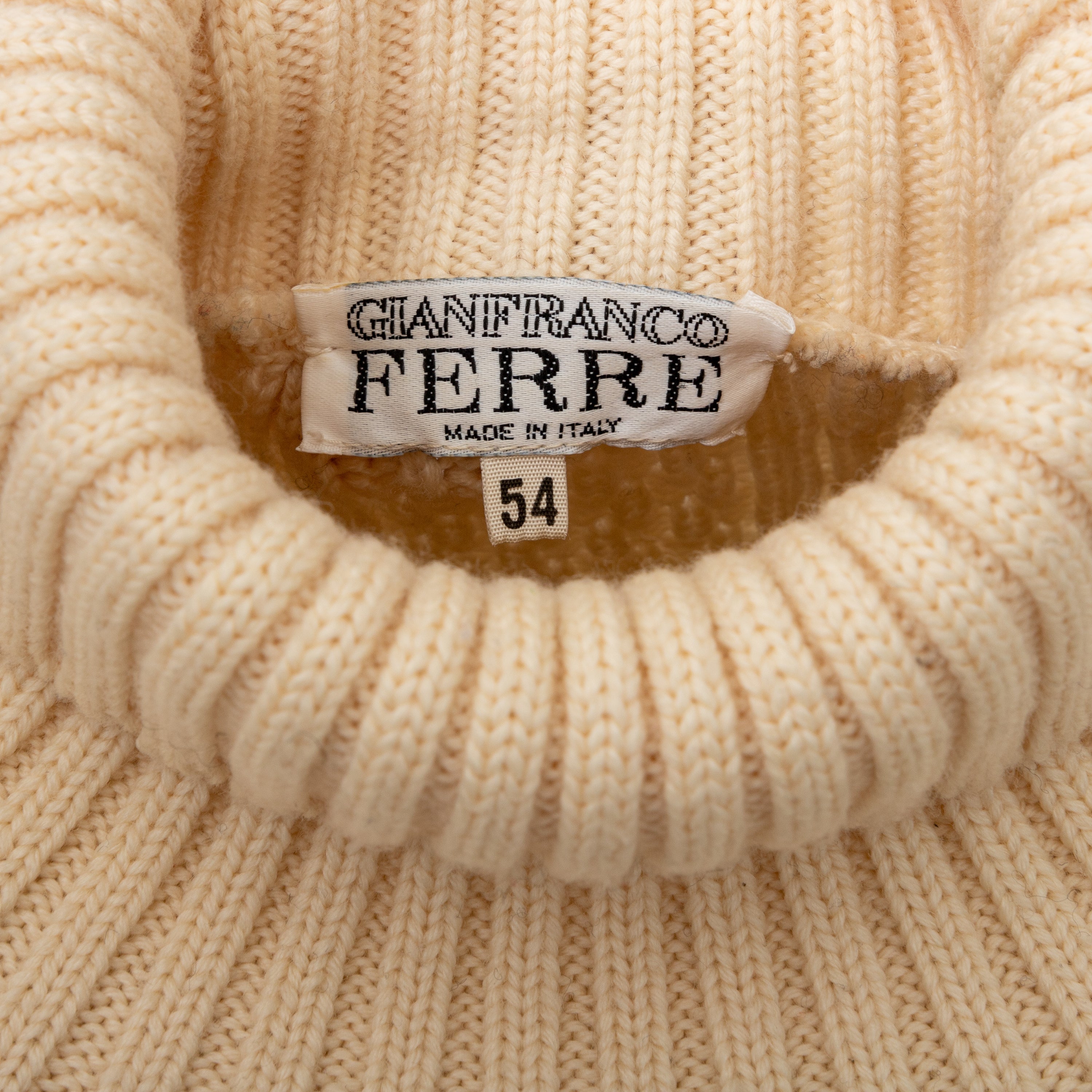 Expertly crafted by Gianfranco Ferré, this 90s knit sweater is a cozy and stylish staple for any wardrobe. Made from luxurious virgin wool with intricate cable stitch patterns and a unique reversed embroidery on the right arm, this sweater also features a chic turtle neck and contrasting stripe at the hem.