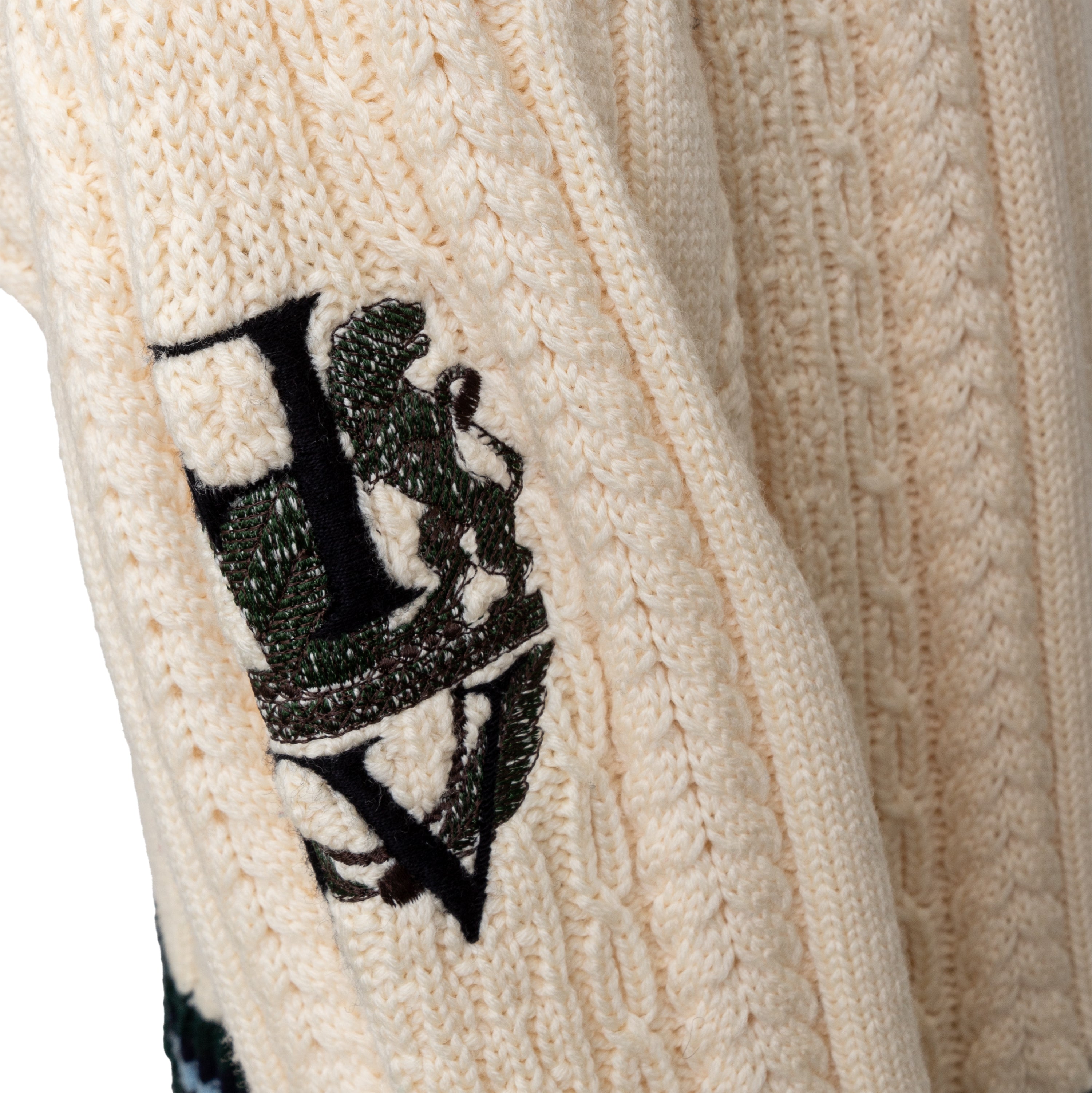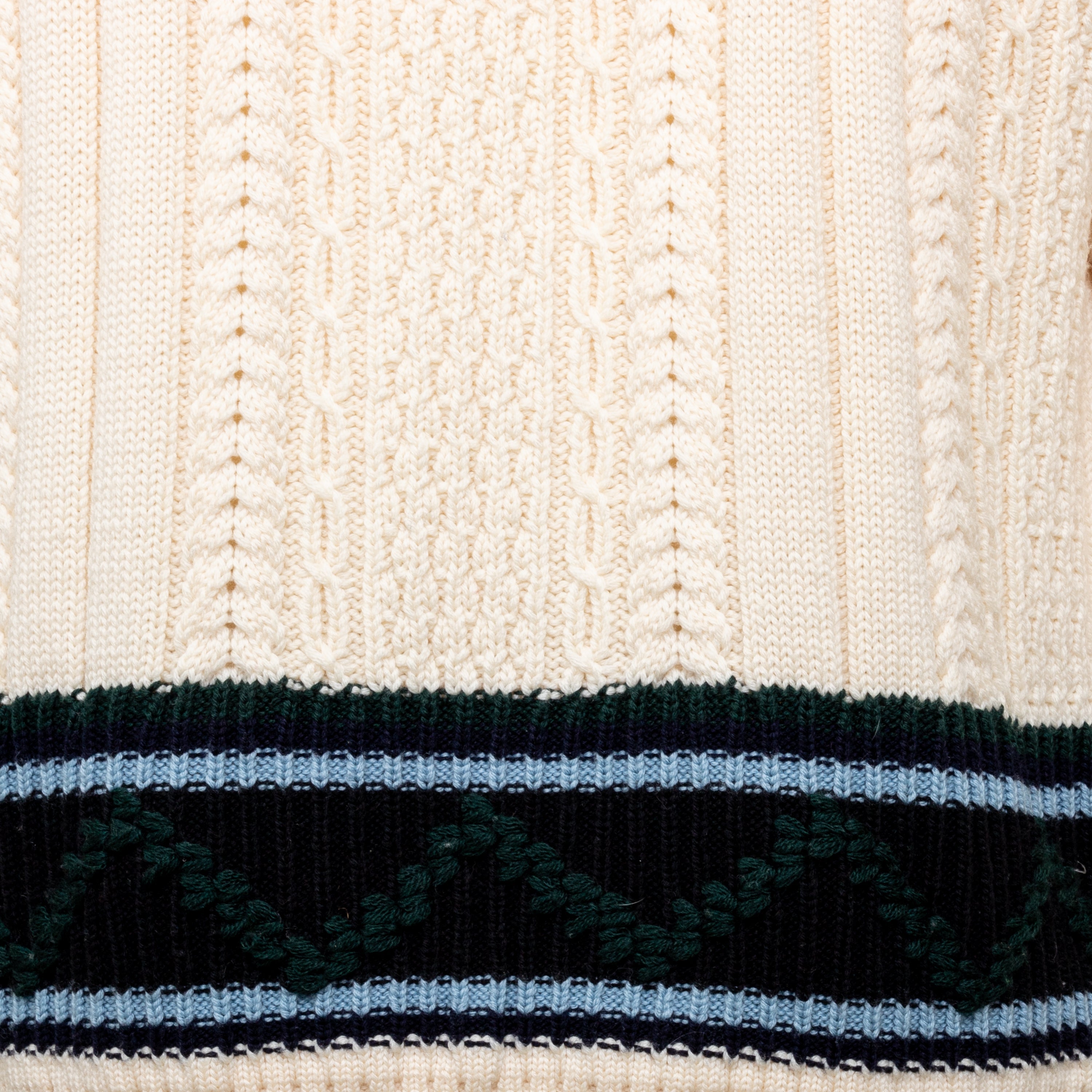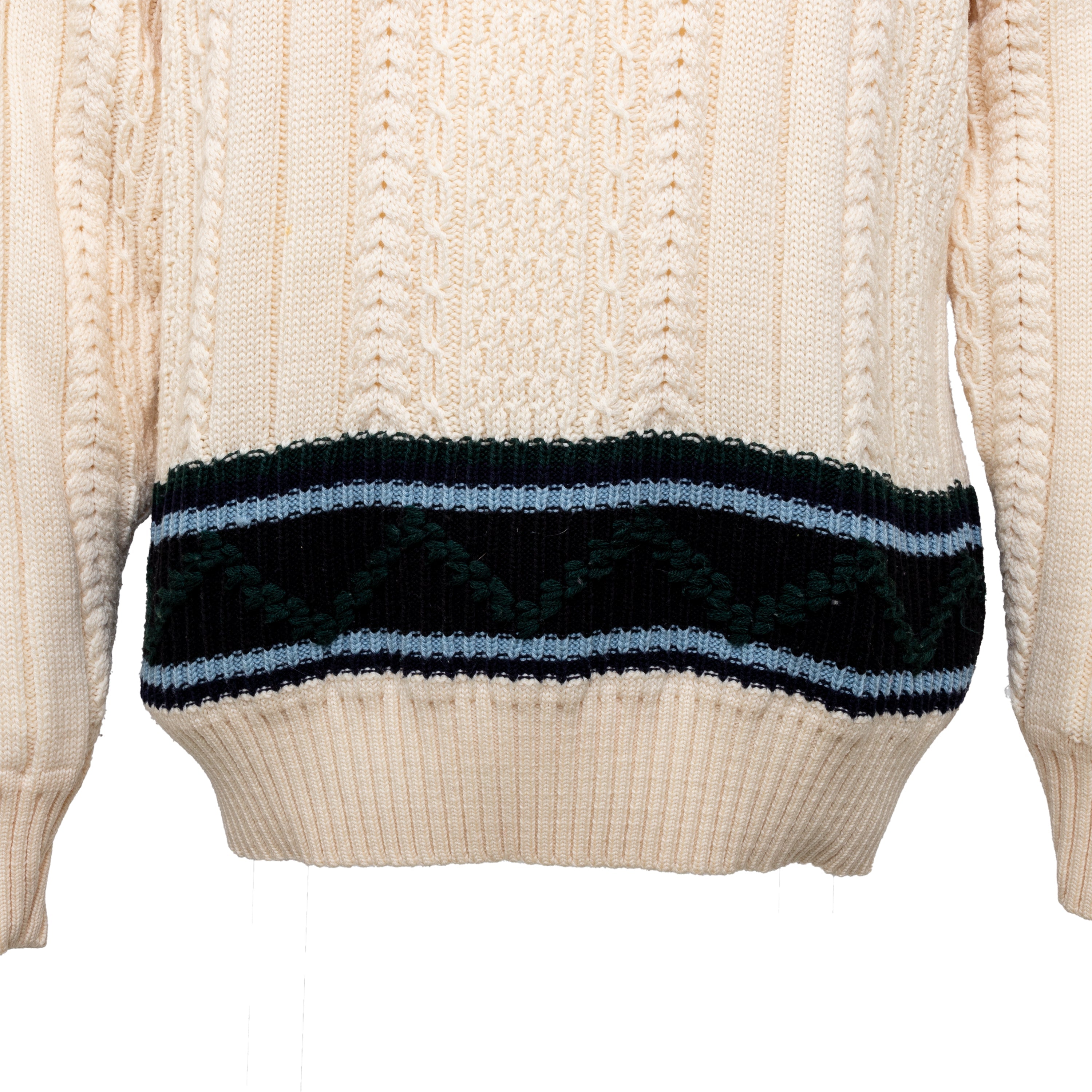 Expertly crafted by Gianfranco Ferré, this 90s knit sweater is a cozy and stylish staple for any wardrobe. Made from luxurious virgin wool with intricate cable stitch patterns and a unique reversed embroidery on the right arm, this sweater also features a chic turtle neck and contrasting stripe at the hem.