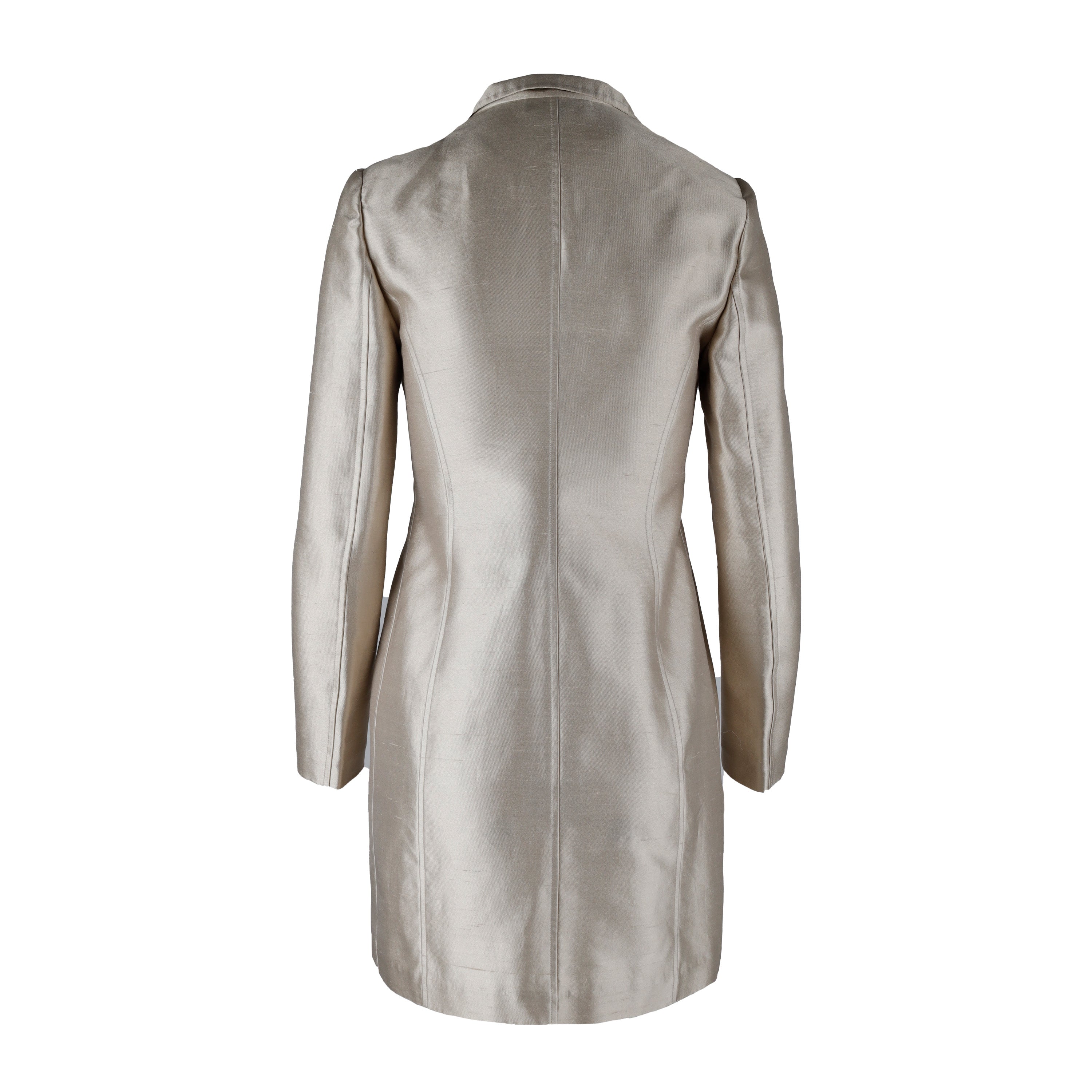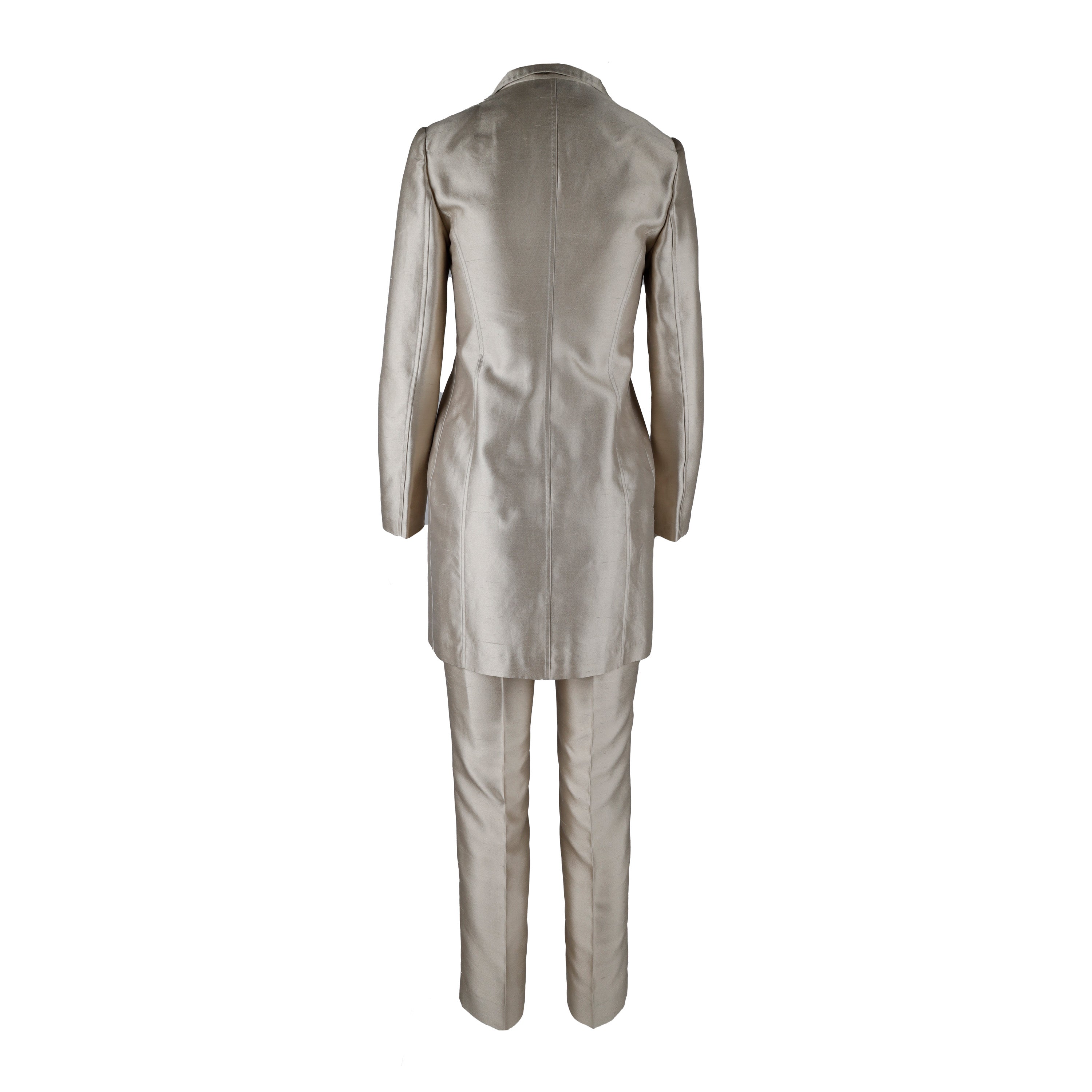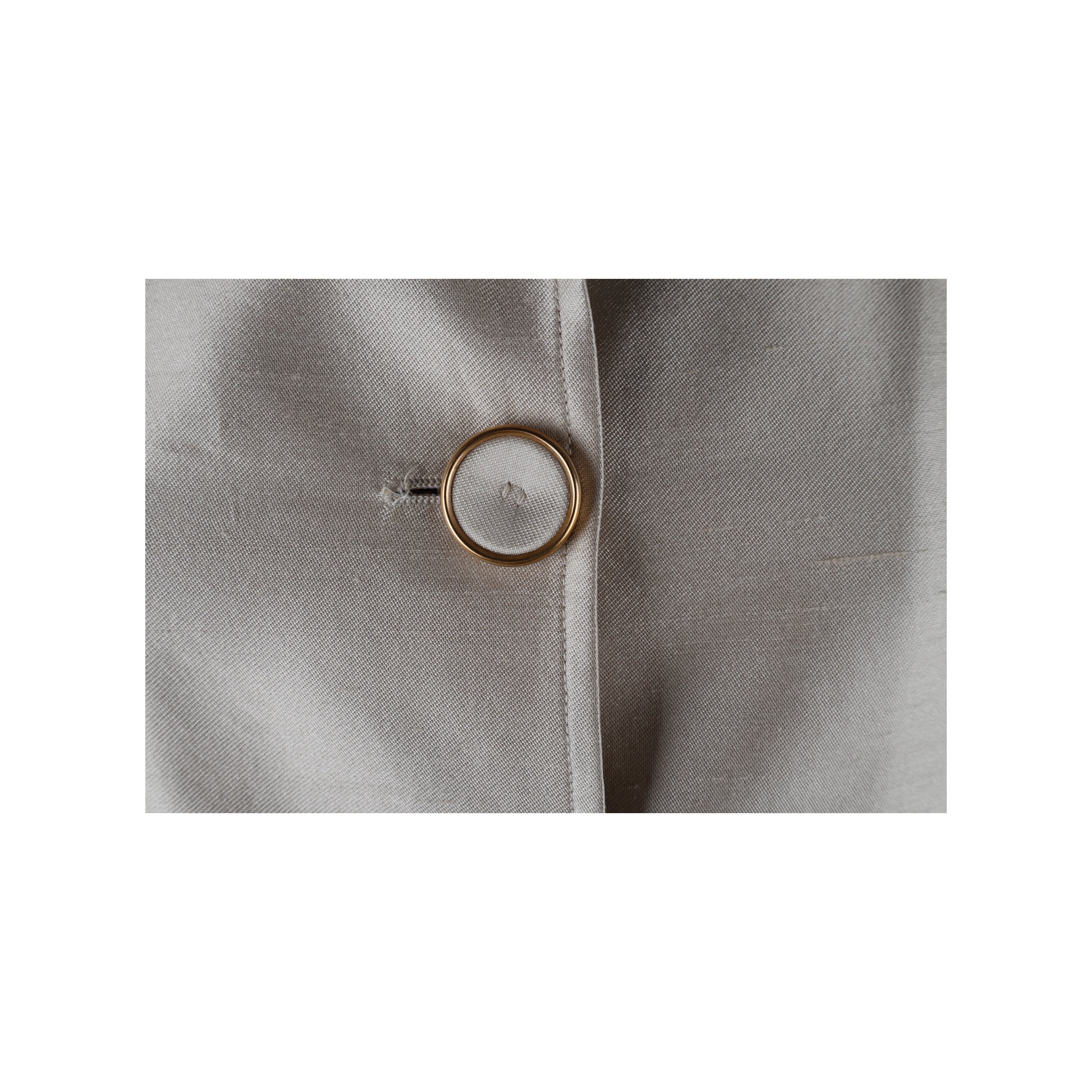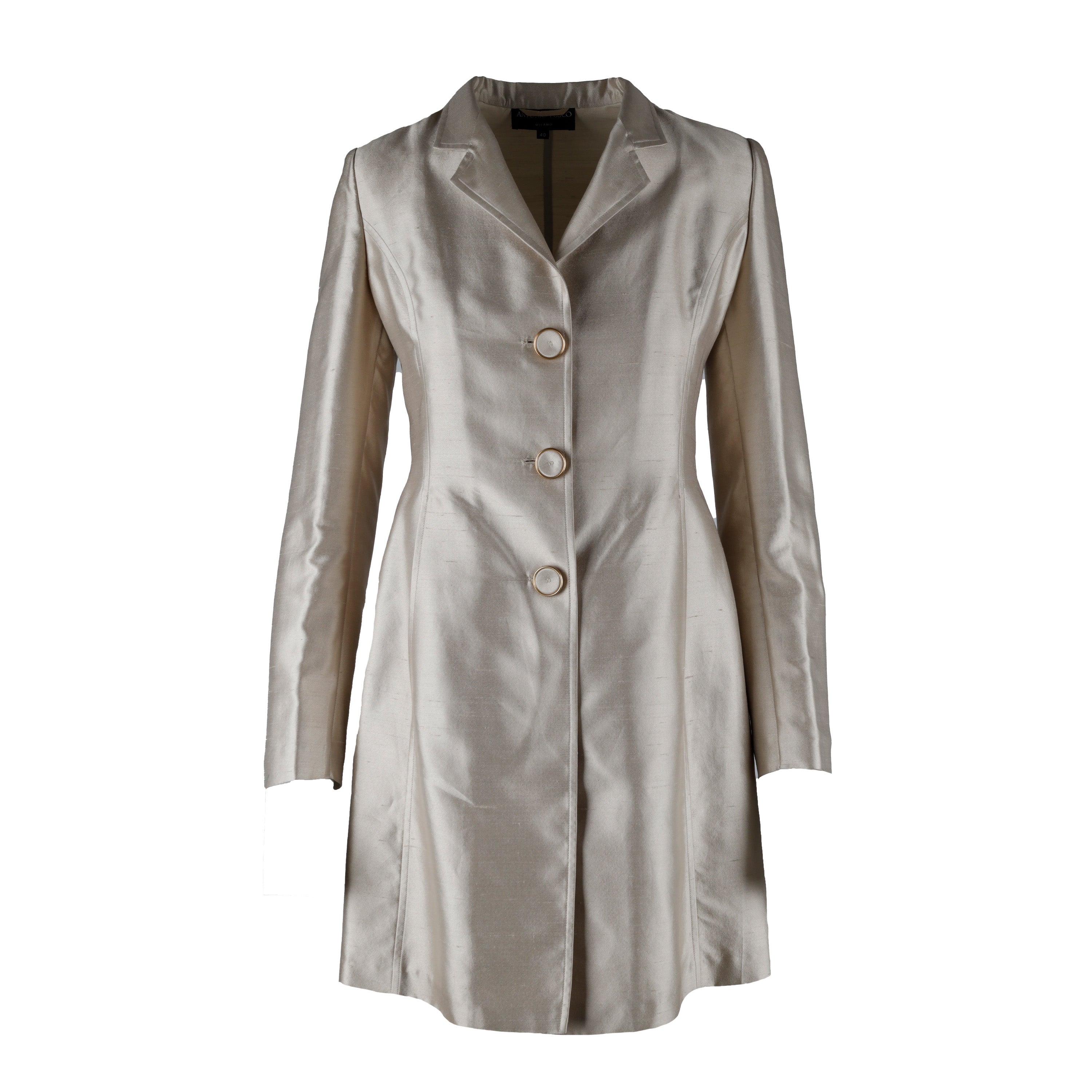Expertly crafted with a blend of silk and cotton, this Antonio Fusco Long Suit is a luxurious pick for formal occasions. The lustrous beige hue and fabric-covered buttons with golden accents add refined appeal to the long jacket, which is tailored with pleats for a perfect fit and finished with shoulder pads and two side pockets. The pants have a concealed zippered closure.