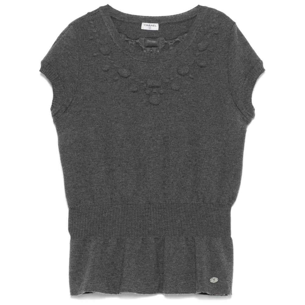 Chanel 2010s grey wool top with embossed motif. Ribbed crewneck, cap short sleeves, tone-on-tone trompe-l'oeil necklace motif with padding, elasticated waist and ruffled hem.