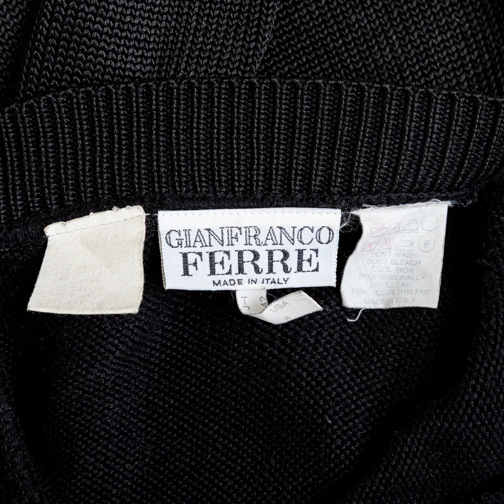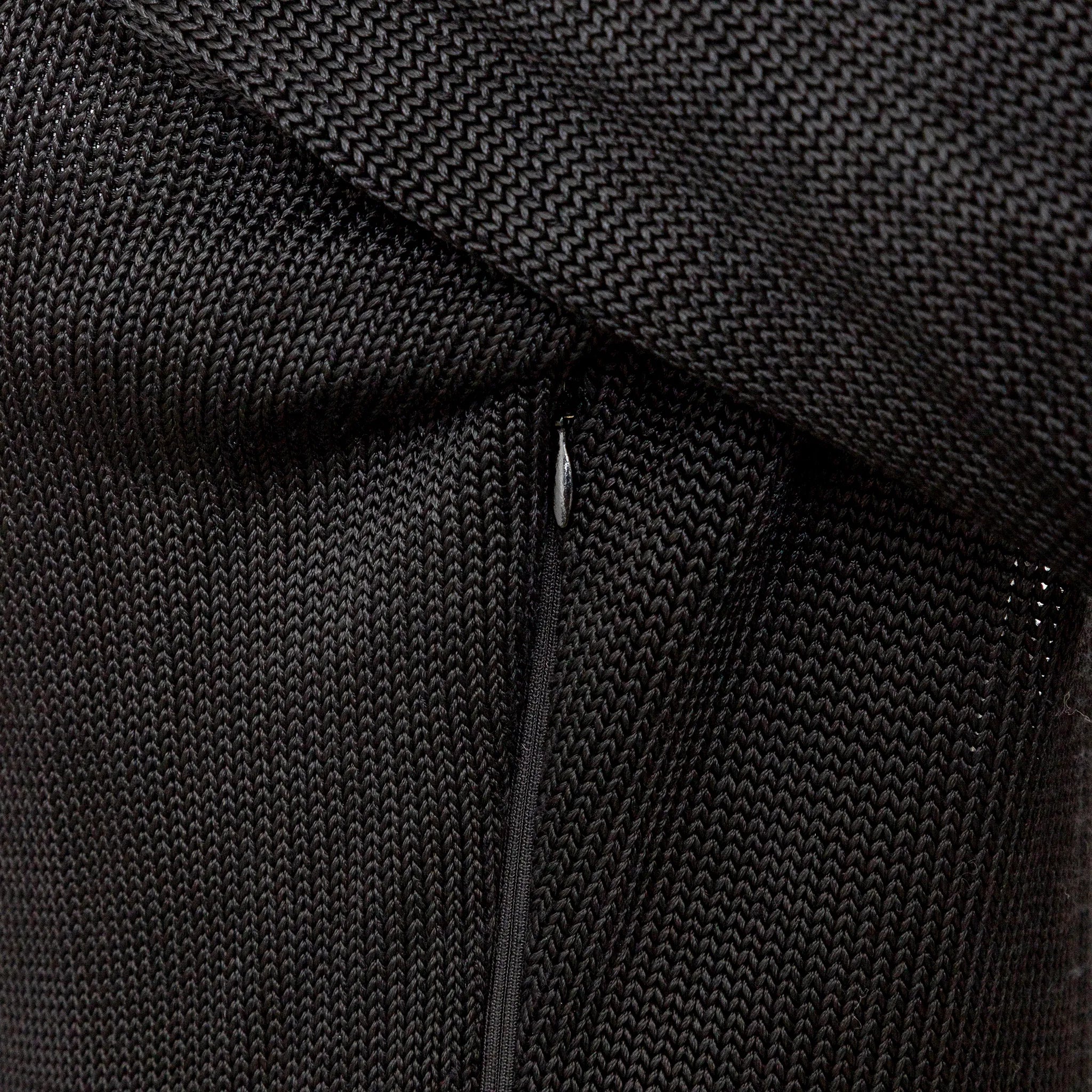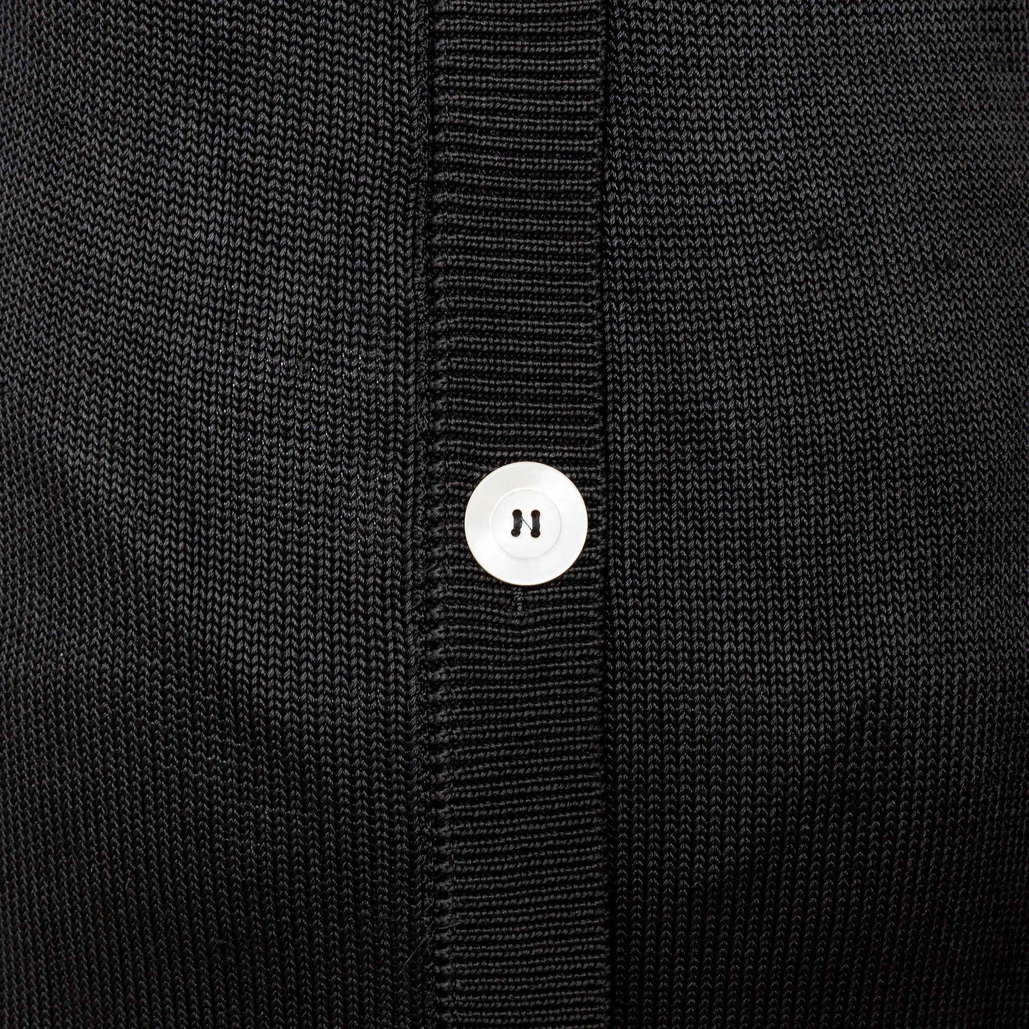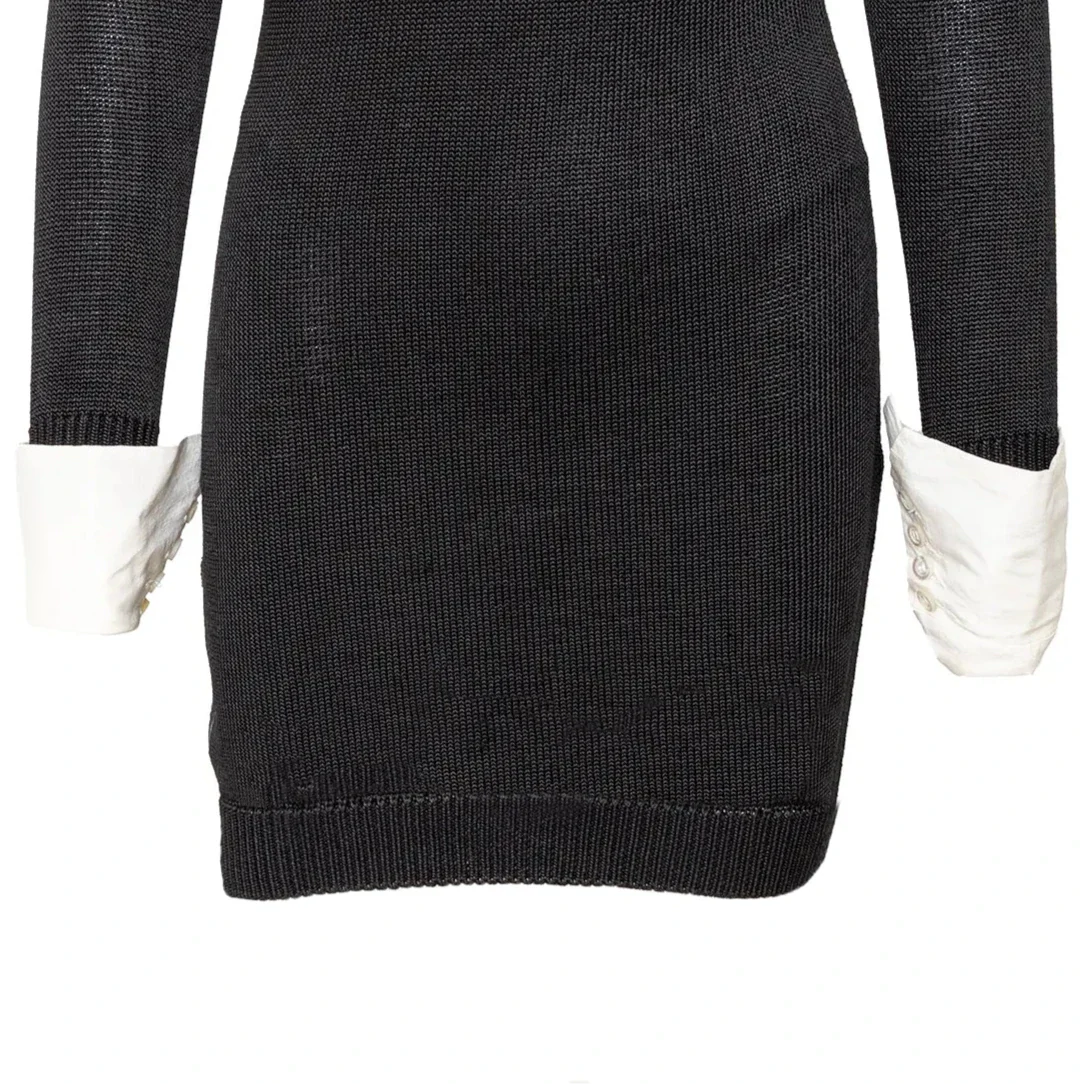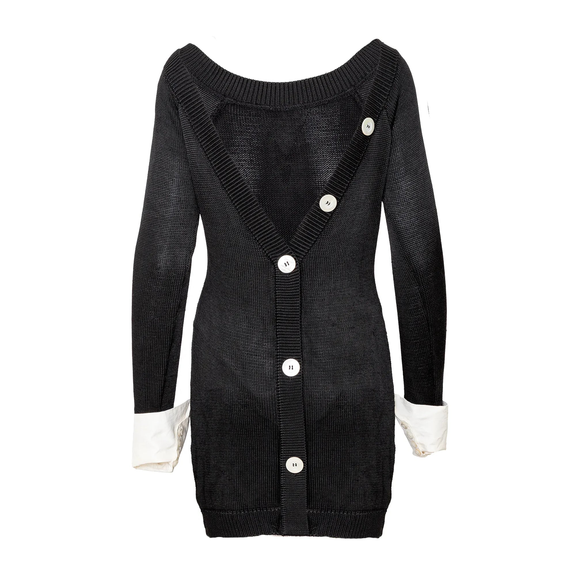 90s runway dress in black knit with a round neckline, bold V-back with button detail, ribbed hems, and detachable luxe silk cuffs.