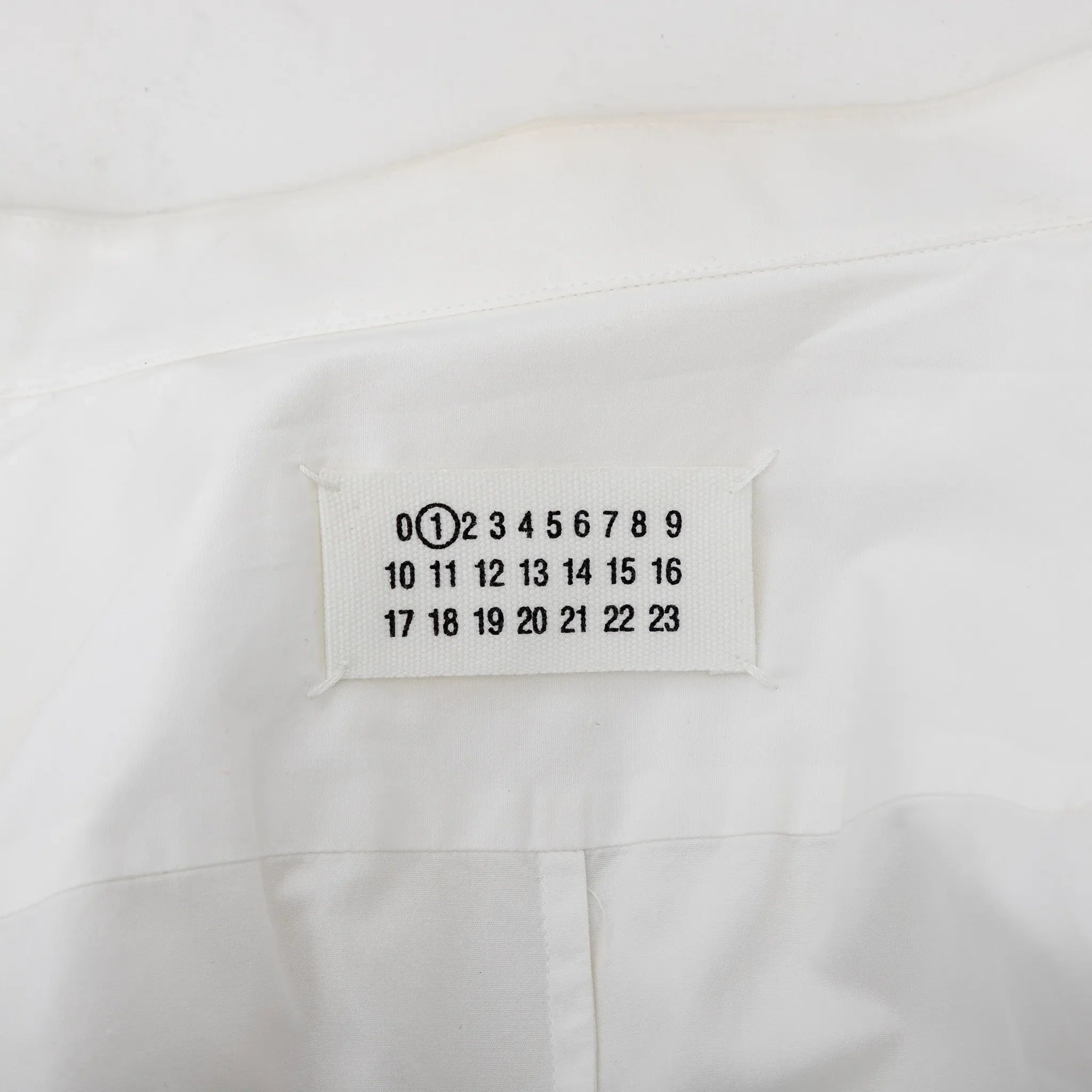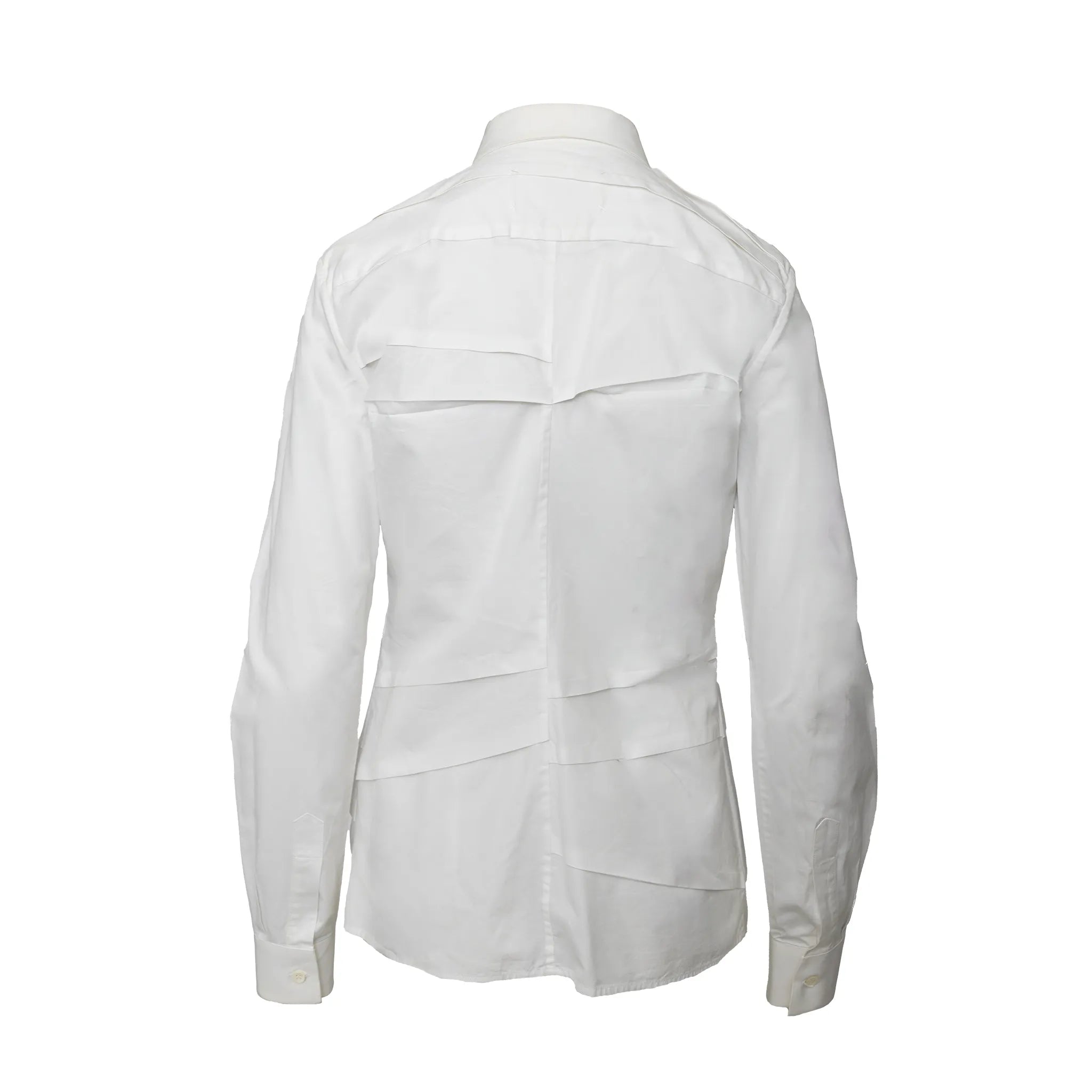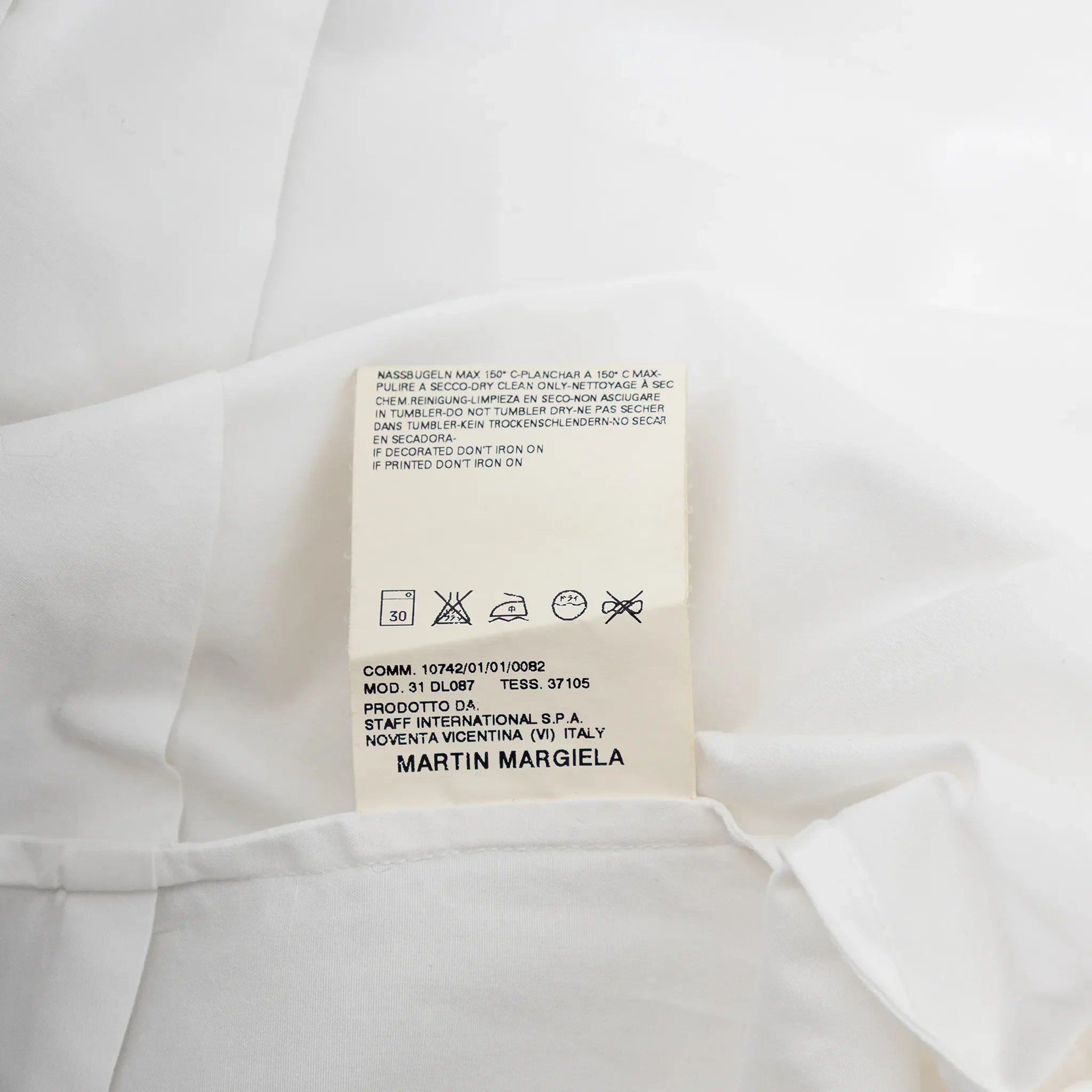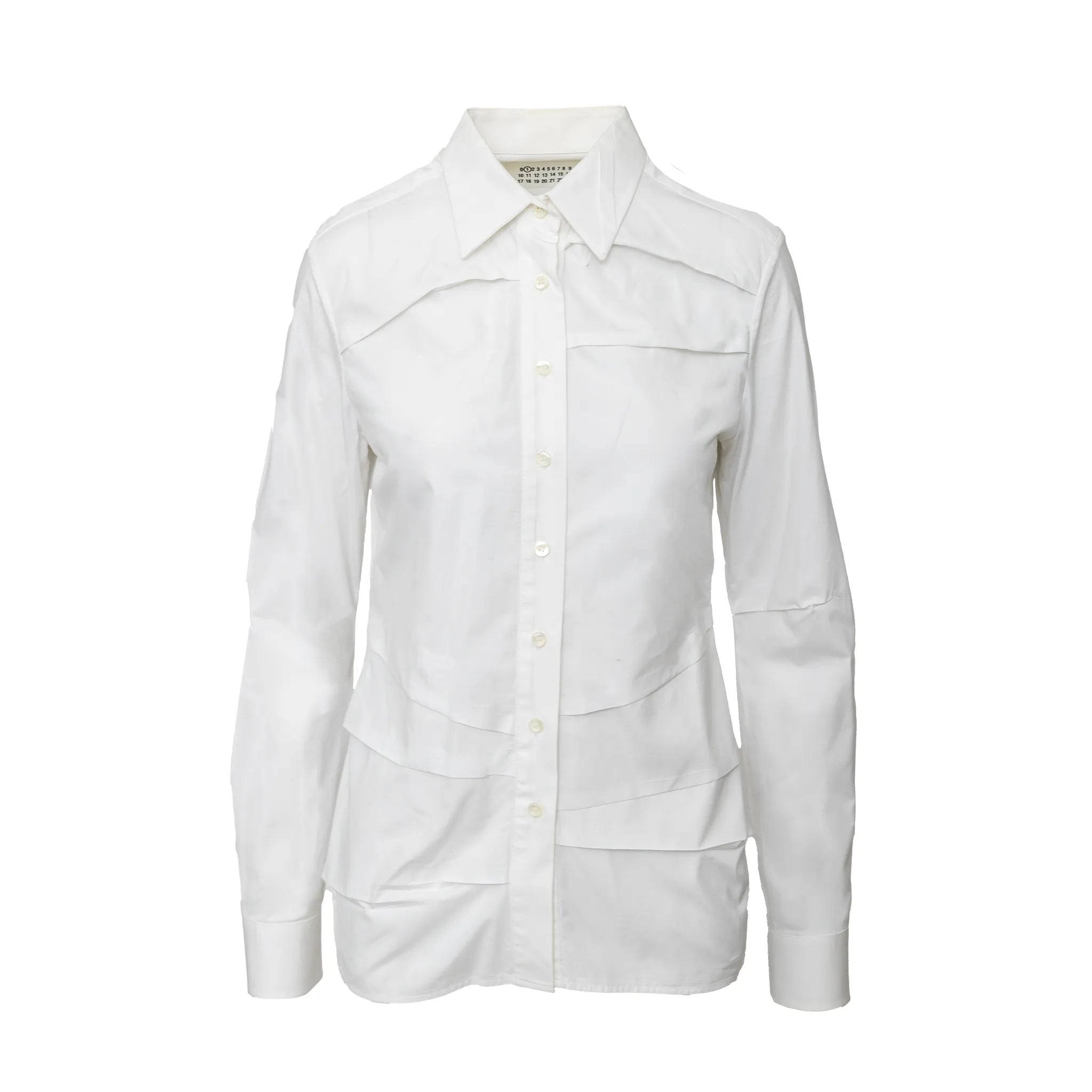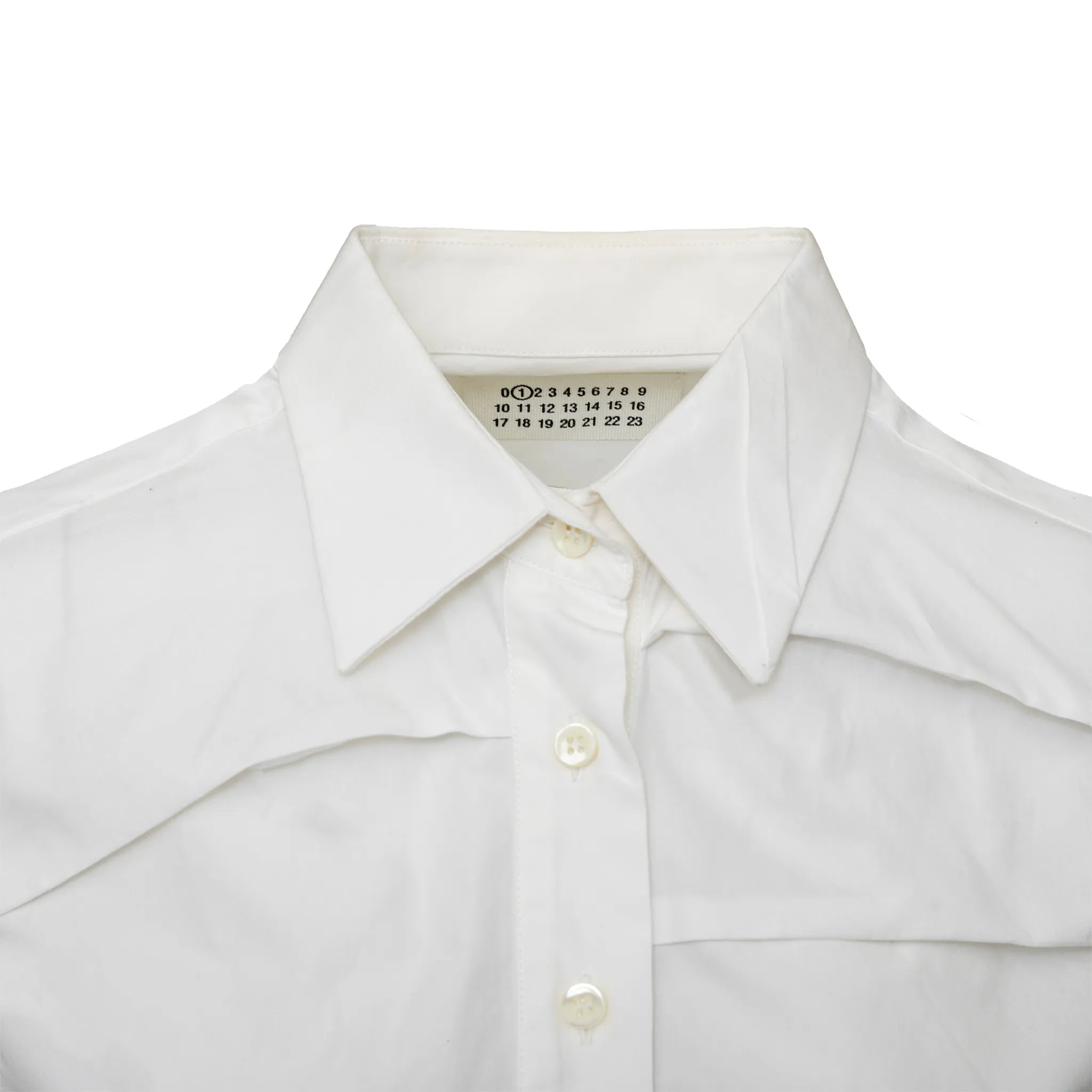 Maison Margiela pleated shirt in crisp white cotton with deconstructed panel detailing, pointed collar, button front, and long sleeves. Elevated minimalism.
