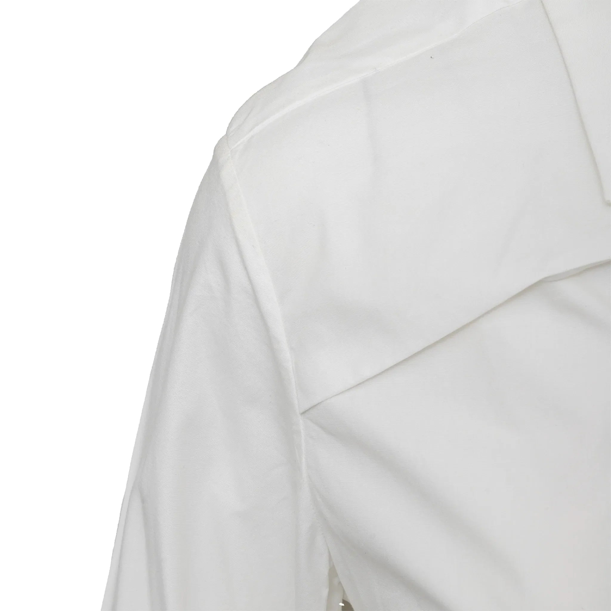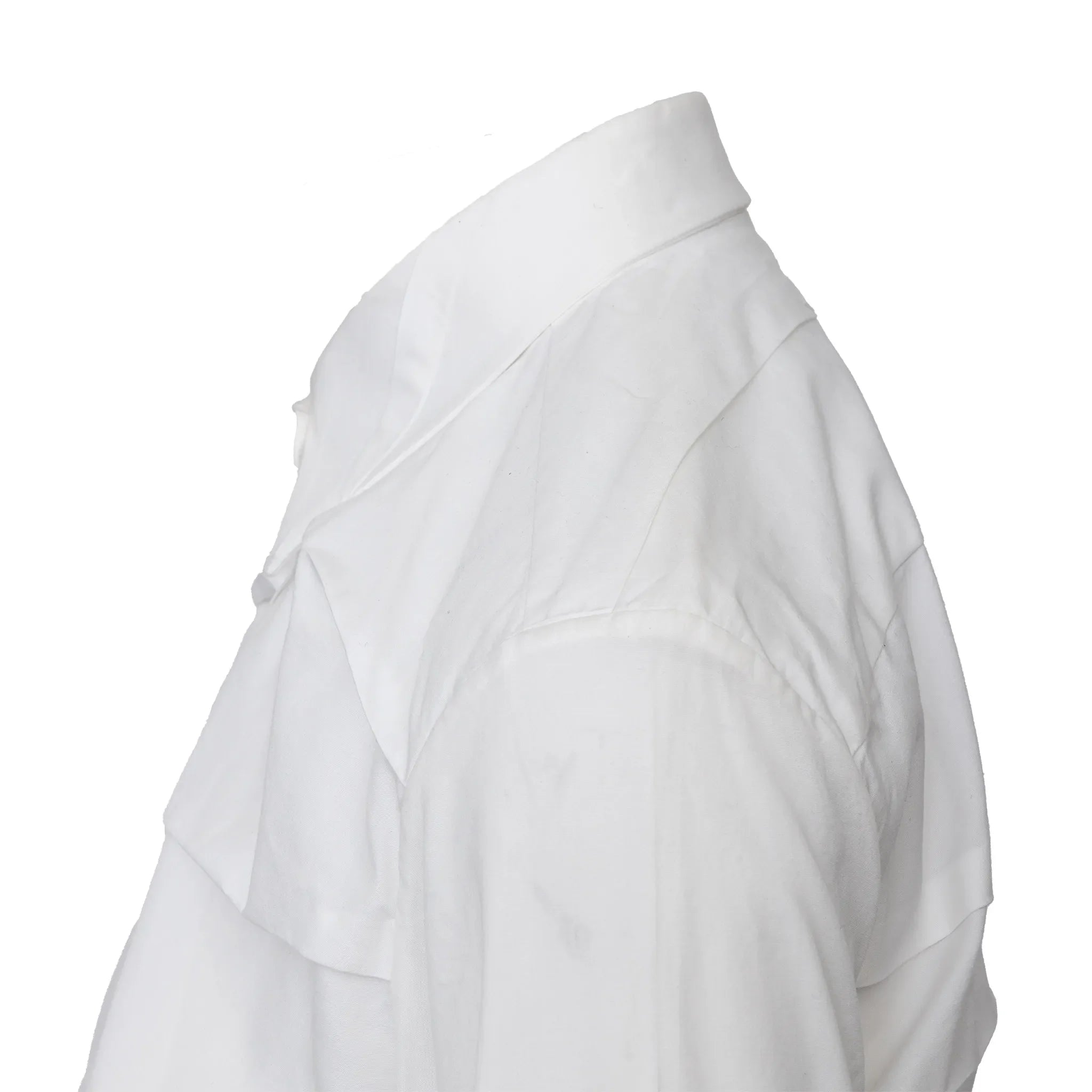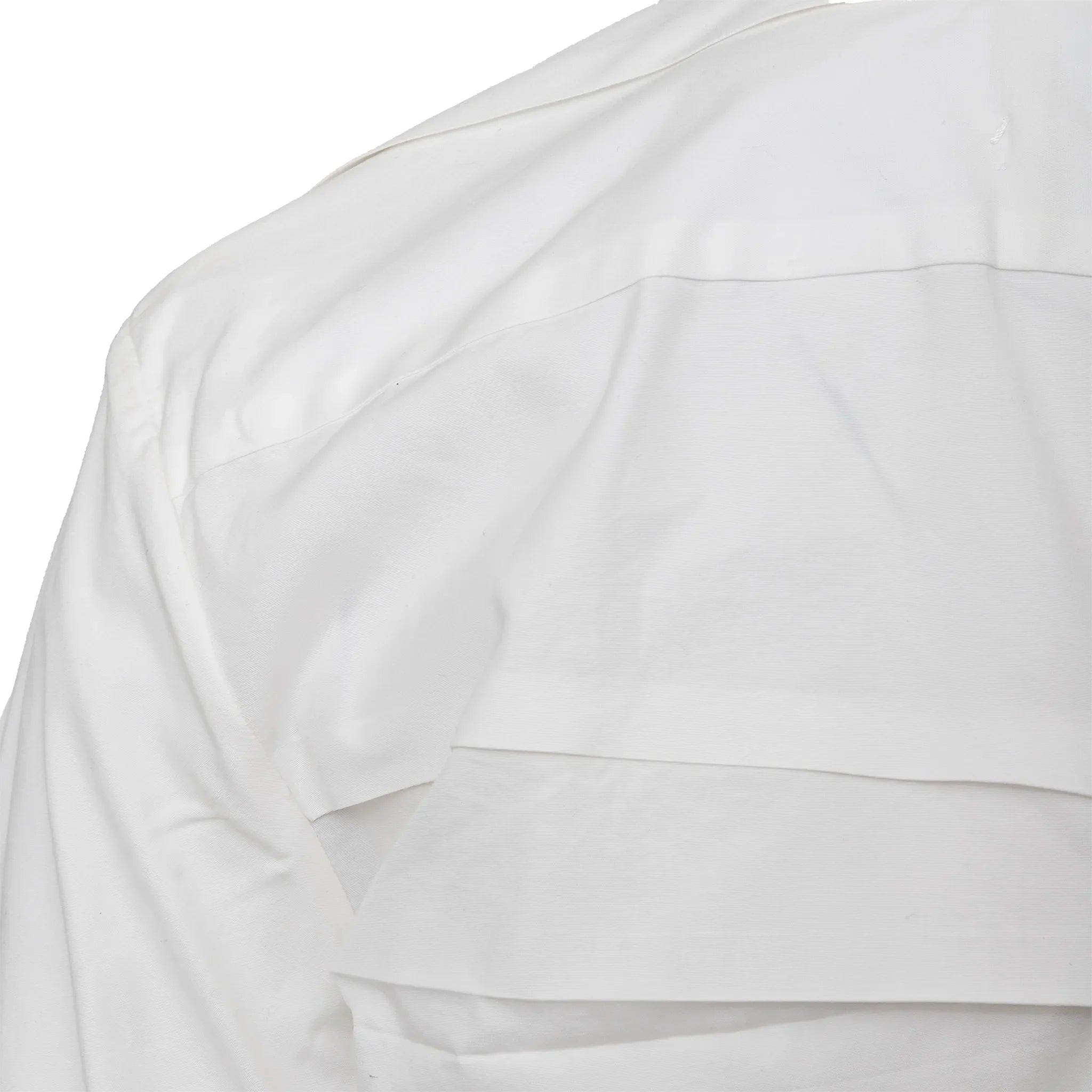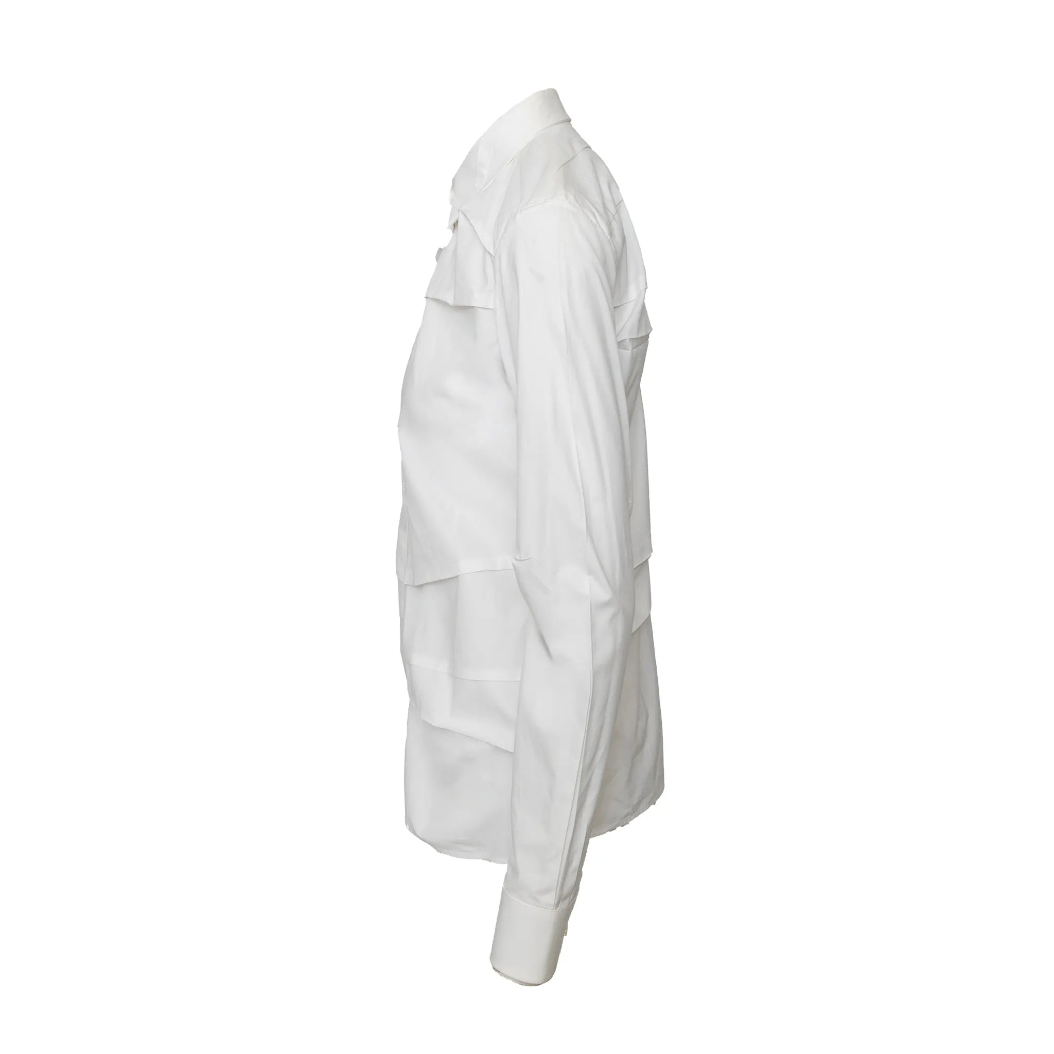 Maison Margiela pleated shirt in crisp white cotton with deconstructed panel detailing, pointed collar, button front, and long sleeves. Elevated minimalism.