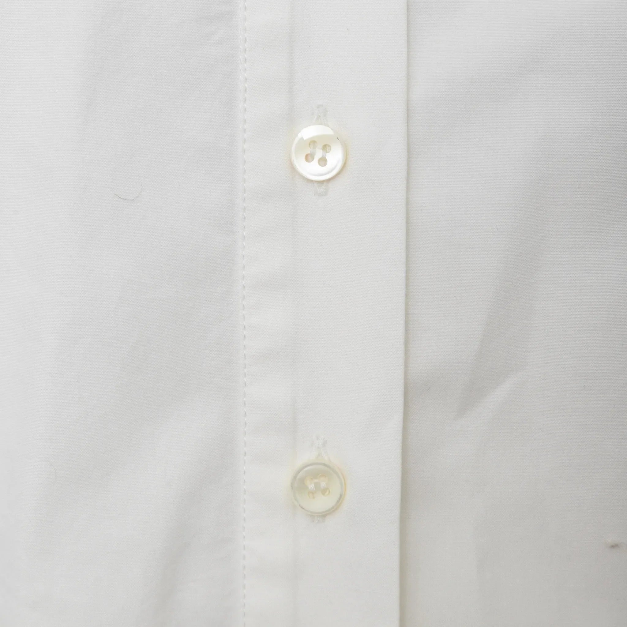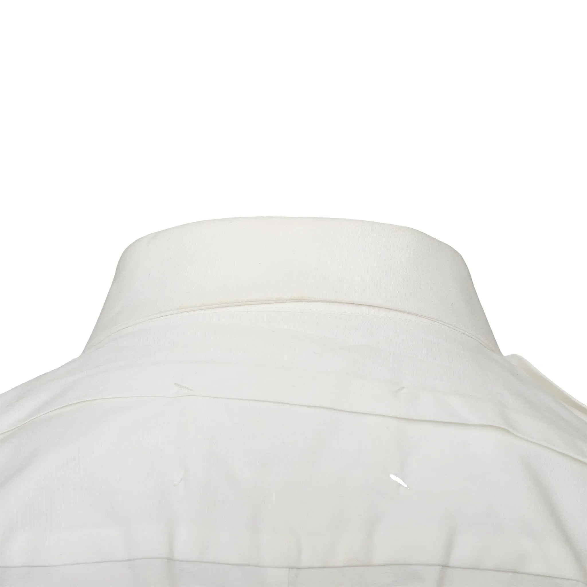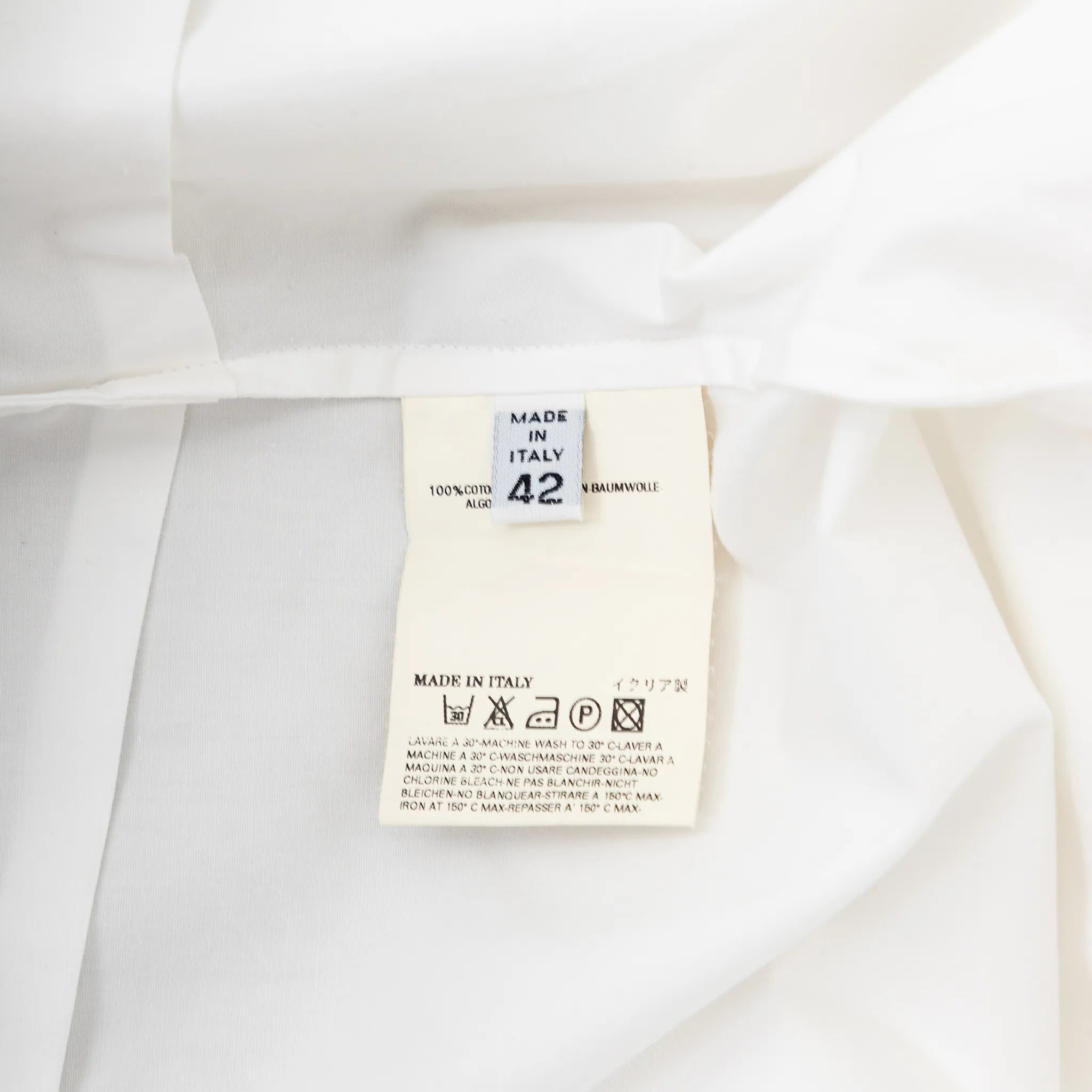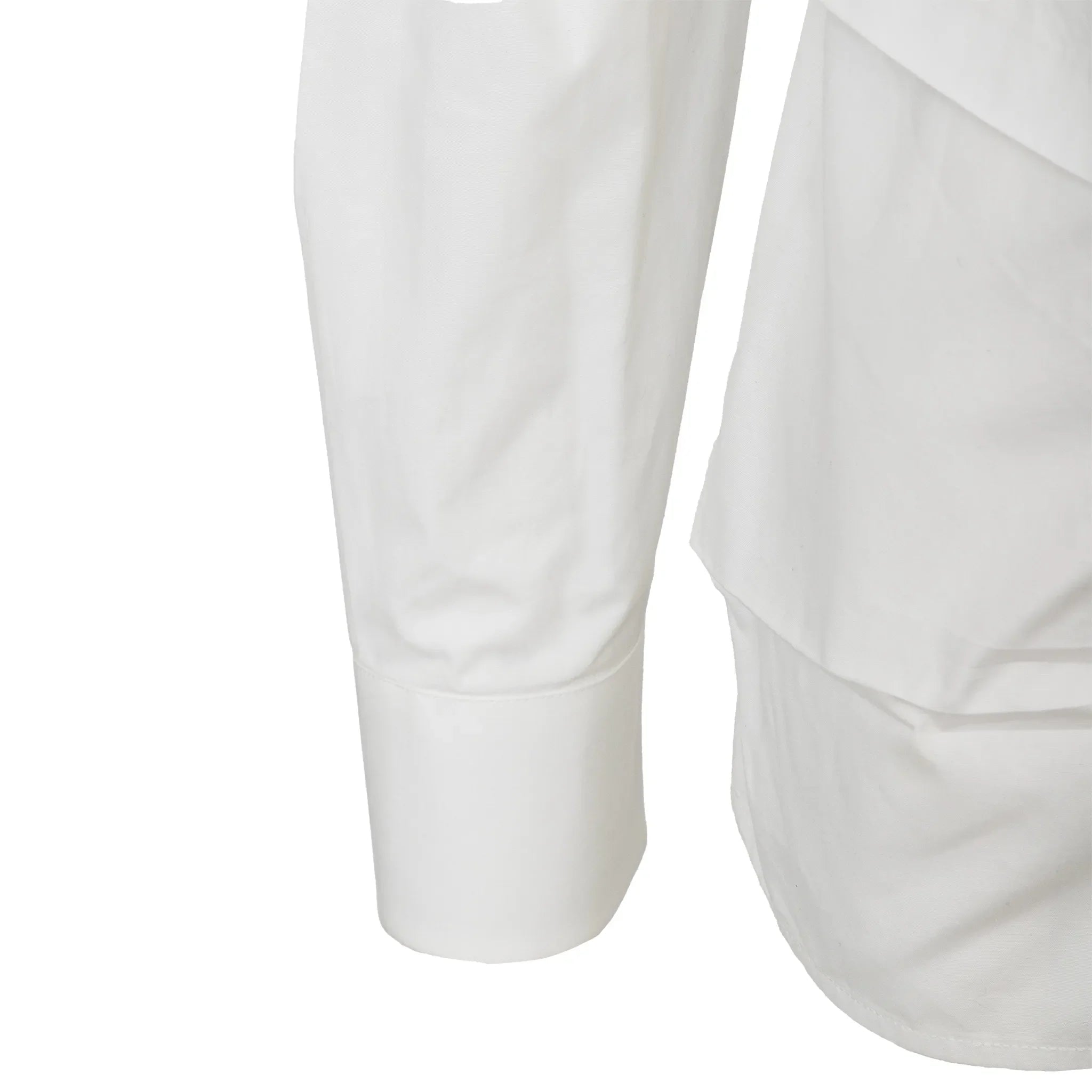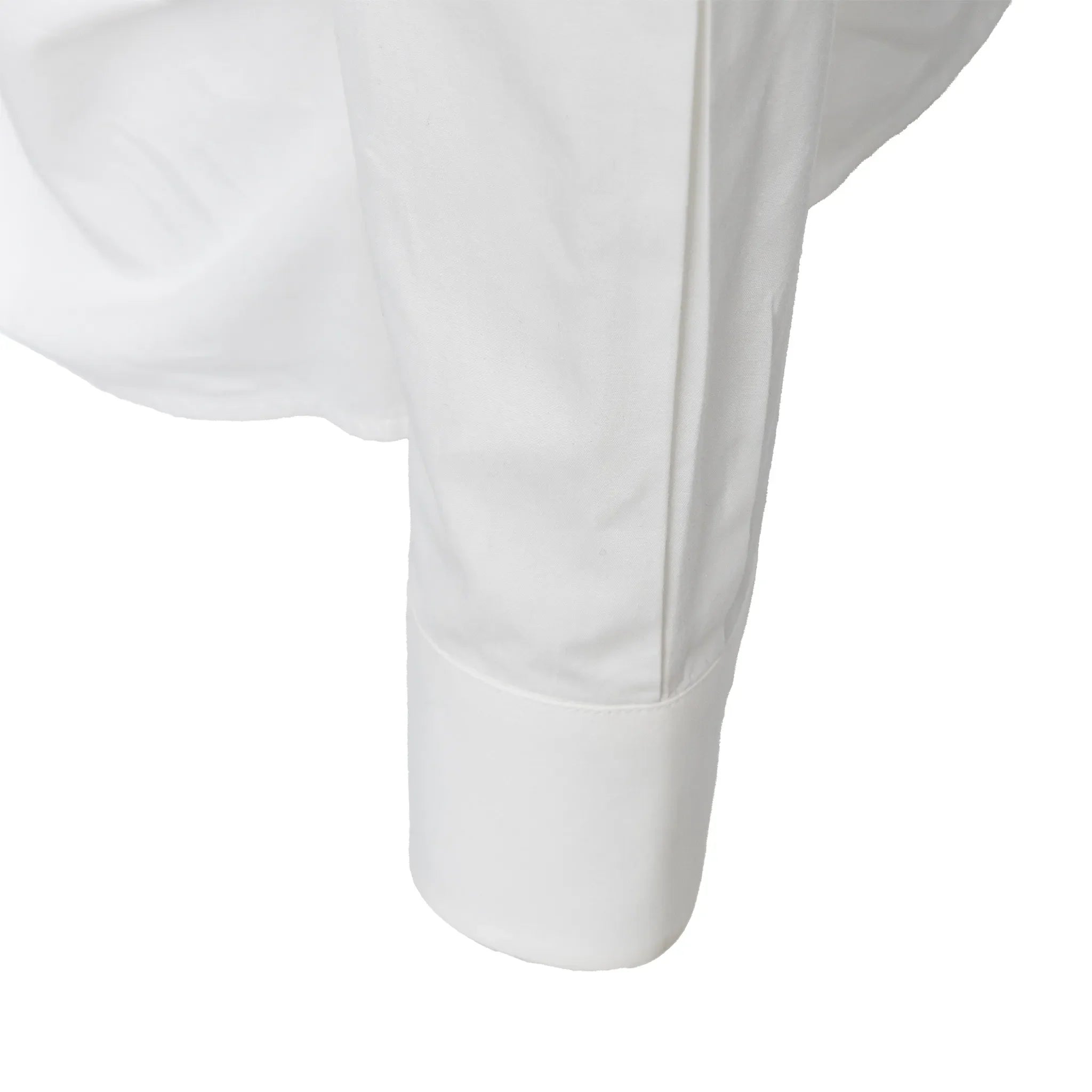 Maison Margiela pleated shirt in crisp white cotton with deconstructed panel detailing, pointed collar, button front, and long sleeves. Elevated minimalism.