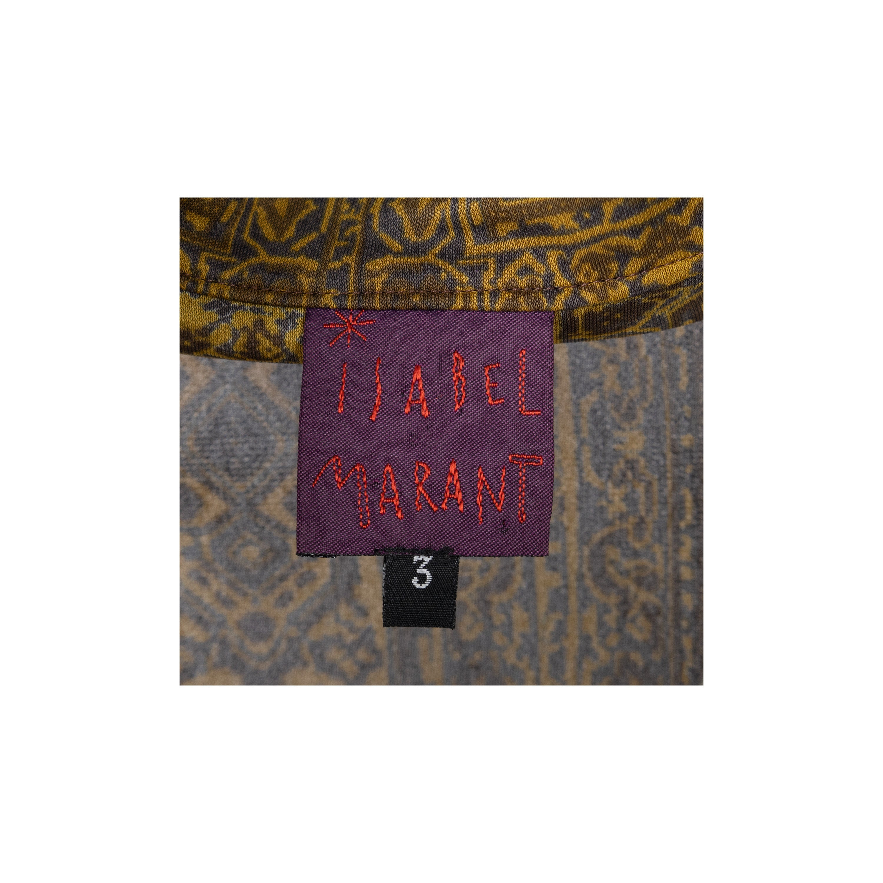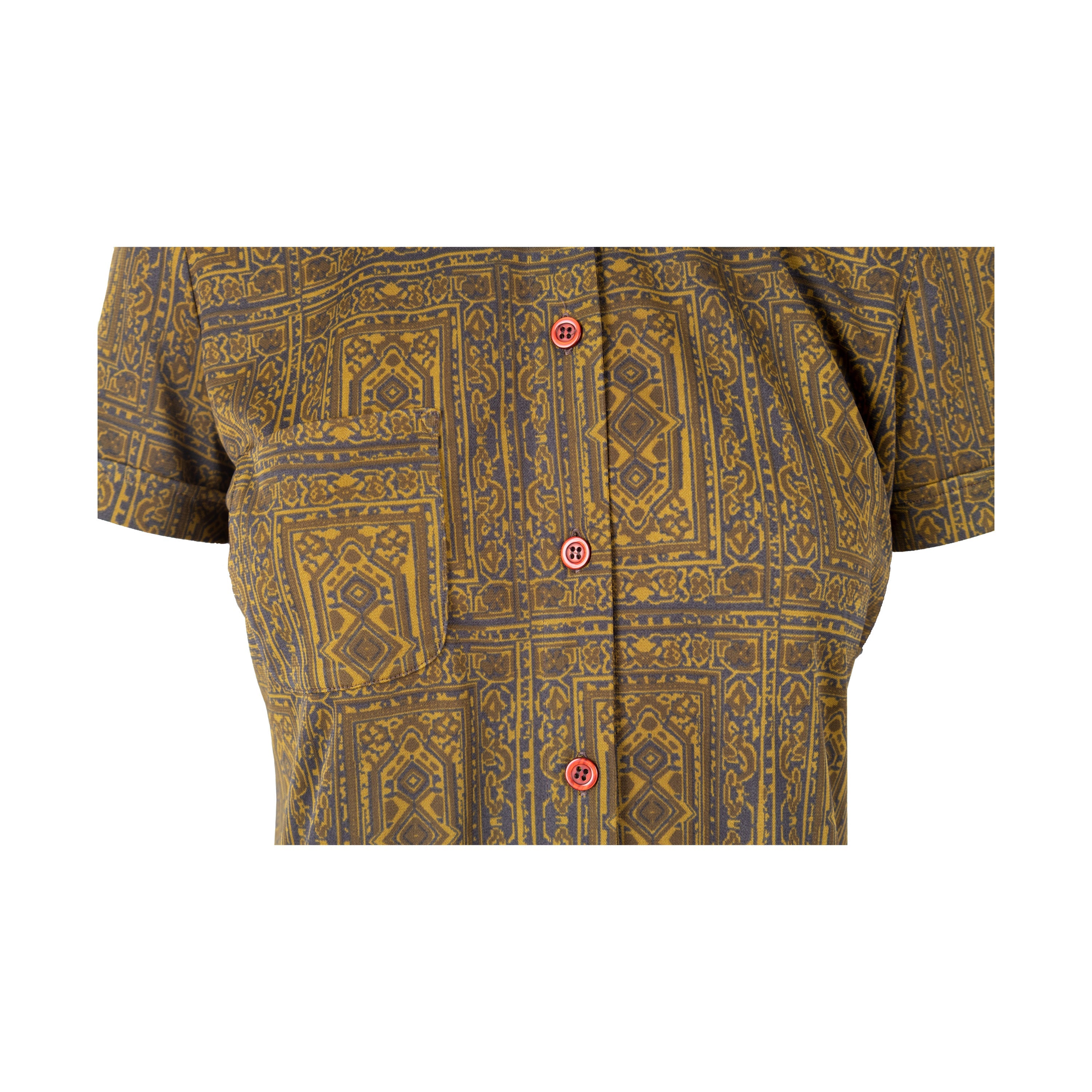 Crafted with short sleeves and a collar, this shirt is decorated with an eye-catching print in shades of olive and yellow. The bright red buttons at the front provide a bold contrast. A perfect combination of comfort and style for the summer.
