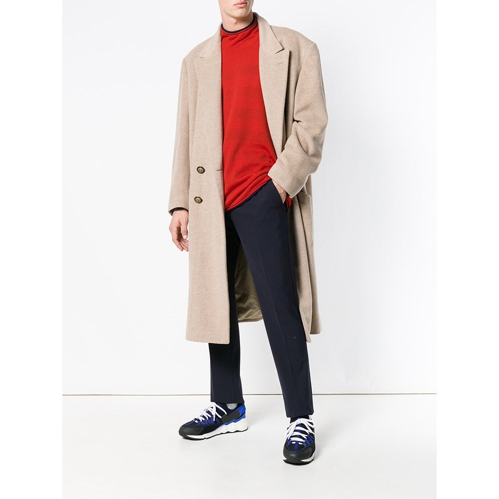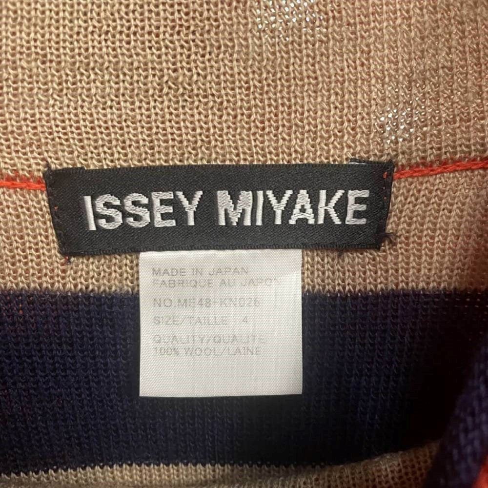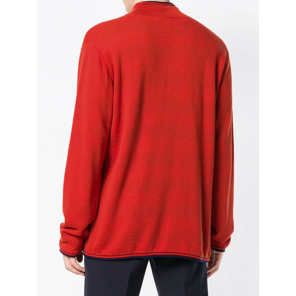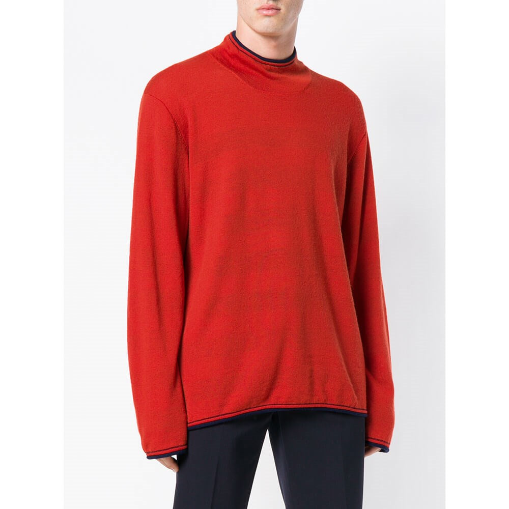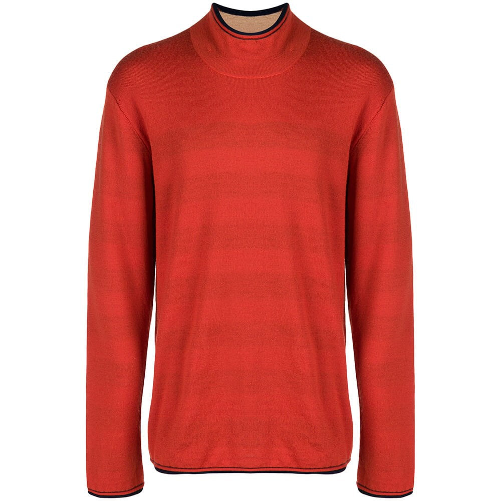 90s Issey Miyake orange wool sweater with blue outline. High collar and long sleeves. The item shows some pulled threads, as shown in the pictures.