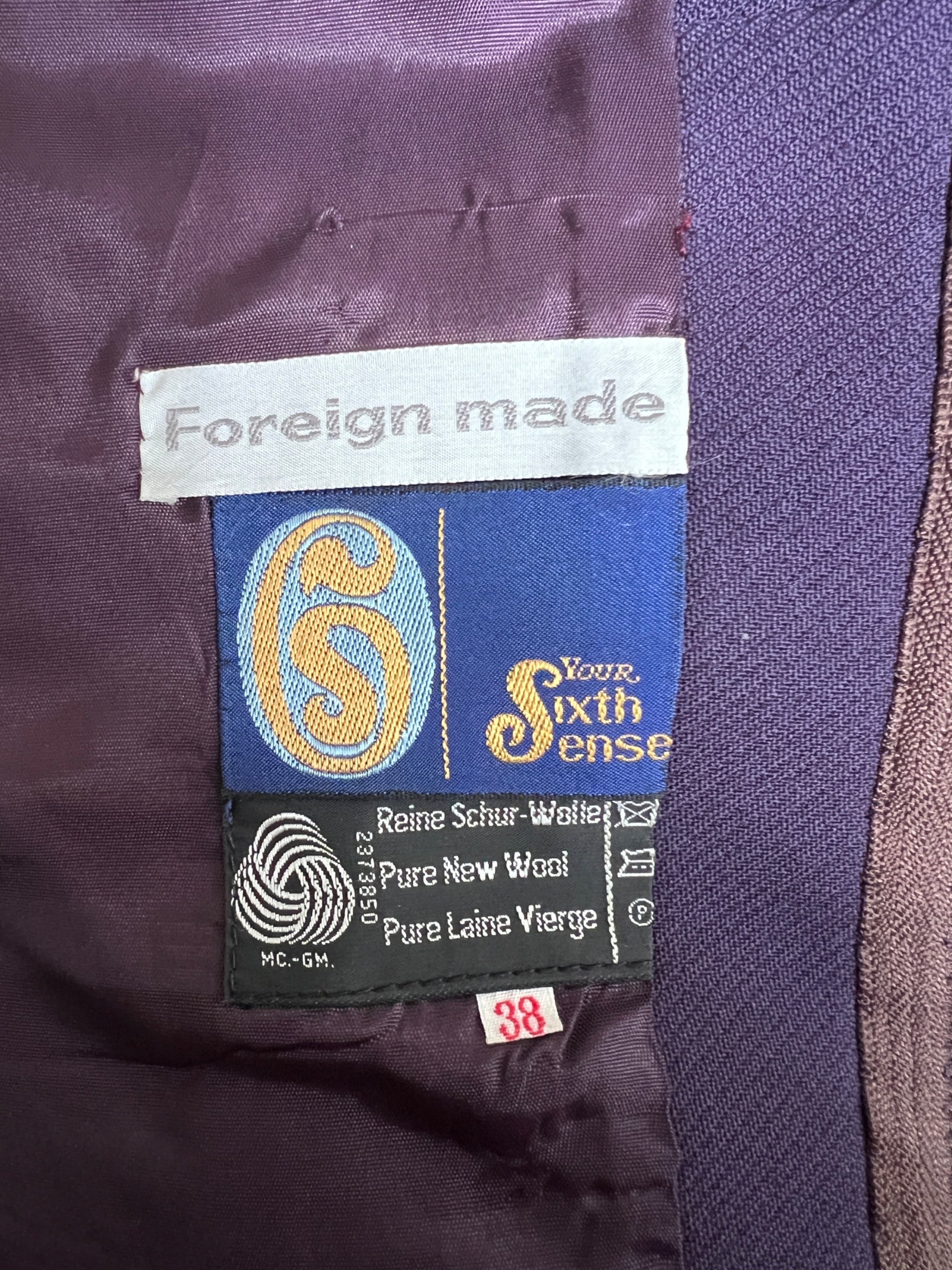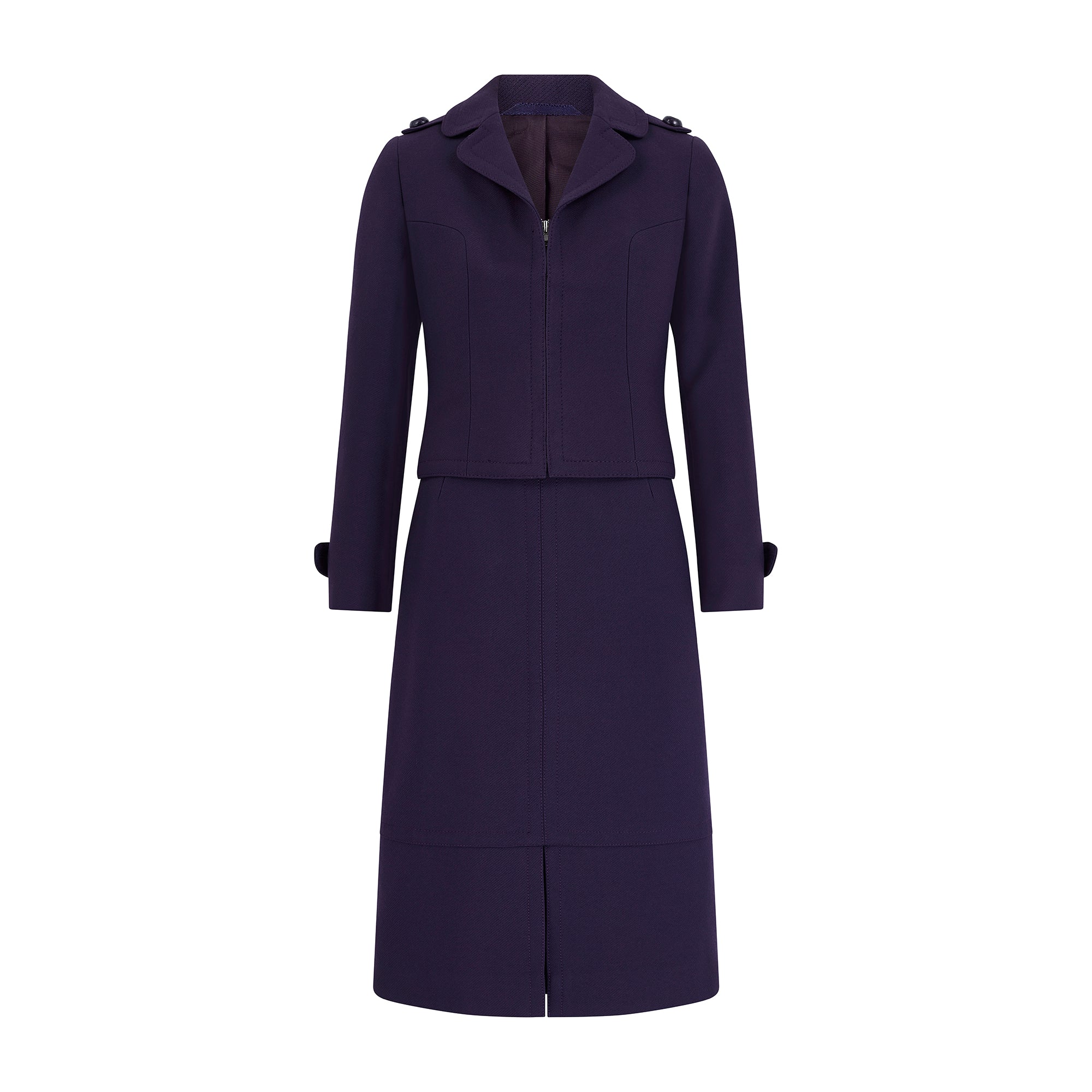 This early 1970s skirt suit is by Sixth Sense, a European brand which sold good quality designer inspired pieces on the Continental high street. It is crafted from thick wool and has a woolmark label in a rich aubergine purple hue. The ensemble is composed of a short, boxy collared jacket with a silver-toned zip-up front. It has a panelled construction and is detailed with epaulettes and sleeve loops, secured with large tonal buttons - which add a utilitarian feel. The skirt has a high-waist cut and falls in an A-line shape to the calf. It too has a panelled construction. It fastens at the rear with a hidden tonal purple zip and hook-and-eye clasp. Both the jacket and skirt are impeccably crafted and are lined with aubergine purple satin.
