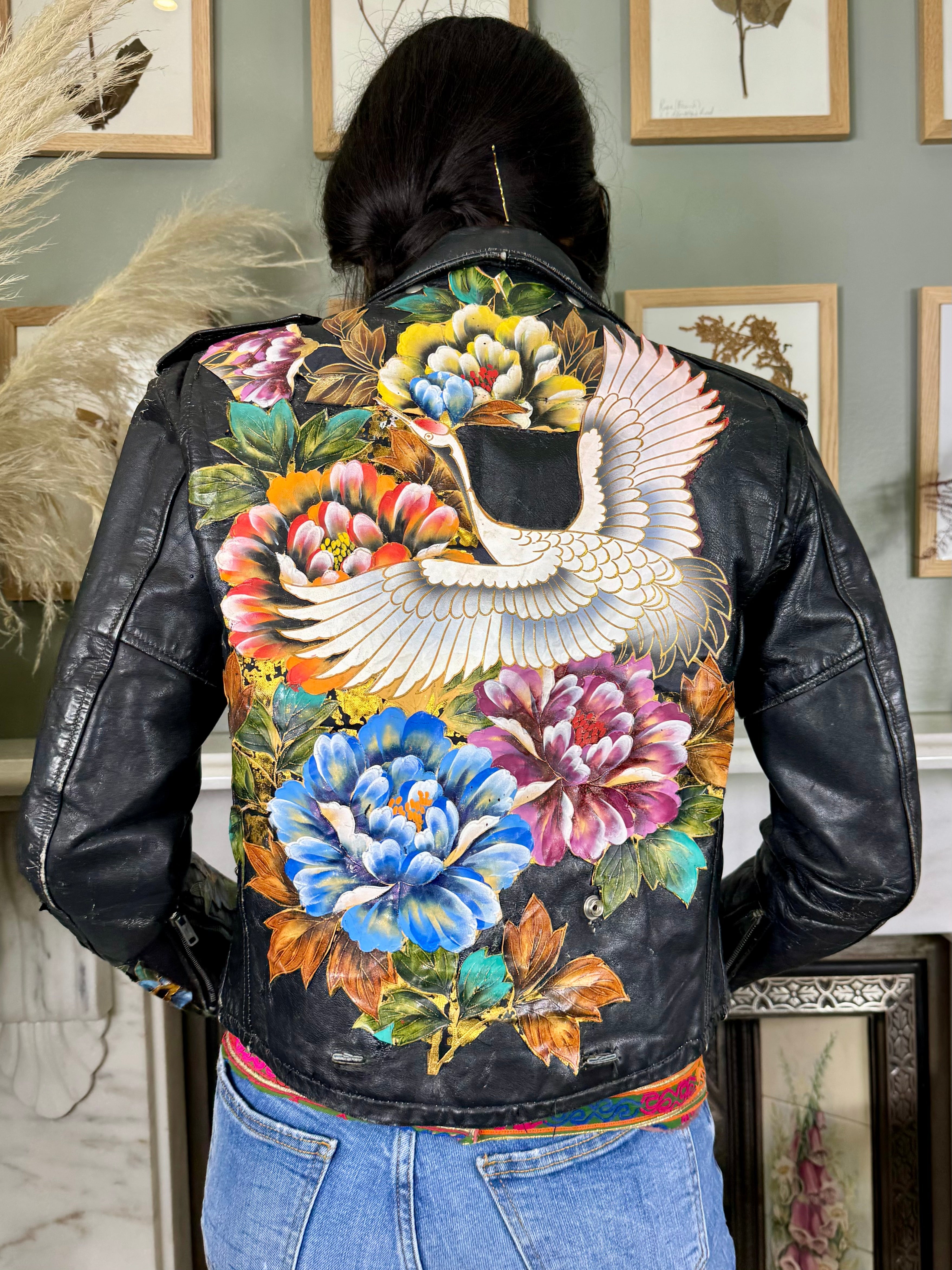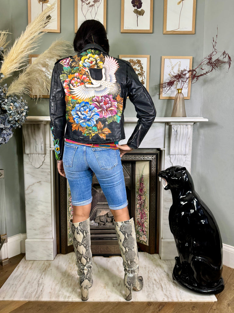 Incredible 70s Original Harley Davidson black leather jacket. Has long sleeves, a straight cut and a centre zip. Gorgeous florals and birds adorn the front and back. This jacket is a true one-off and packs a punch! Very good condition.