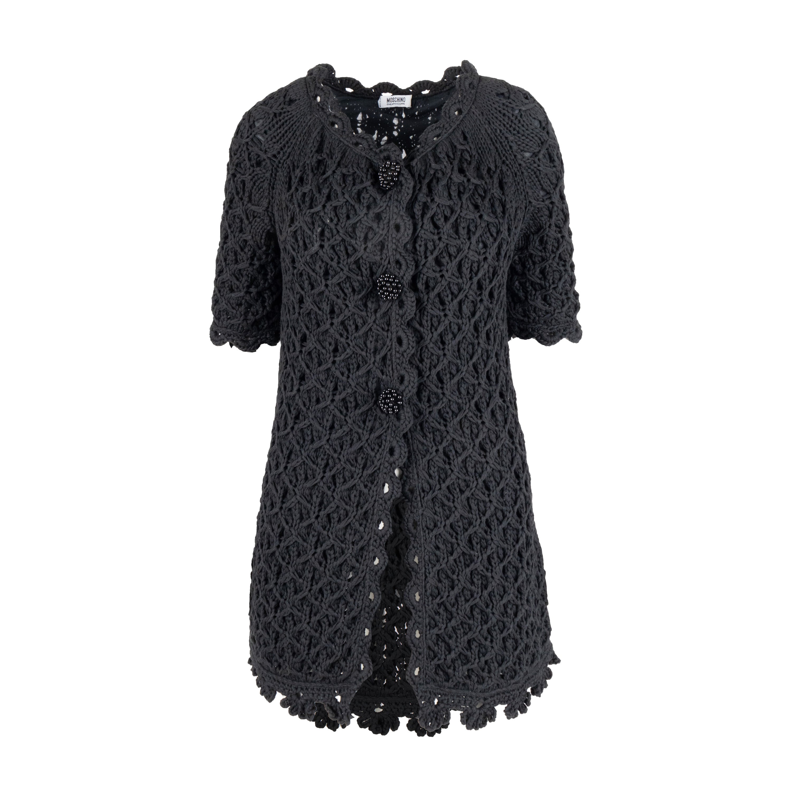 Expertly crocheted from a cotton and polyamide blend in sleek black, this Moschino Cheap and Chic Crochet Jacket offers both style and comfort. The unique crochet design features a three-button front, round neck, and raglan sleeve shoulder for a sophisticated and chic look.