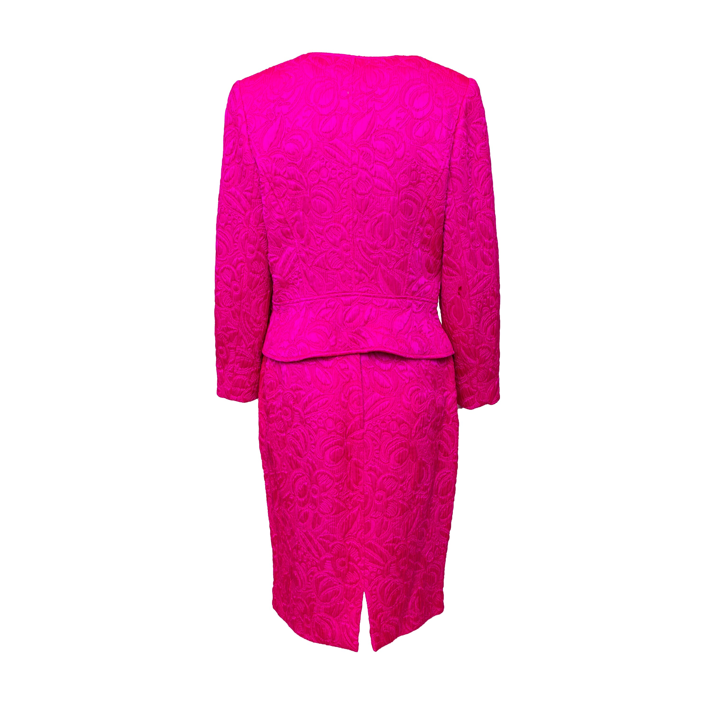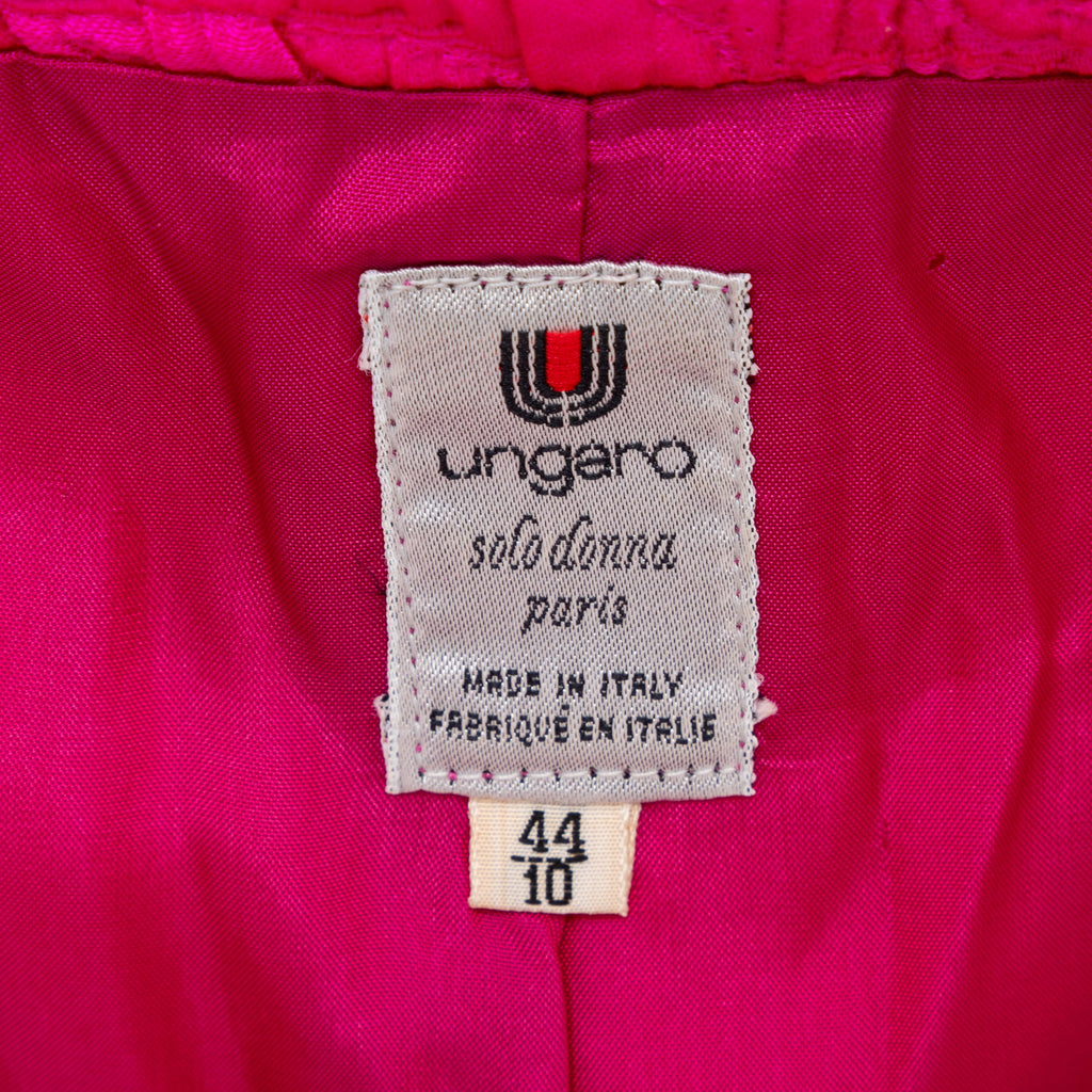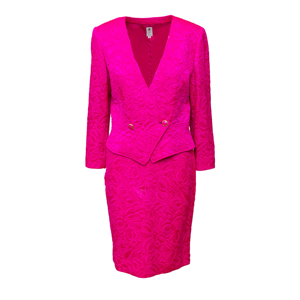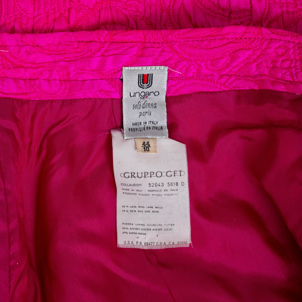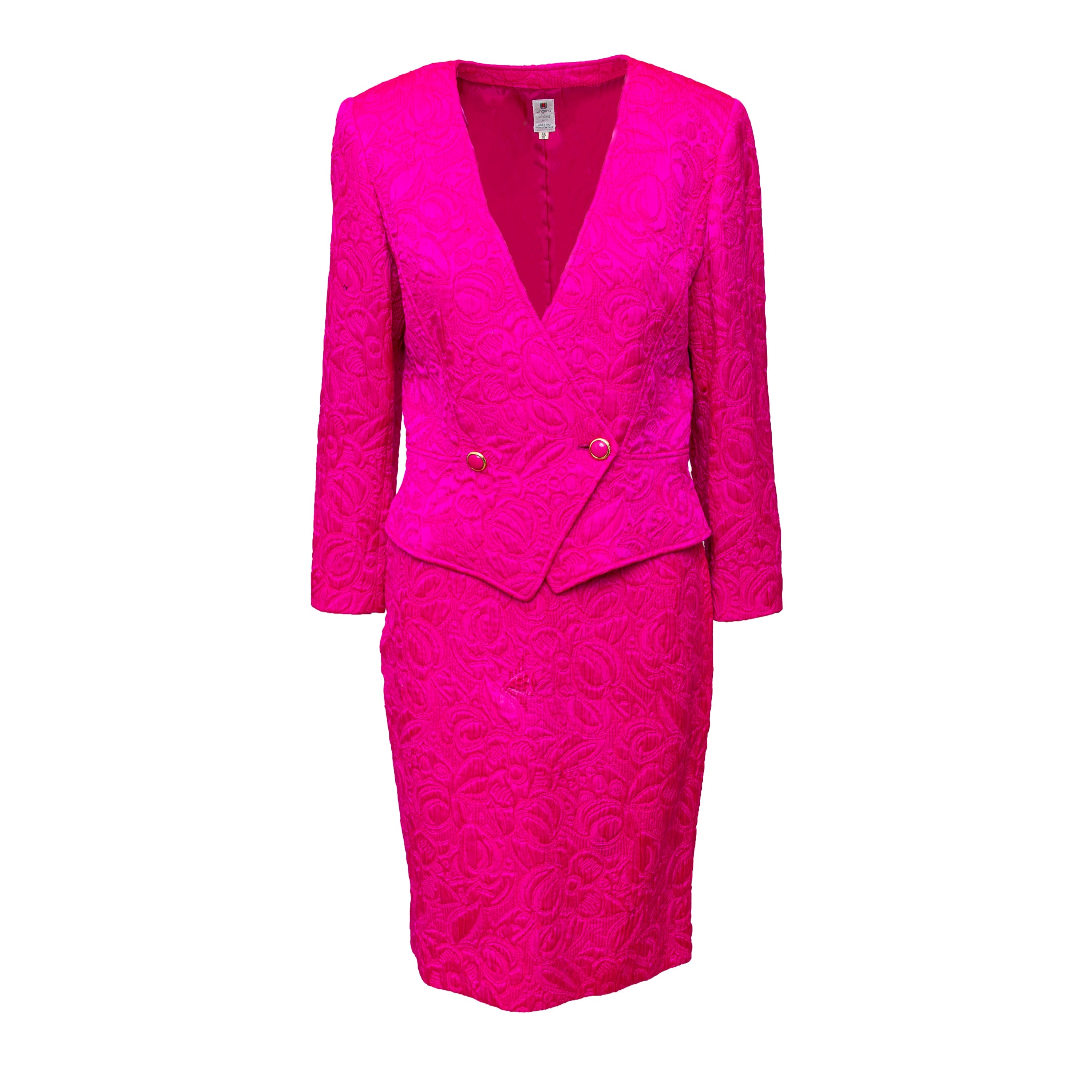 Introducing the Ungaro set from the 90s, featuring a luxurious wool and silk blend fabric in a vibrant fuchsia pink. The set includes a stylish v neck jacket with a two button closure and a flattering midi skirt, both adorned with a beautiful floral jacquard pattern.