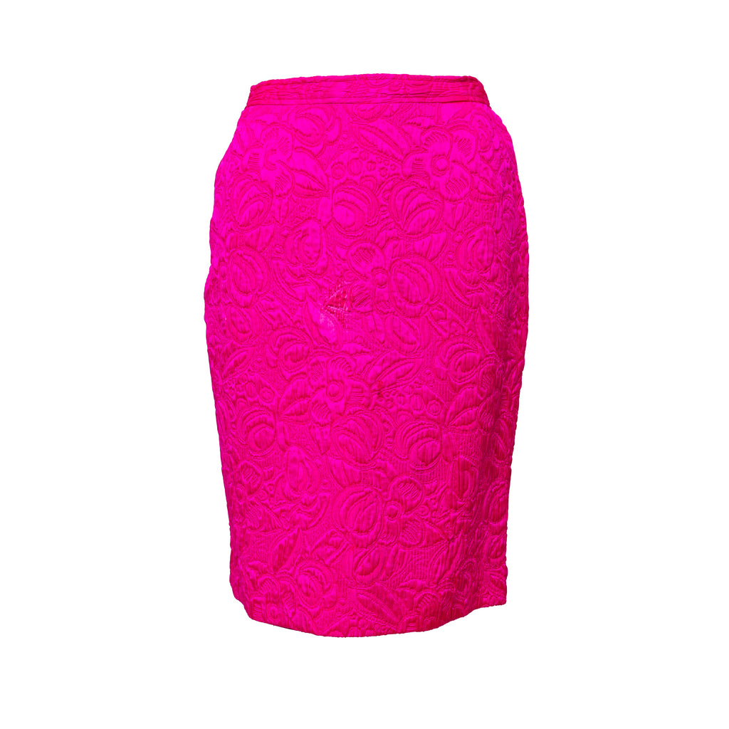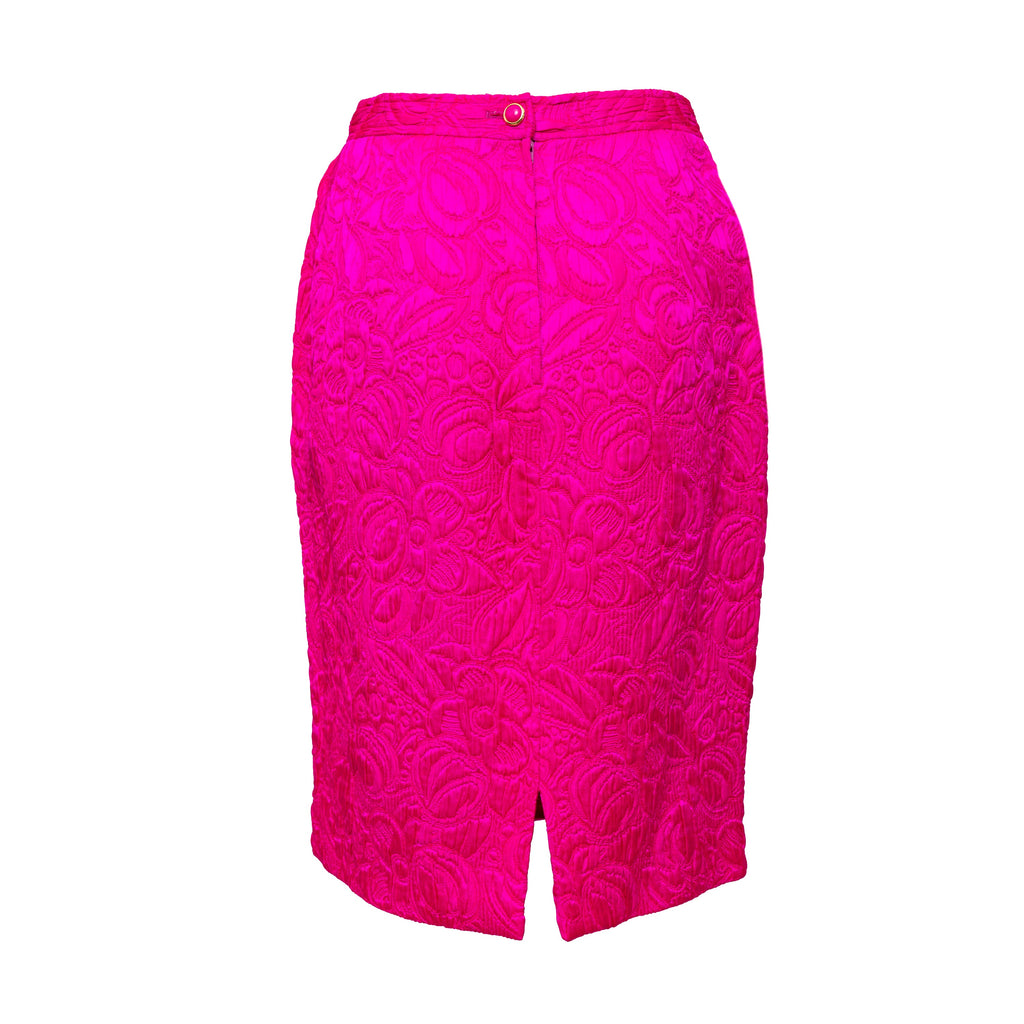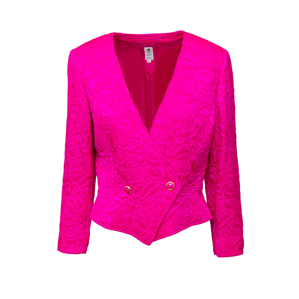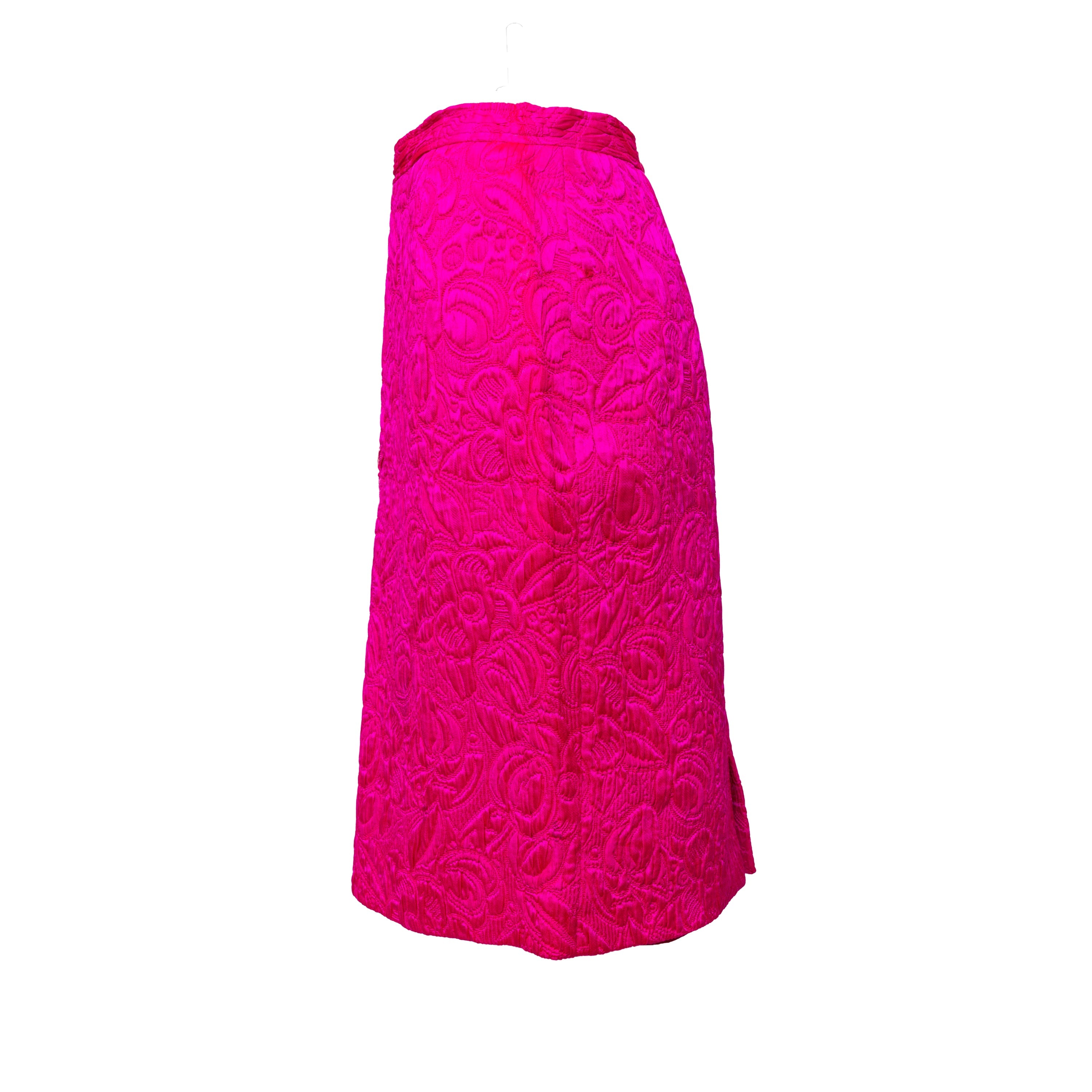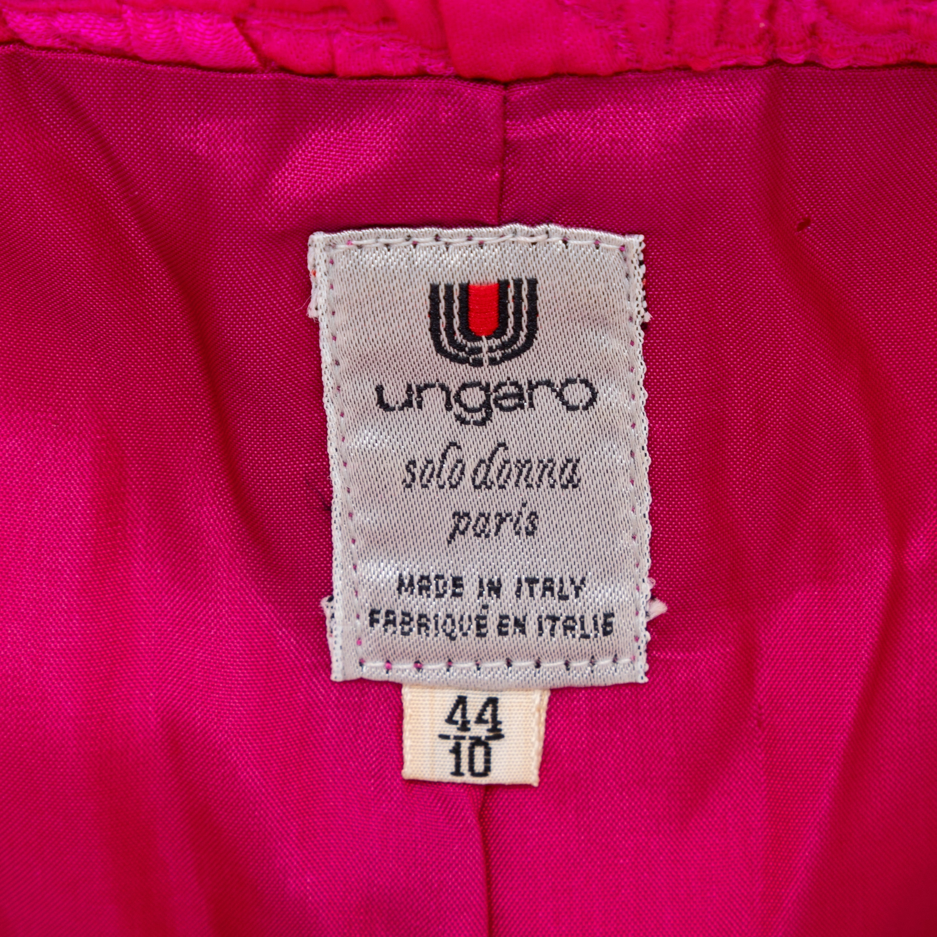 Introducing the Ungaro set from the 90s, featuring a luxurious wool and silk blend fabric in a vibrant fuchsia pink. The set includes a stylish v neck jacket with a two button closure and a flattering midi skirt, both adorned with a beautiful floral jacquard pattern.