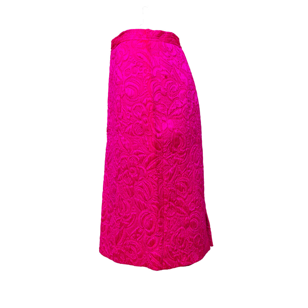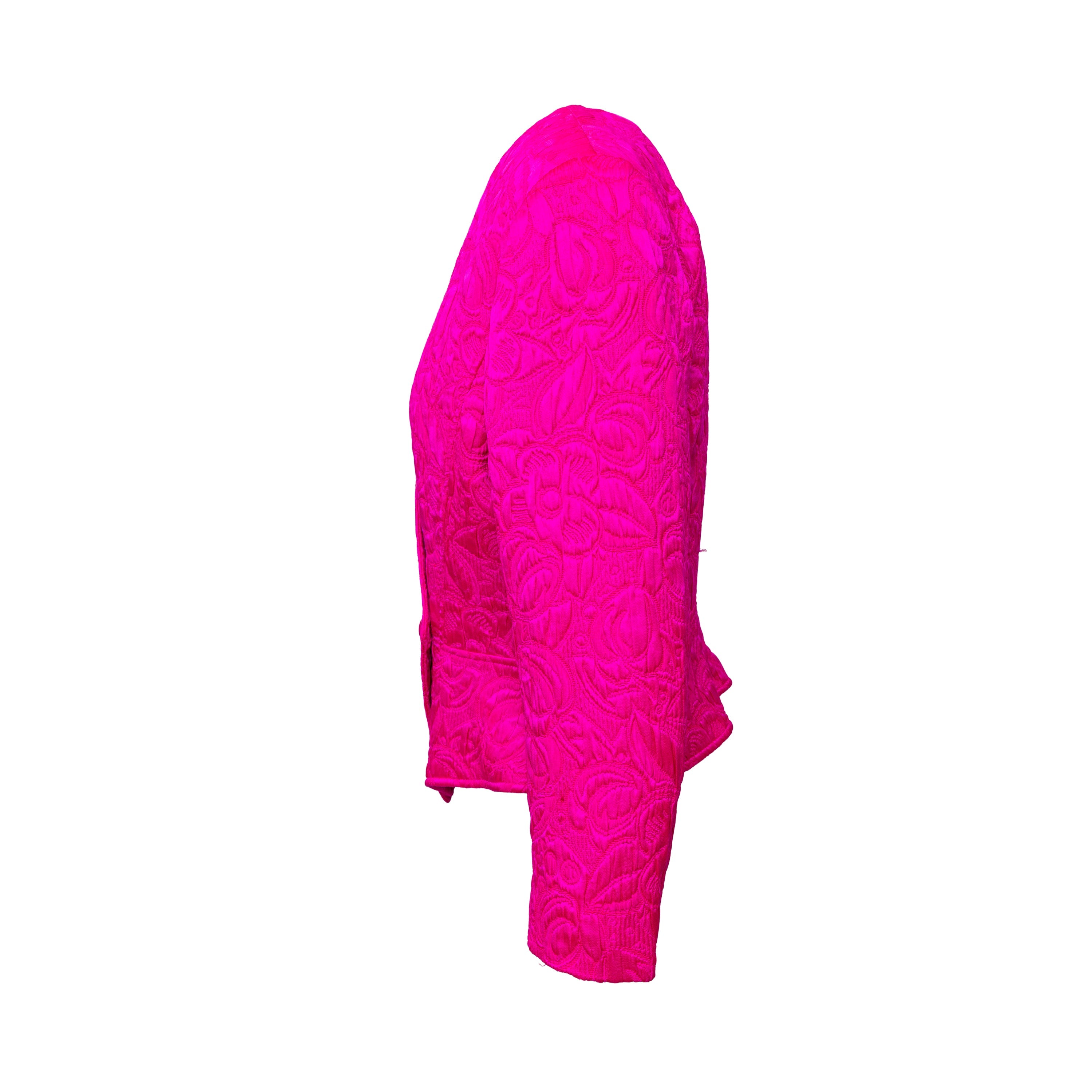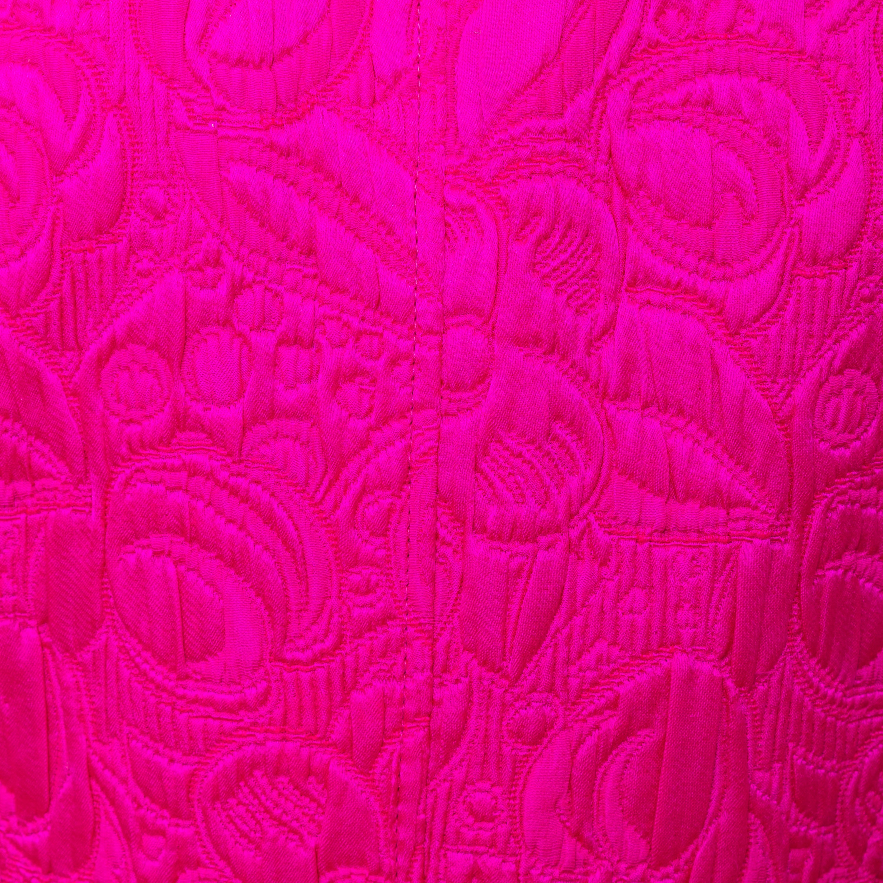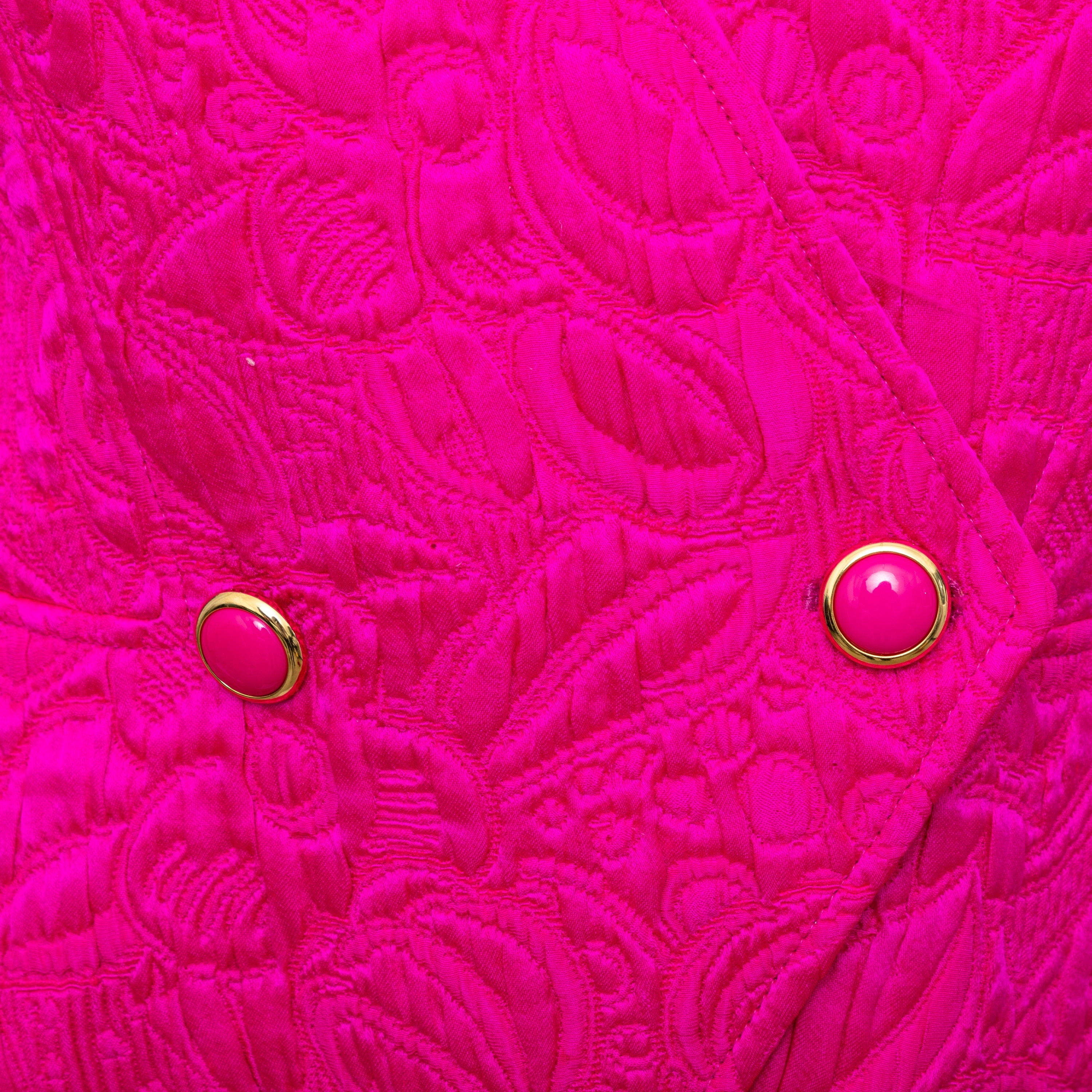 Introducing the Ungaro set from the 90s, featuring a luxurious wool and silk blend fabric in a vibrant fuchsia pink. The set includes a stylish v neck jacket with a two button closure and a flattering midi skirt, both adorned with a beautiful floral jacquard pattern.