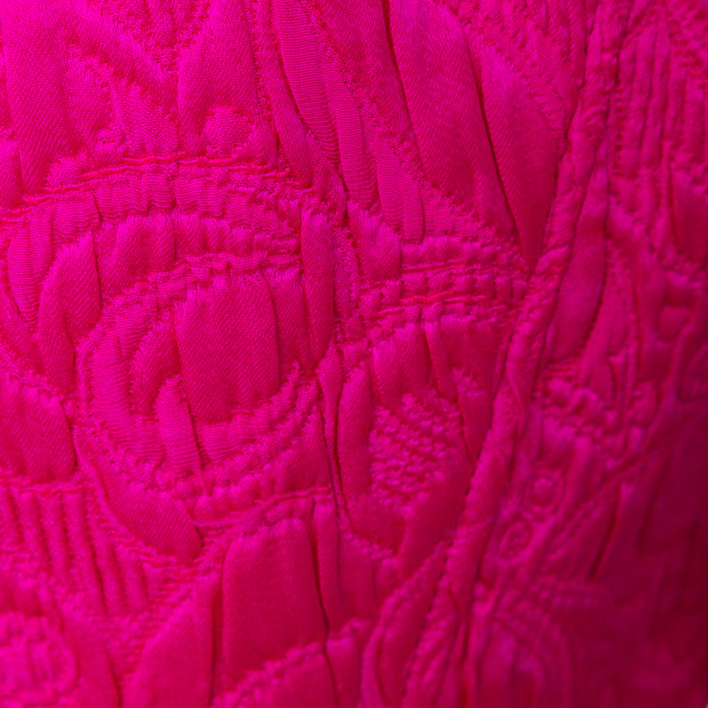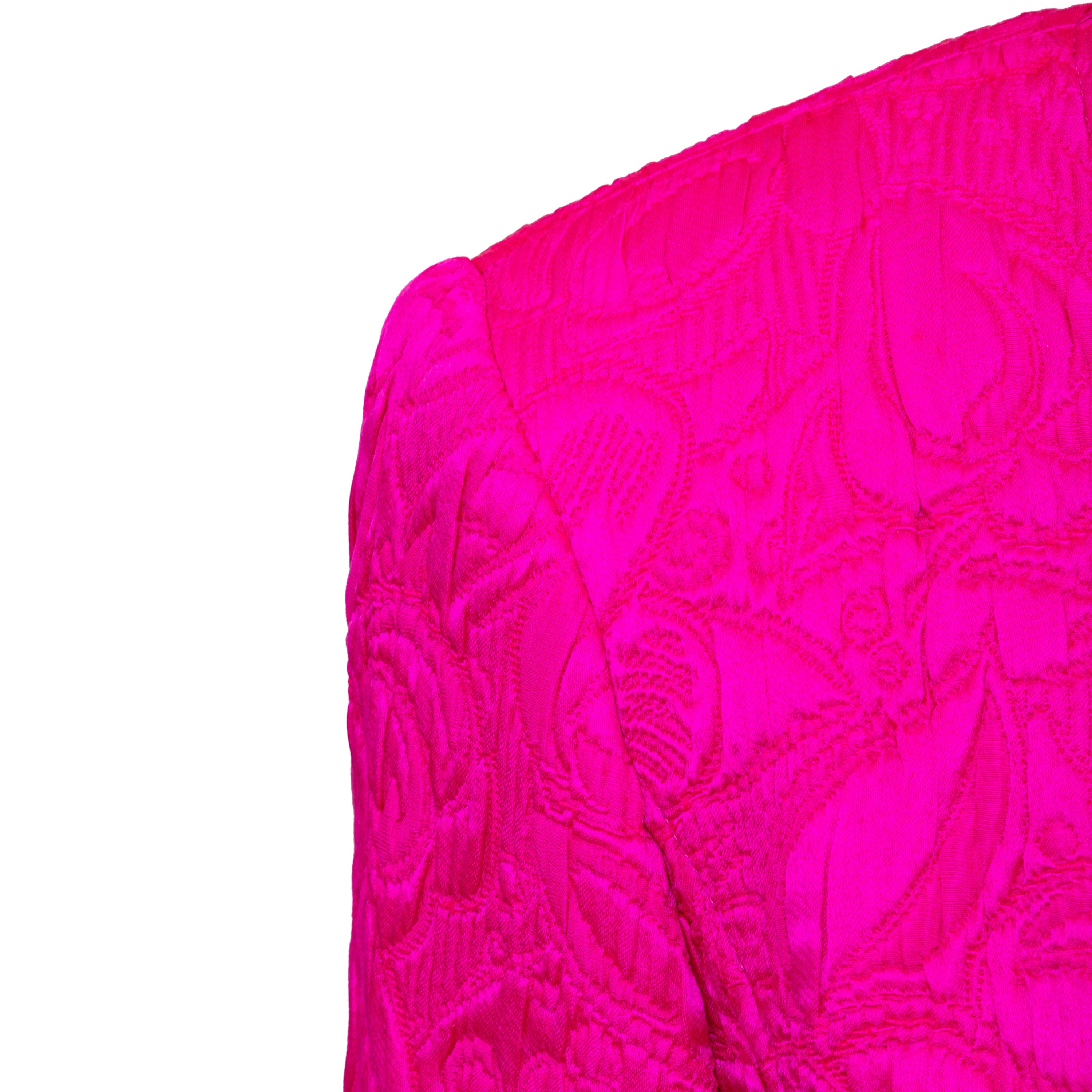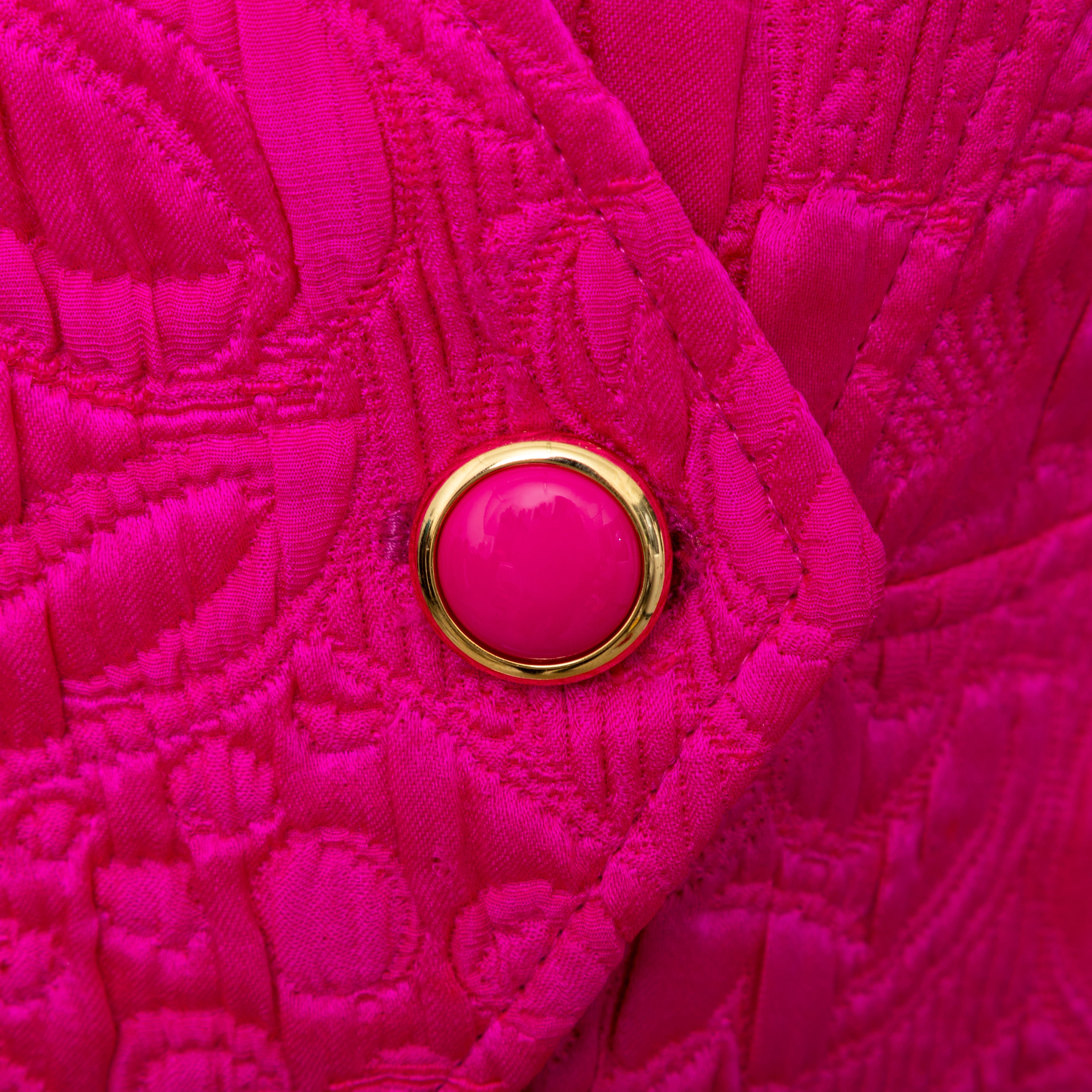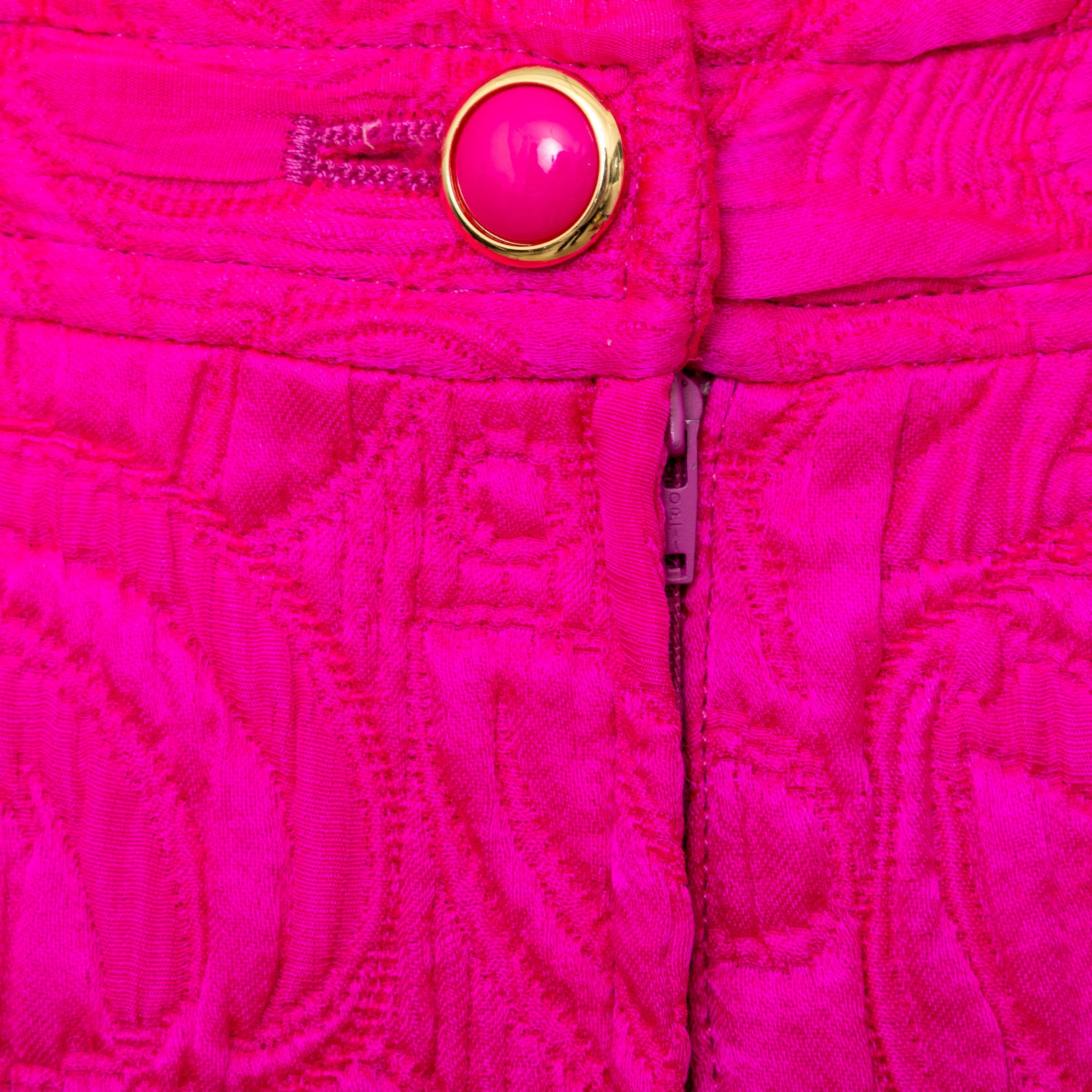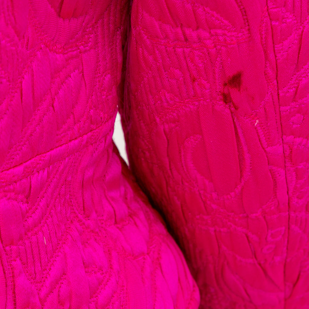Introducing the Ungaro set from the 90s, featuring a luxurious wool and silk blend fabric in a vibrant fuchsia pink. The set includes a stylish v neck jacket with a two button closure and a flattering midi skirt, both adorned with a beautiful floral jacquard pattern.