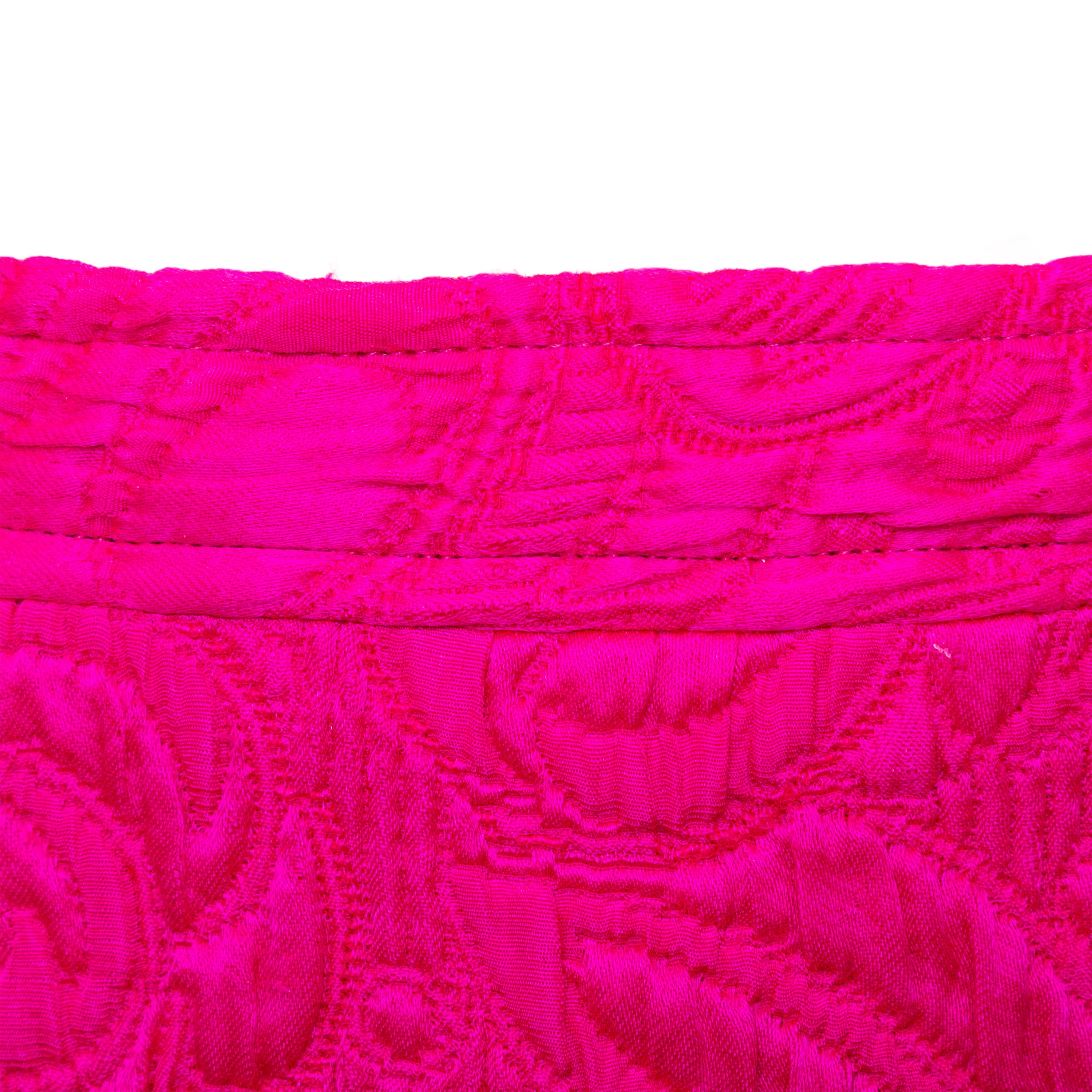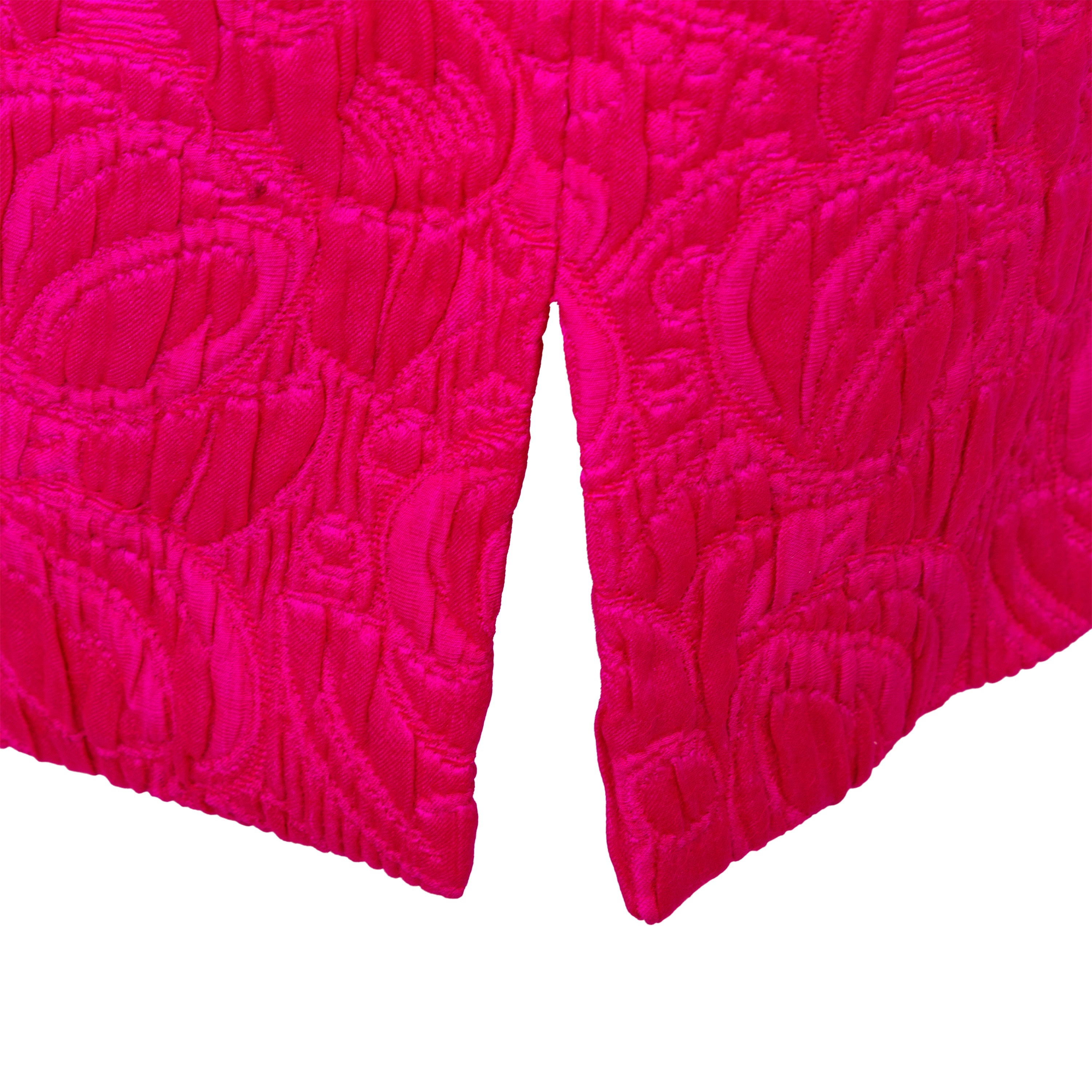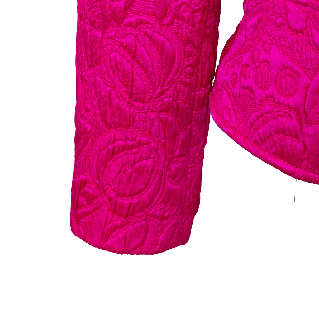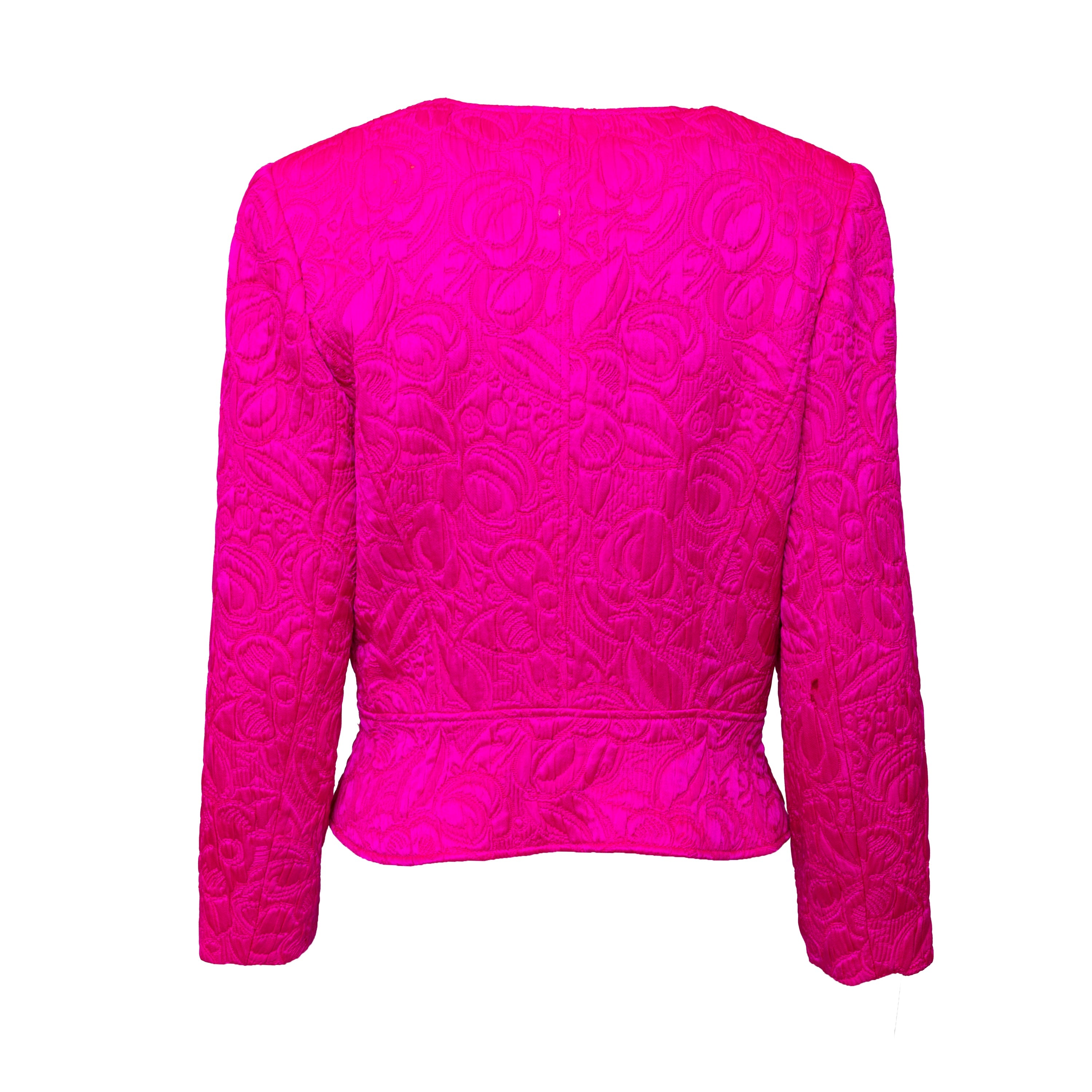 Introducing the Ungaro set from the 90s, featuring a luxurious wool and silk blend fabric in a vibrant fuchsia pink. The set includes a stylish v neck jacket with a two button closure and a flattering midi skirt, both adorned with a beautiful floral jacquard pattern.
