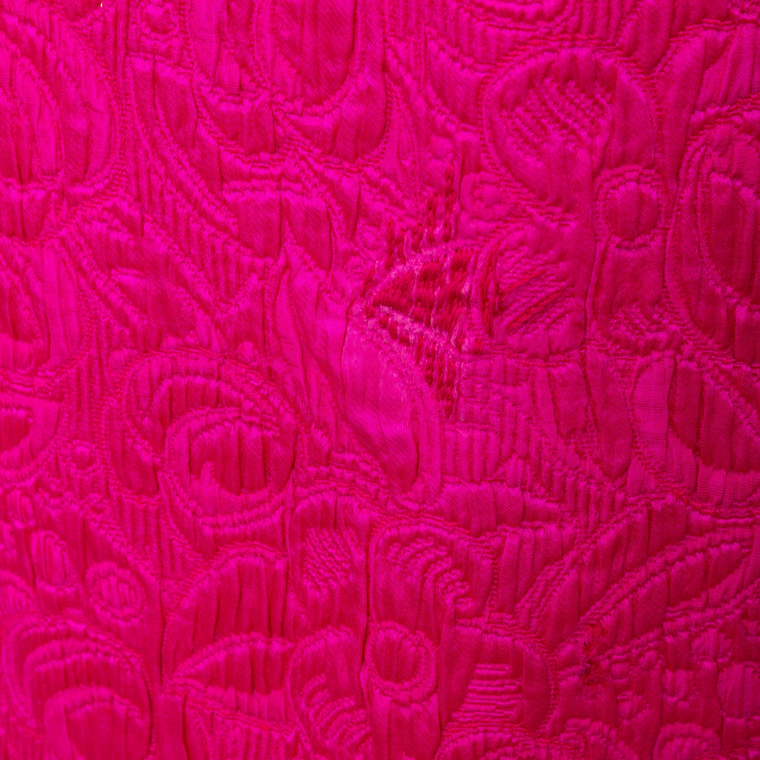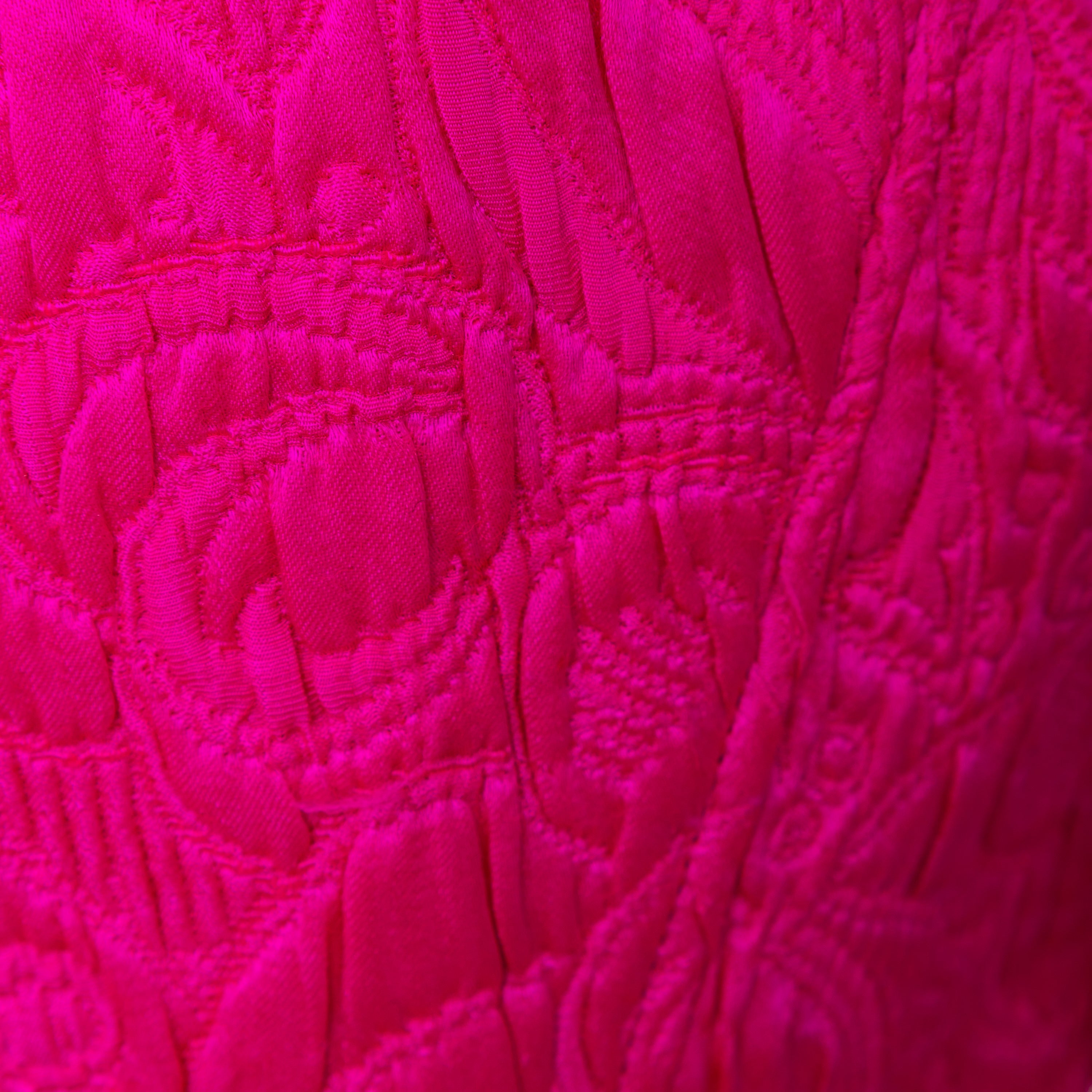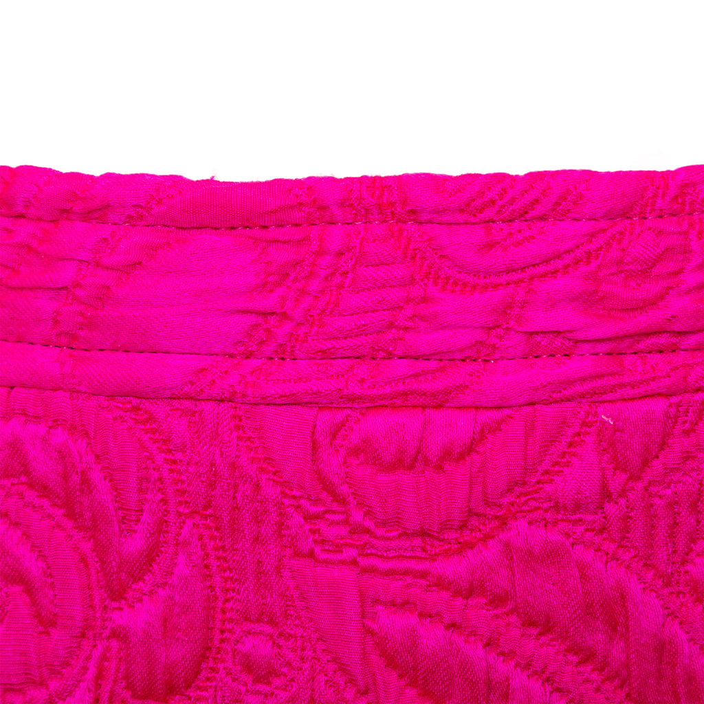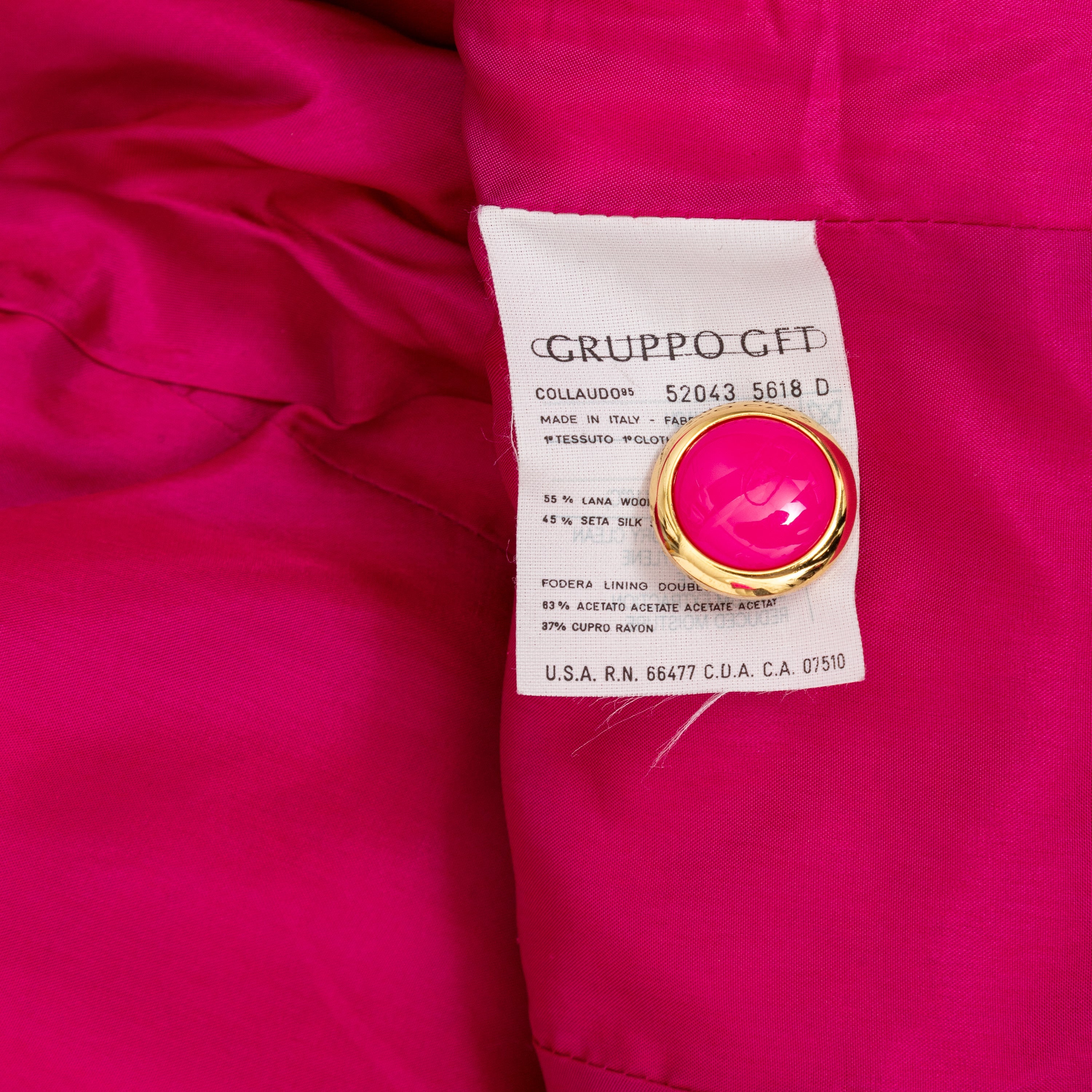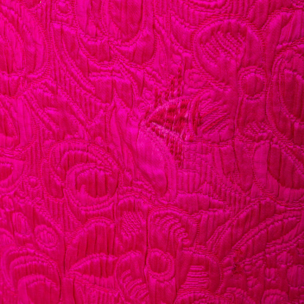 Introducing the Ungaro set from the 90s, featuring a luxurious wool and silk blend fabric in a vibrant fuchsia pink. The set includes a stylish v neck jacket with a two button closure and a flattering midi skirt, both adorned with a beautiful floral jacquard pattern.