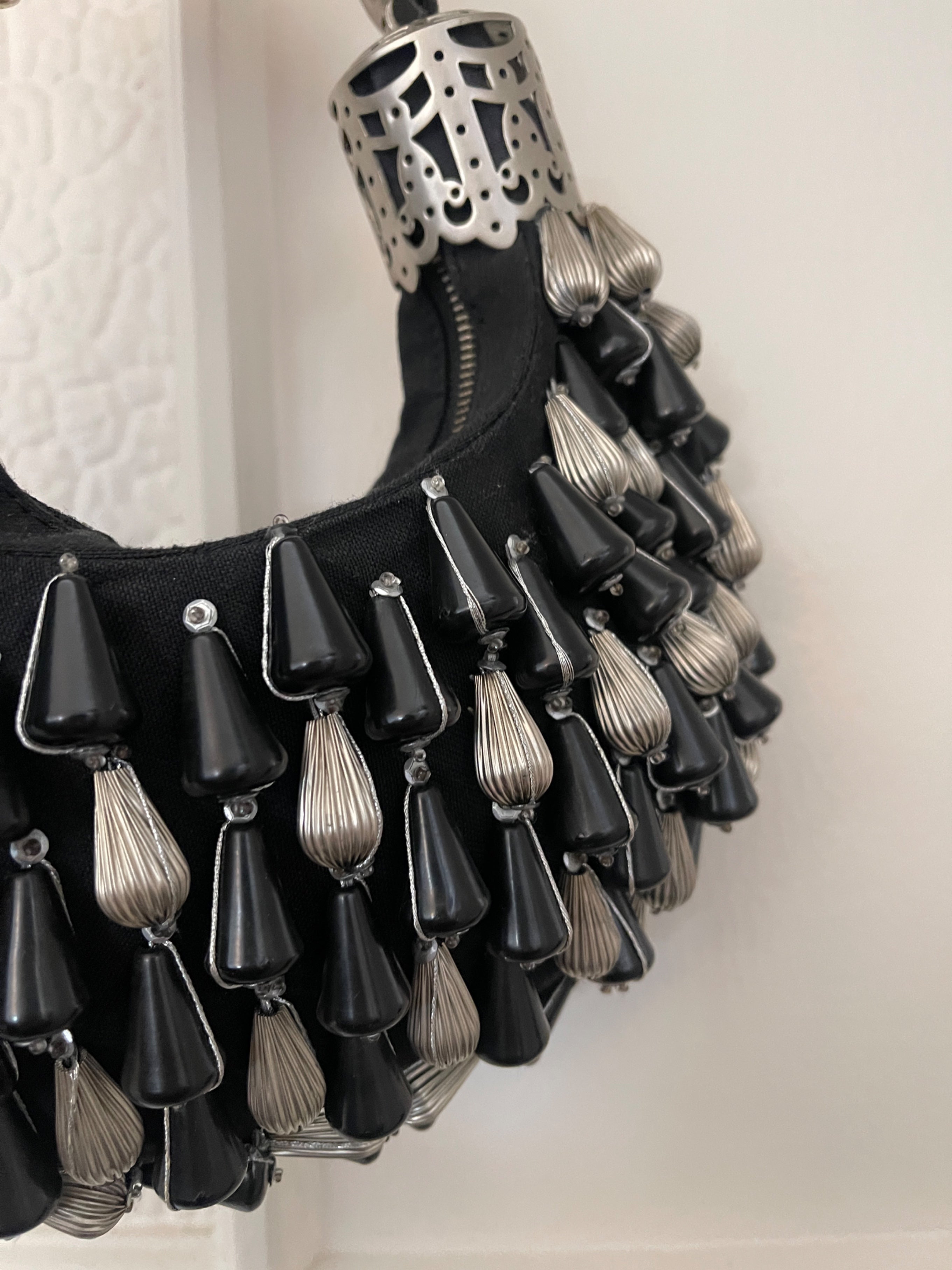 This weighty beaded bracelet bag was designed as part of Chloé’s Spring 2002 collection, where Vogue shouted out the “Moroccan-style beaded bags” which “exuded earthy chic”. Designed under Creative Director Phoebe Philo, it showcases that level of desirability and interest that Philo excels at bringing to a garment or accessory. Tailored from black cotton, it forms a crescent shape. The chunky bracelet handle is created from elaborately carved, matte silver-toned metal, oversized spring ring clasps and a stiff black cotton-covered handle. The body of the bag is smothered in large droplet-shaped beads in matte black plastic and ribbed silver-toned metal, secured to the bag with metallic silver thread and matte silver sequins. The bag fastens with a chunky silver-toned zip. It is lined with black cotton and contains a single slip pocket inside.