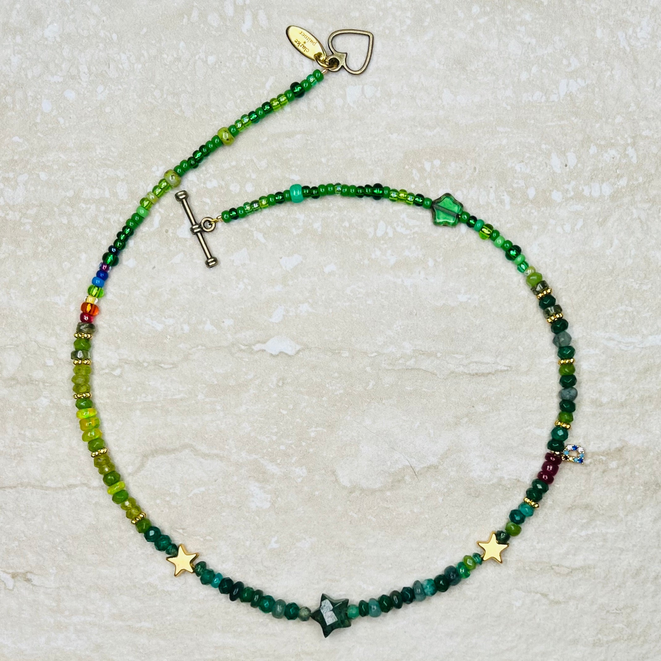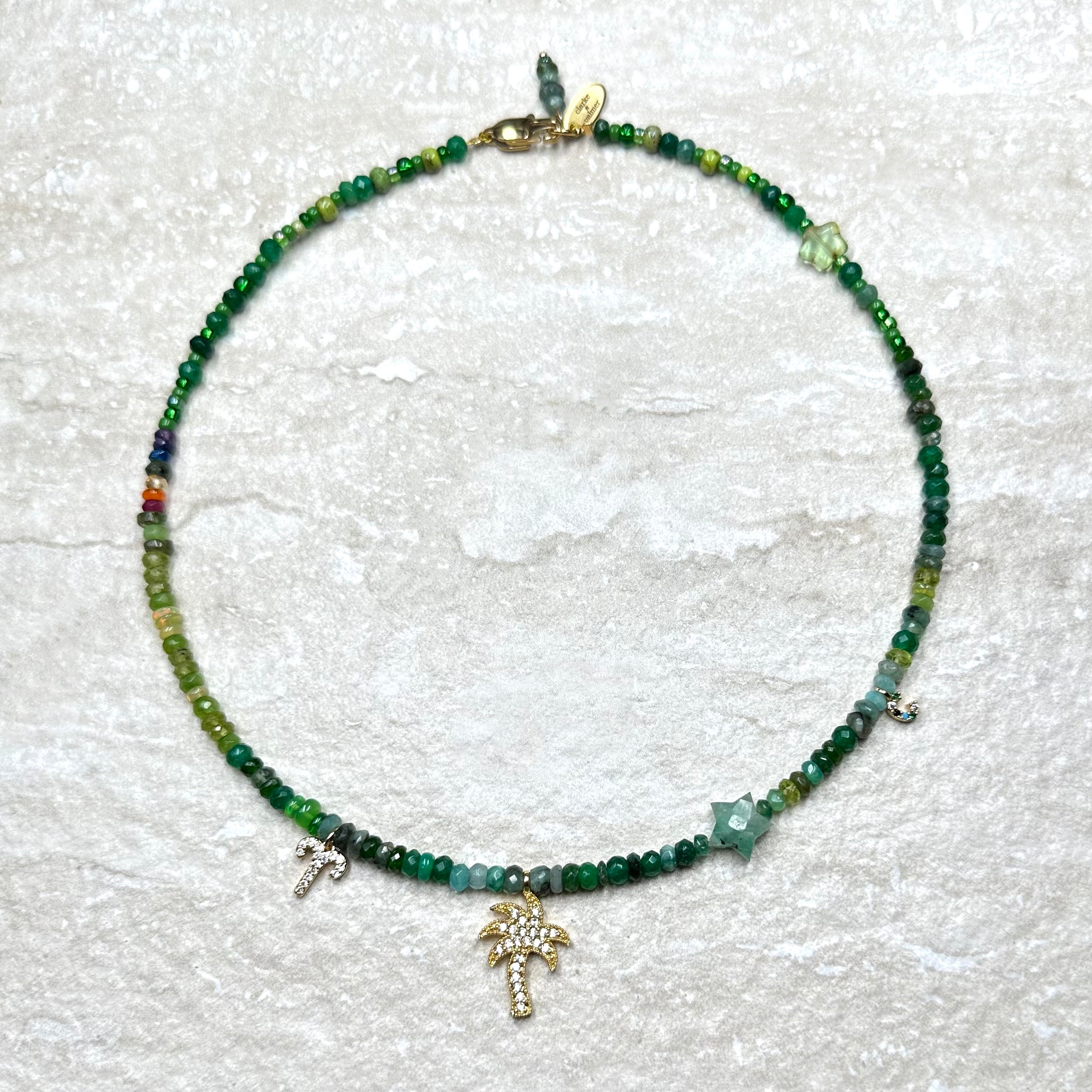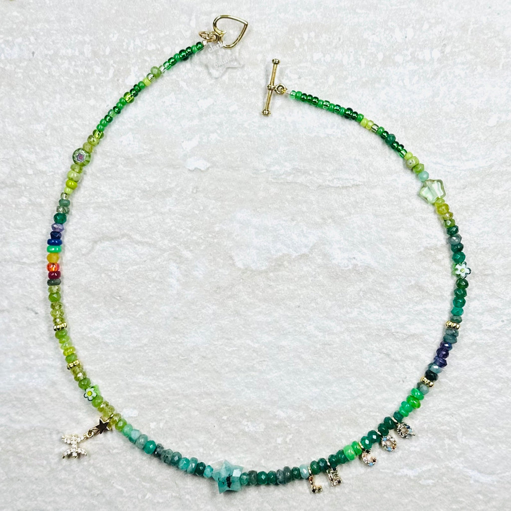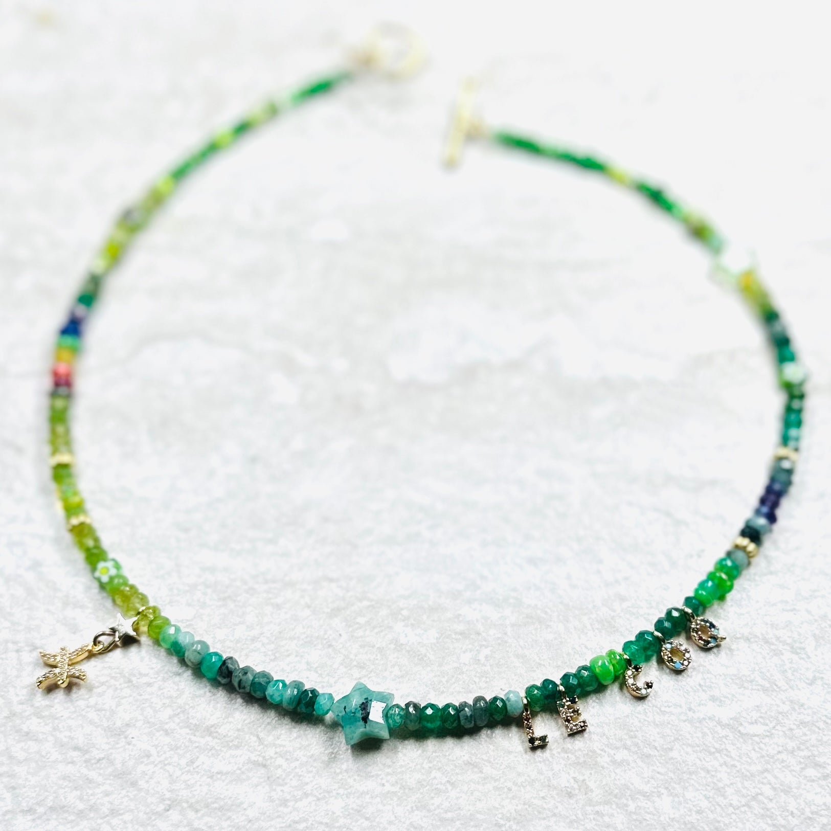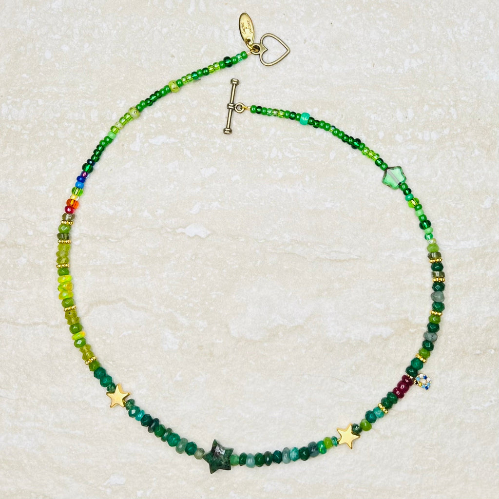 This beautiful necklace is handmade from a rich mix of glowing lime and emerald shades of Ethiopian opals, peridot and emerald faceted sustainably sourced rondelles. It is centred by a hand cut emerald star and rainbow detail.  This gorgeous necklace has a 22kt gold vermeil lobster clasp adjustable from 40cm to 45cm.