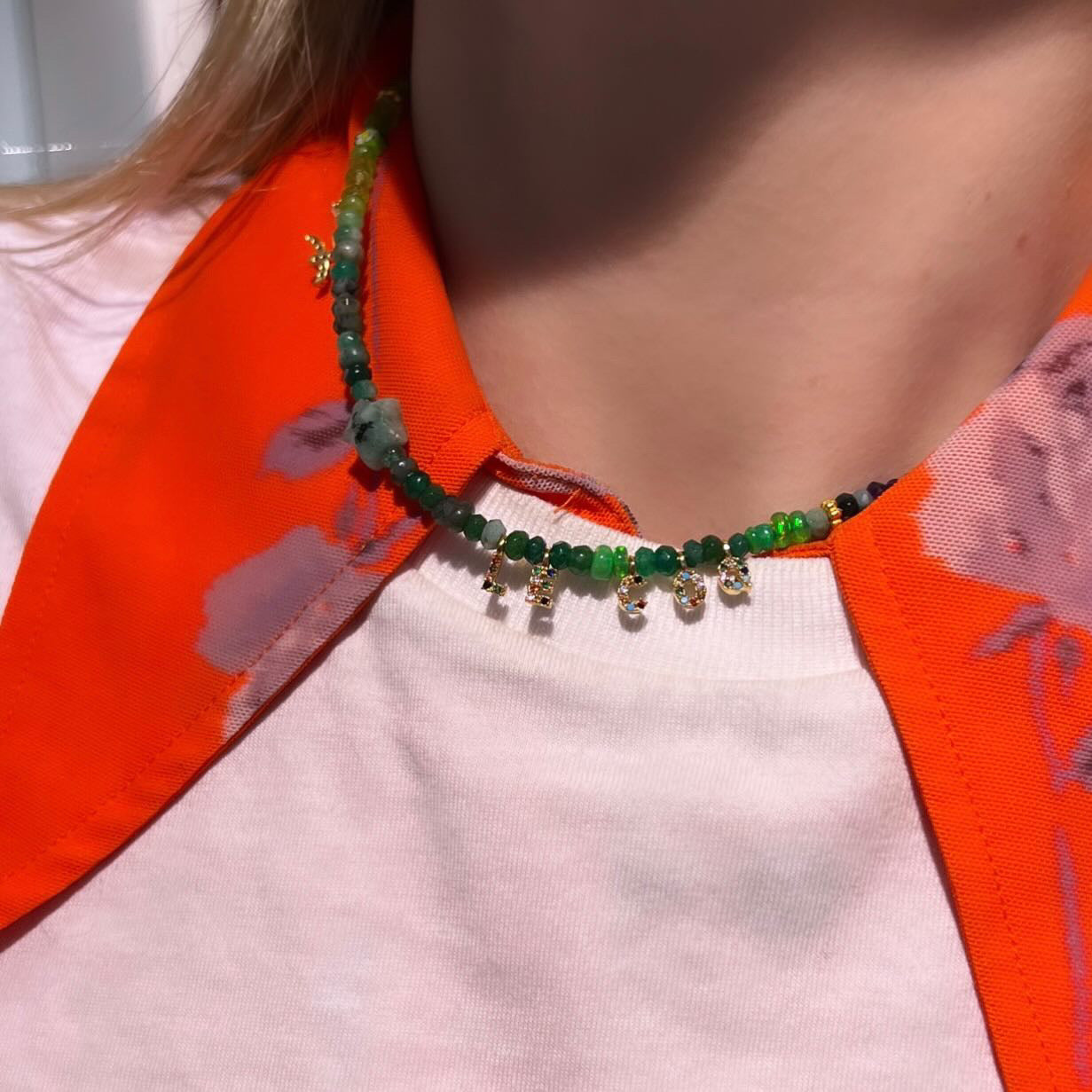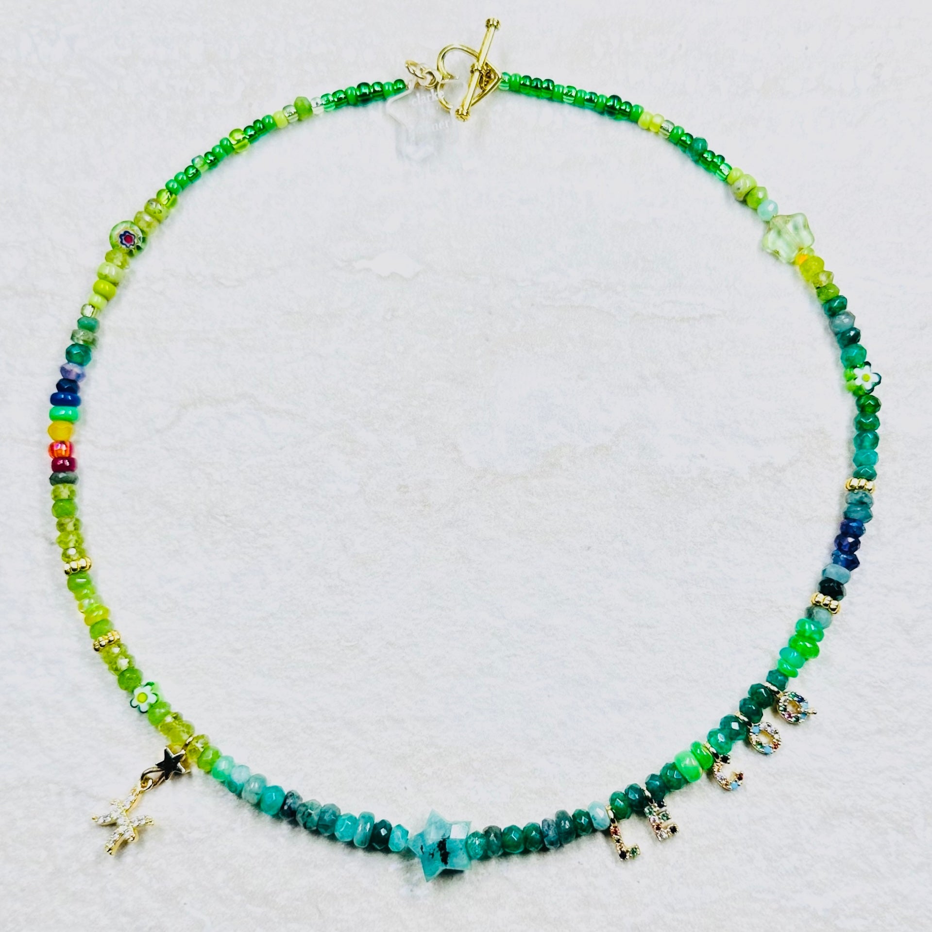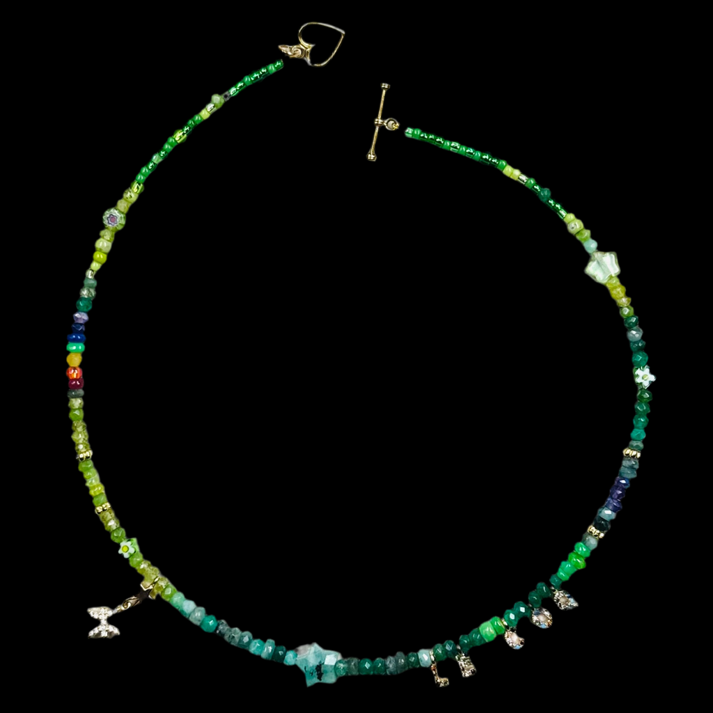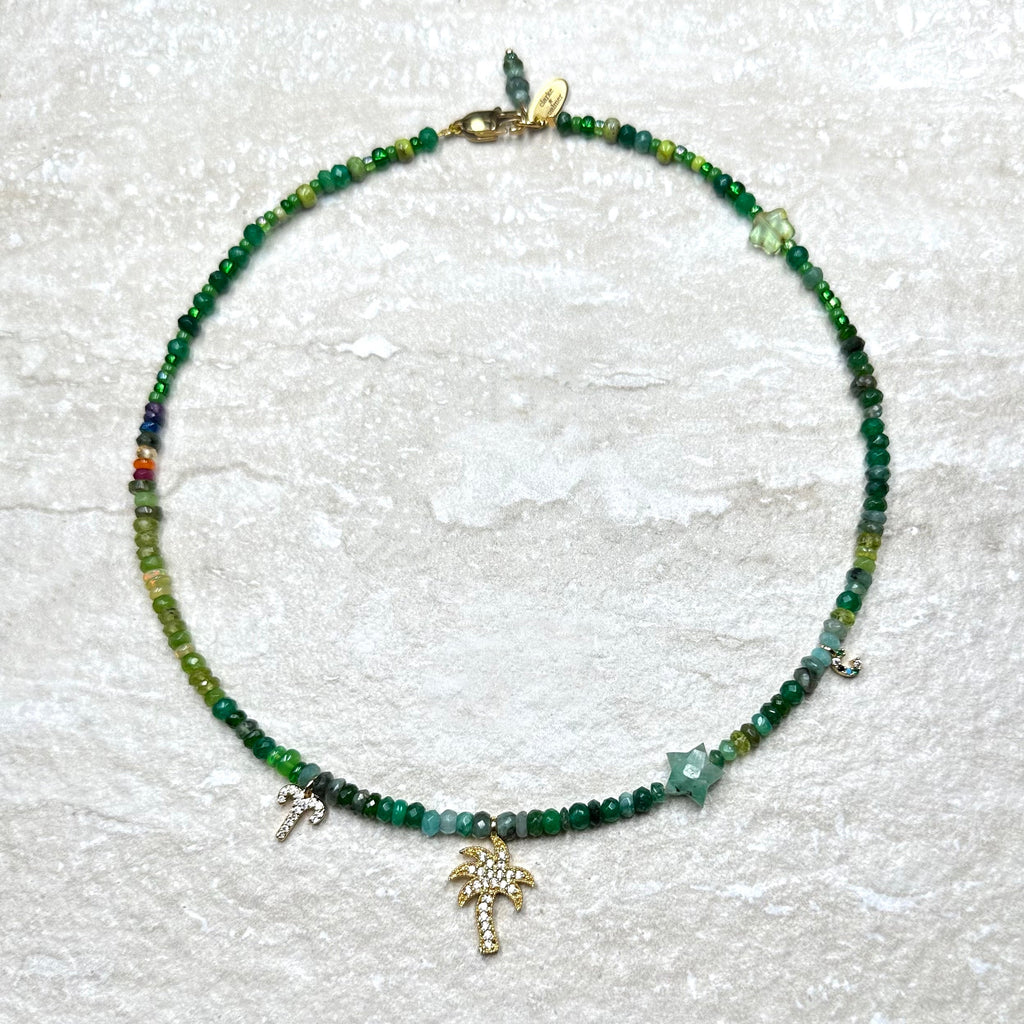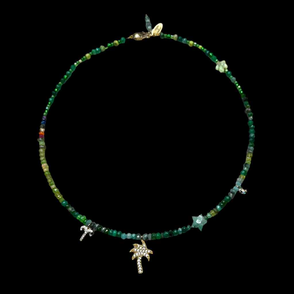 This beautiful necklace is handmade from a rich mix of glowing lime and emerald shades of Ethiopian opals, peridot and emerald faceted sustainably sourced rondelles. It is centred by a hand cut emerald star and rainbow detail.  This gorgeous necklace has a 22kt gold vermeil lobster clasp adjustable from 40cm to 45cm.