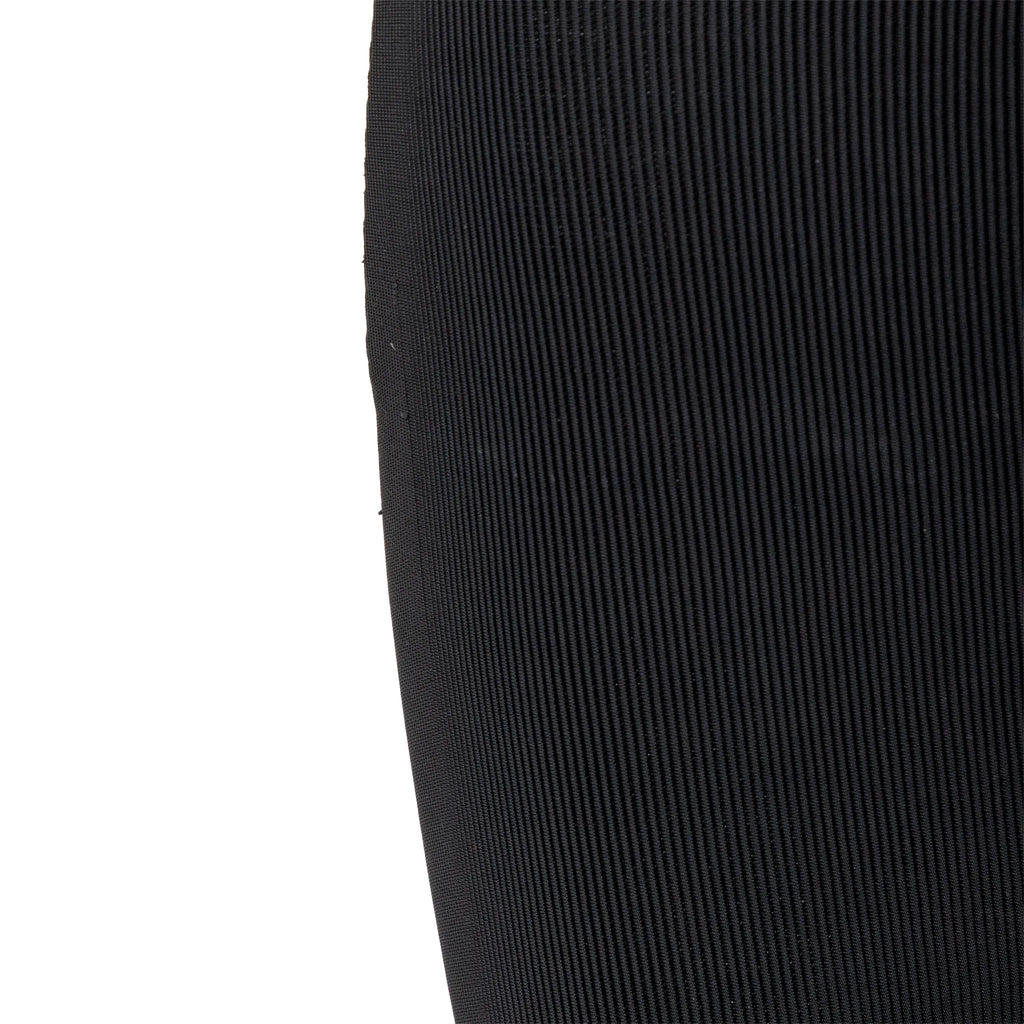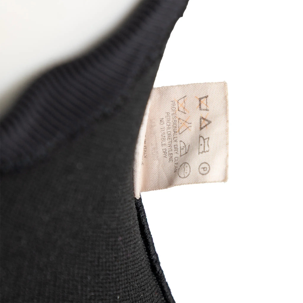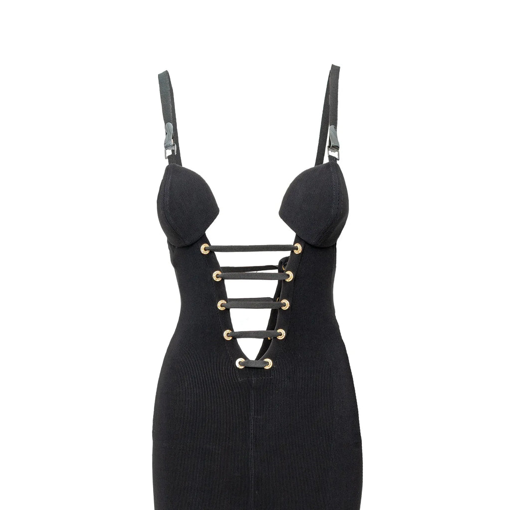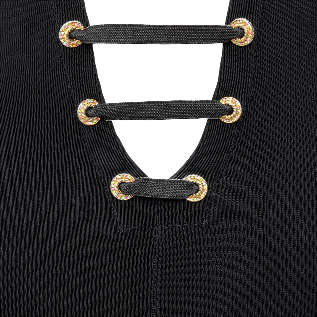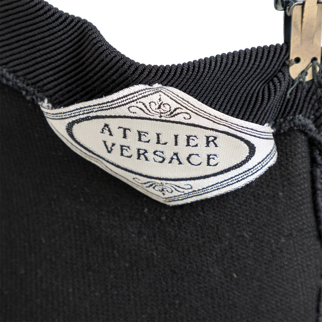 From Atelier Versace Fall 1991 Couture collection. Black ribbed knit bustier jumpsuit adorned with rhinestone-studded rivets, epitomizing 90s haute couture allure.