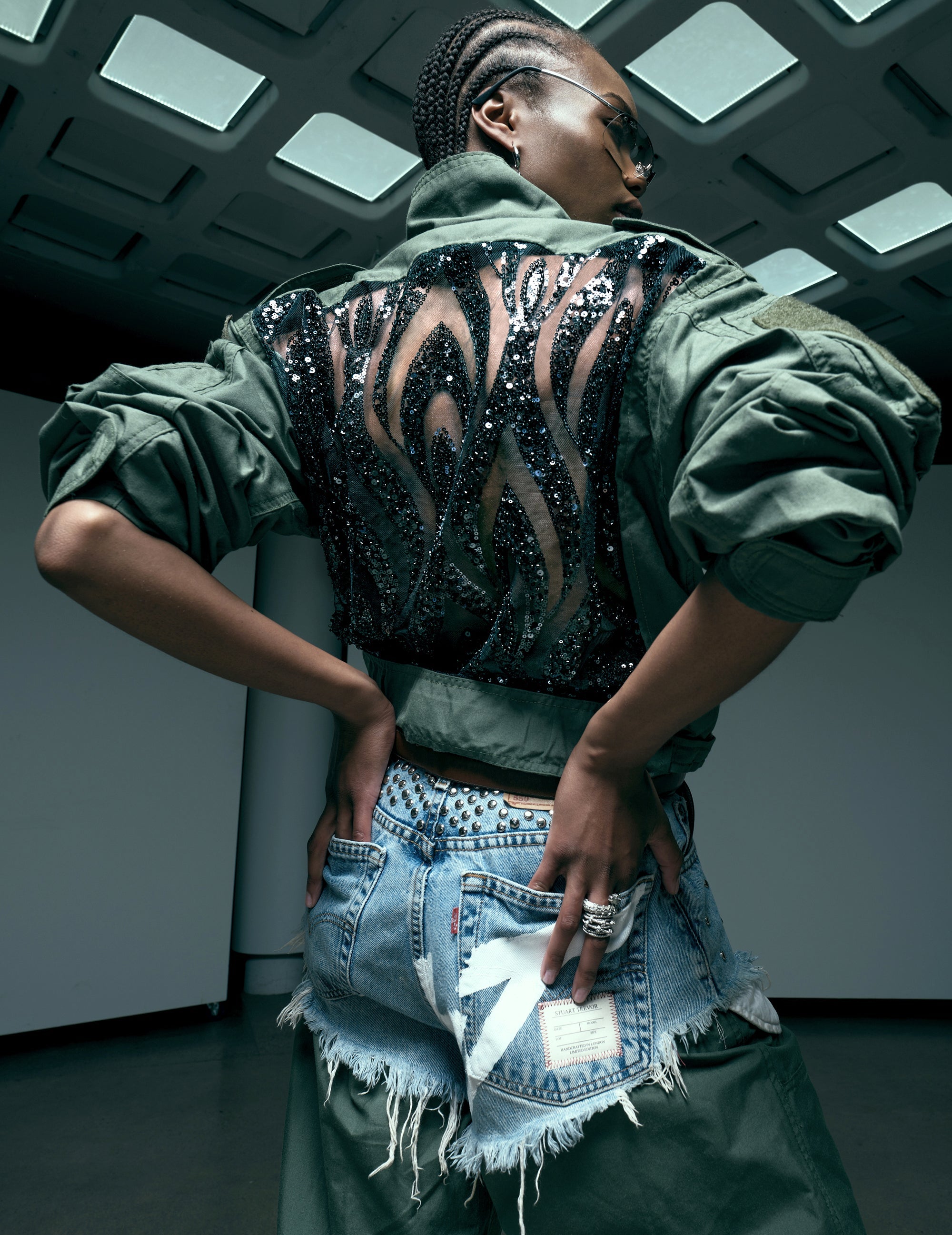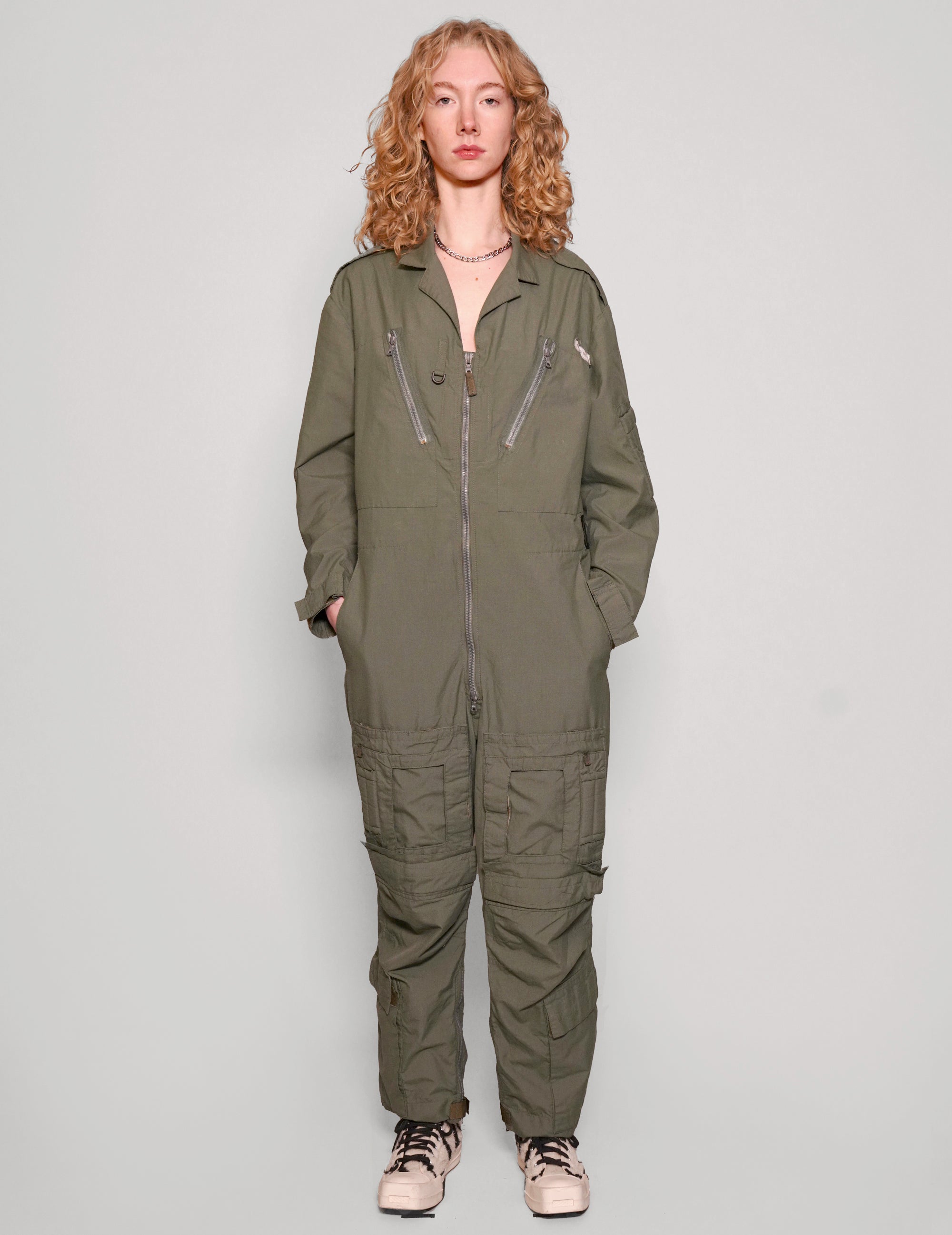 Original, vintage RAF jumpsuit, 100% cotton, featuring the ST signature black sequin, art-deco style sheer back panel. Zip fastened front, hip pockets, ankle flap pockets and two breast zip pockets. Model is 5'8" wearing size M.