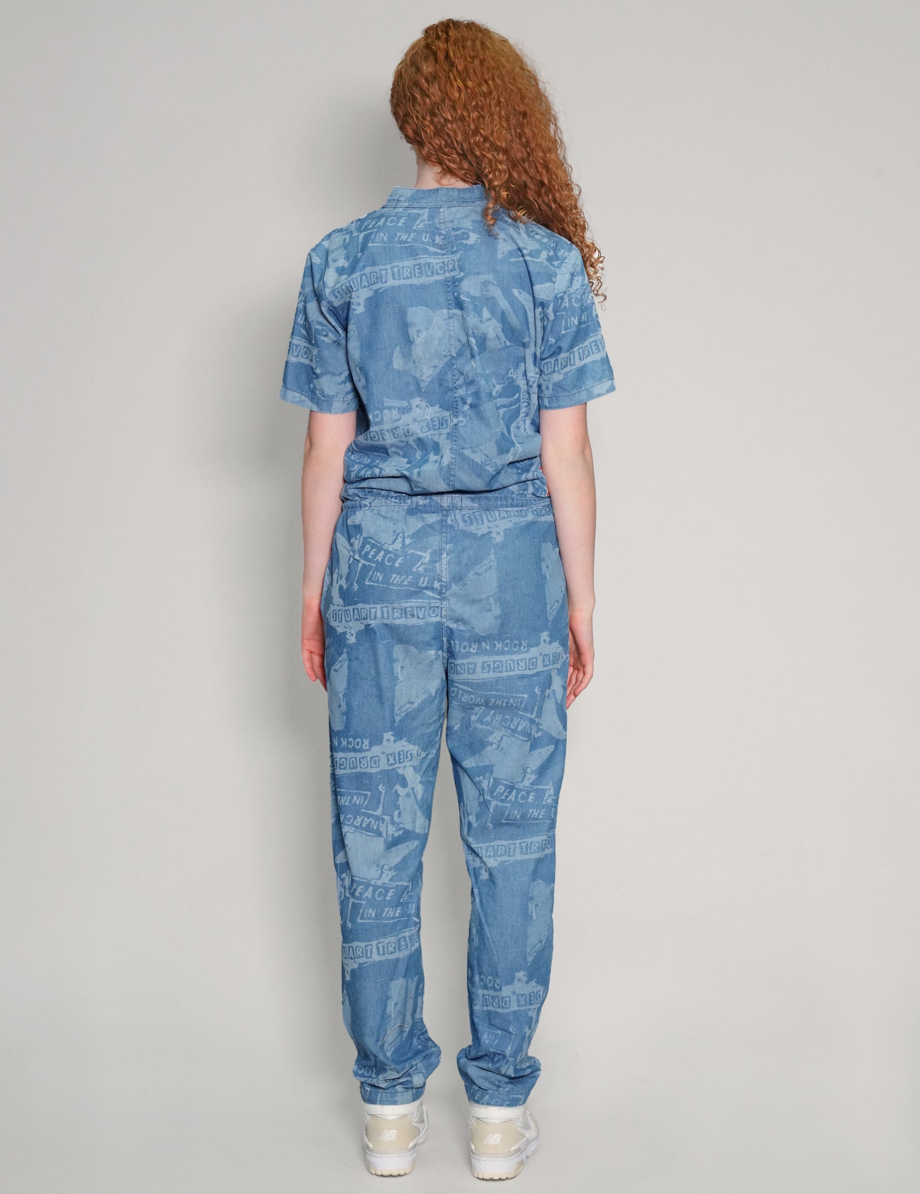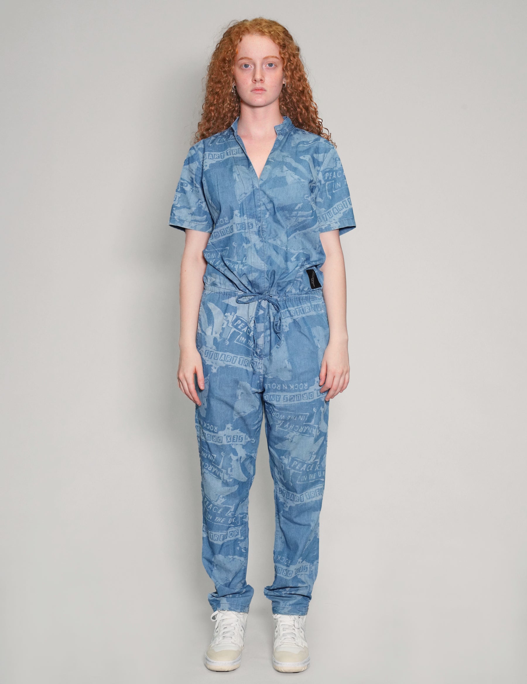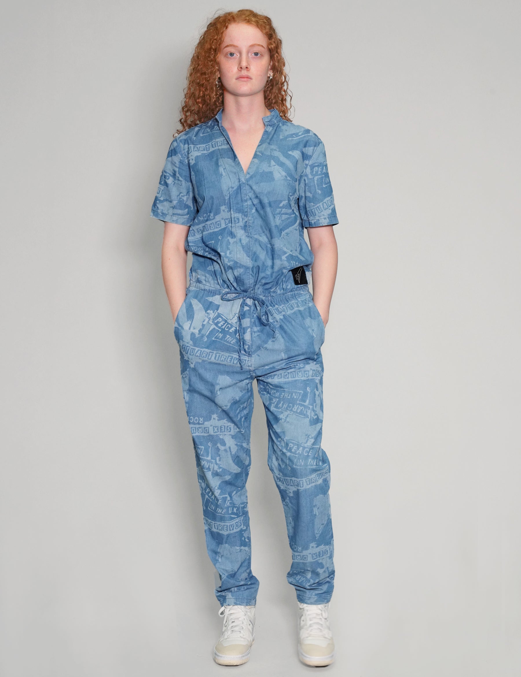 'Peace' print, vintage denim jumpsuit. Each piece is super rare and laser printed in our East London tailoring shop. Features our original graphic print with "Stuart Trevor, Peace in the UK, Anarchy in the World and S'x D'ugs n Rock n Roll".