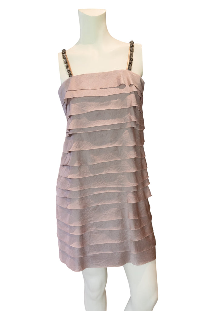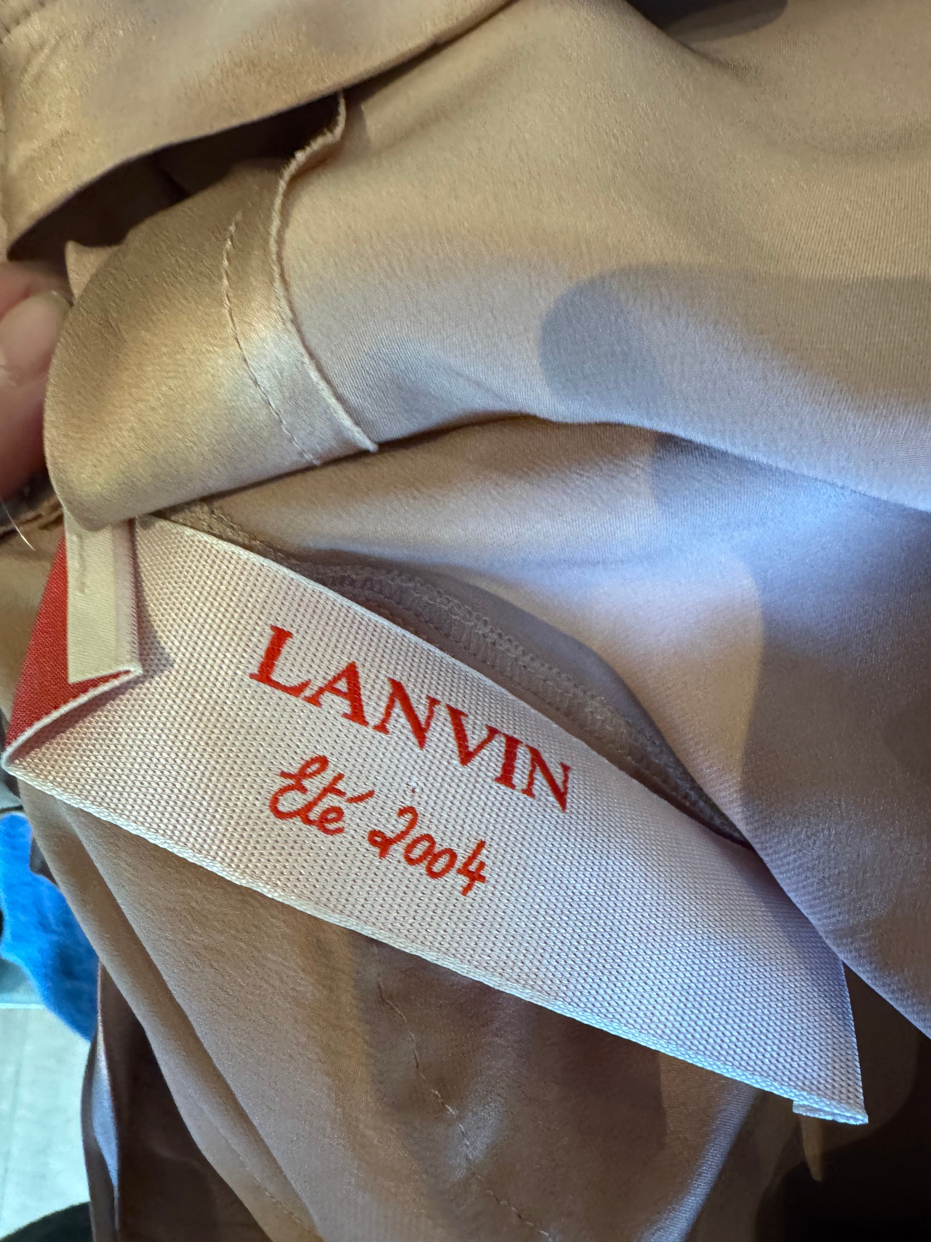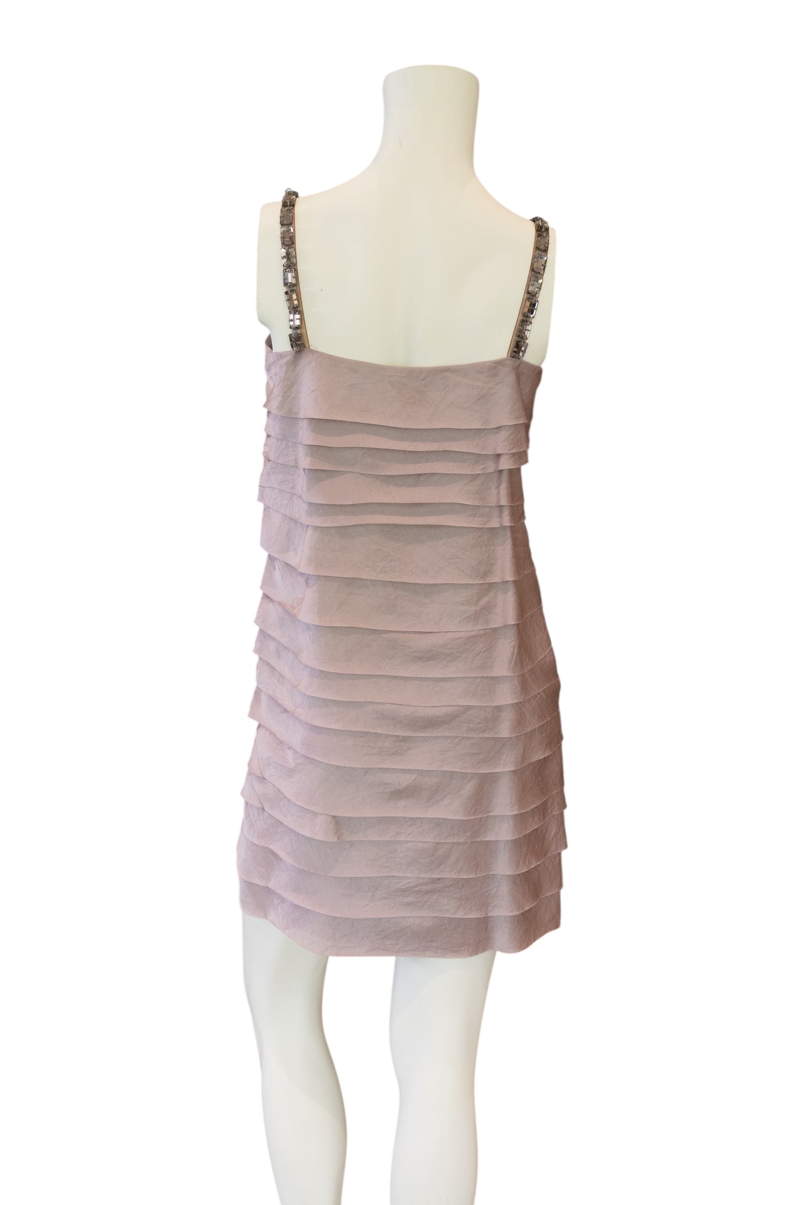 This 2005 Lanvin under Albert Elbas short dress showcases a refined shift silhouette in a delicate pale mauve shade. Crafted from layered silk, it features meticulously beaded straps and a discreet side zip for a flawless fit. The dress combines understated elegance with expert tailoring, making it a distinguished choice for sophisticated occasions.