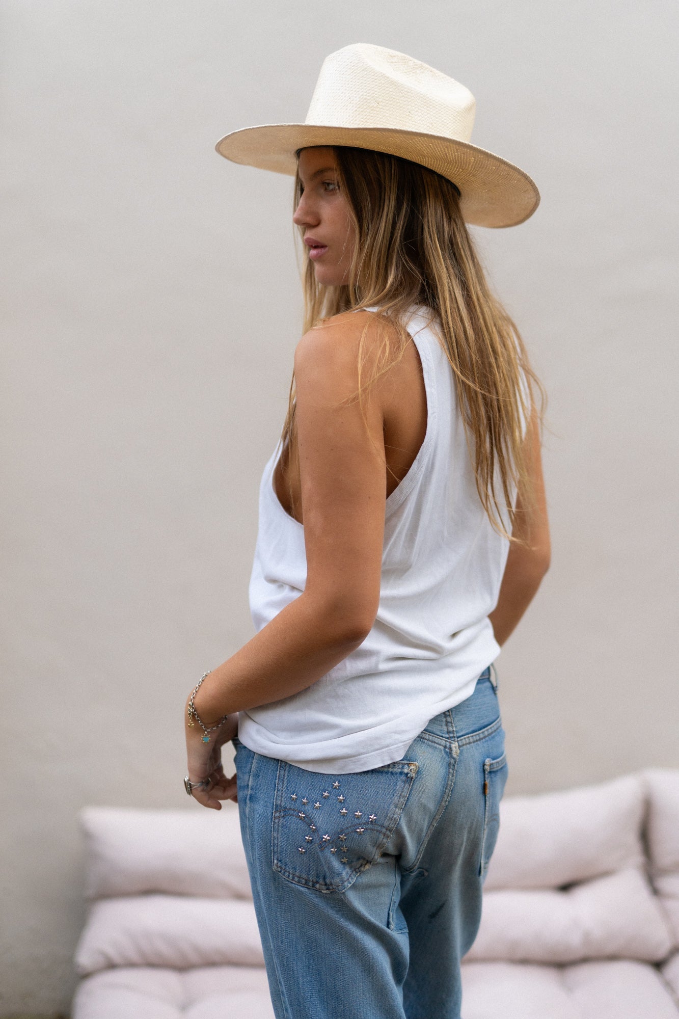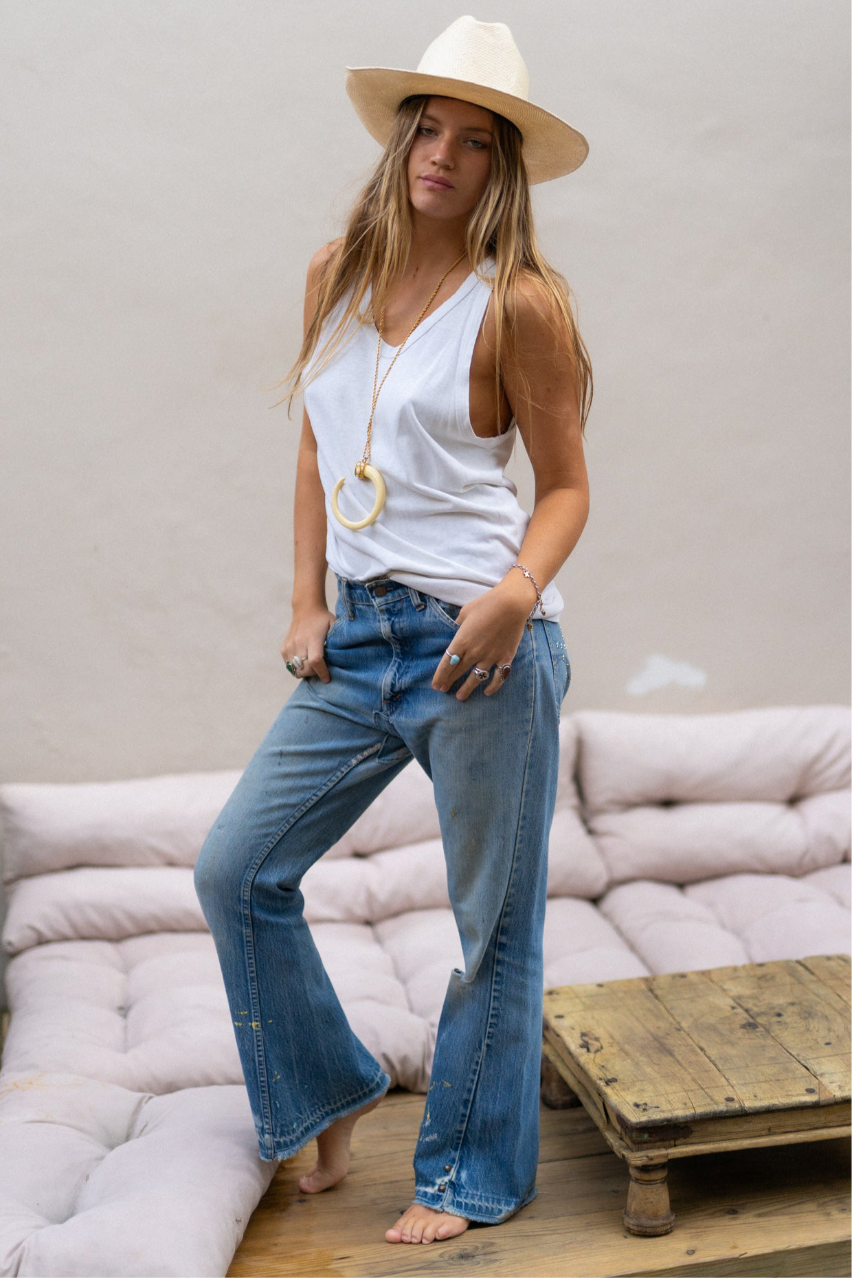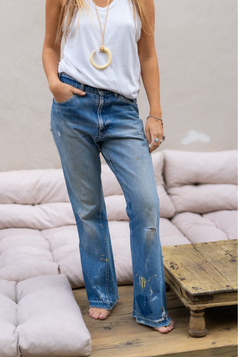 A WORN IN PAIR OF 70S BIG E LEVIS. THEY HAVE SOME CUSTOMISATION INCLUDING THE STAR PRESS STUDS ON THE BACK POCKET, A STUD ON THE ANKLE AND PAINT.