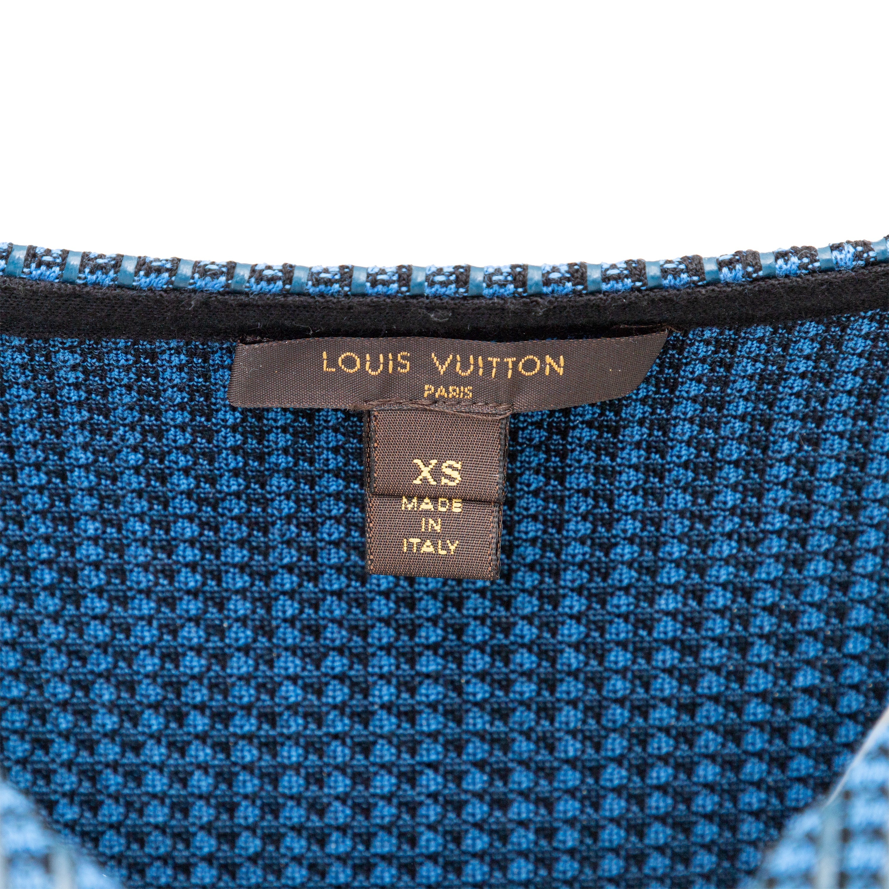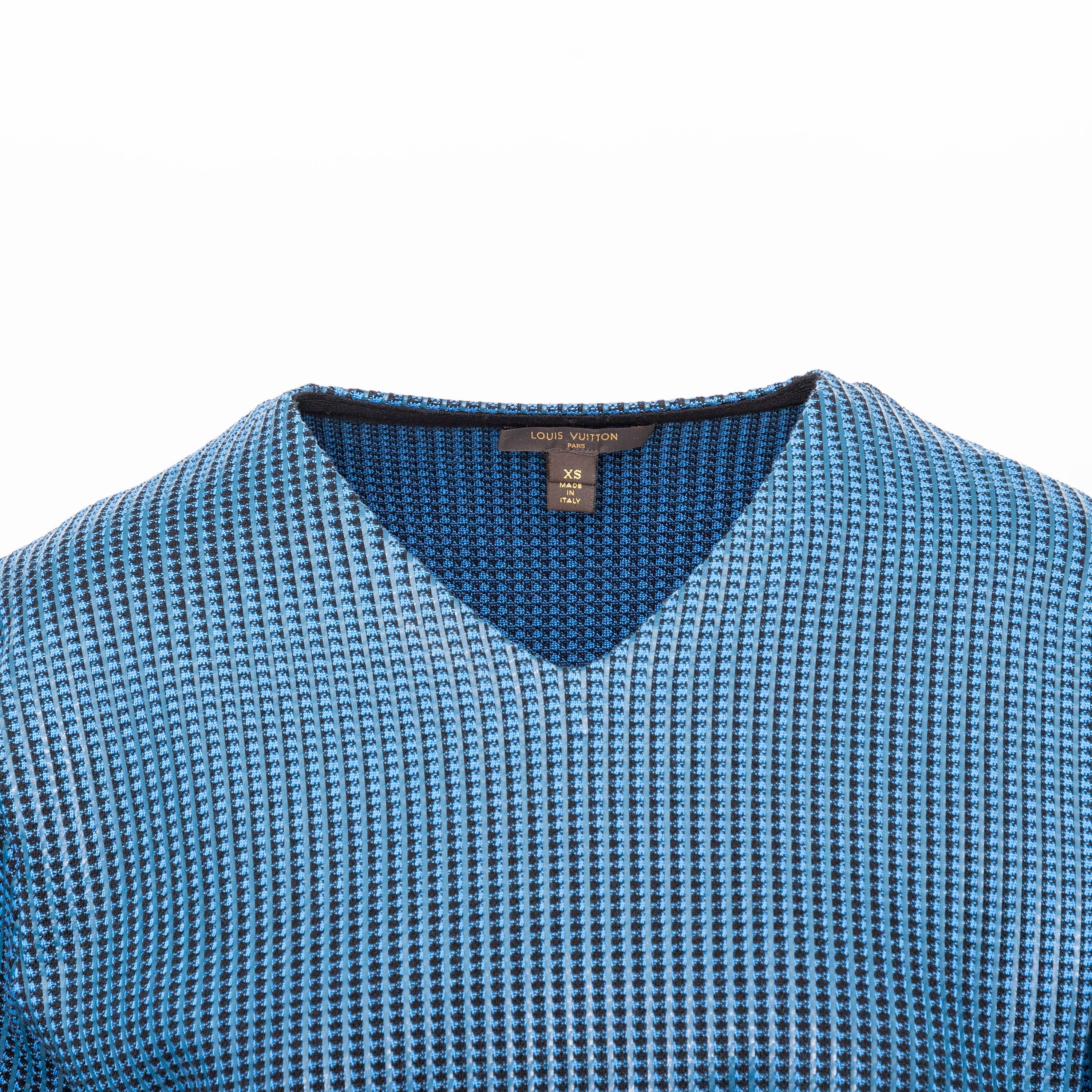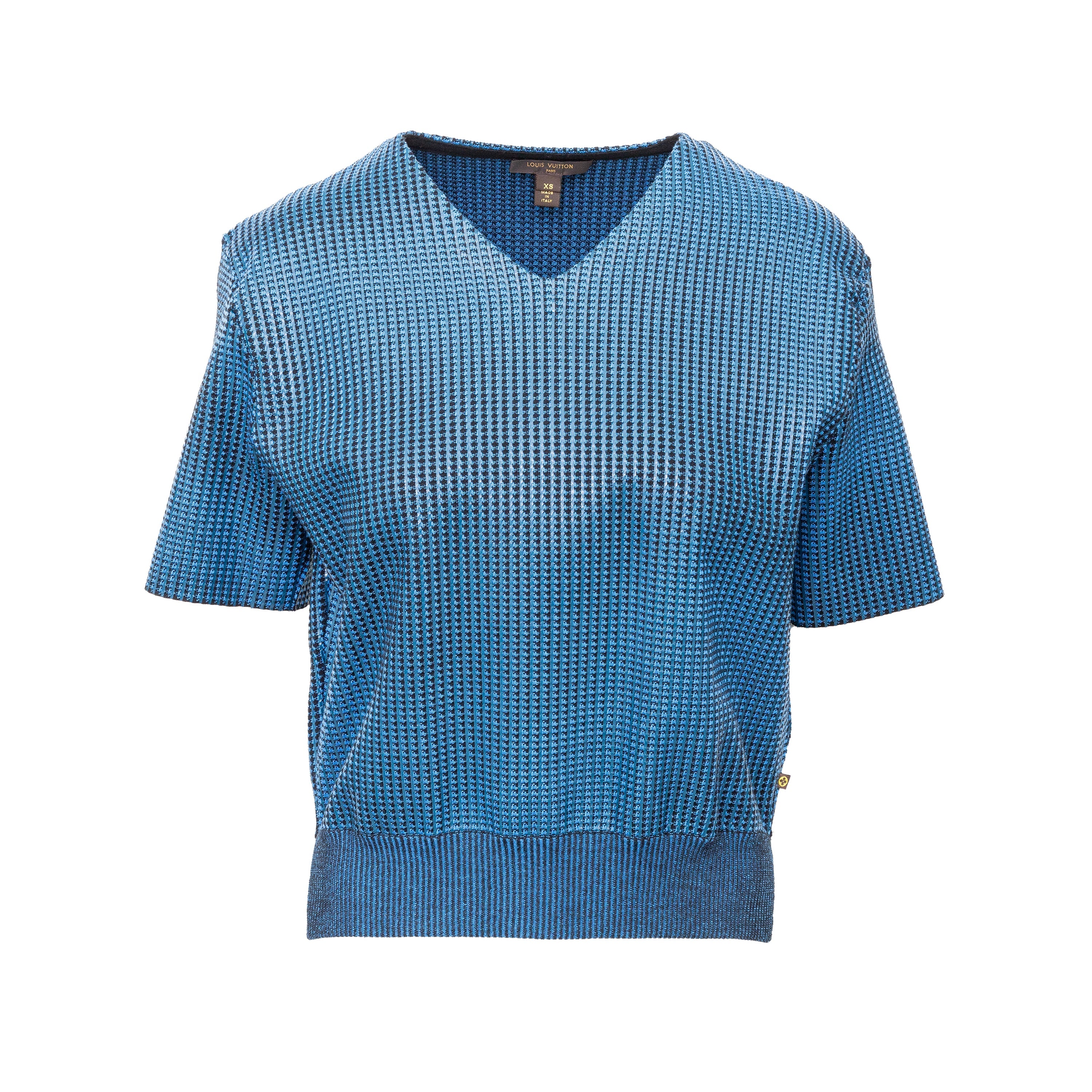 The Louis Vuitton V-neck top lends an elevated finish to street-casual vibes. This piece features a classic V-neck, ribbed hem and a distinctive blue stripe running along the knitted body. Composed of a combination of wool and elastane, this top is suitable for both formal and casual occasions.